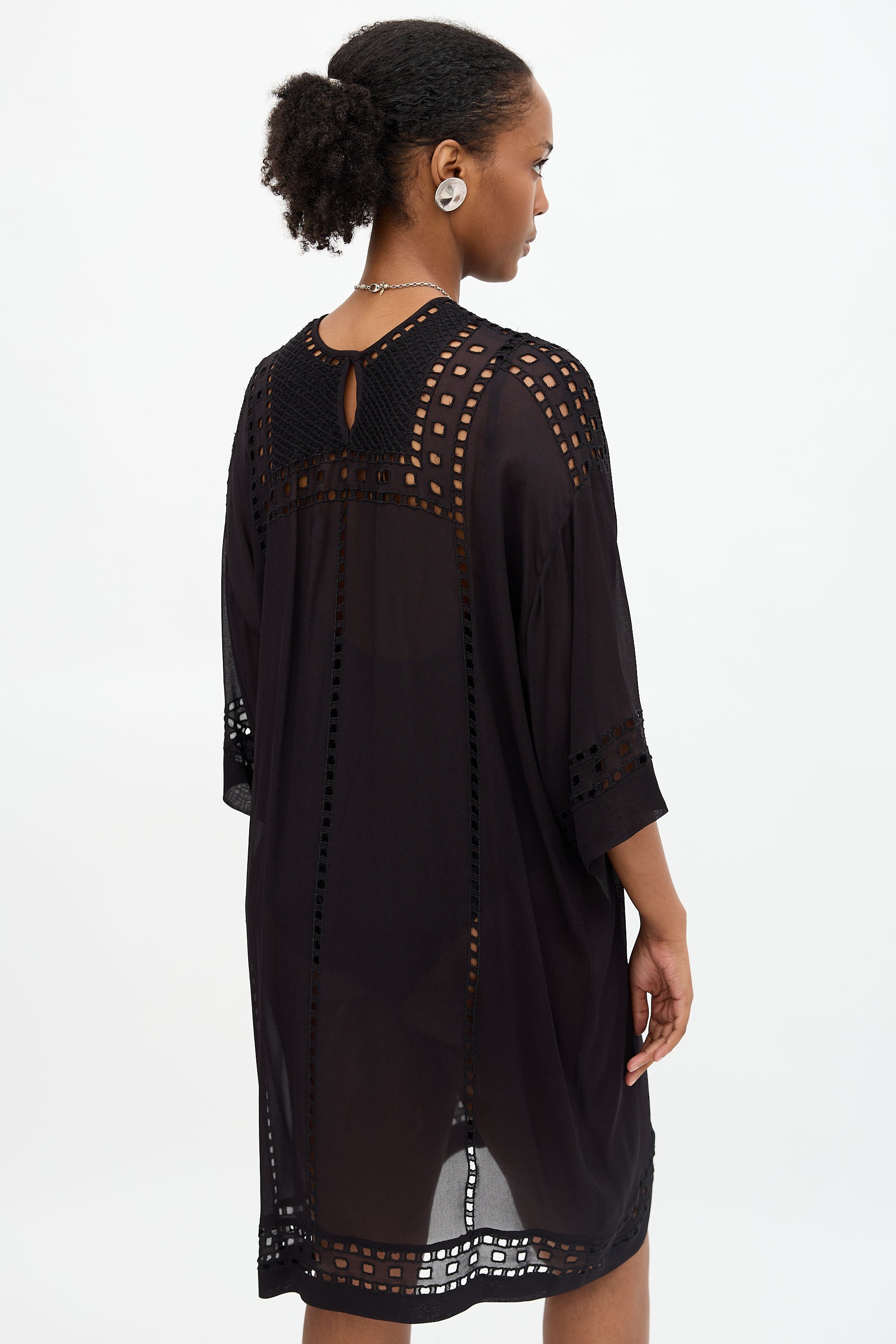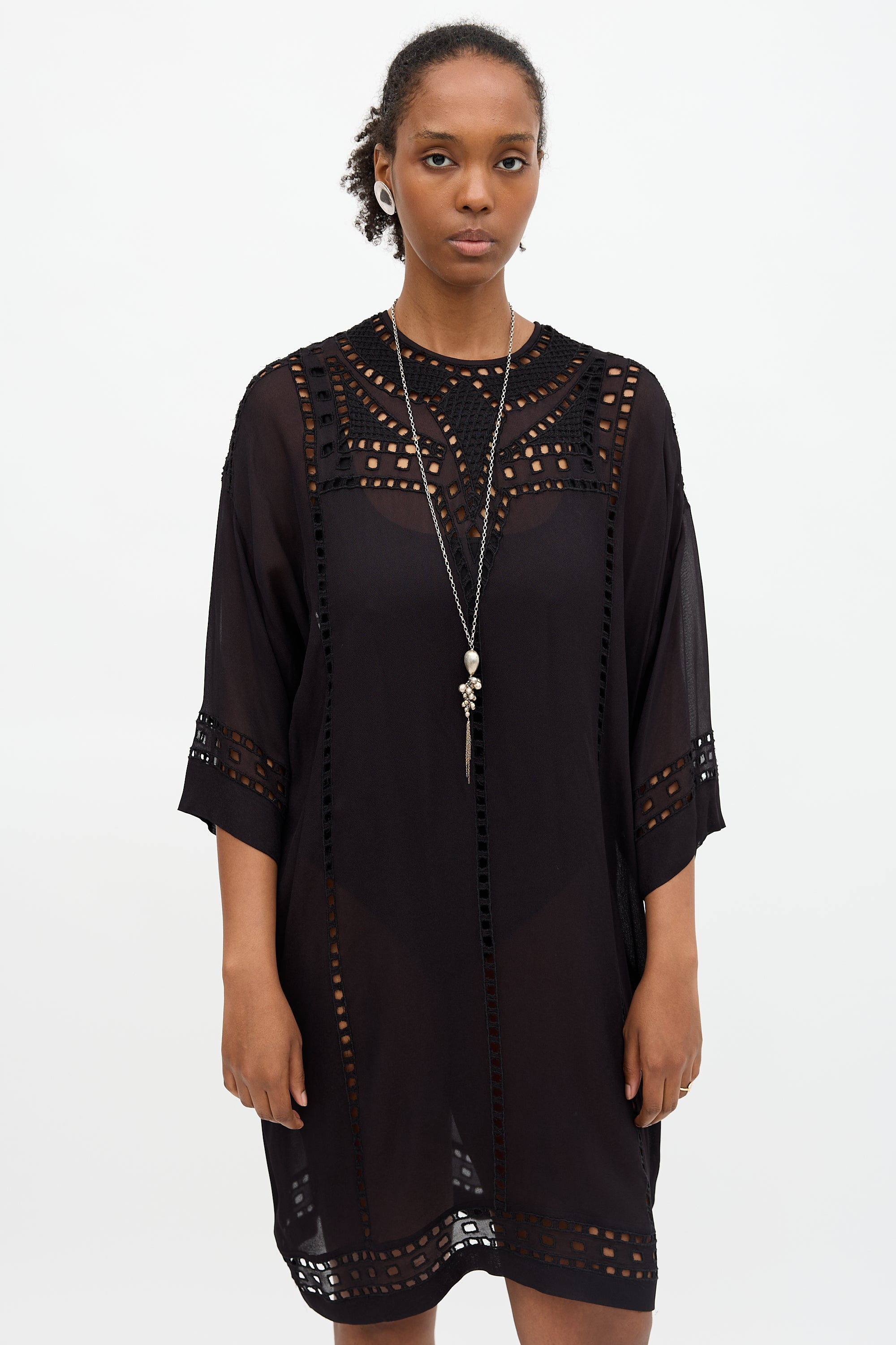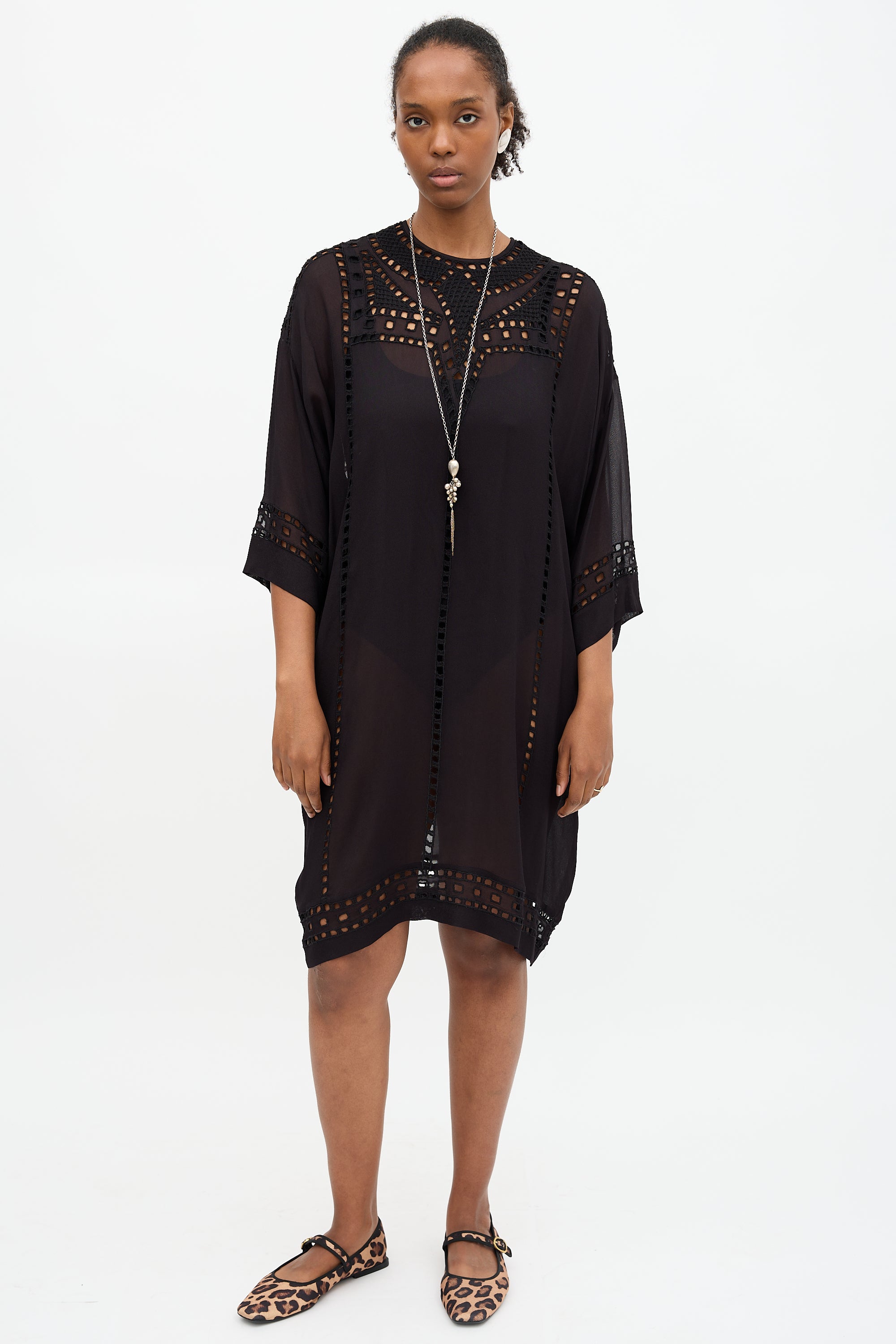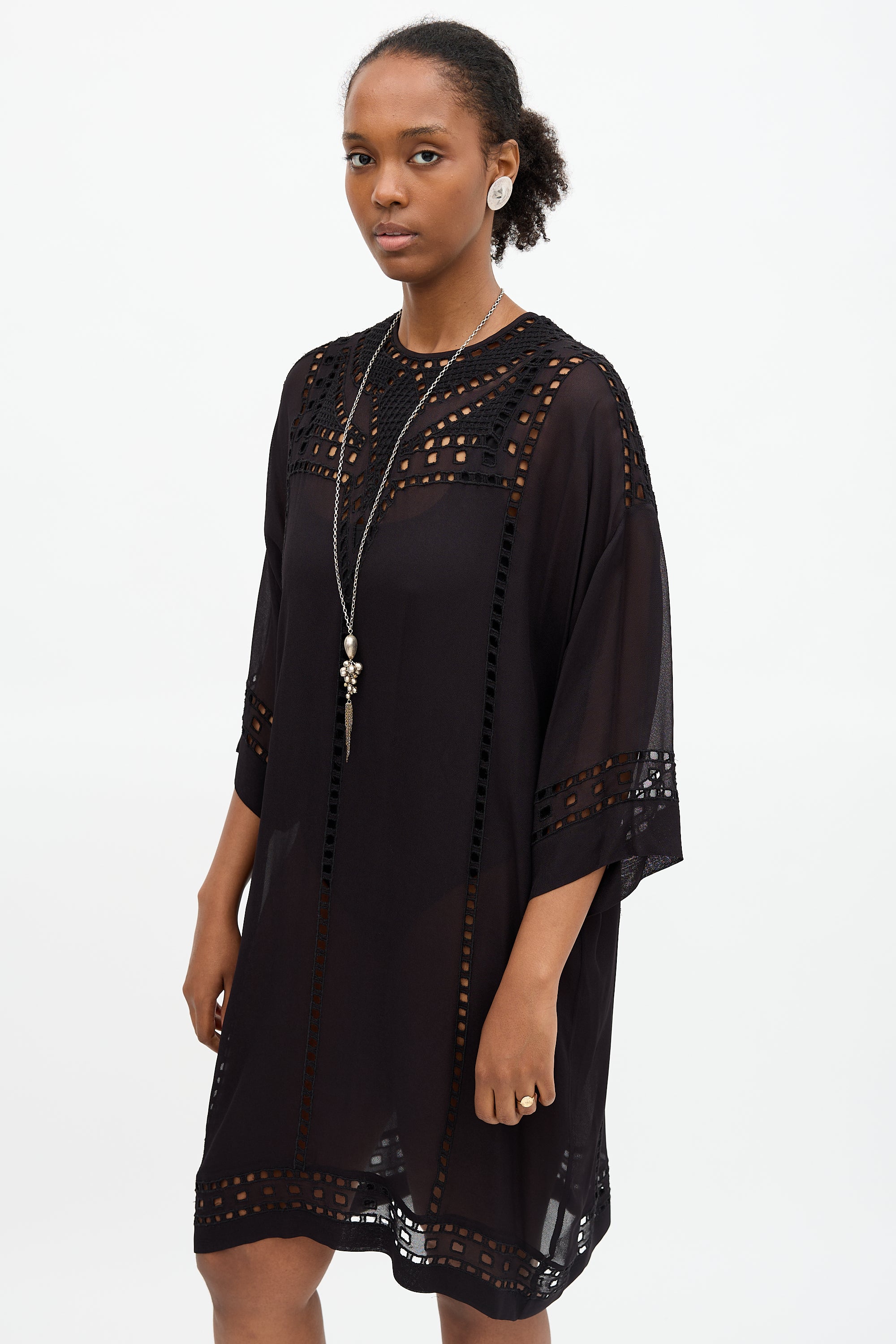 Pre-owned Isabel Marant Étoile black sheer tunic midi dress featuring round neckline, back keyhole, crochet back yoke, three quarter sleeves, and embroidered eyelets. Comes with slip.