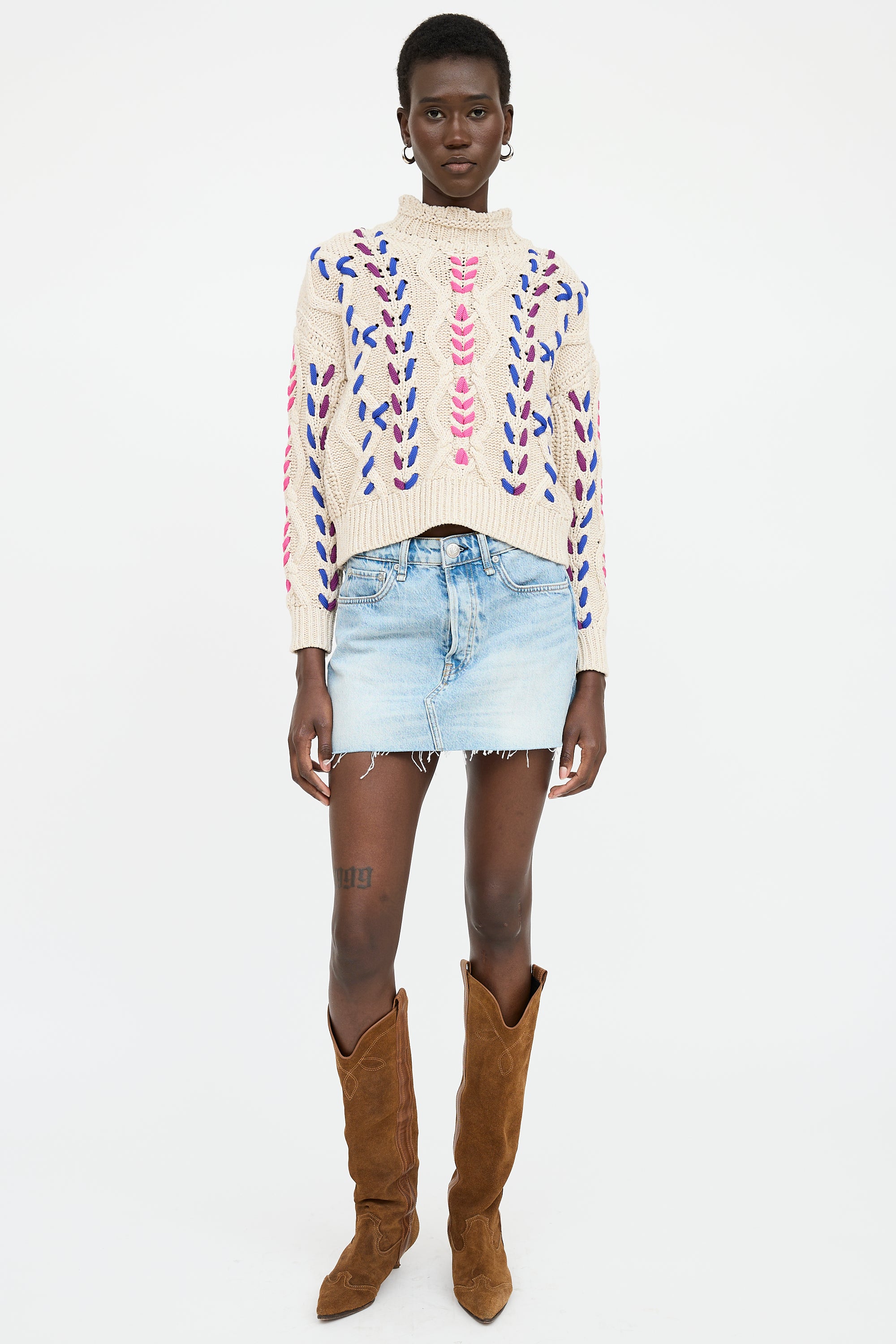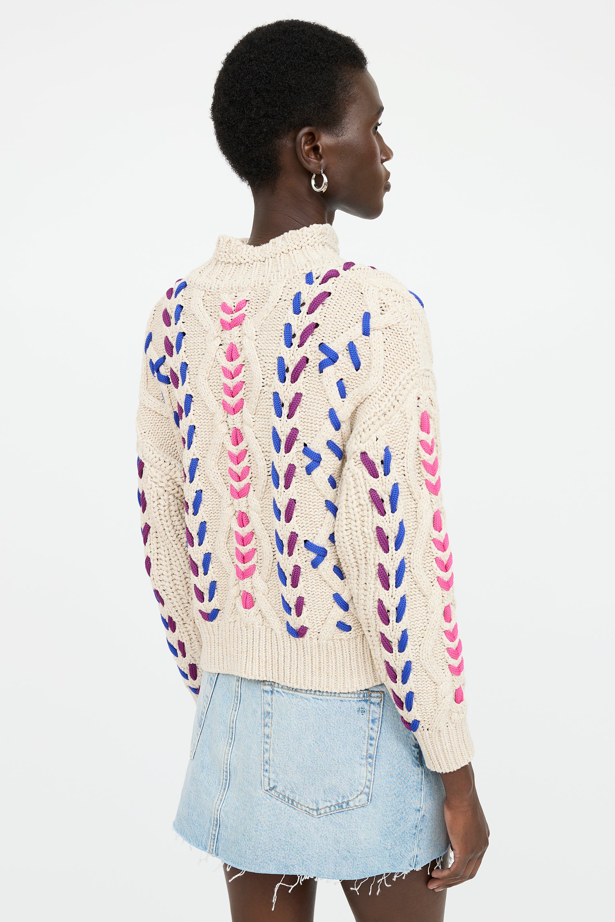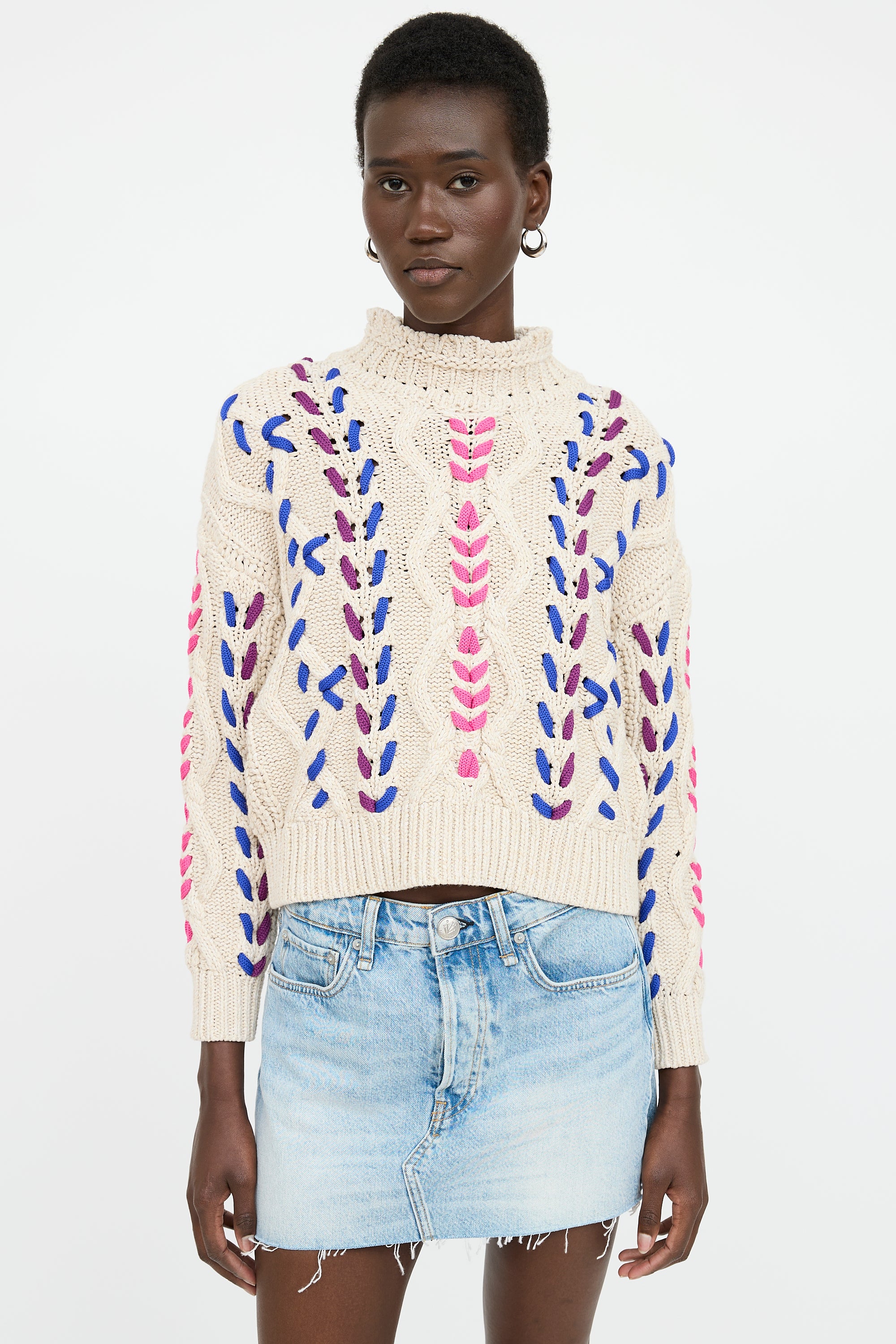 Pre-owned Isabel Marant Étoile cream and multicolor long sleeve cable knit sweater featuring mock neck collar, ribbed hemline and cuffs, and multicolor braid detail throughout.