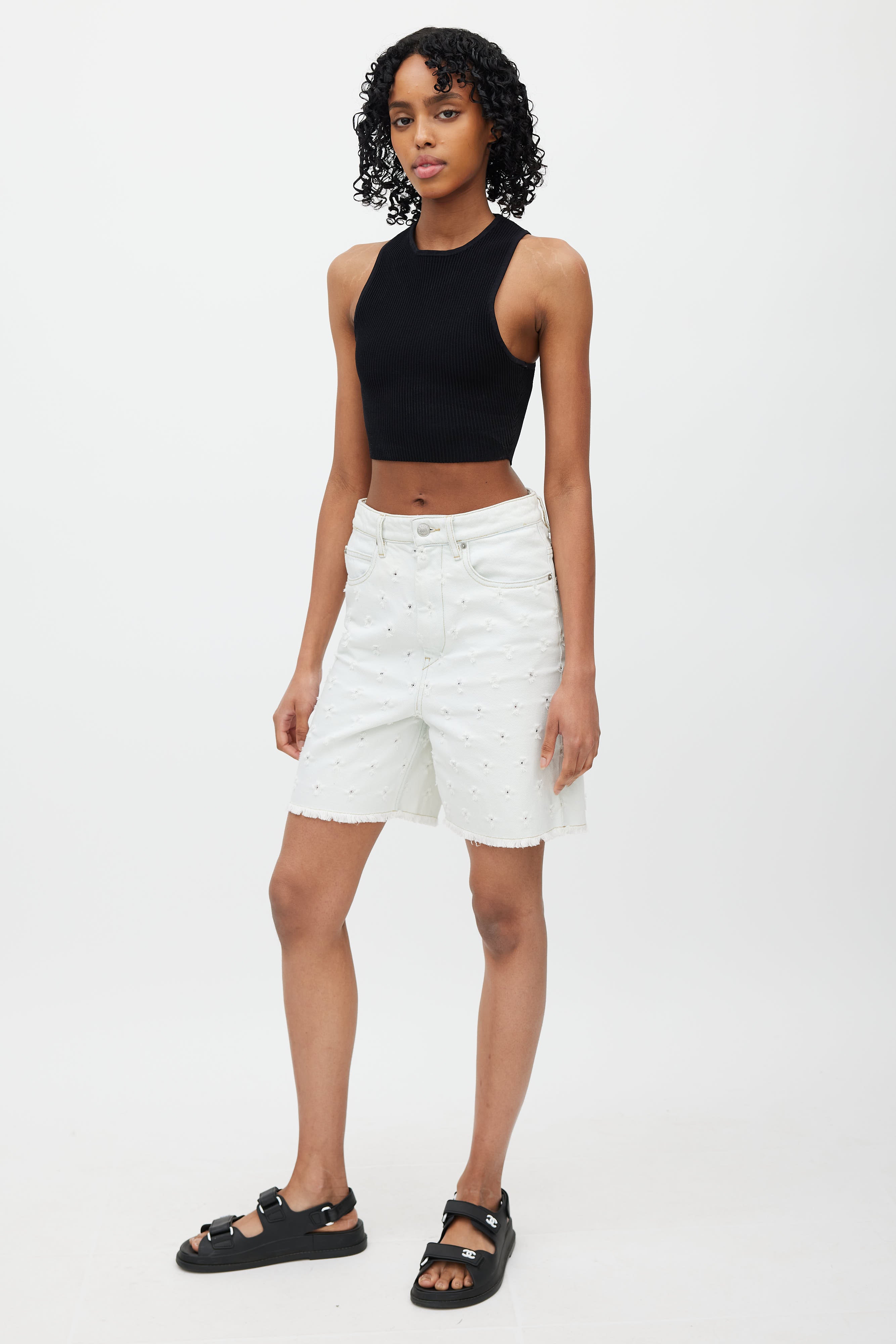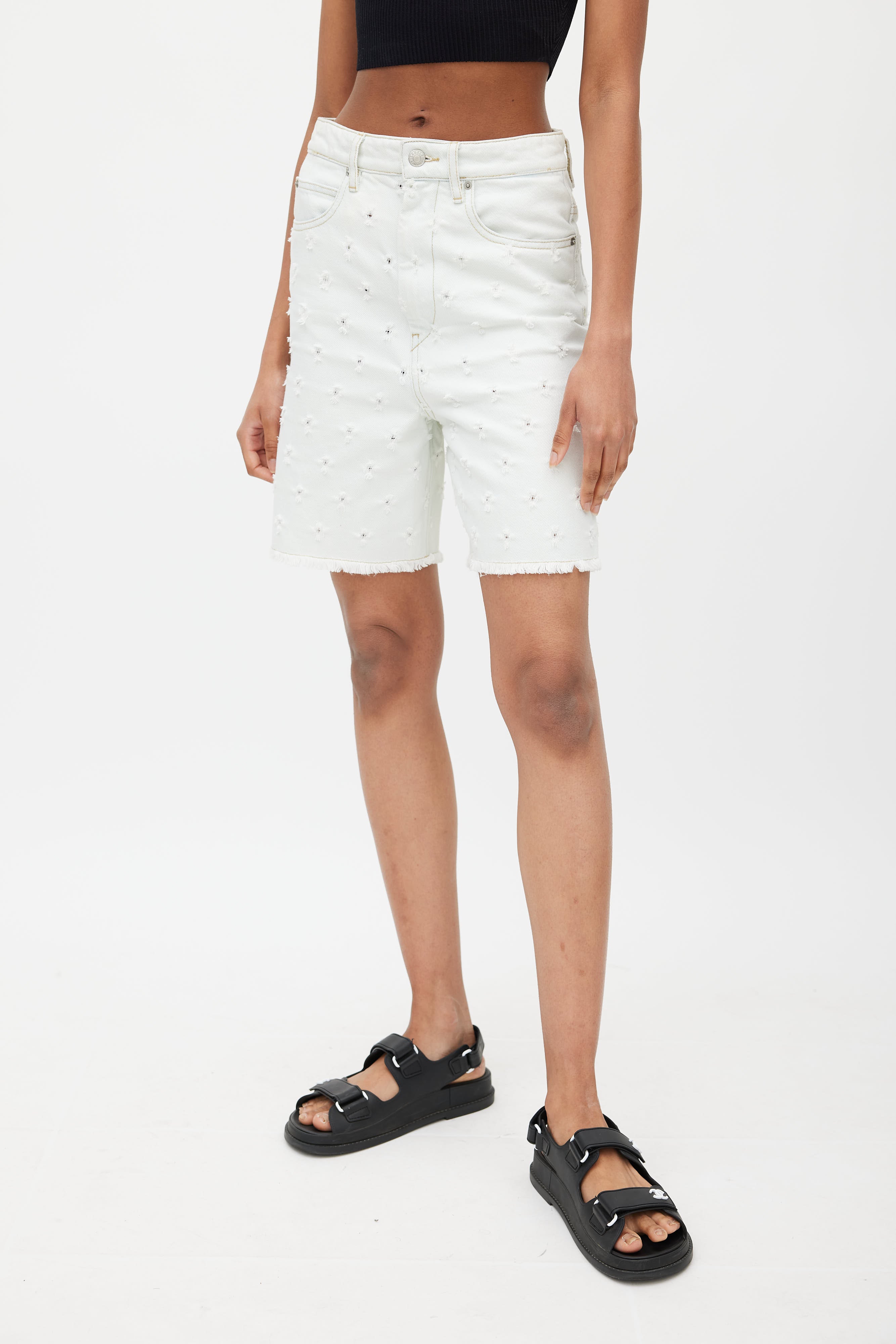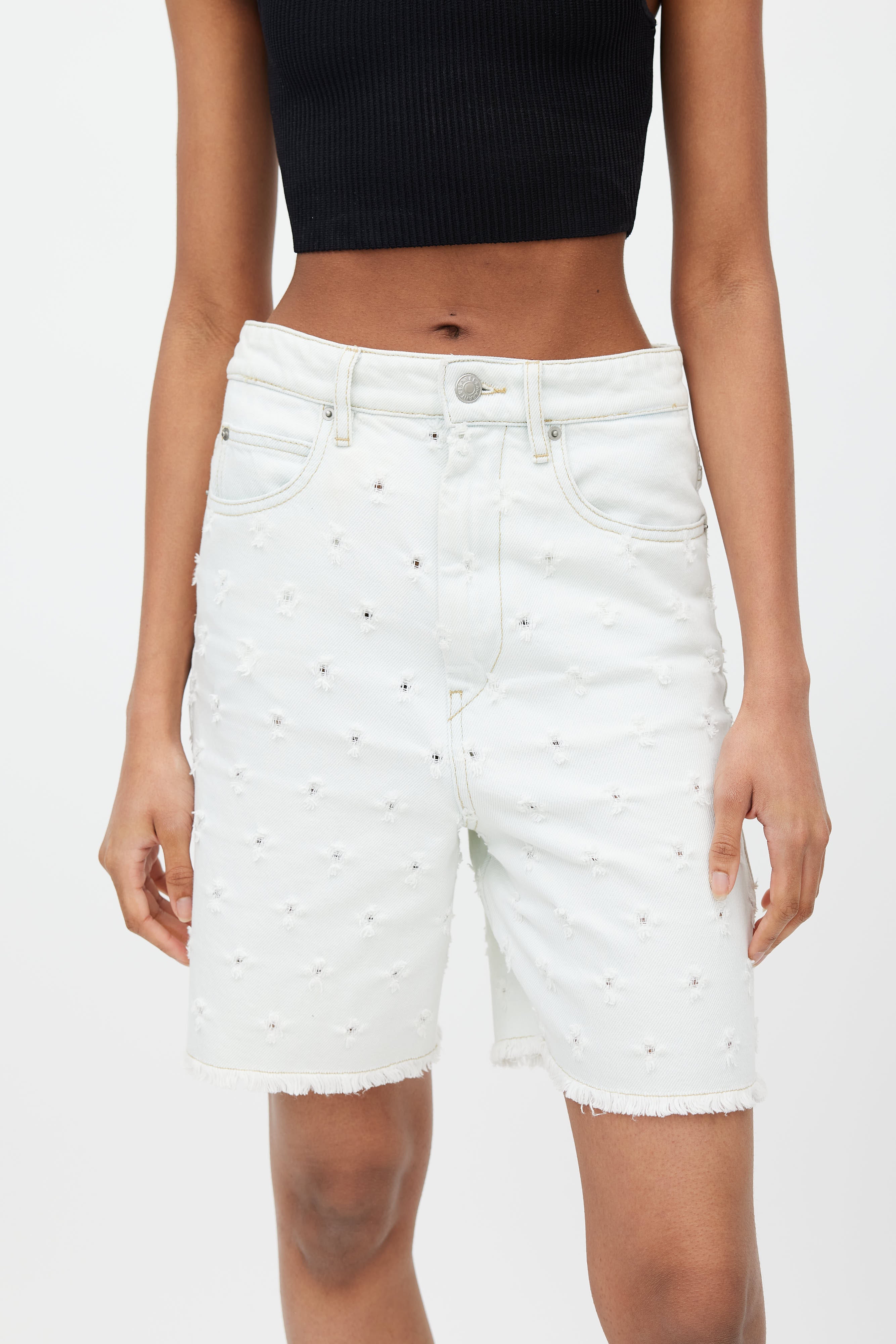 Pre-owned Isabel Marant Étoile light wash jean shorts featuring belt loops, five pocket styling, zip fly, and purposeful distressing throughout.