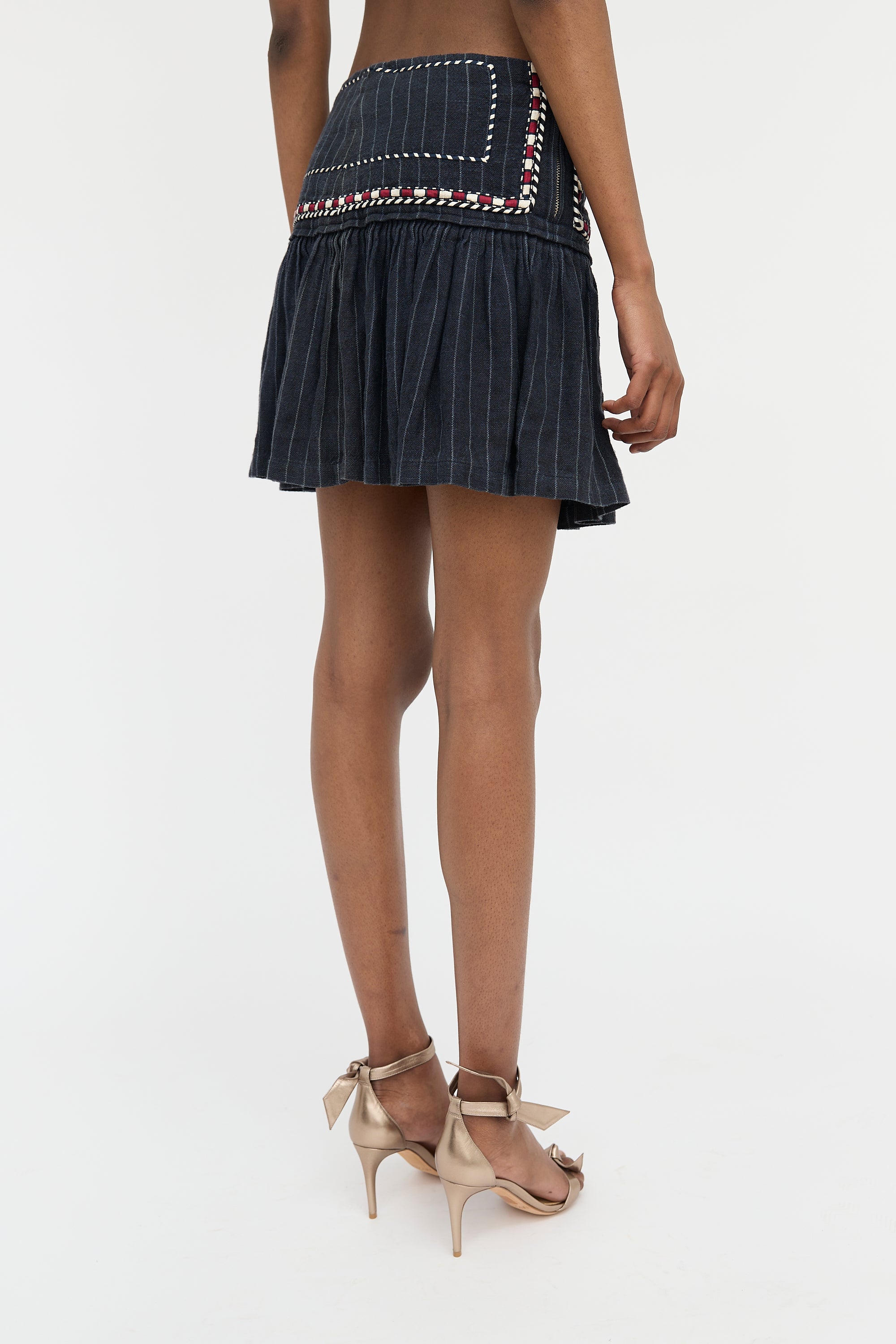 Pre-owned Isabel Marant Étoile navy linen Jessie mini skirt featuring white pinstripes, dropped waist, multicolour striped trim, concealed back zip, and gathered skirt. Partially lined. Clipped to fit model.
