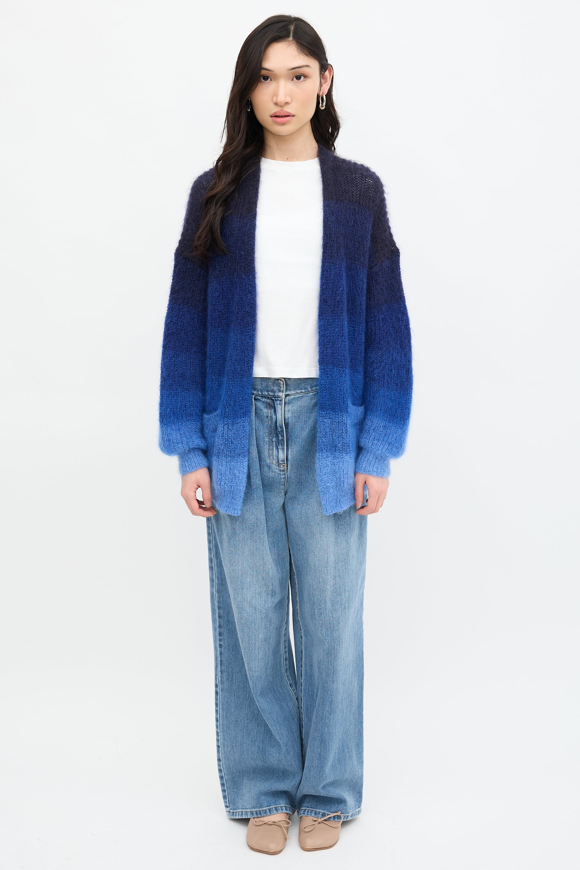 Pre-owned Isabel Marant Étoile blue mohair blend Dana cardigan featuring ombré, open front, two front pockets, and ribbed pocket edges, hem, and cuffs.