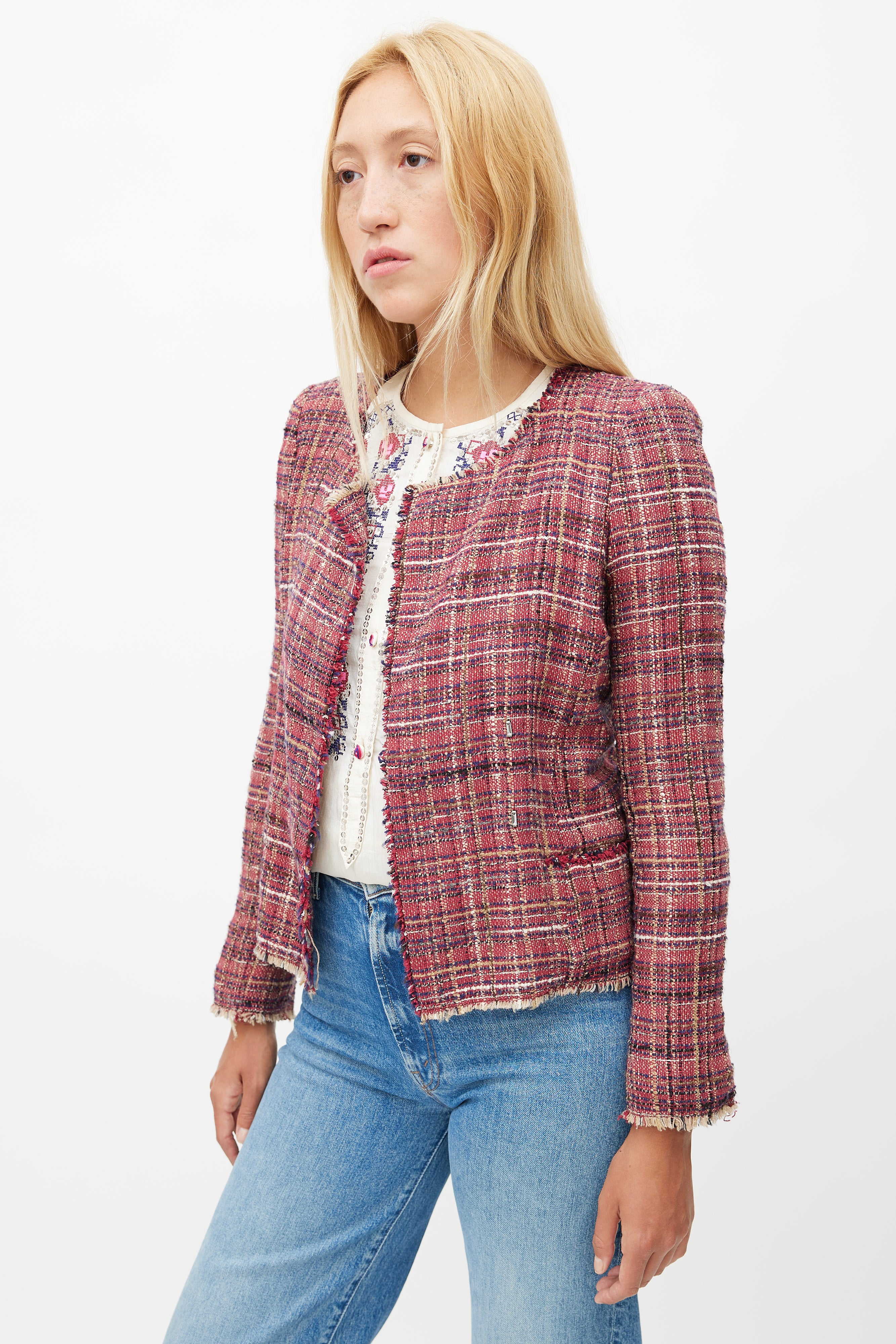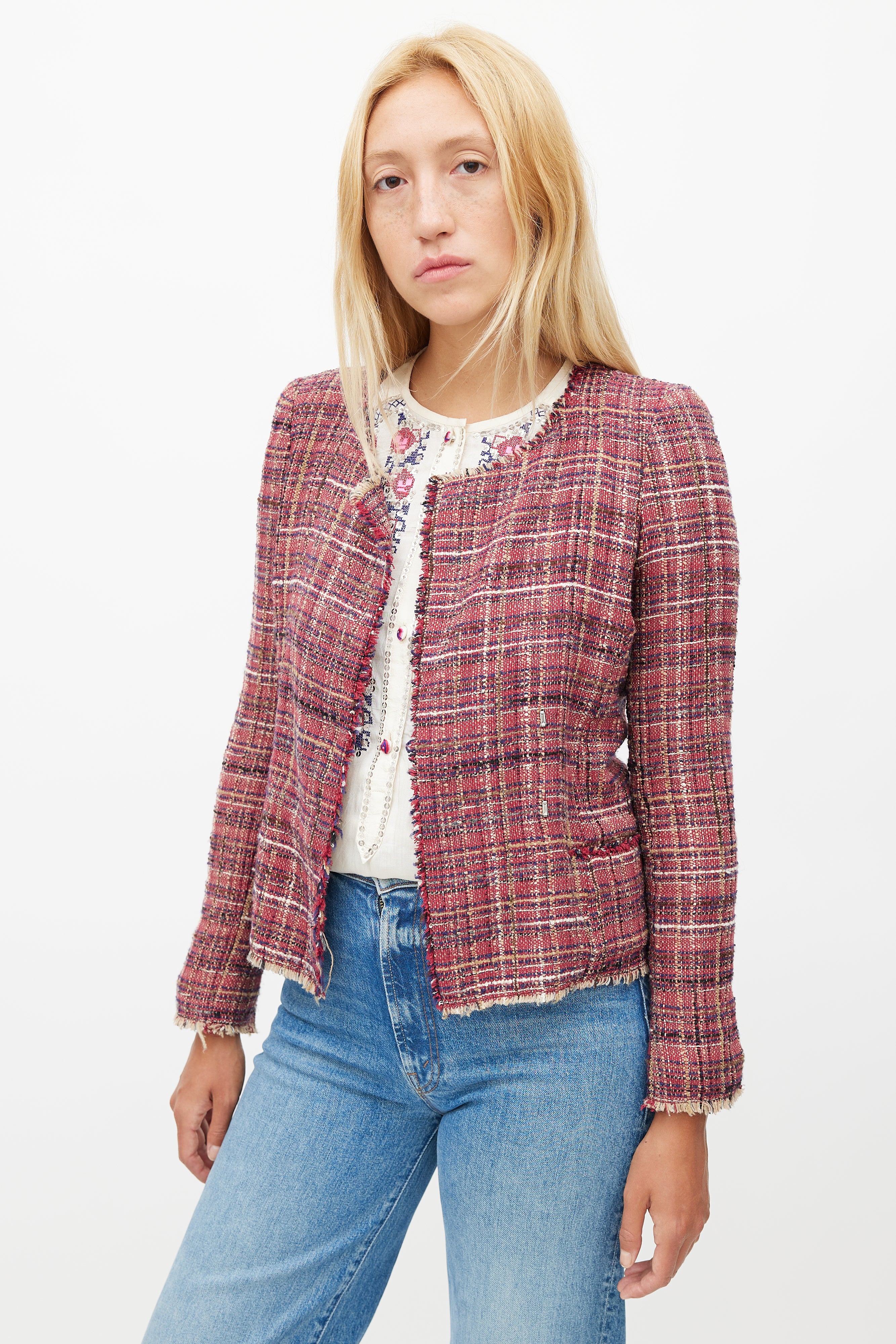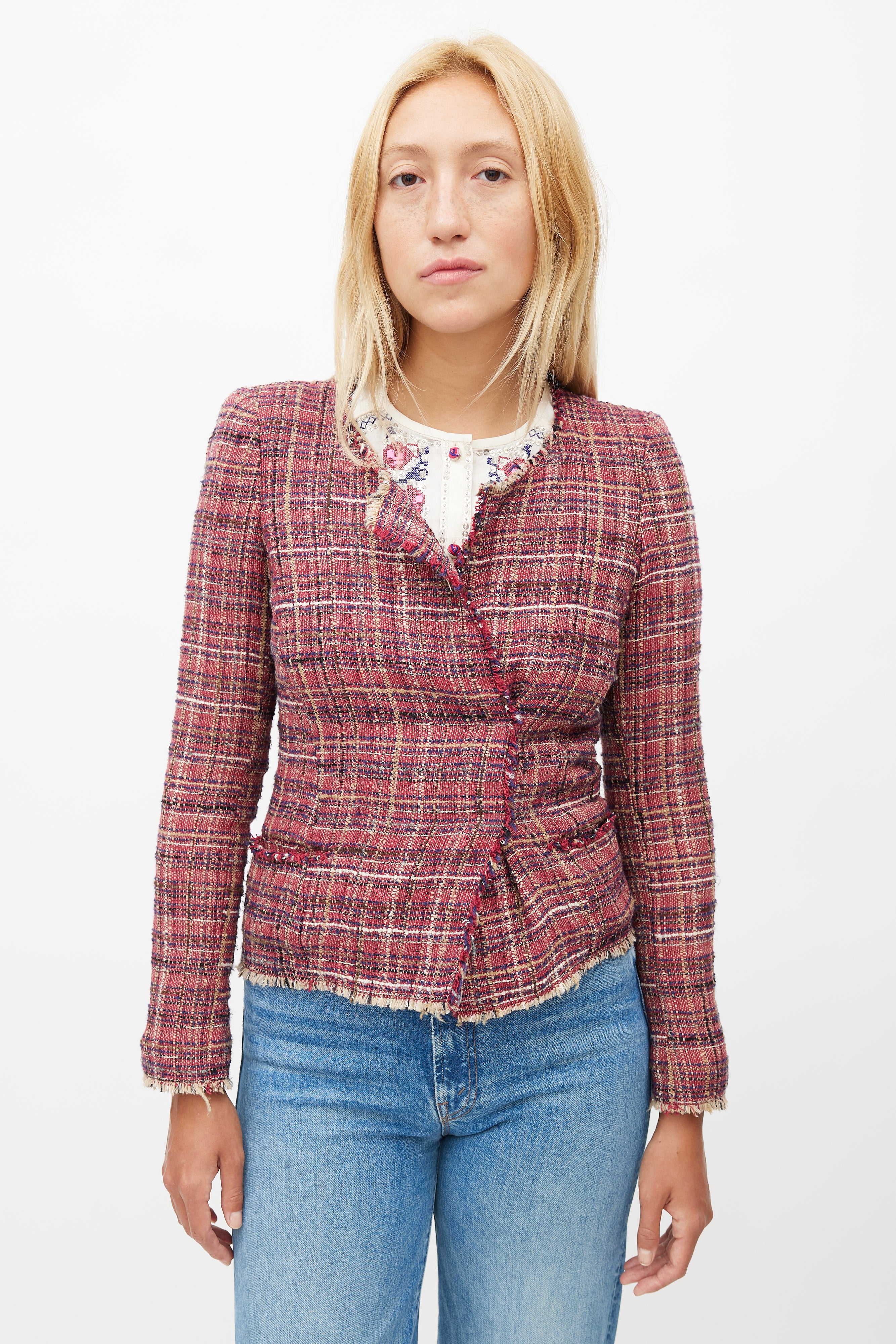 Pre-owned Isabel Marant Étoile red blazer featuring a multicolour tweed, structured shoulders, two slip pockets at hip, raw hem, and open front.