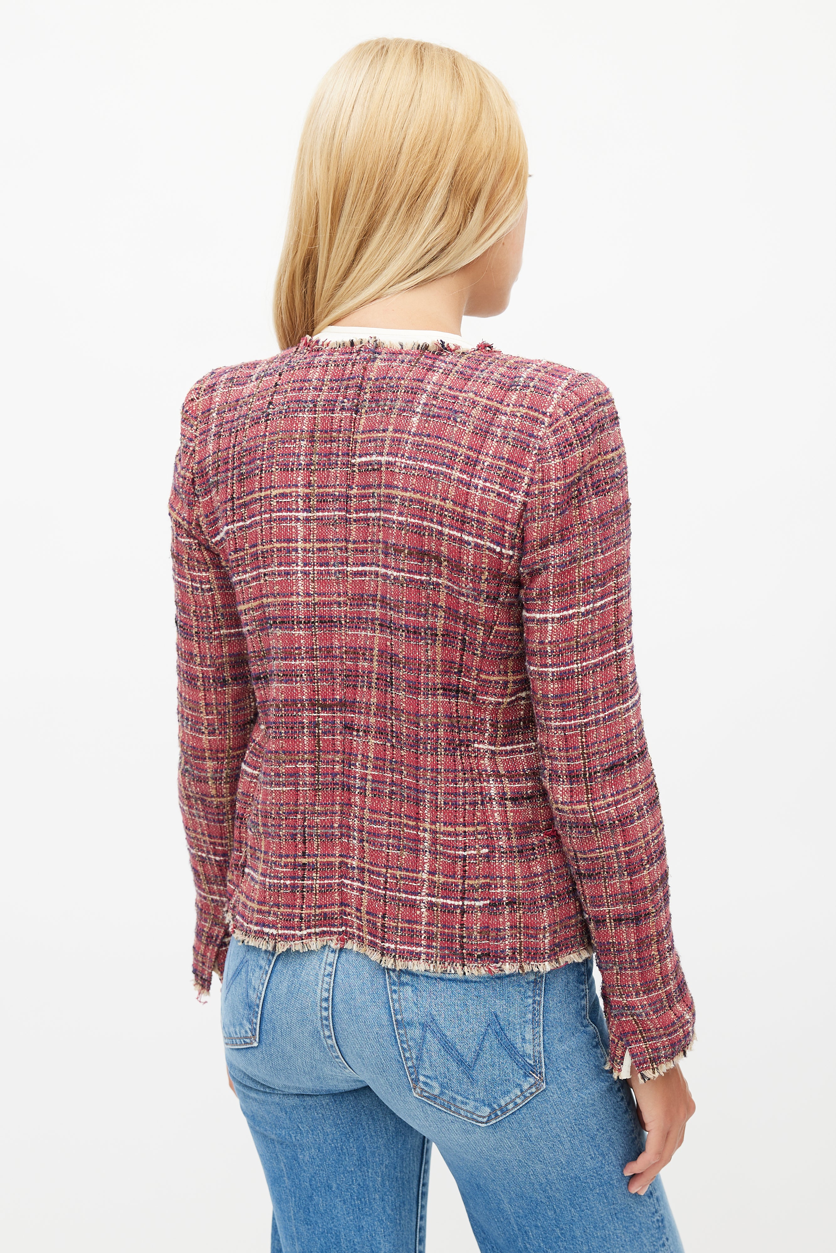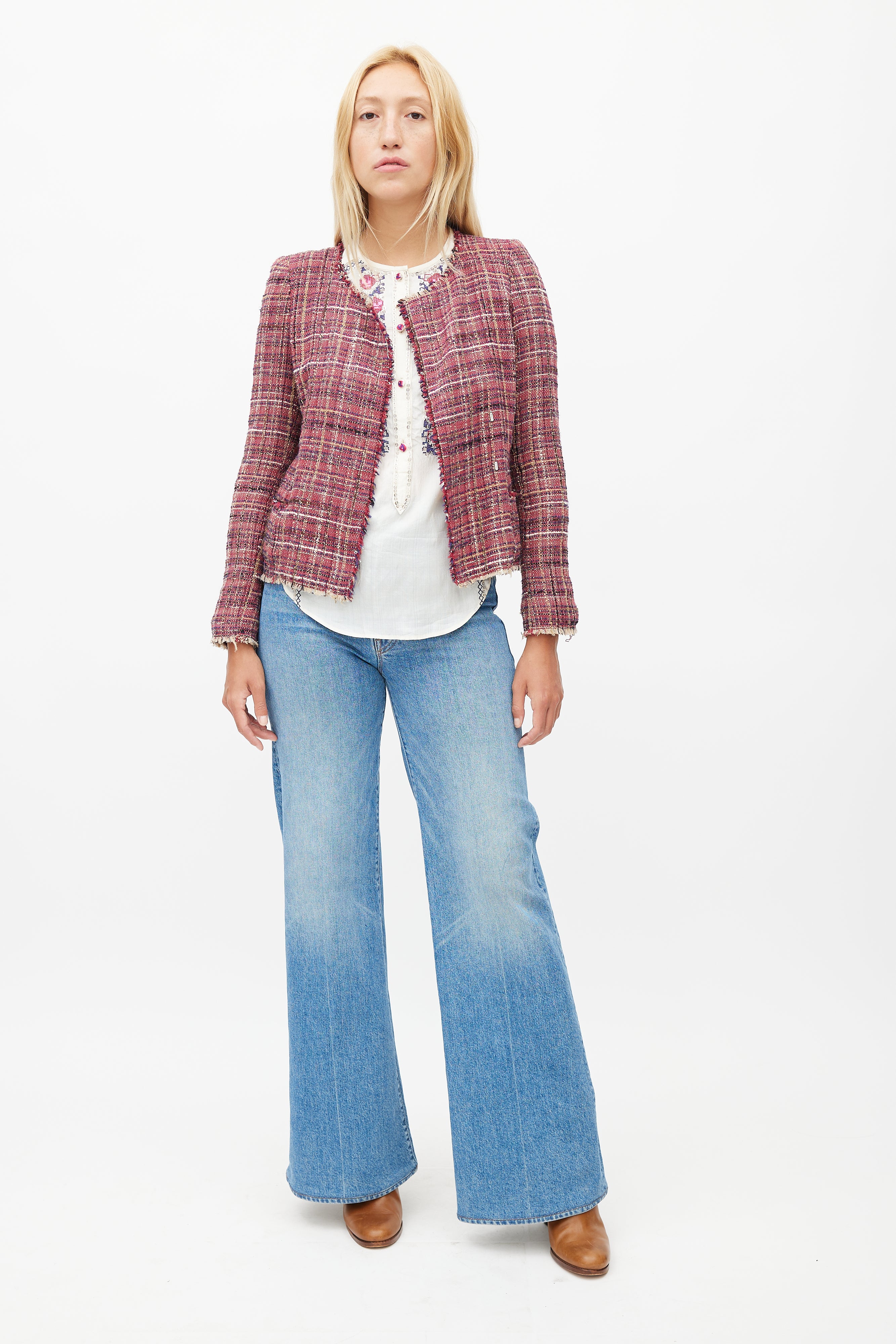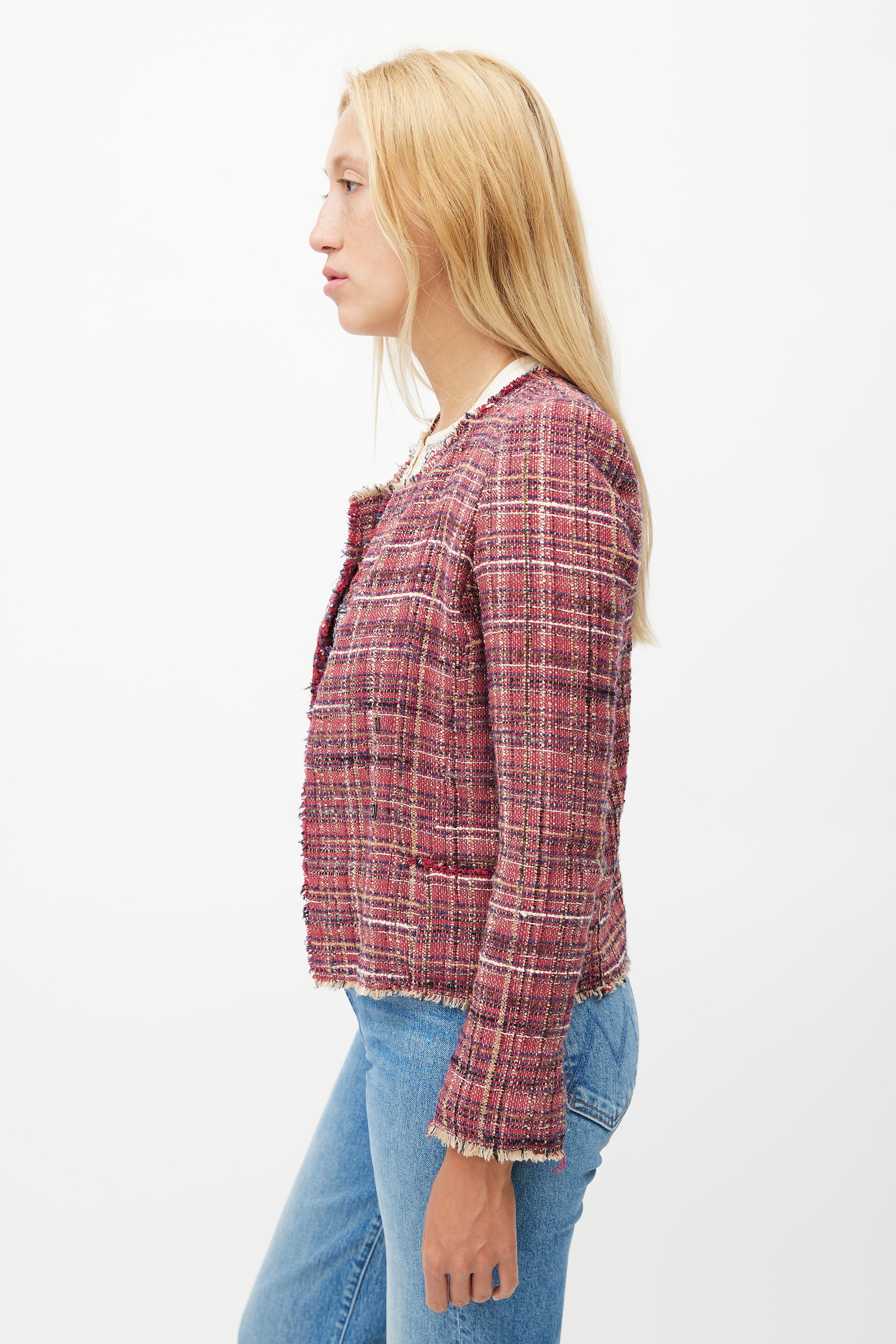 Pre-owned Isabel Marant Étoile red blazer featuring a multicolour tweed, structured shoulders, two slip pockets at hip, raw hem, and open front.
