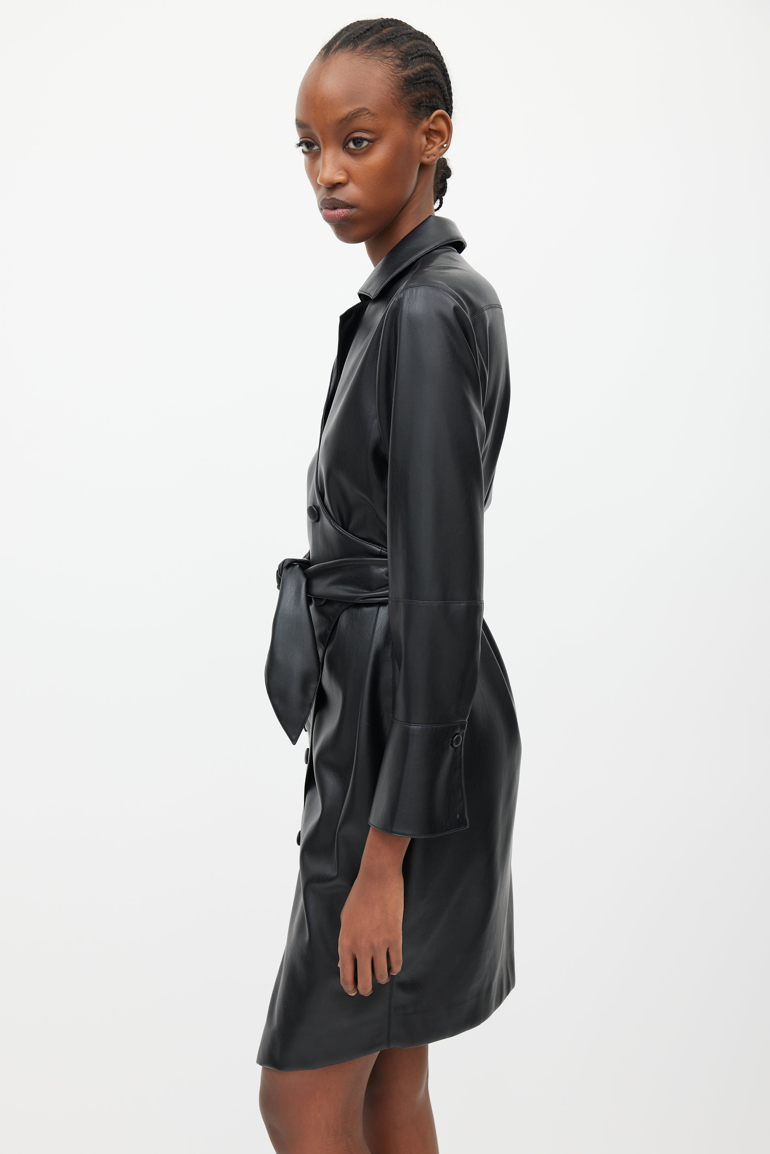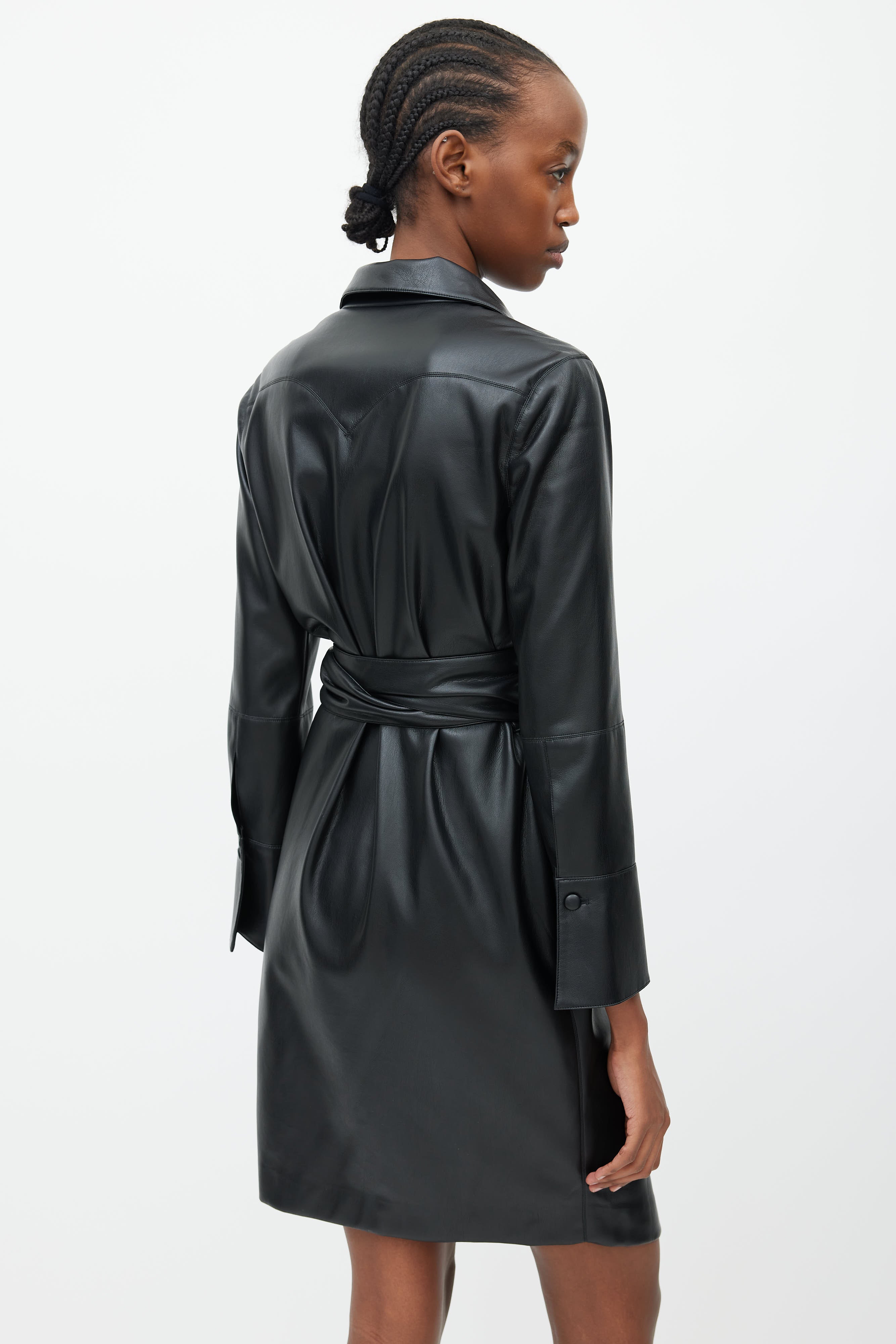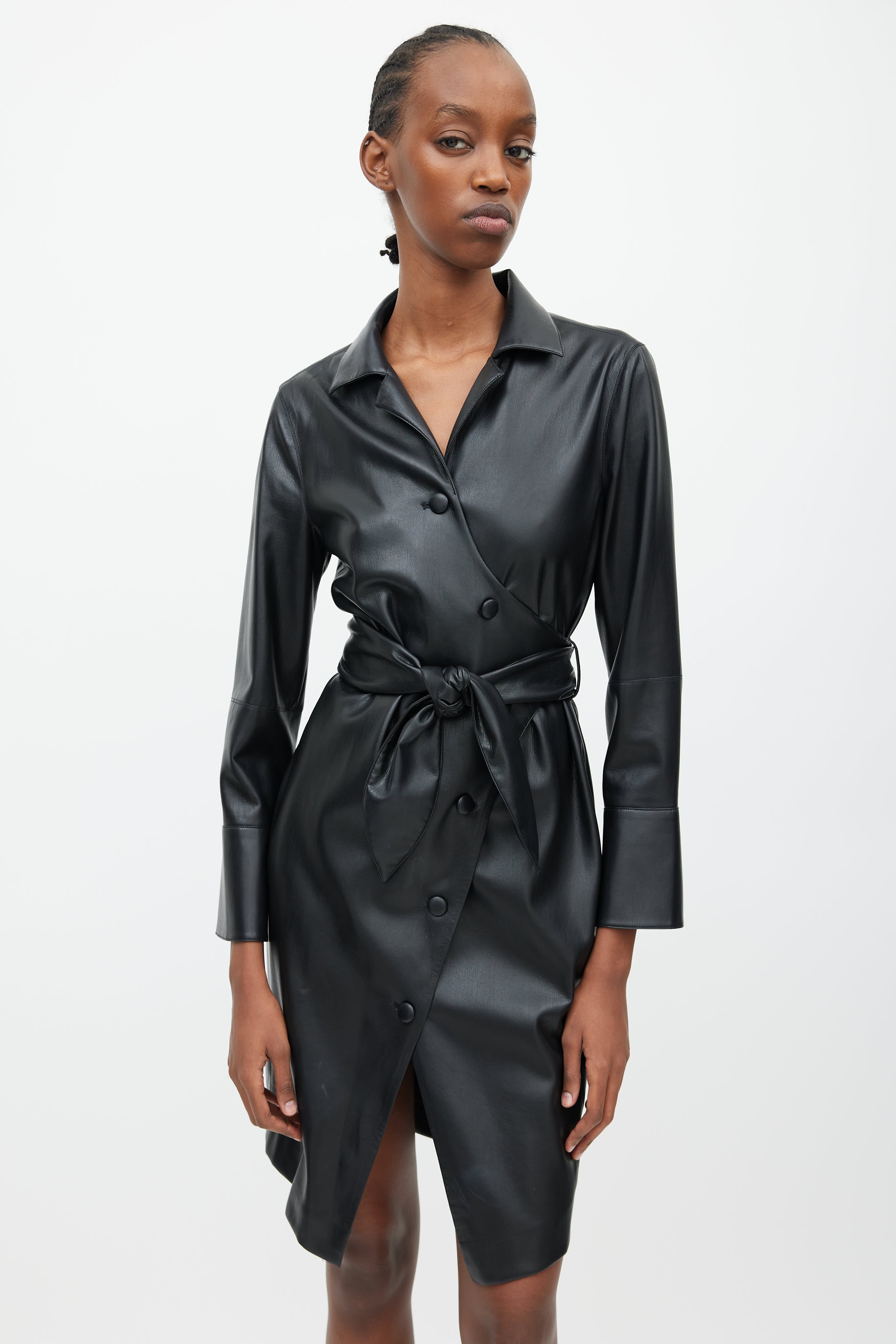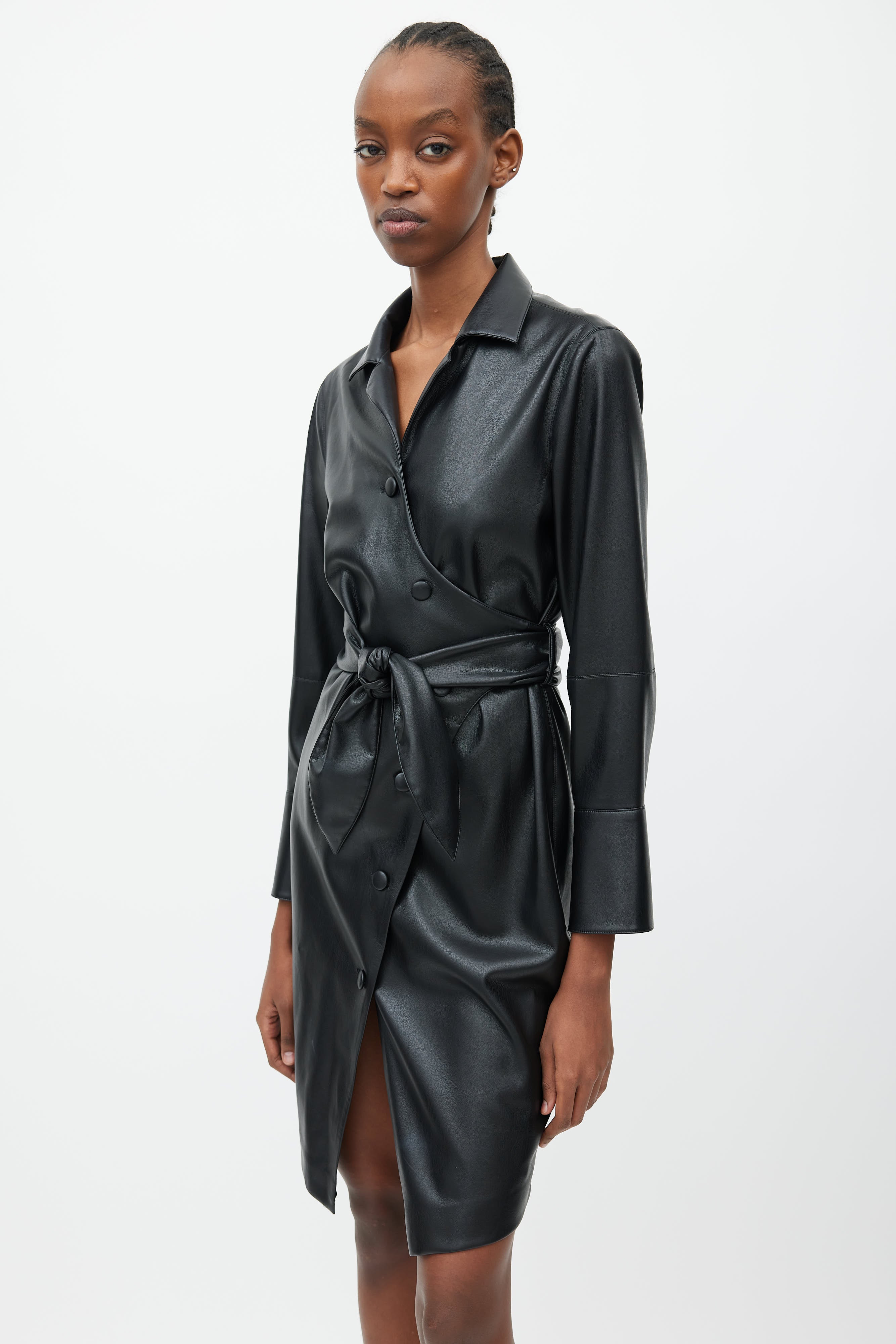 Pre-owned Nanushka black faux leather dress featuring a pointed collar, long sleeves with buttoned cuffs, and wrap front with button closure. Lined.