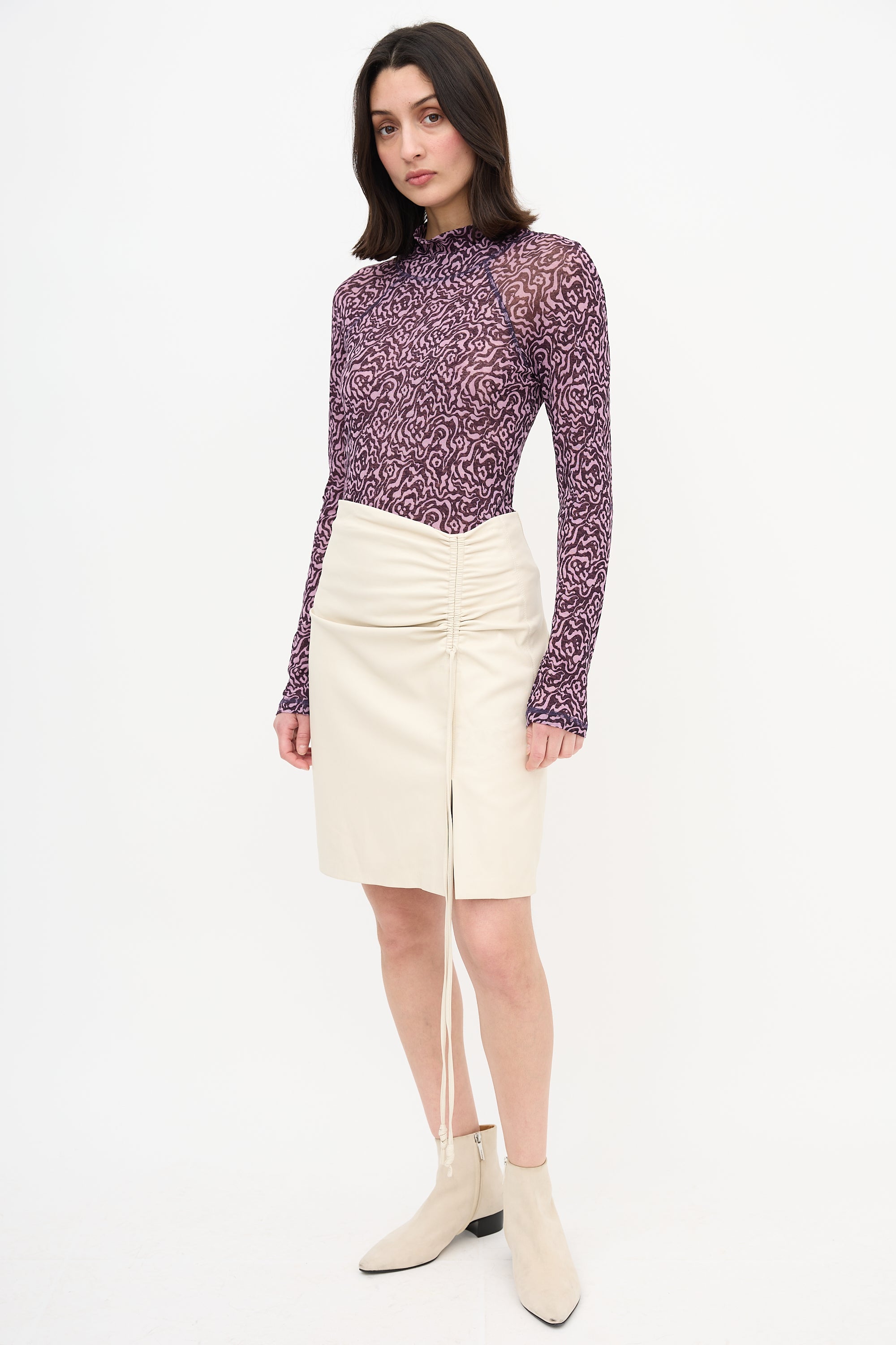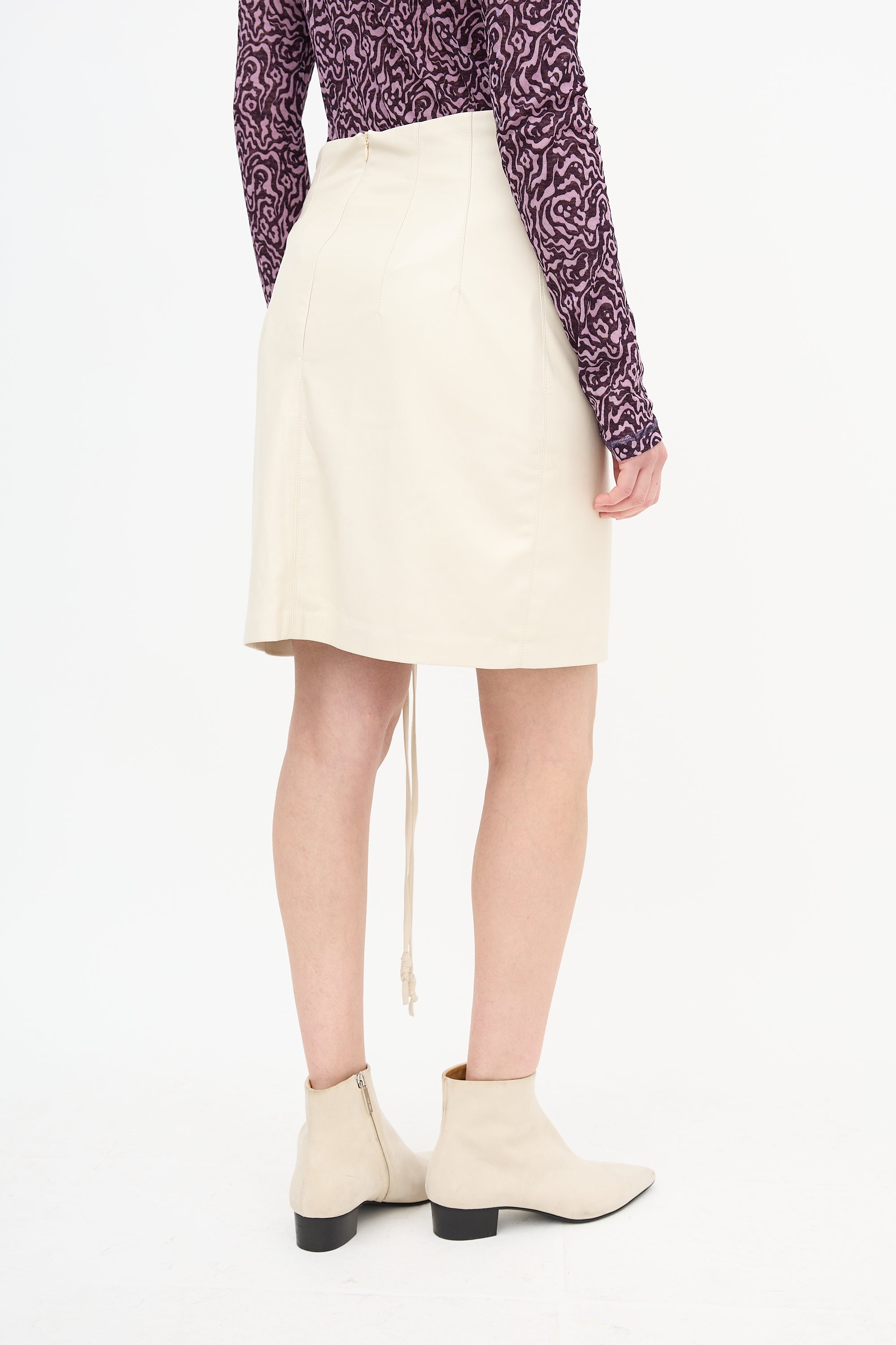 Pre-owned Nanushka cream faux leather Zow skirt featuring a back zip closure, darted waist, cinchable ruched front, and side slit. Lined.