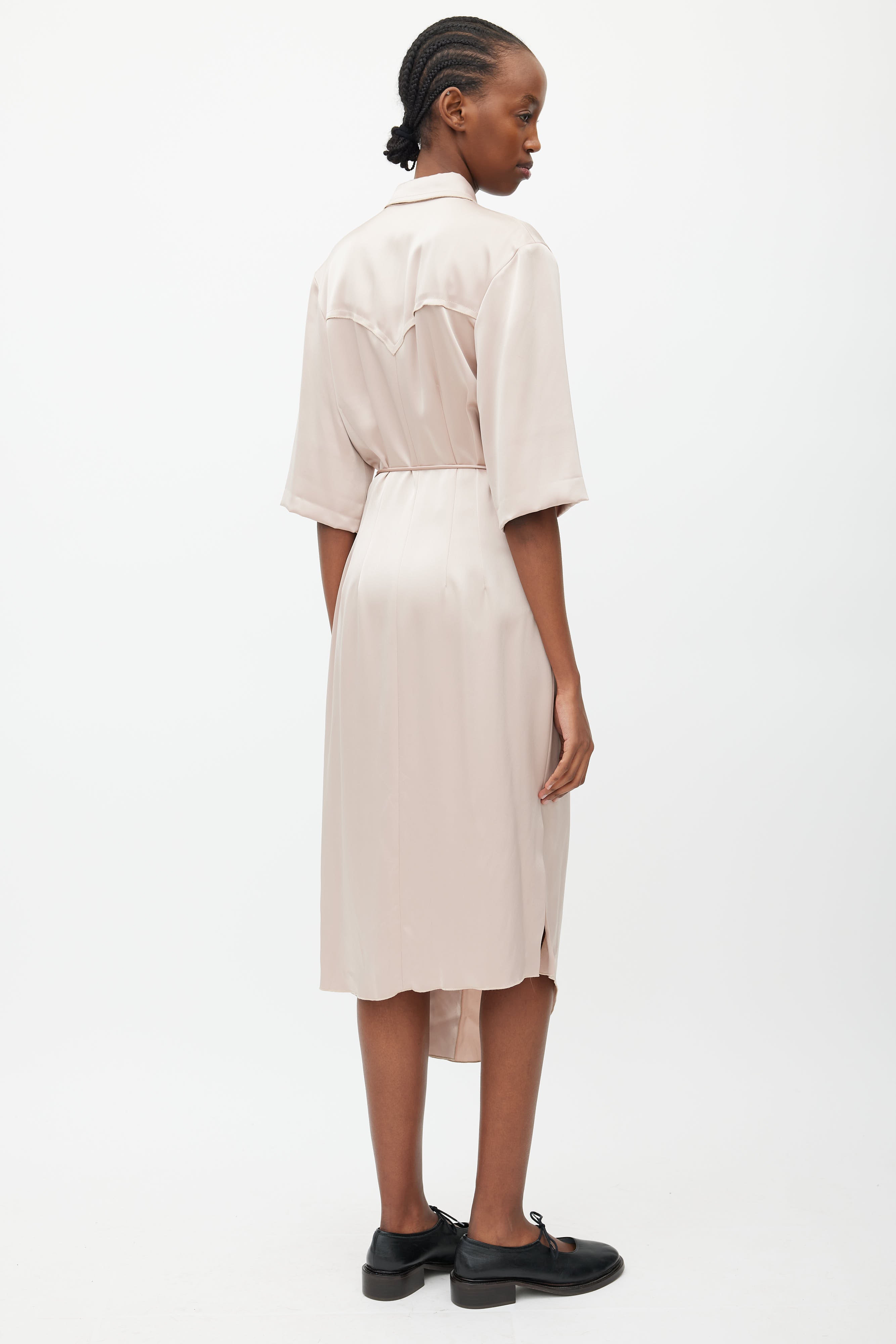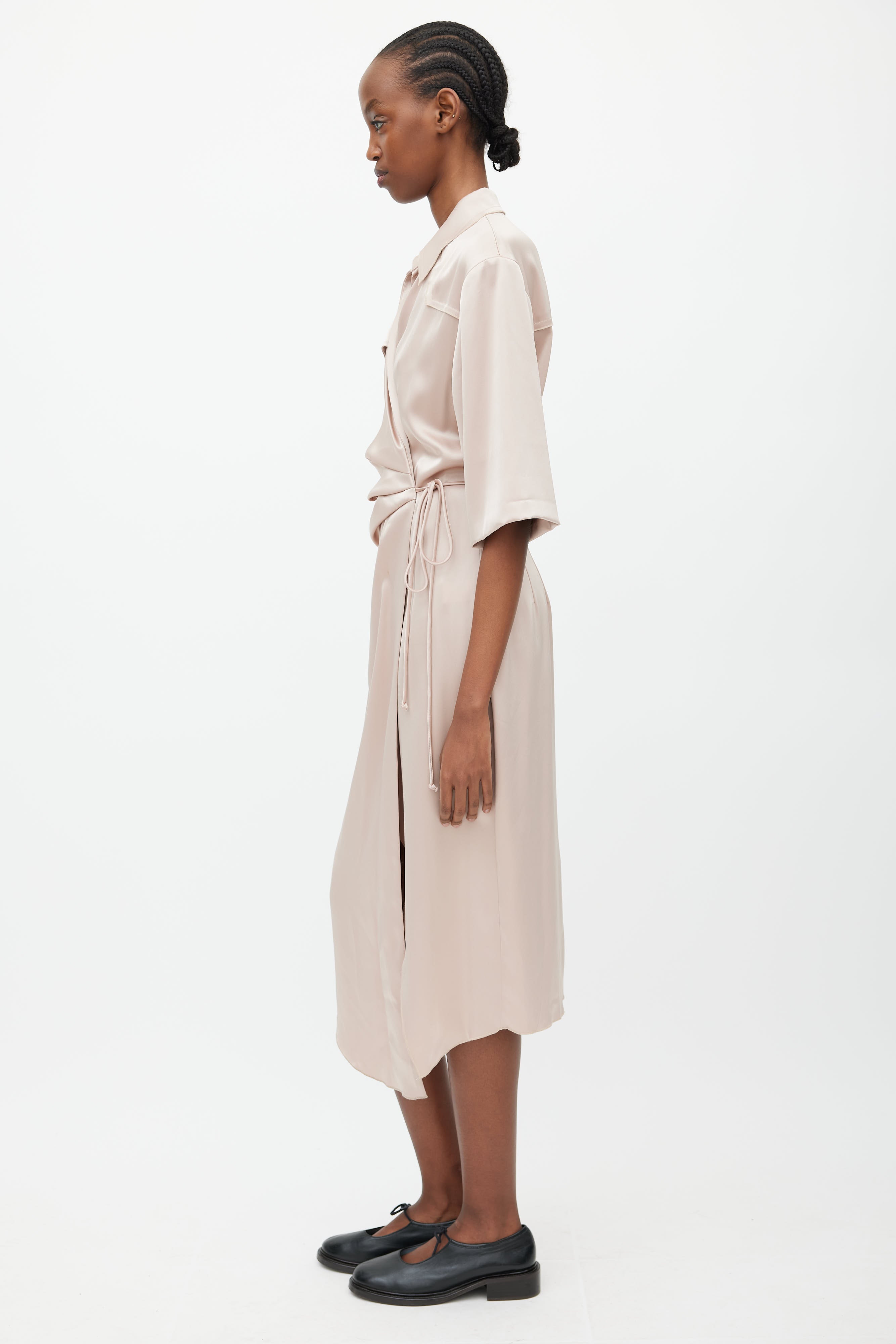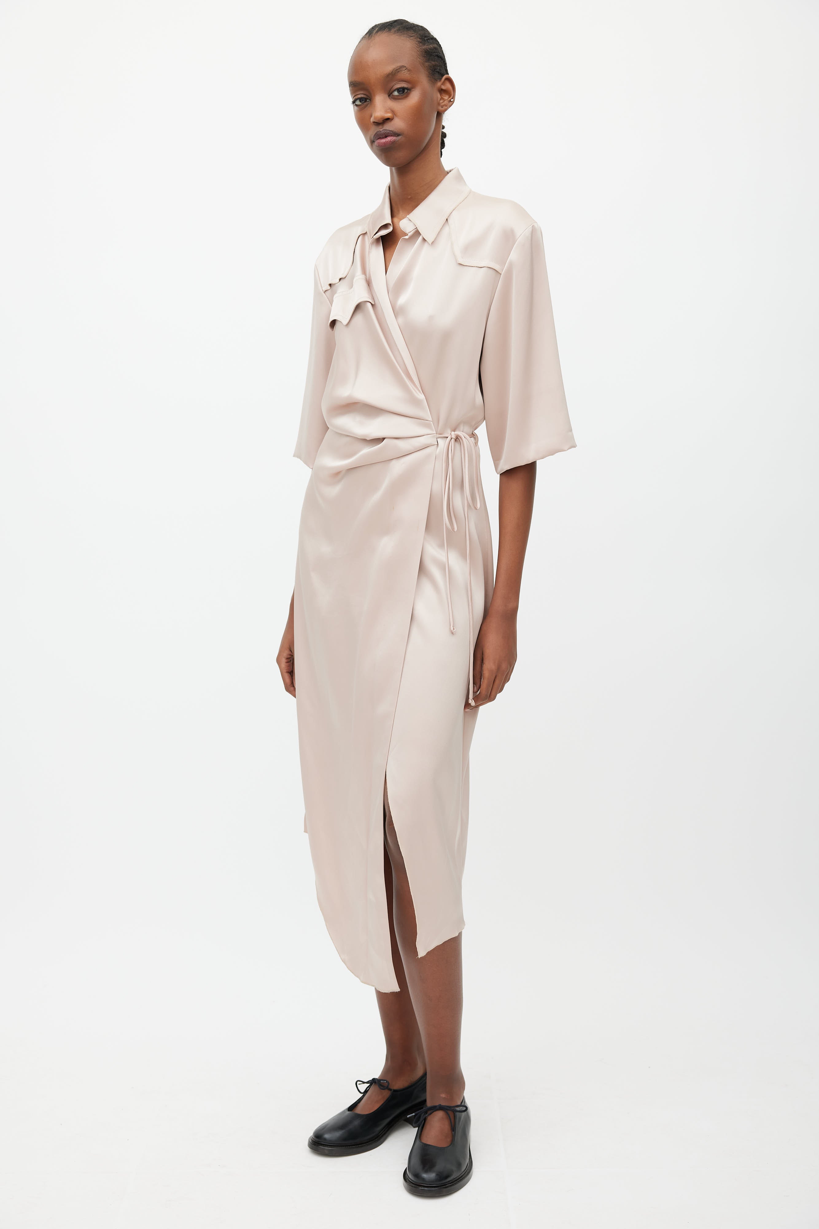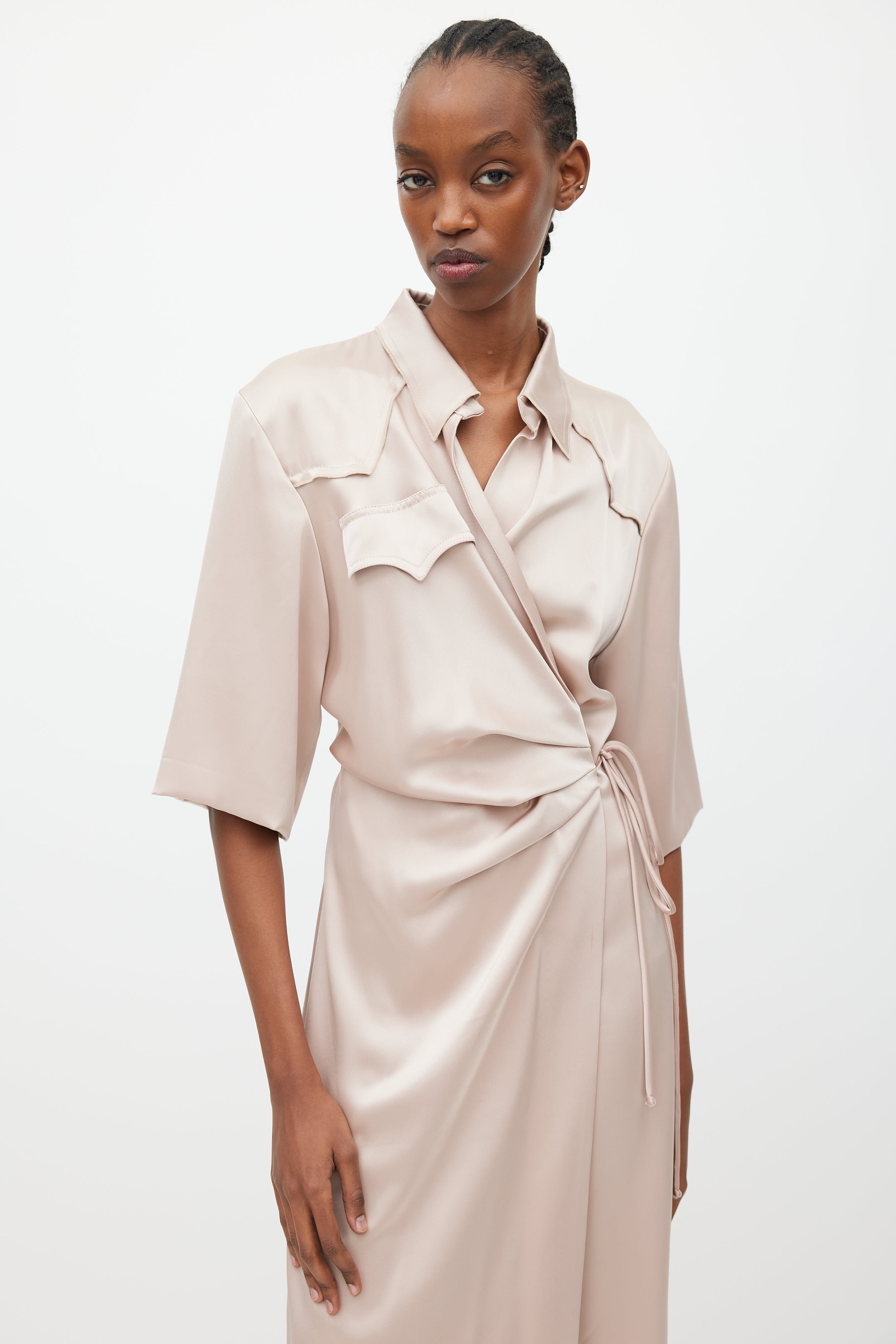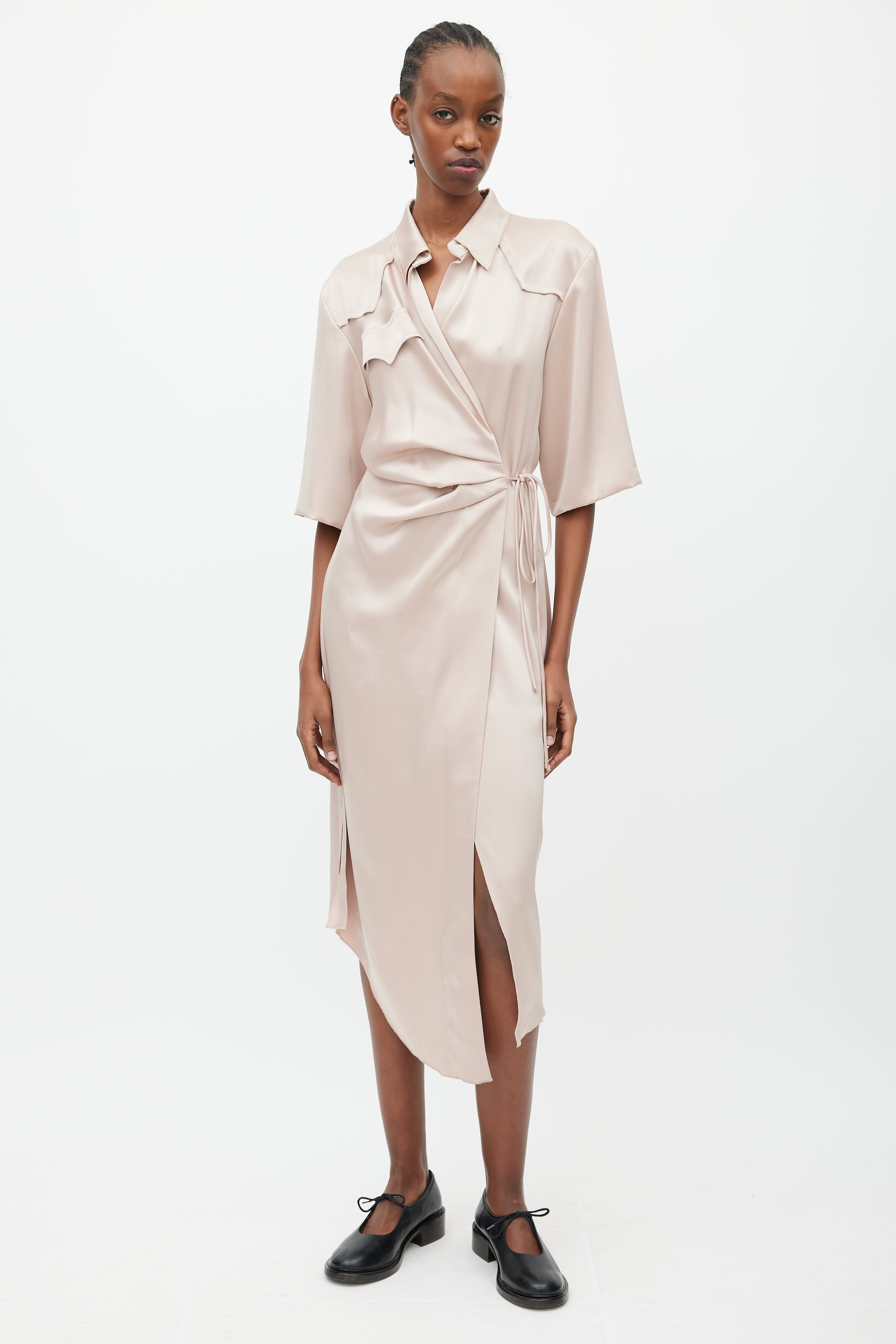 Nanushka pink satin dress featuring a pointed collar, three quarter length sleeves, one faux flap pocket at chest, gathered detail at waist, and wrap front with tie closure.