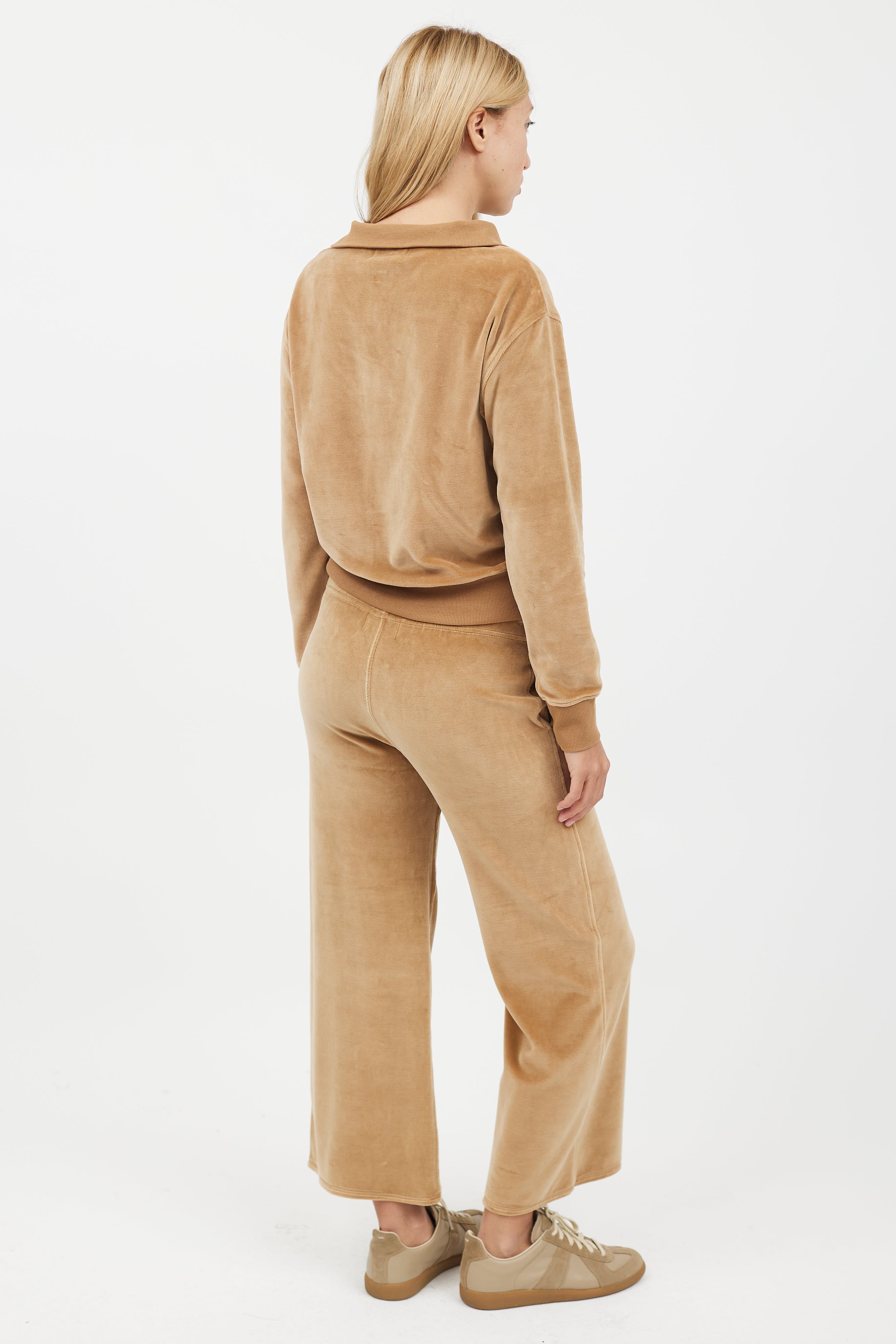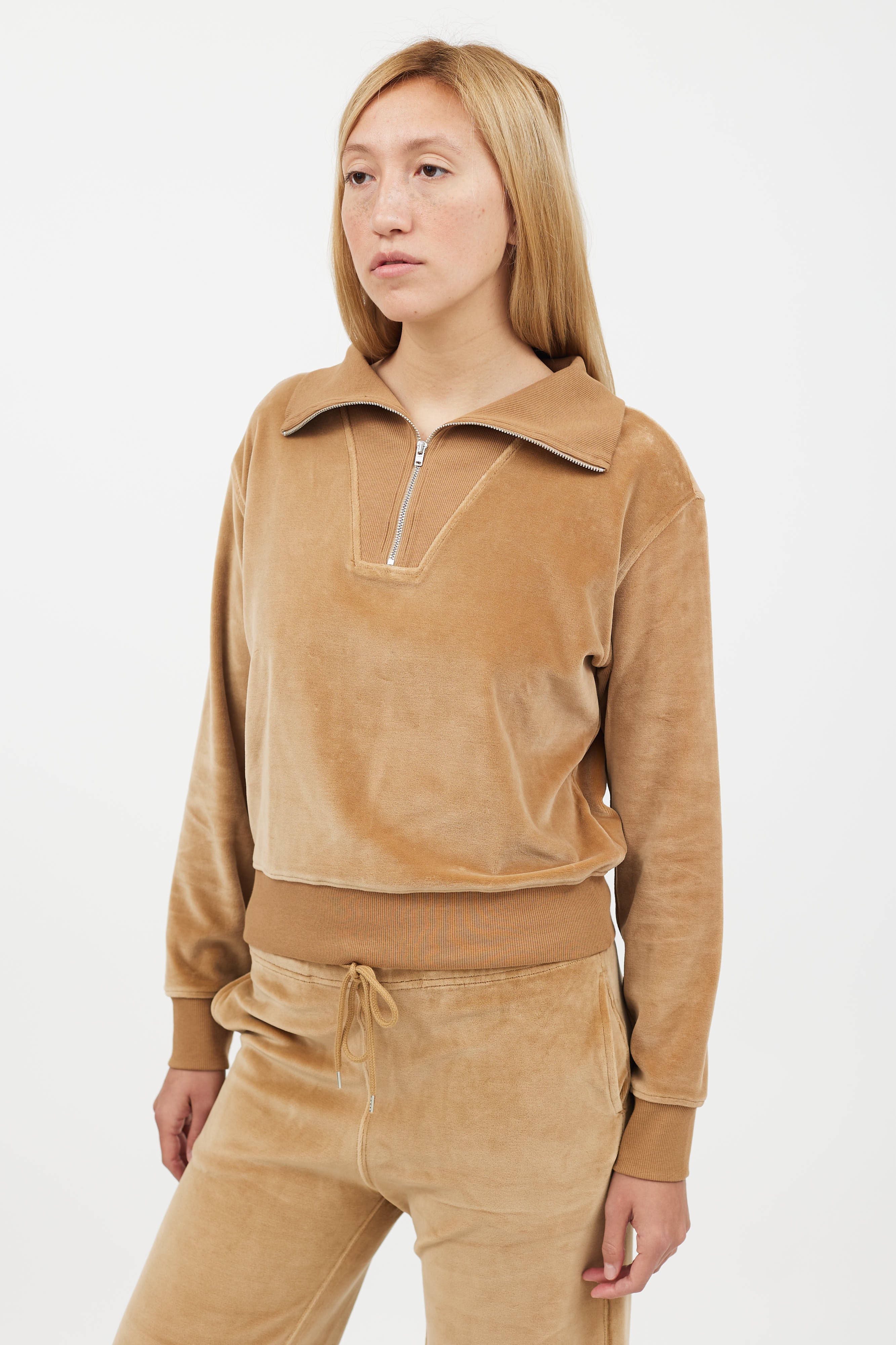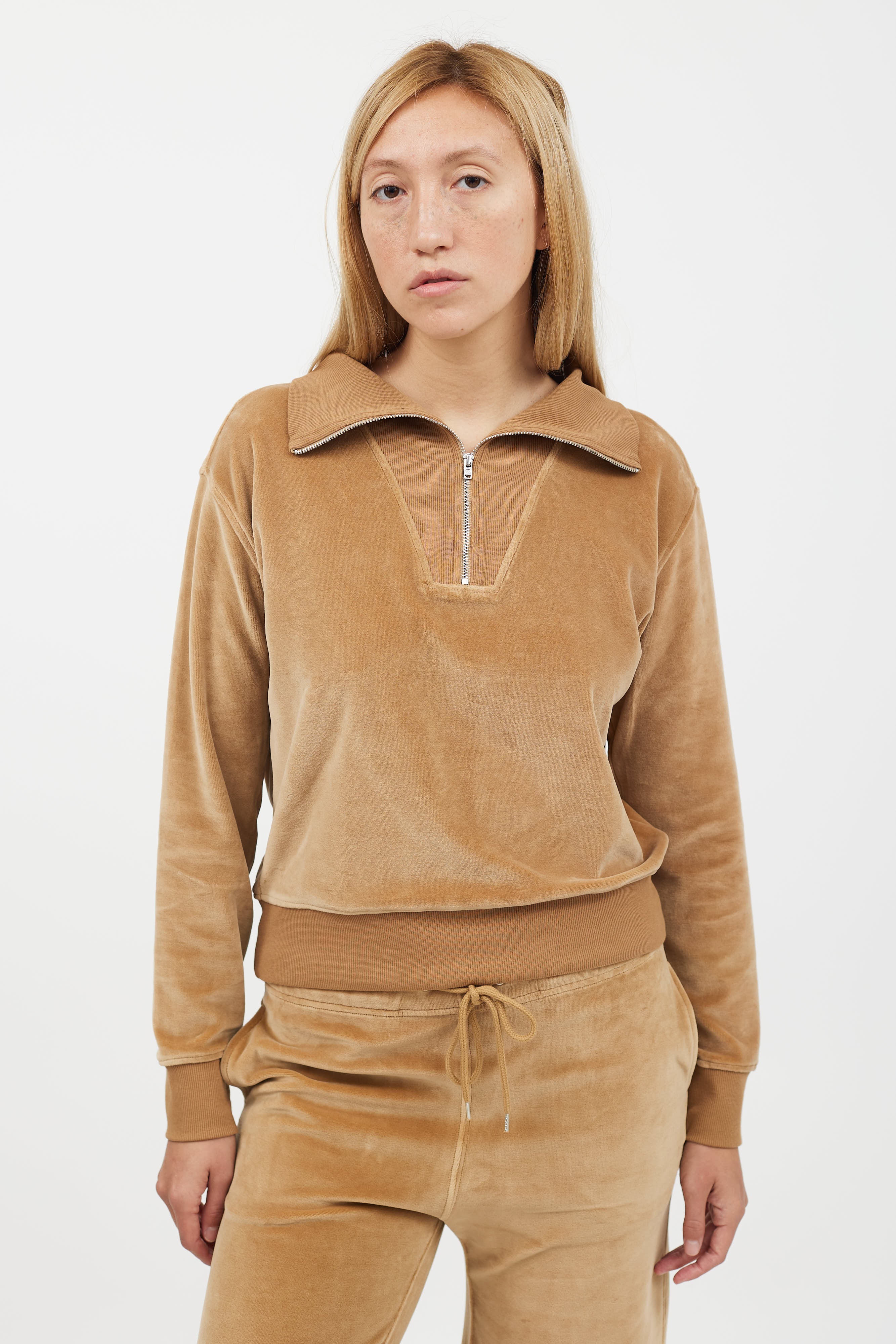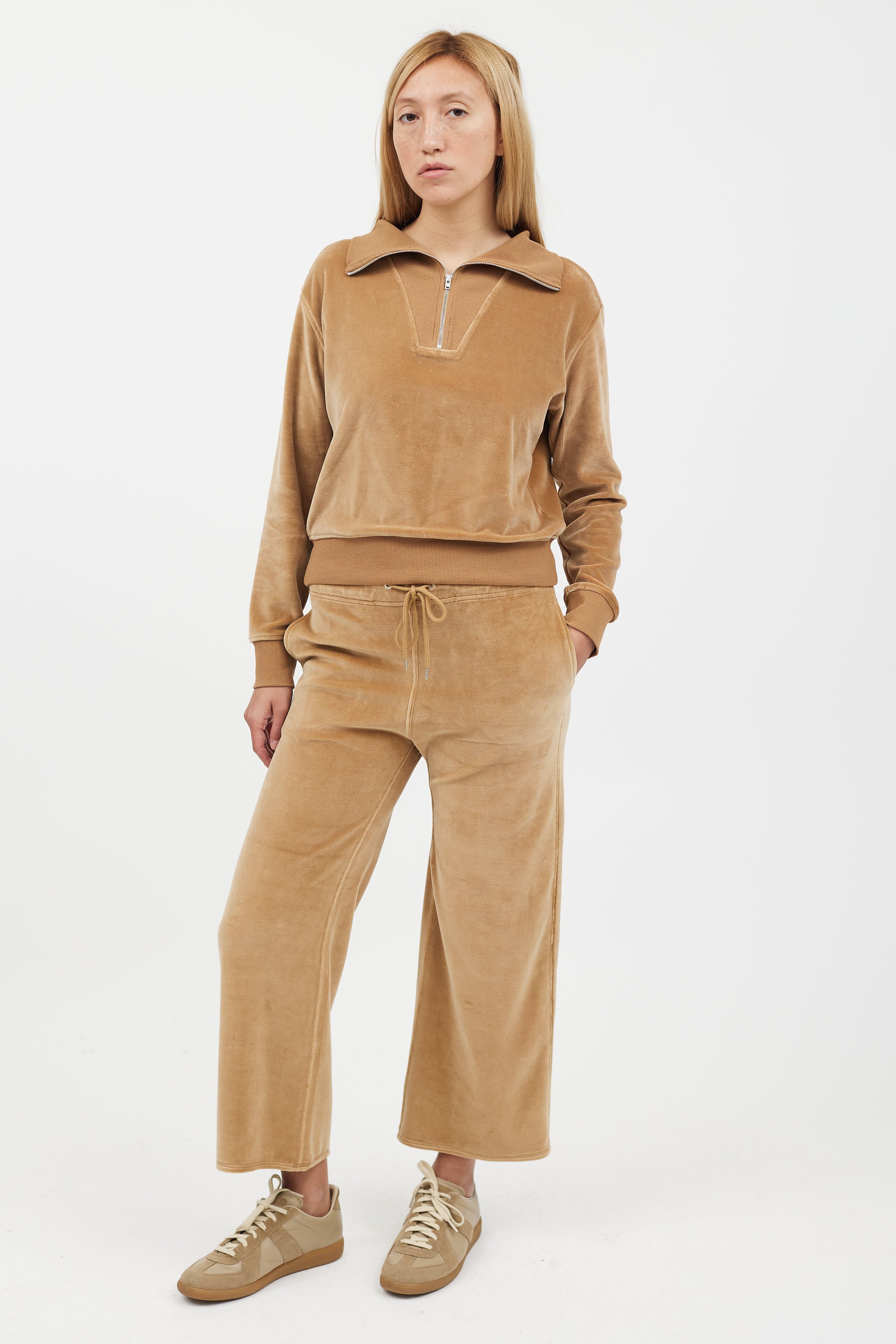 Pre-owned Nili Lotan beige velvet quarter zip sweater featuring silver tone zip at neck, large rubbed collar, ribbed cuffs and hem. Beige velvet straight legtrouser featuring drawstring waistband, silver tone hardware, and two slip pockets at hip.