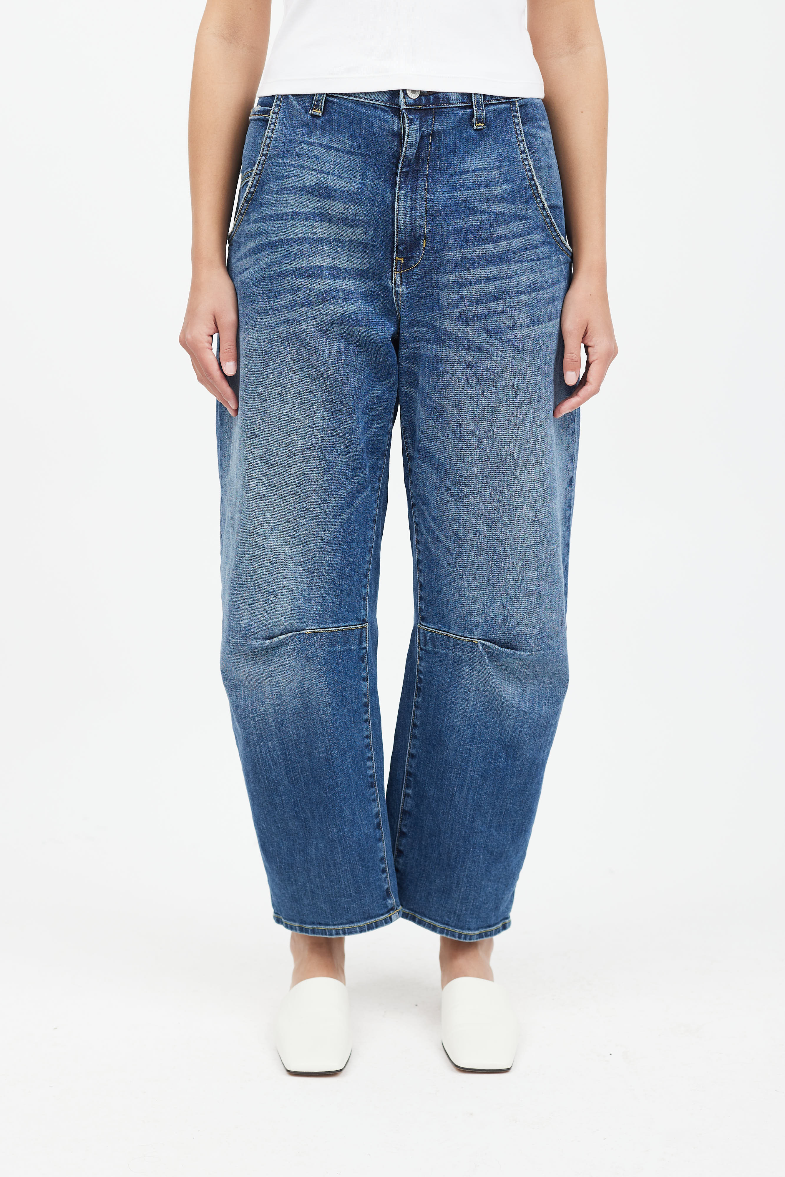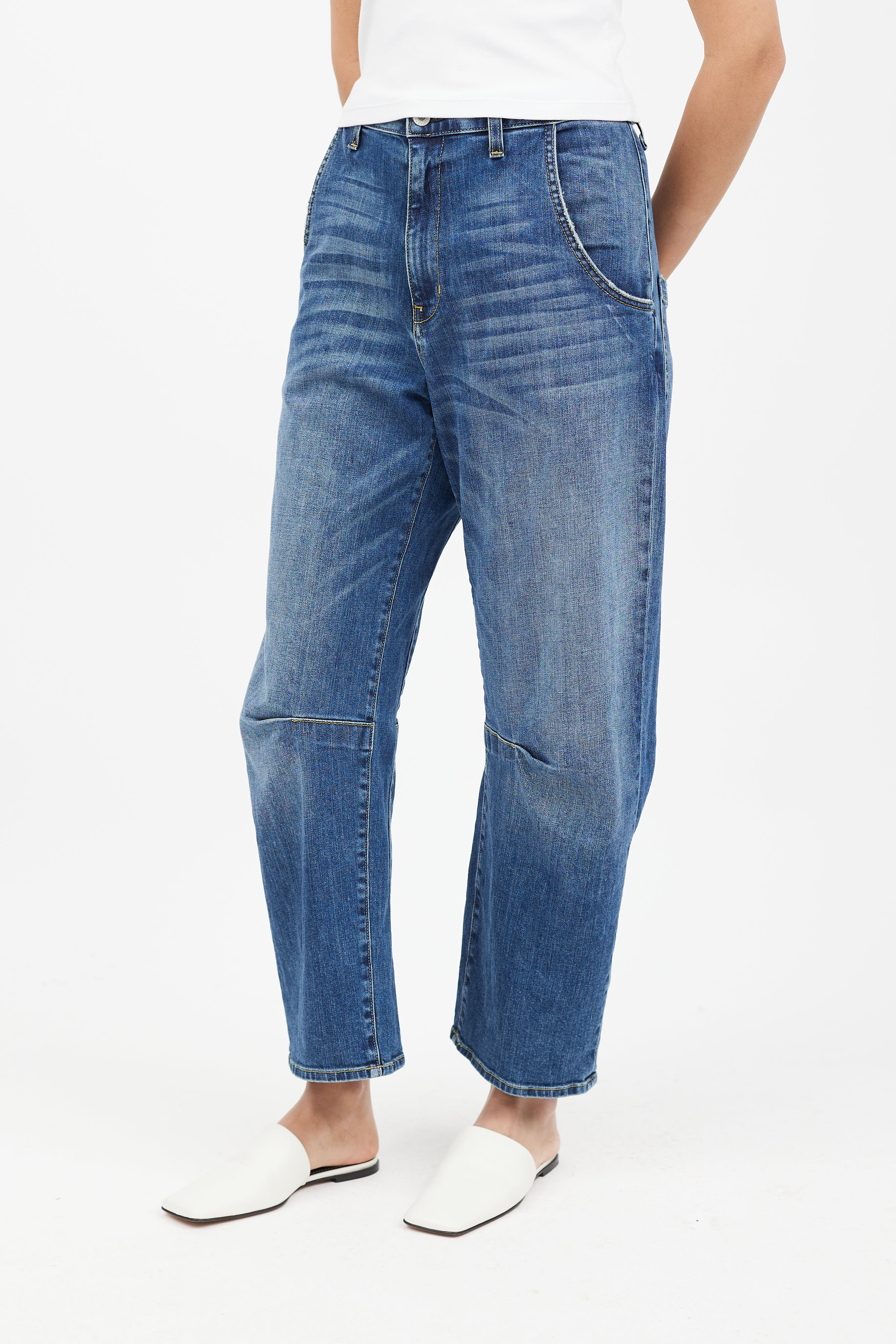 Pre-owned Nili Lotan blue medium wash denim jeans featuring slight balloon leg, five pocket styling, zip fly closure, and pleated detail at knee.