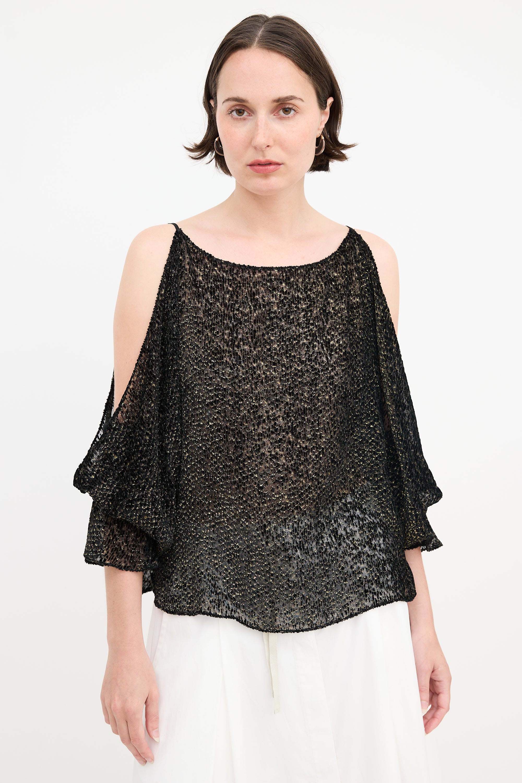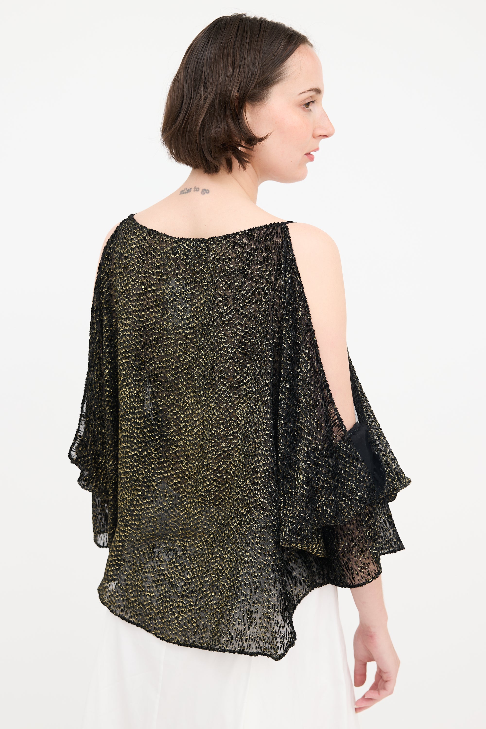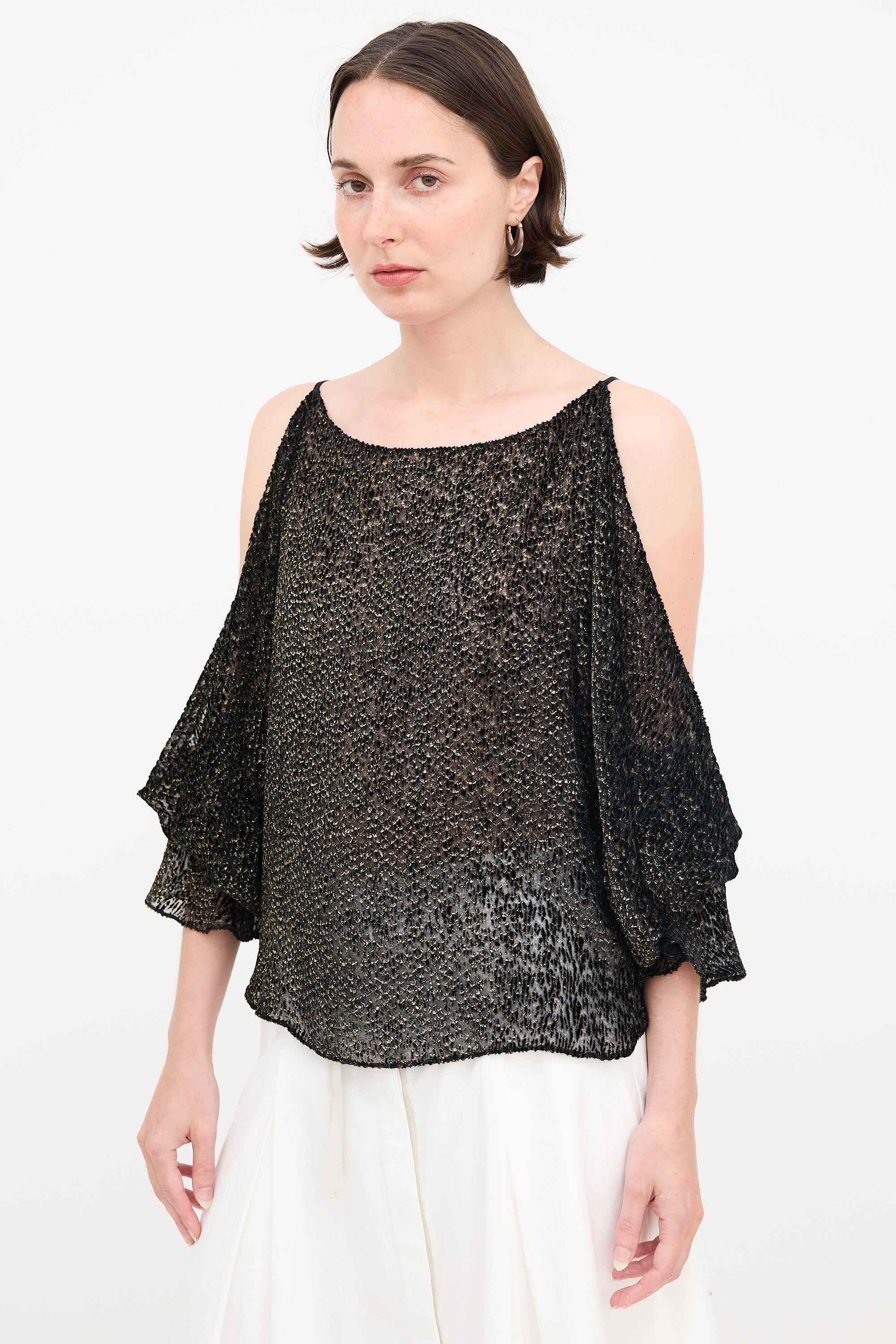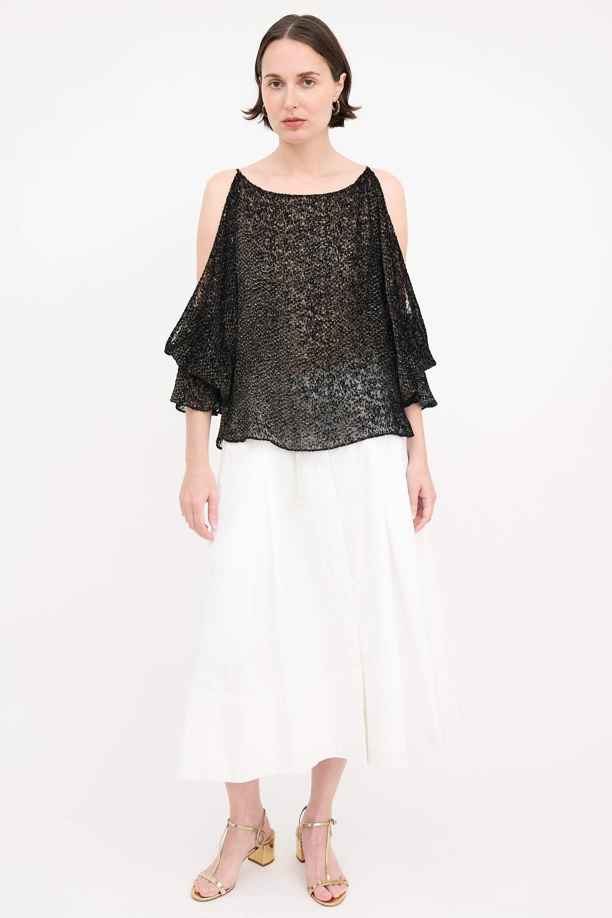 Pre-owned Nili Lotan black and gold blouse featuring burnout velvet, bateau neckline, cold shoulder, and smocked flare cuffs. Unlined.