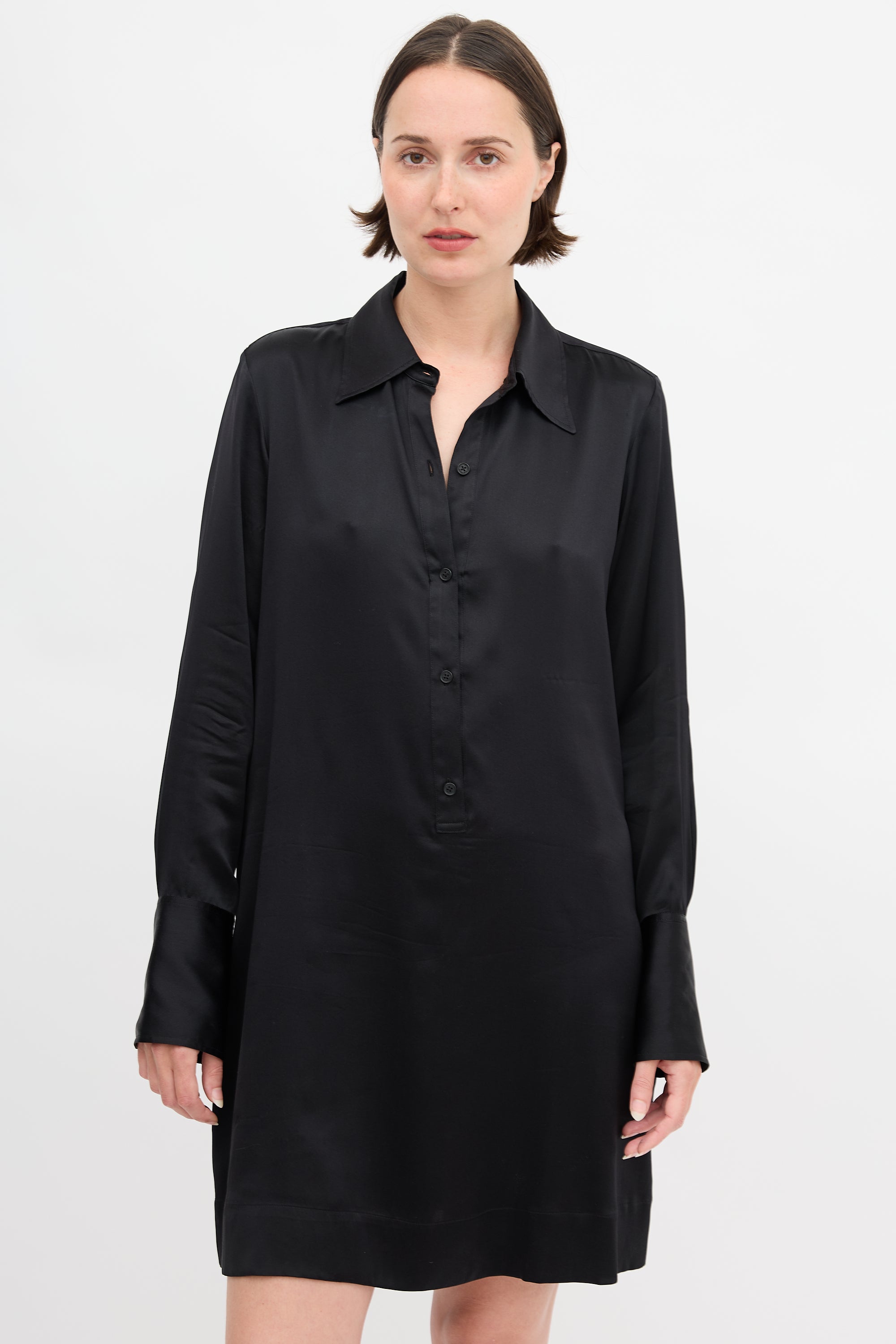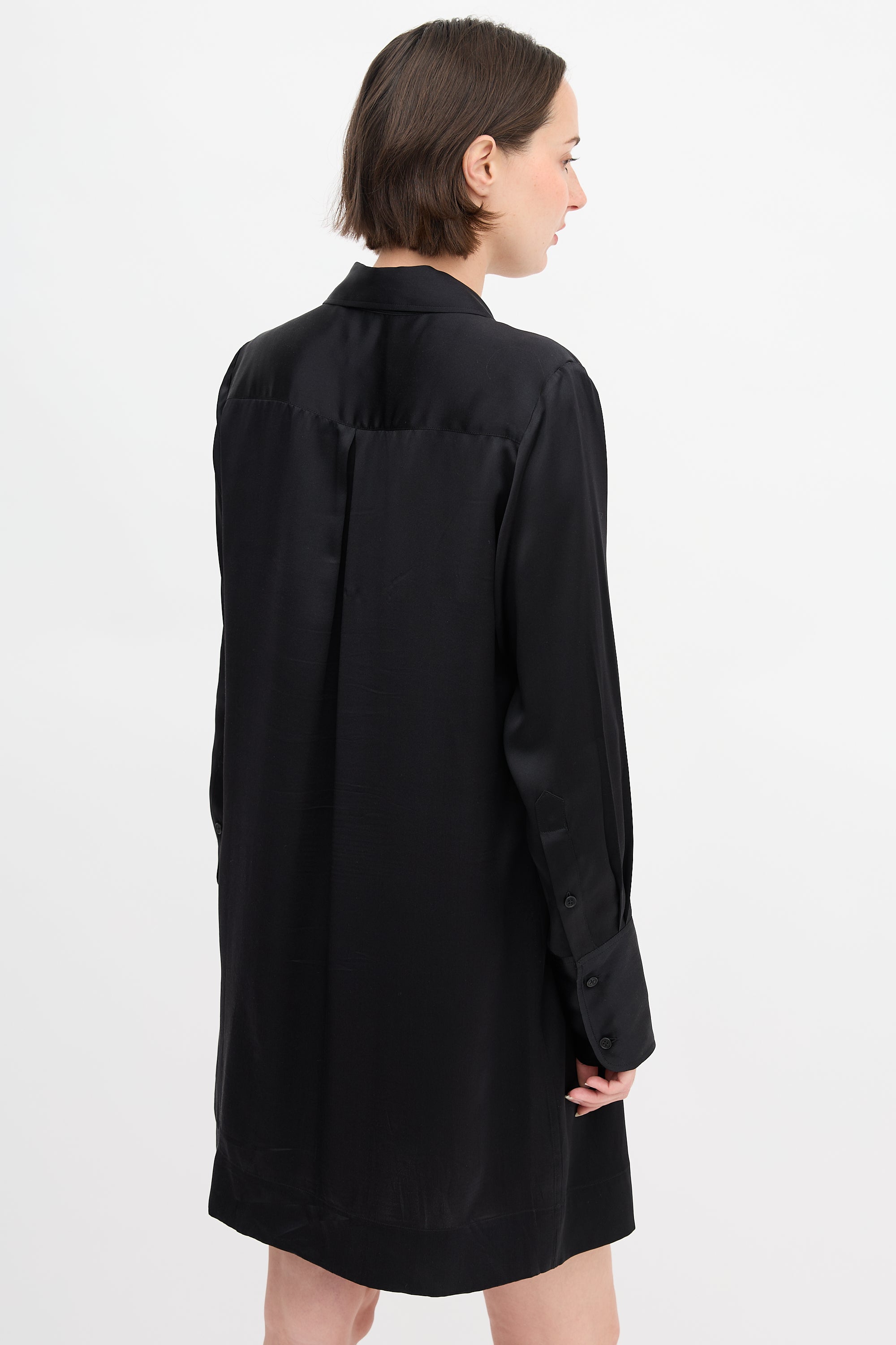 Pre-owned Nili Lotan black silk Eve mini tunic dress featuring point collar, half button front, pleated back yoke, and buttoned cuffs.