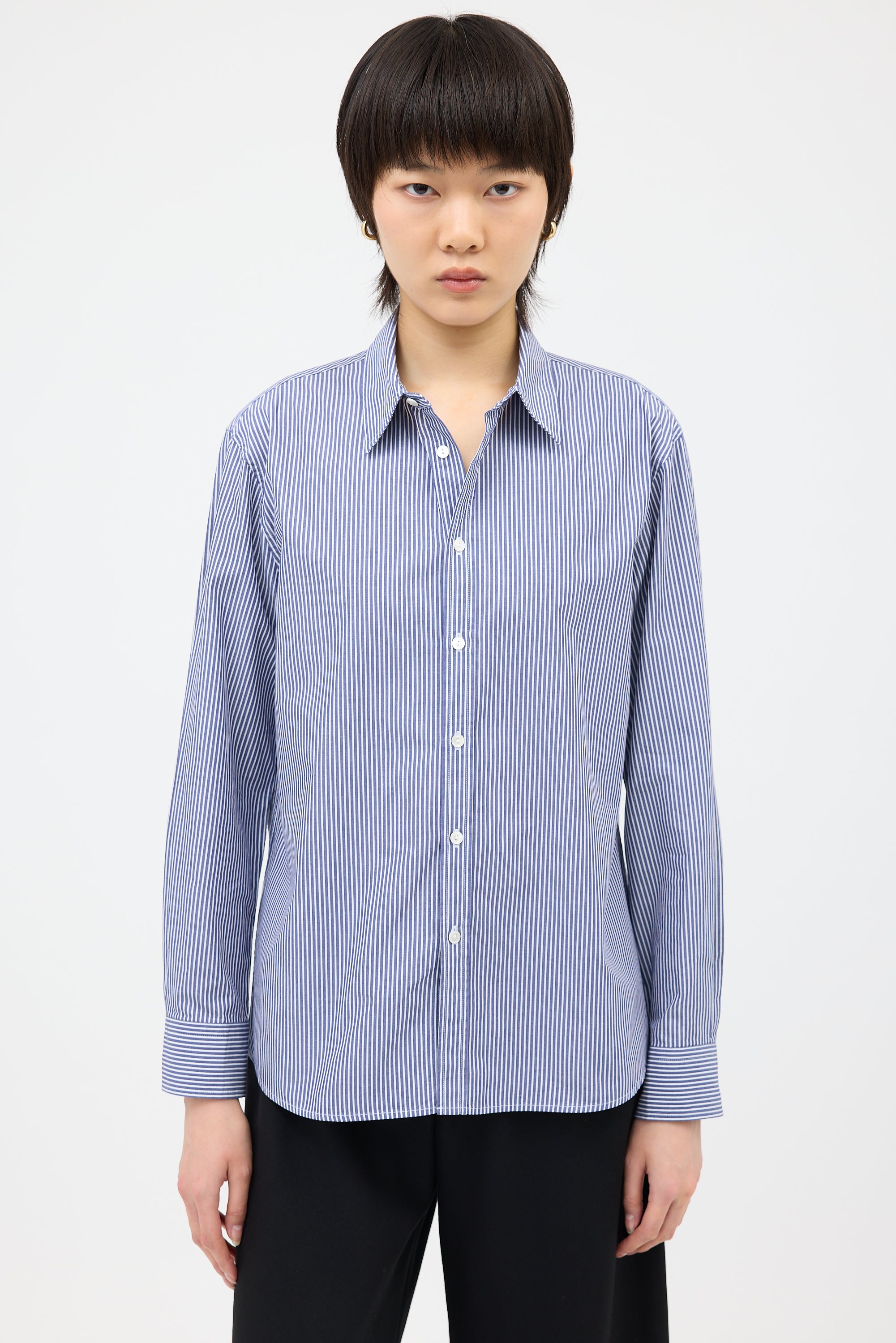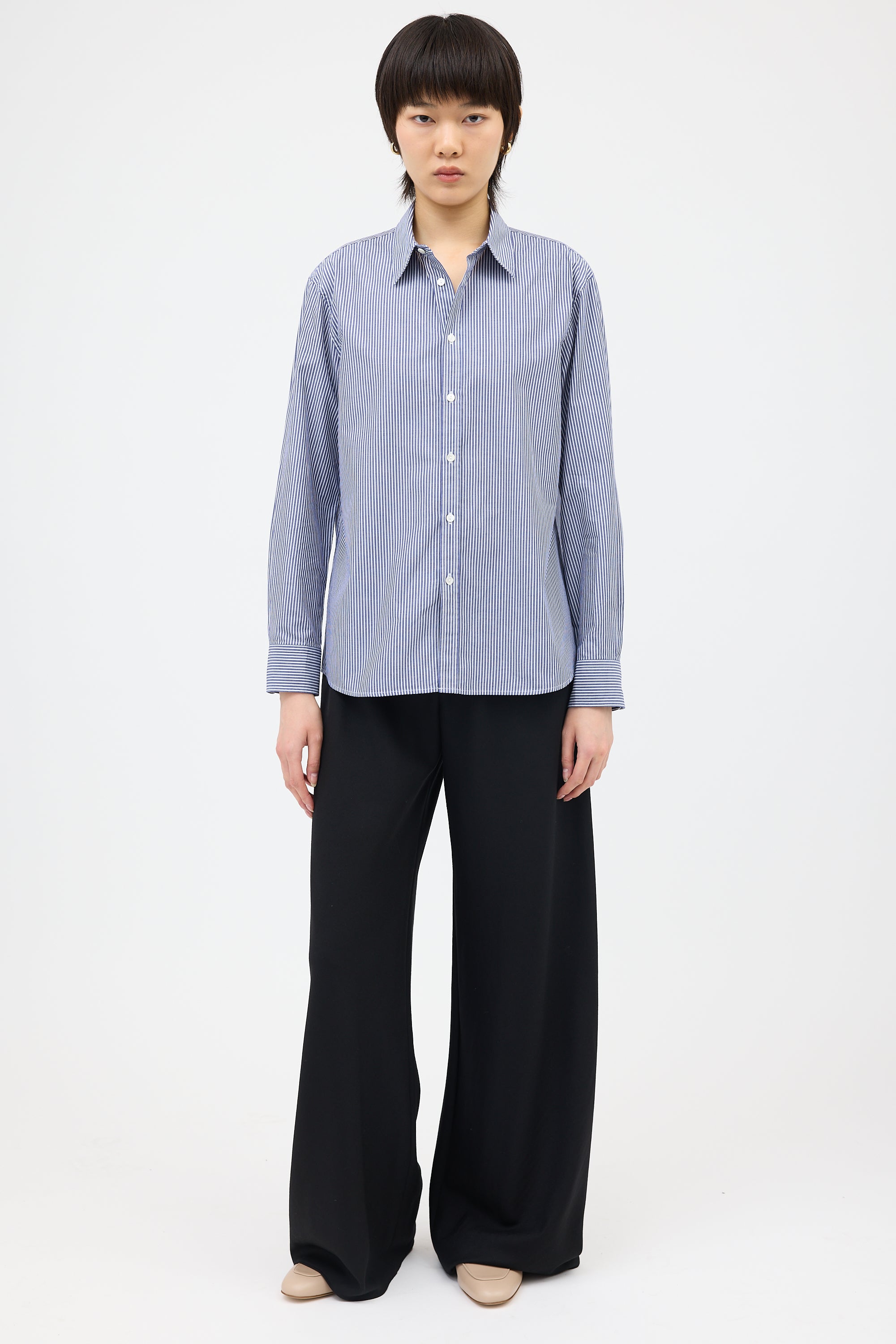 Pre-owned Nili Lotan blue and white striped shirt featuring spread collar and button front.