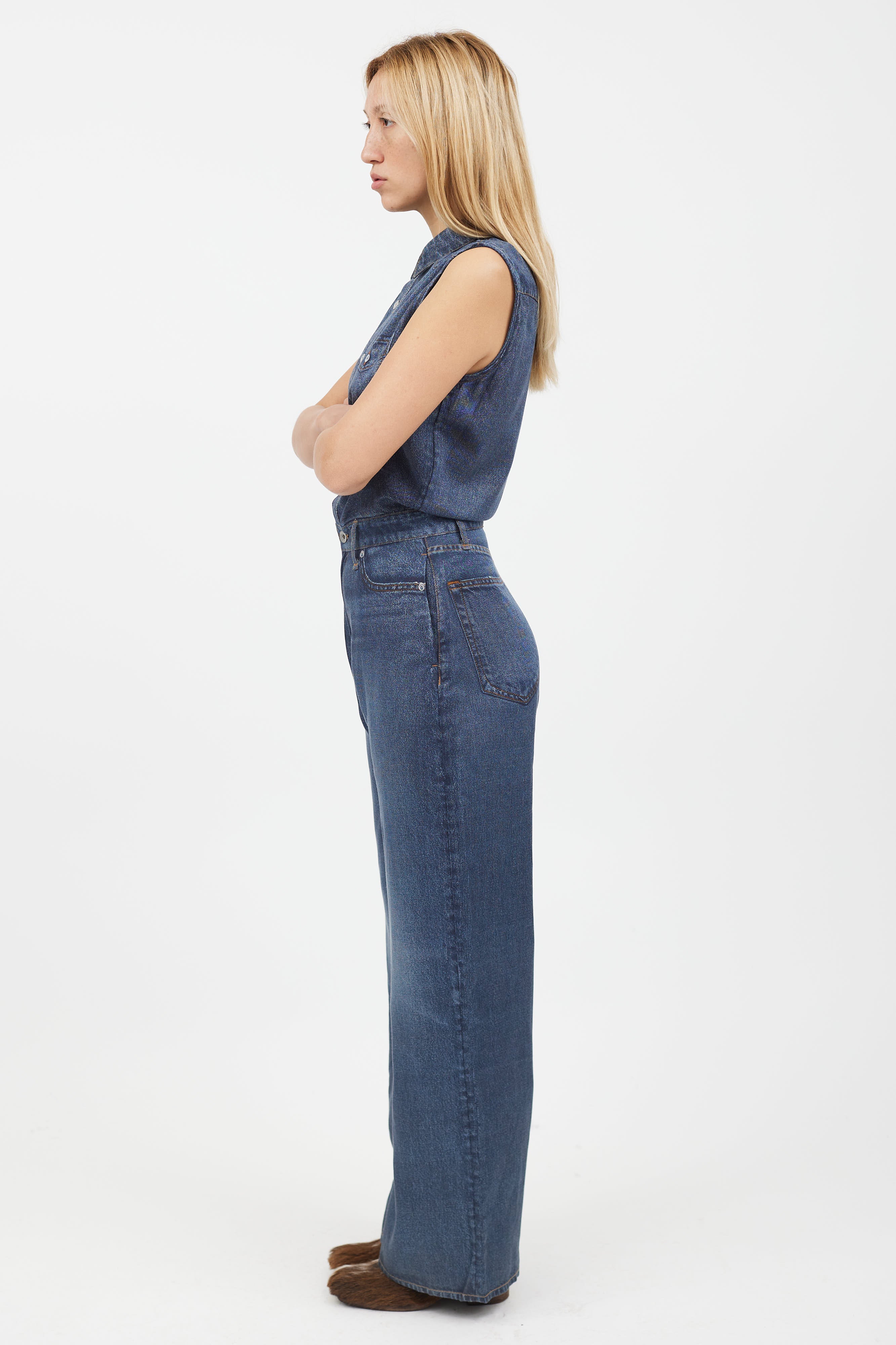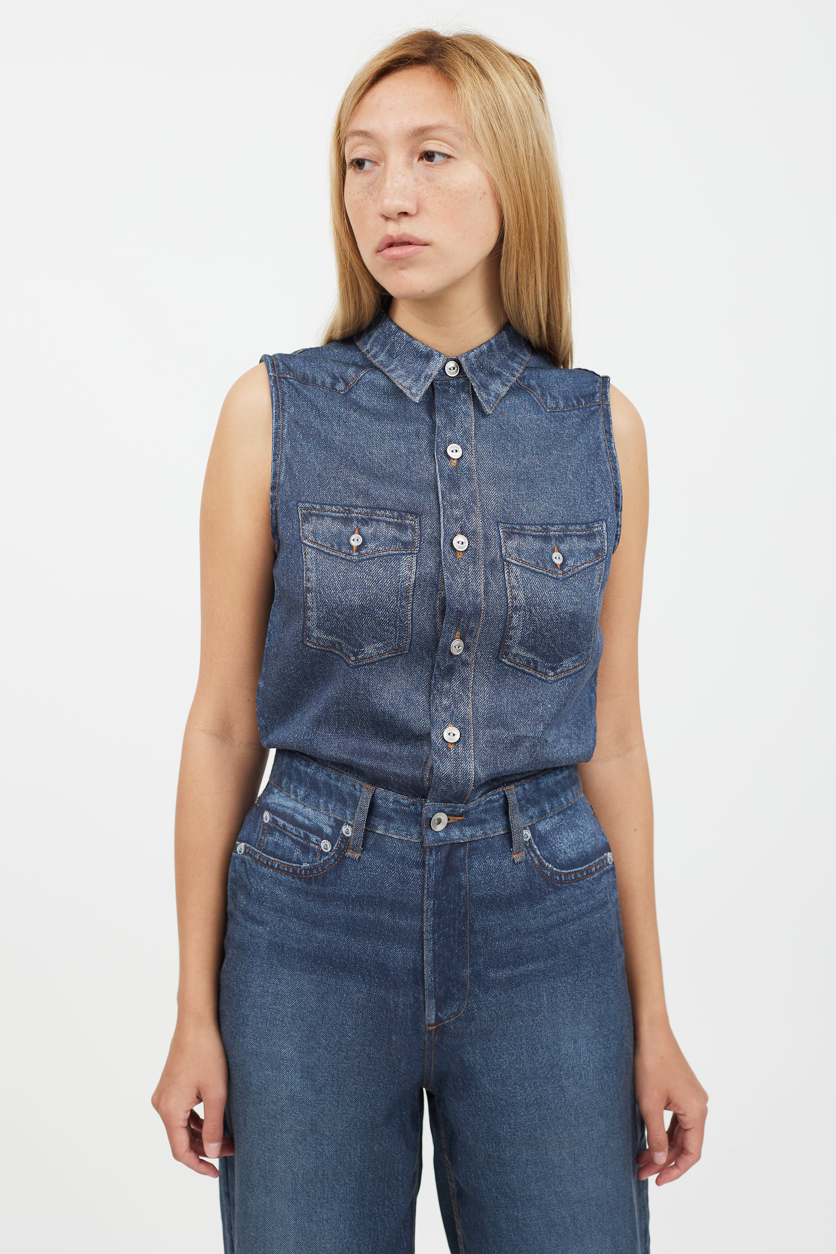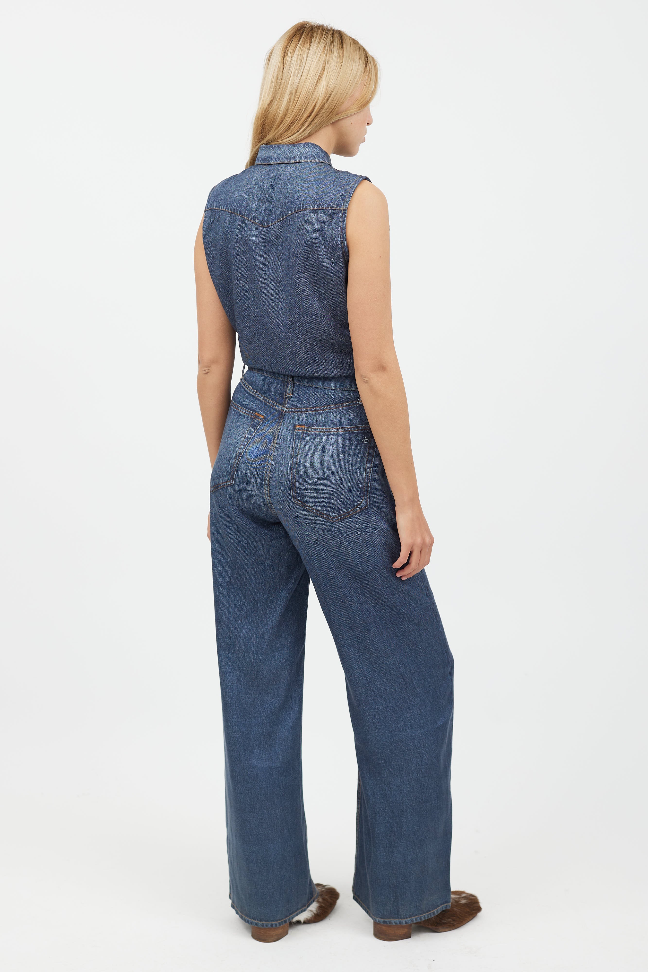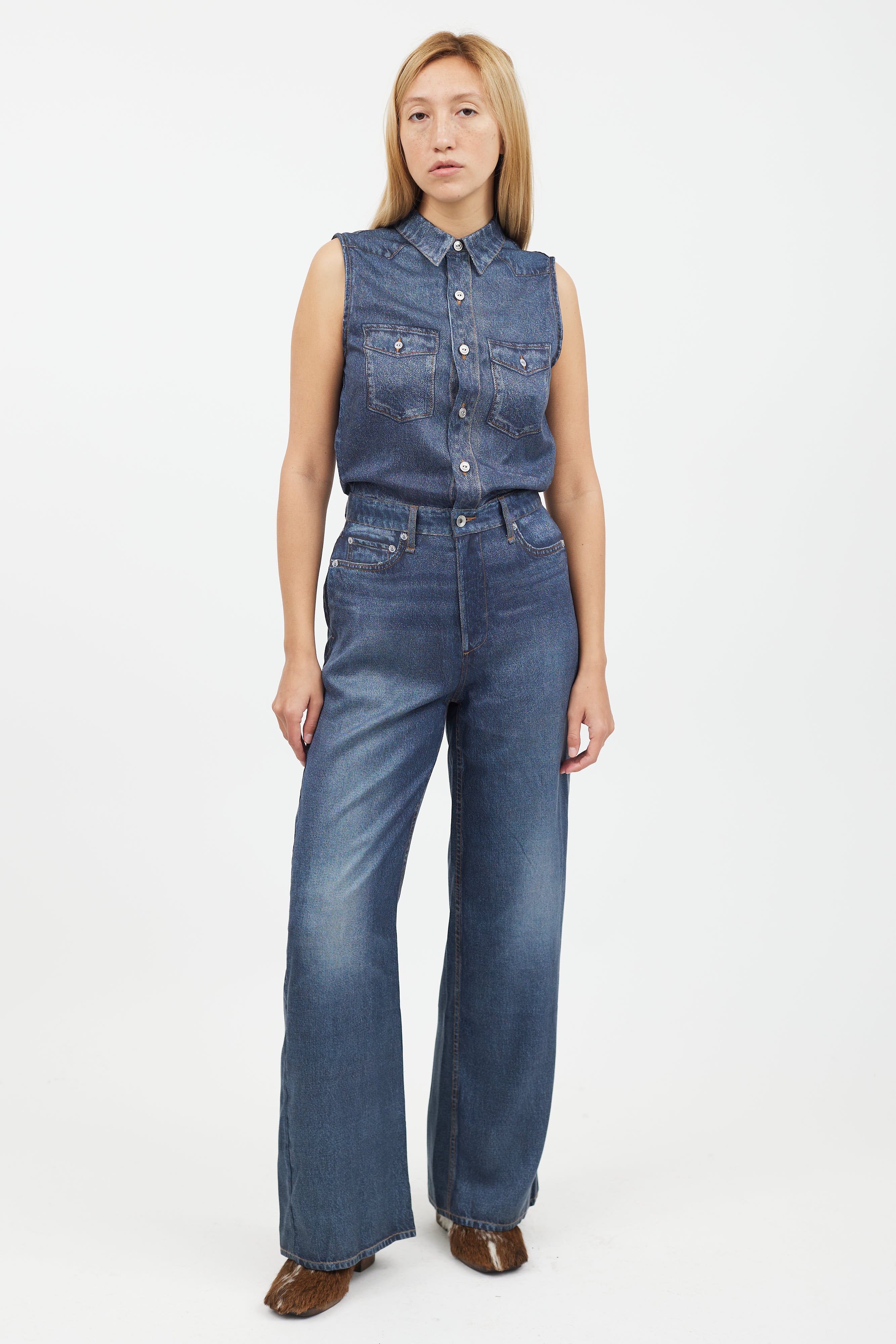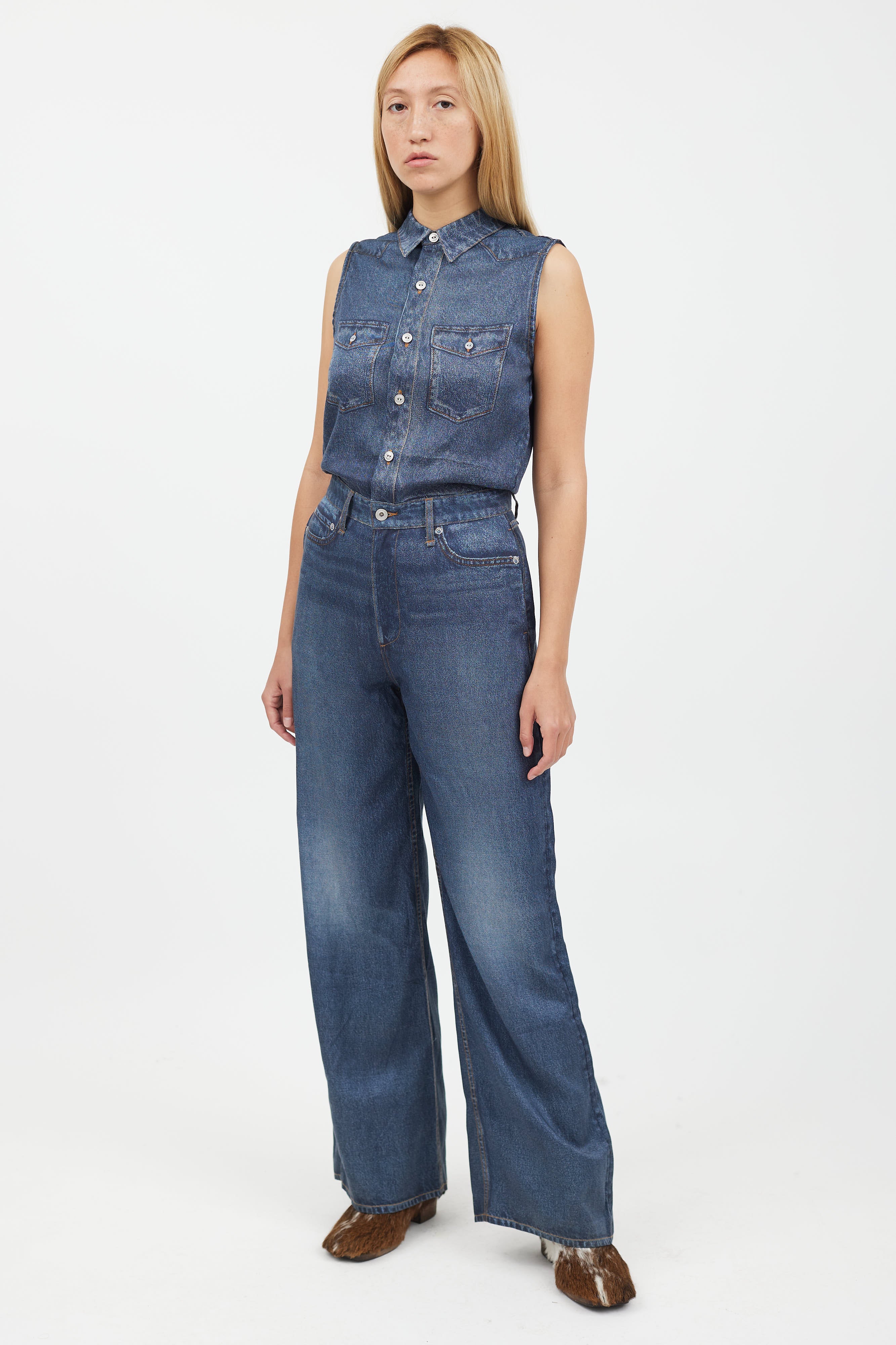 Pre-owned Rag & Bone blue faux denim short sleeve jumpsuit featuring point collar, button up front at top, zip fly closure at waist, two slip pockets at hip, and faux denim print throughout.