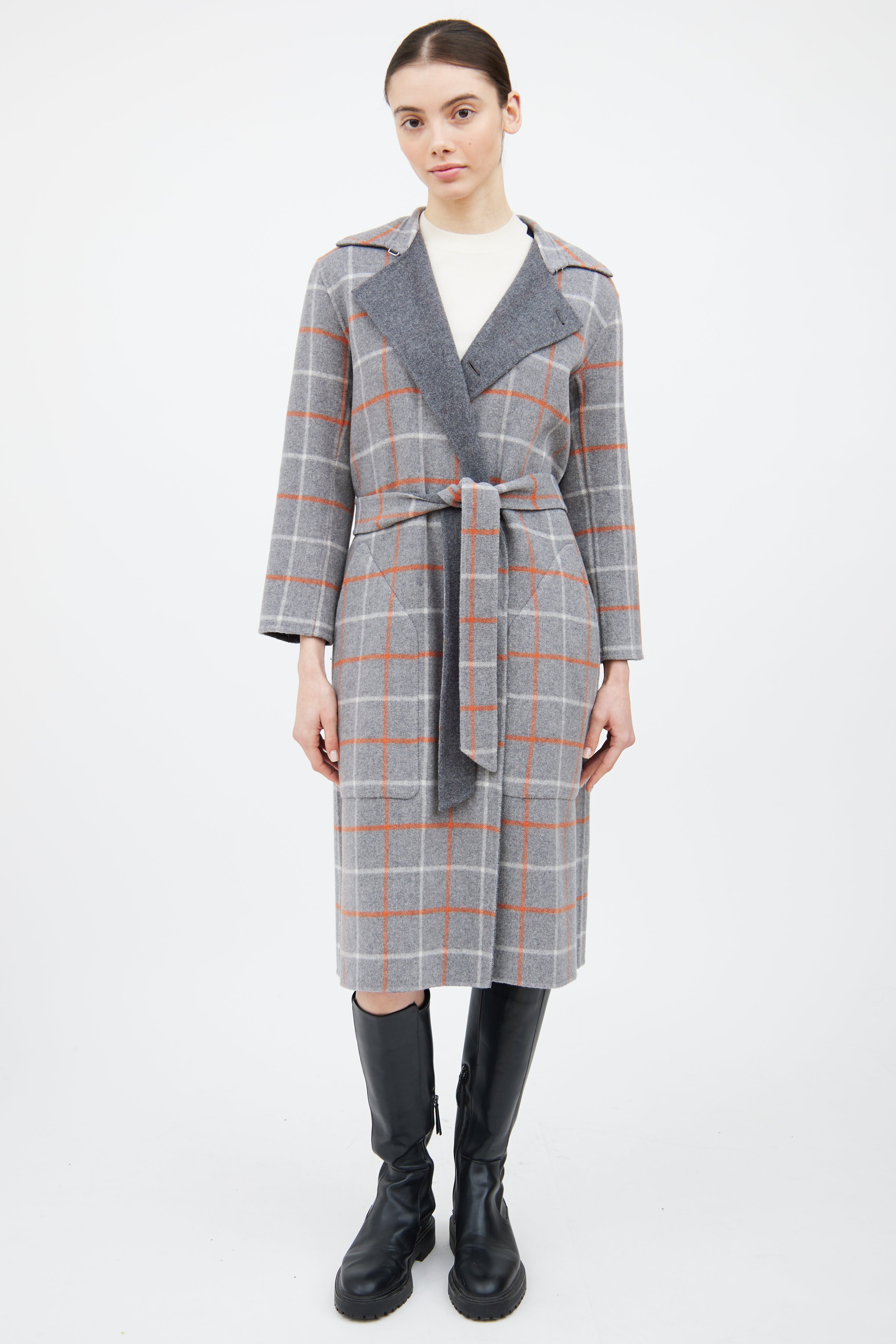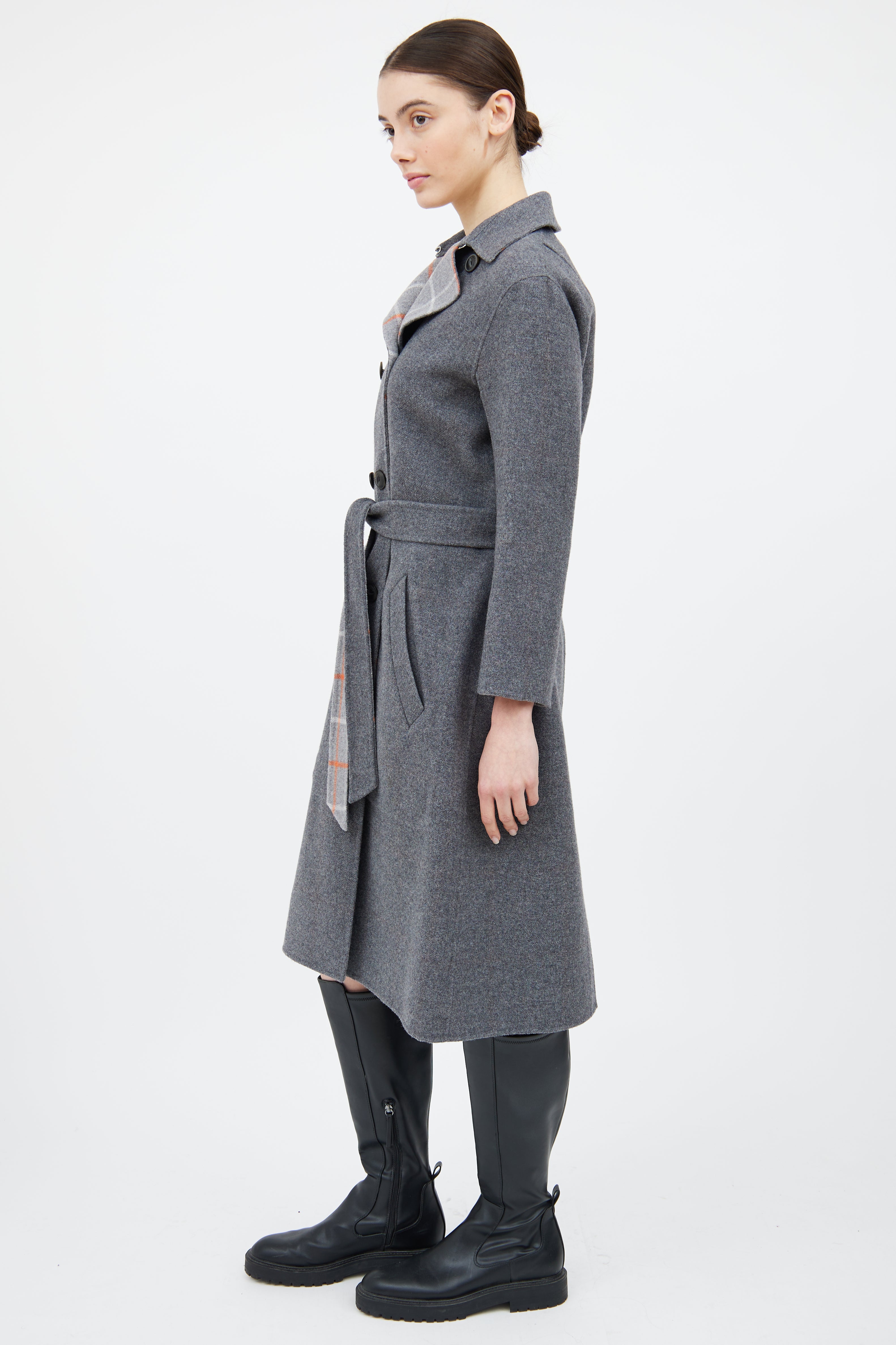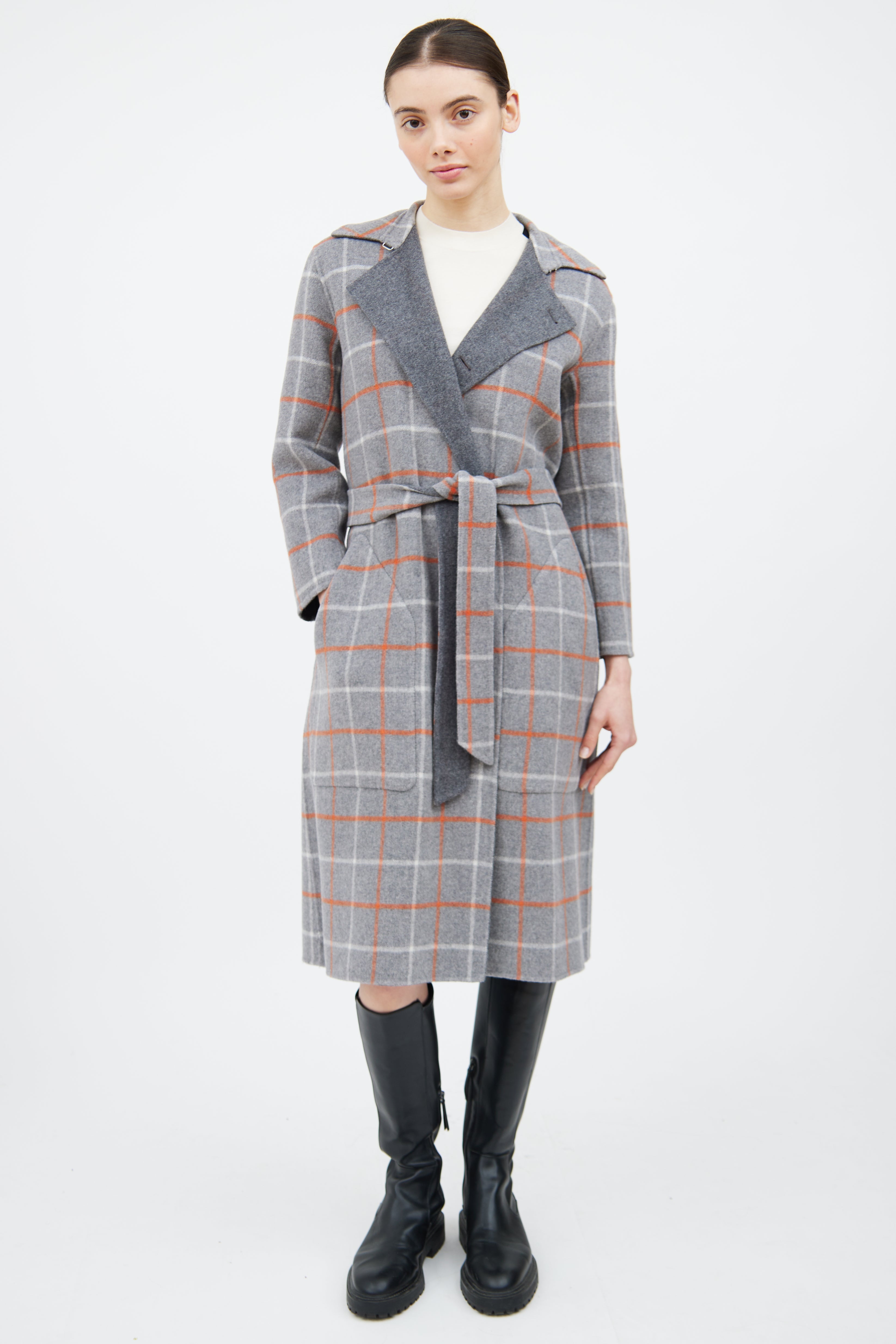 Pre-owned Rag & Bone grey wool reversible coat featuring an orange plaid pattern throughout, pointed collar, long sleeves, two patch pockets at hip, tie belt at waist, and double breasted button up closure.