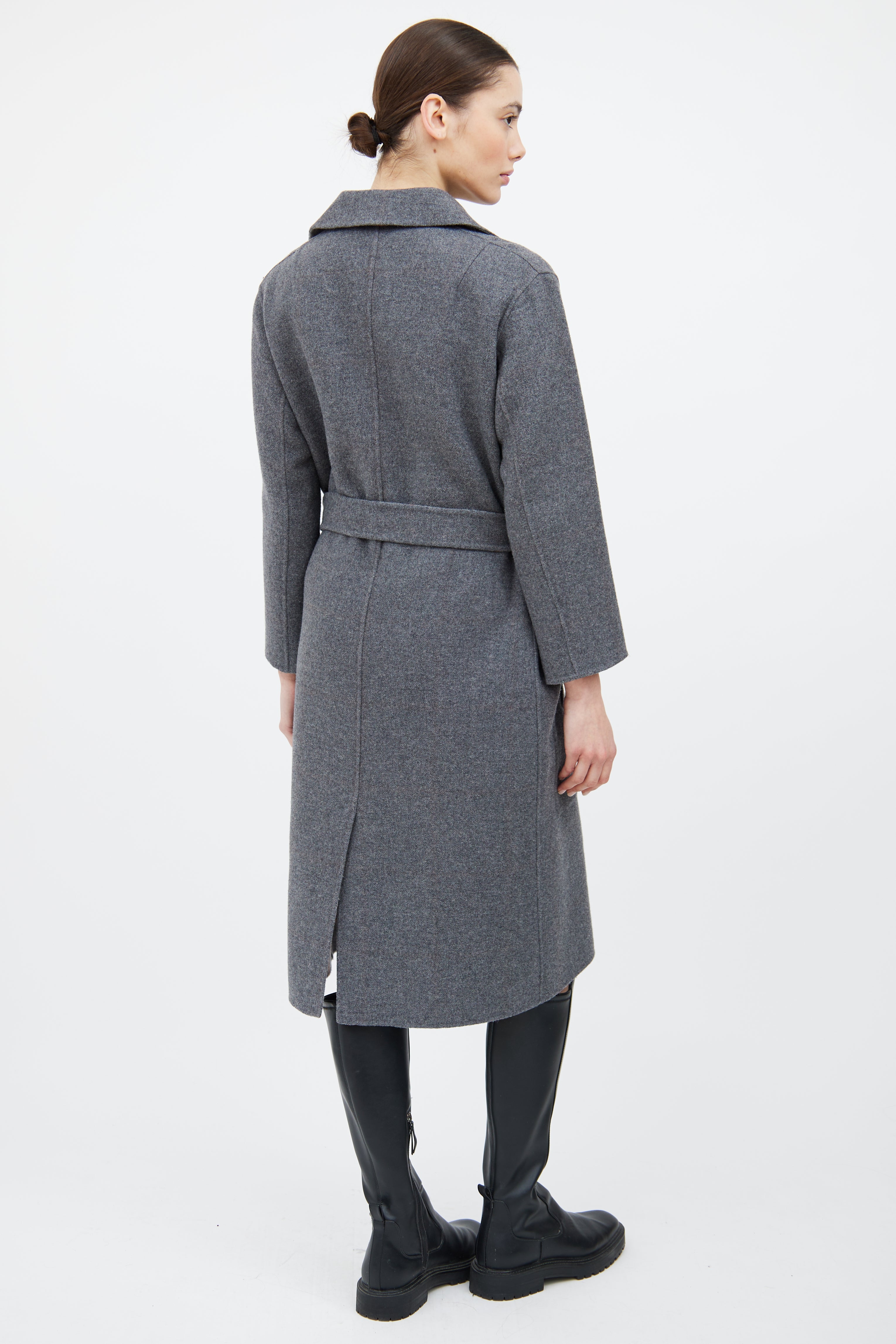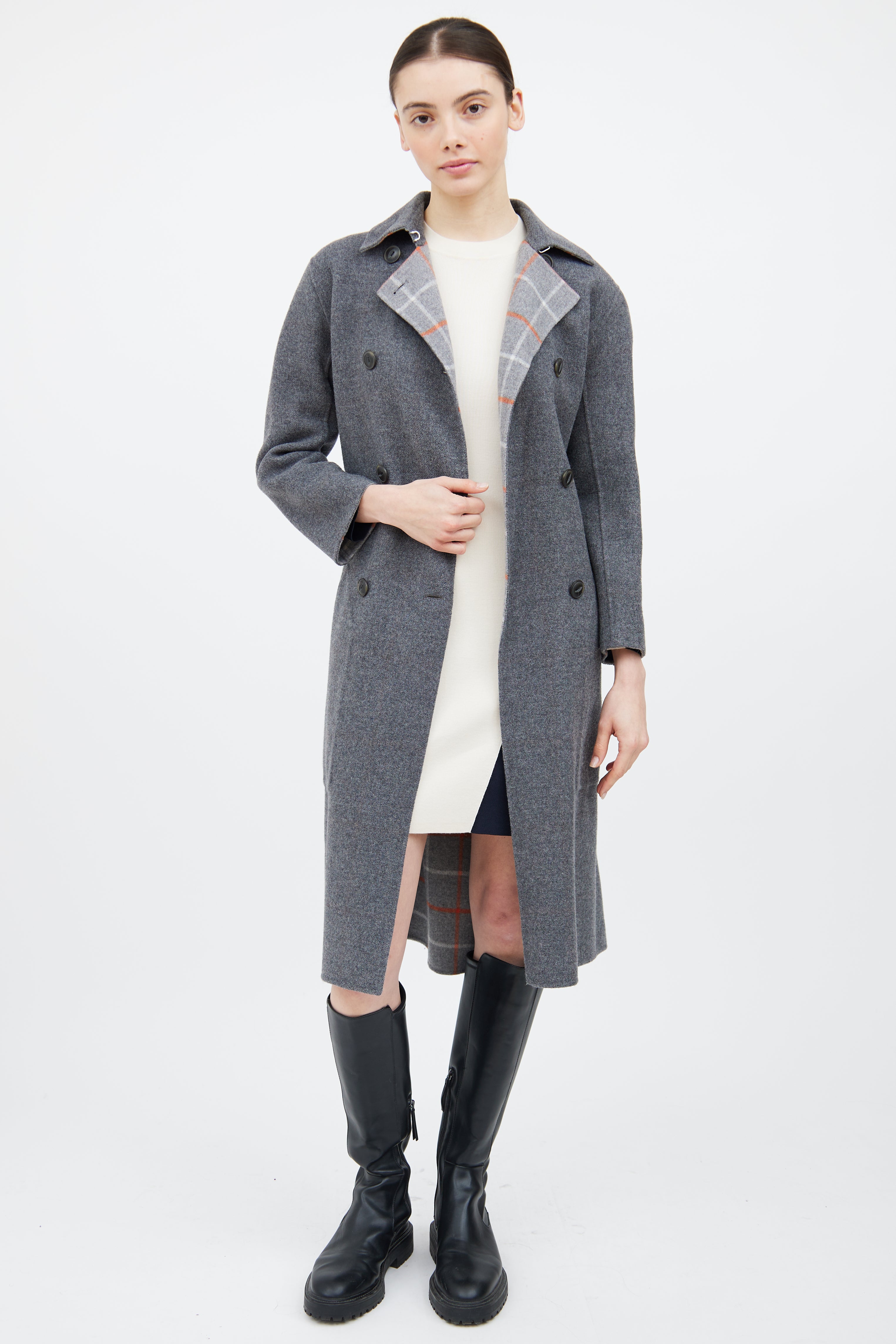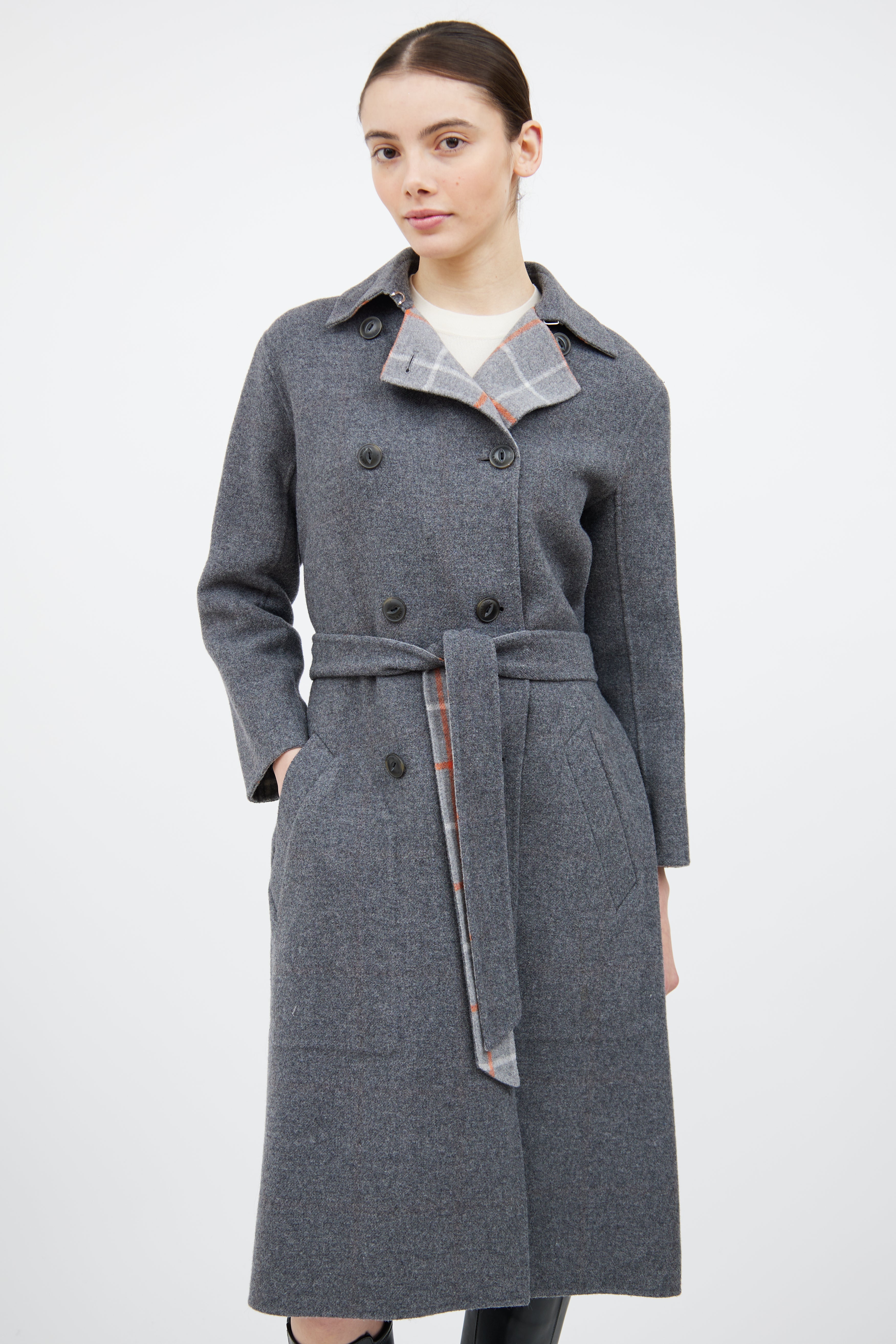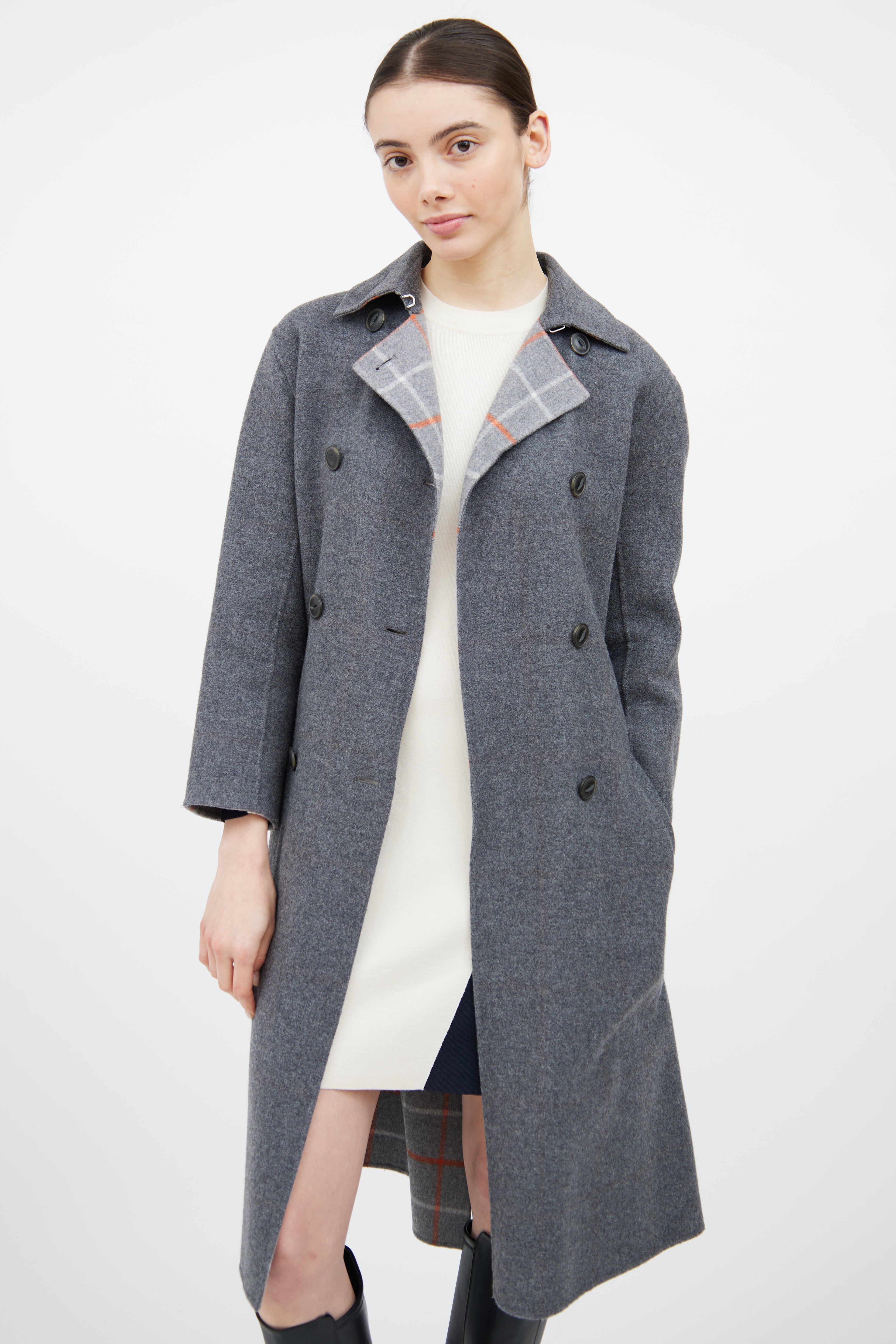 Pre-owned Rag & Bone grey wool reversible coat featuring an orange plaid pattern throughout, pointed collar, long sleeves, two patch pockets at hip, tie belt at waist, and double breasted button up closure.