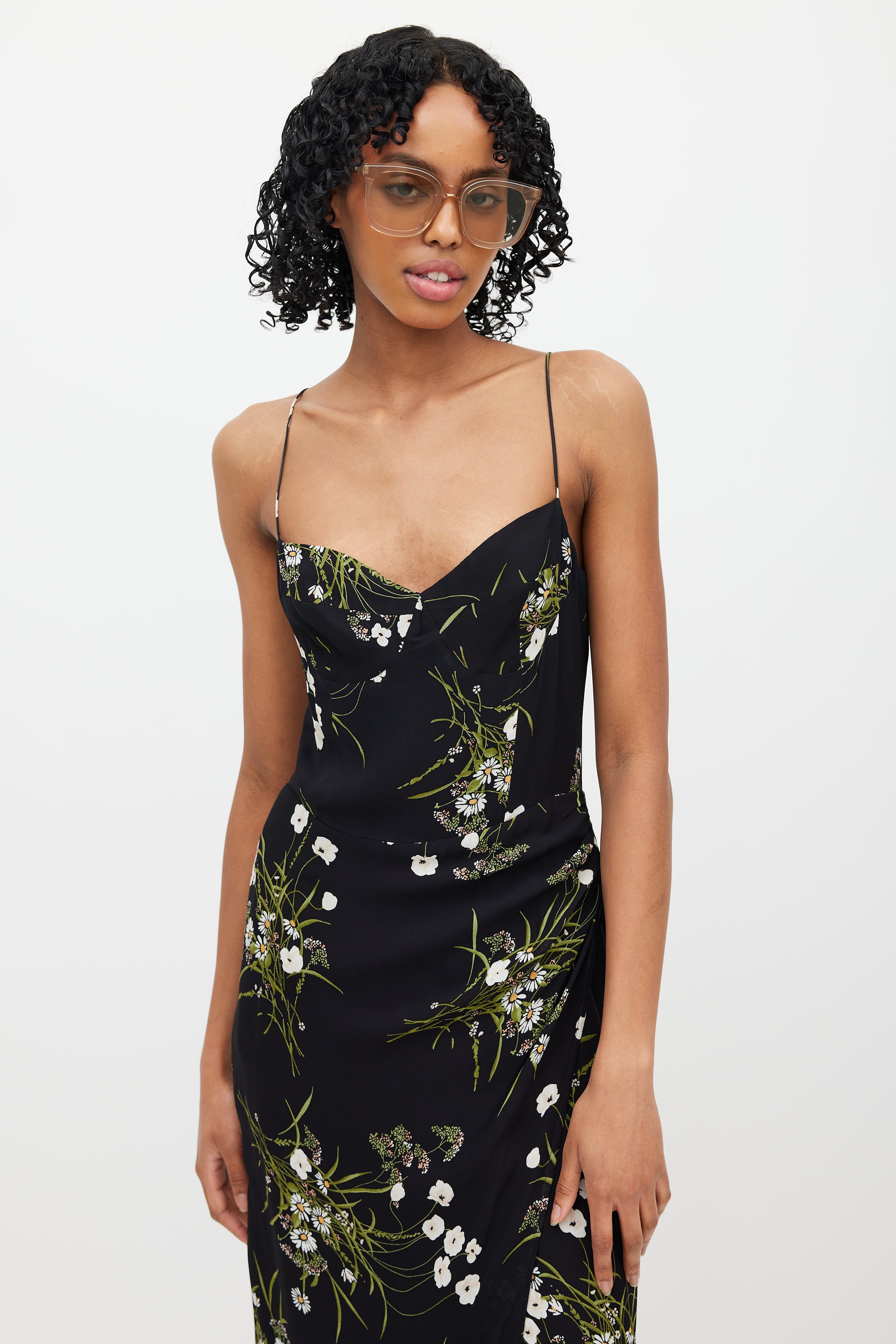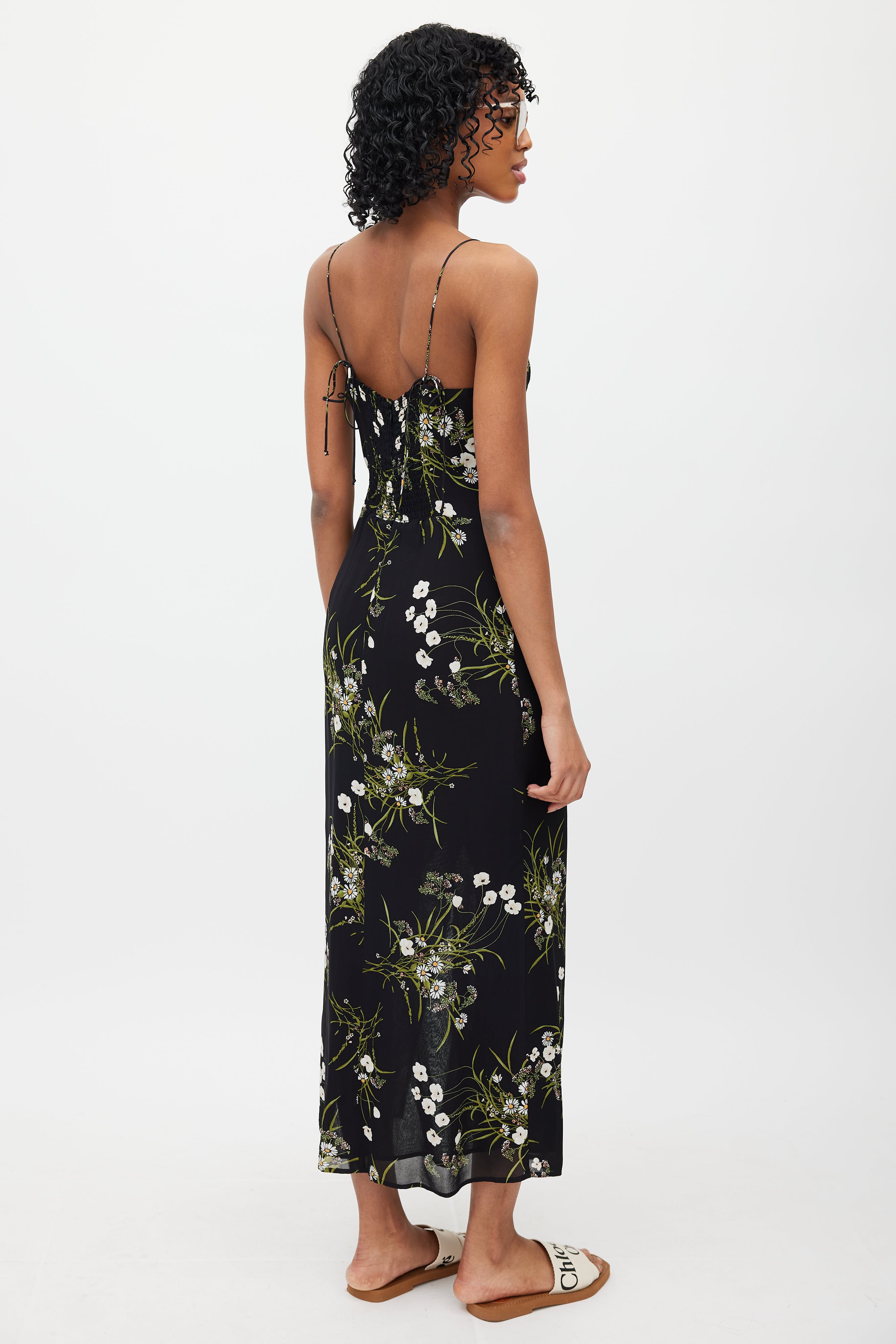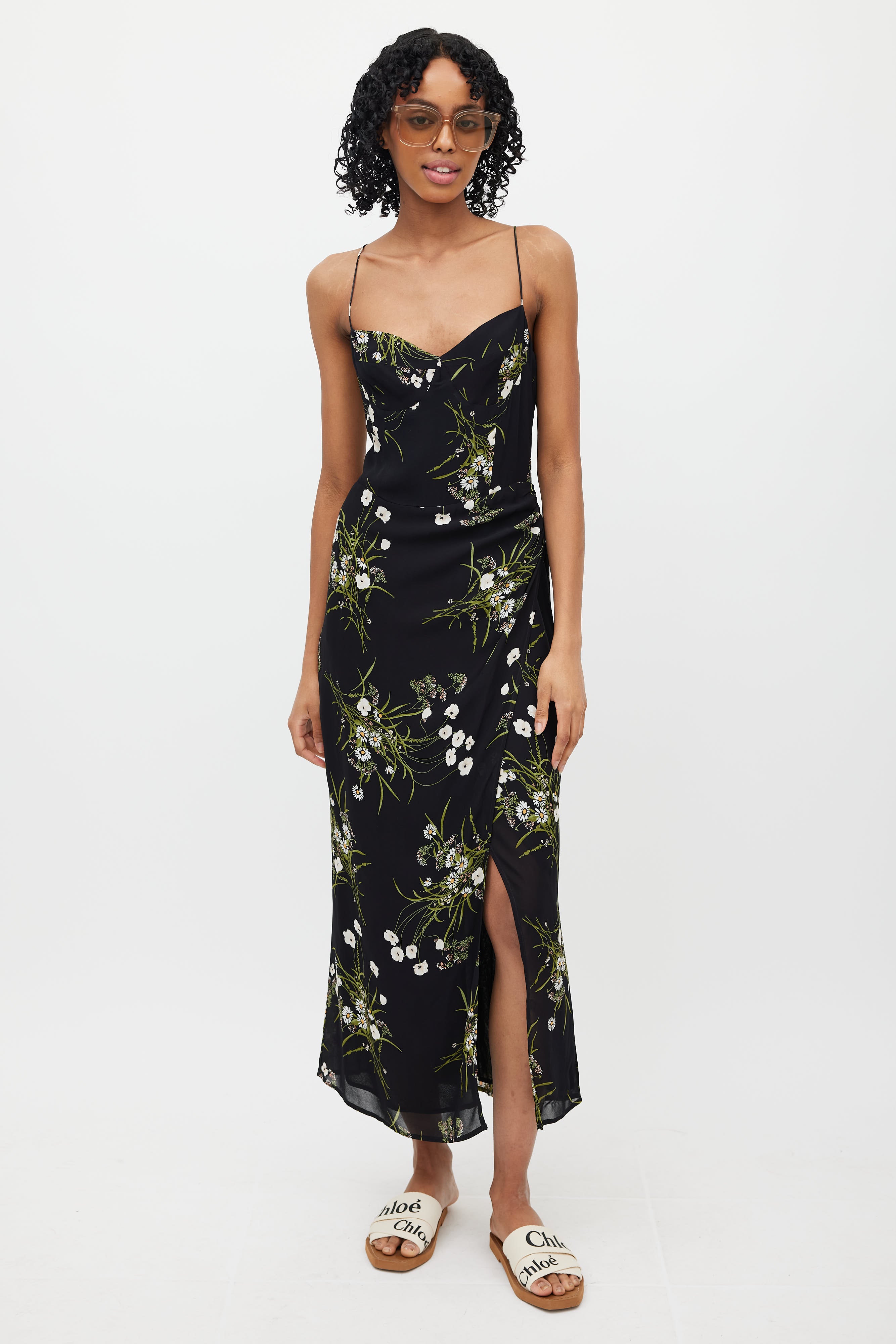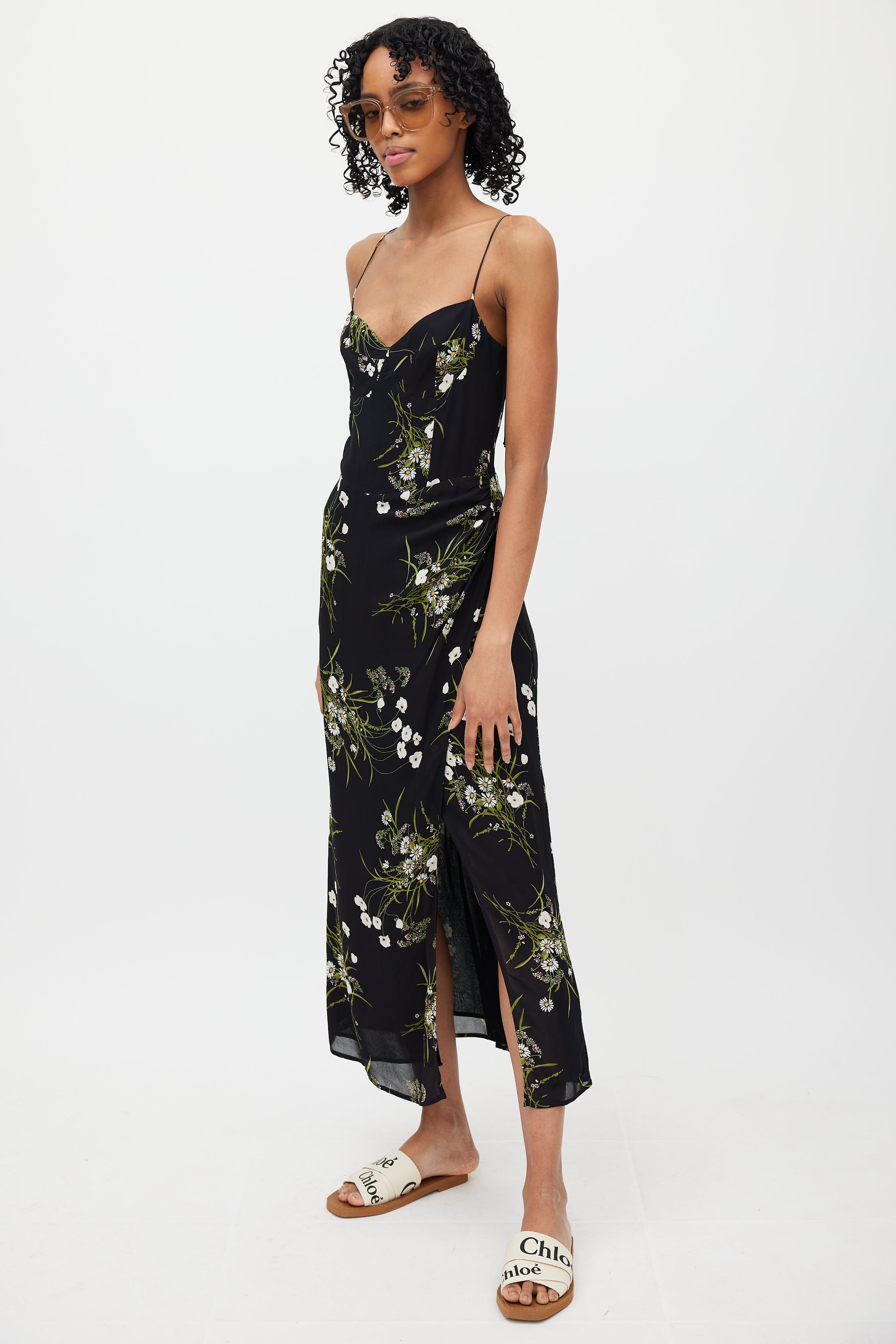 Pre-owned Reformation black dress featuring sweetheart neckline, adjustable spaghetti straps, multicolour floral print, front slit, shirring at back, and concealed zip closure at back. Lined.