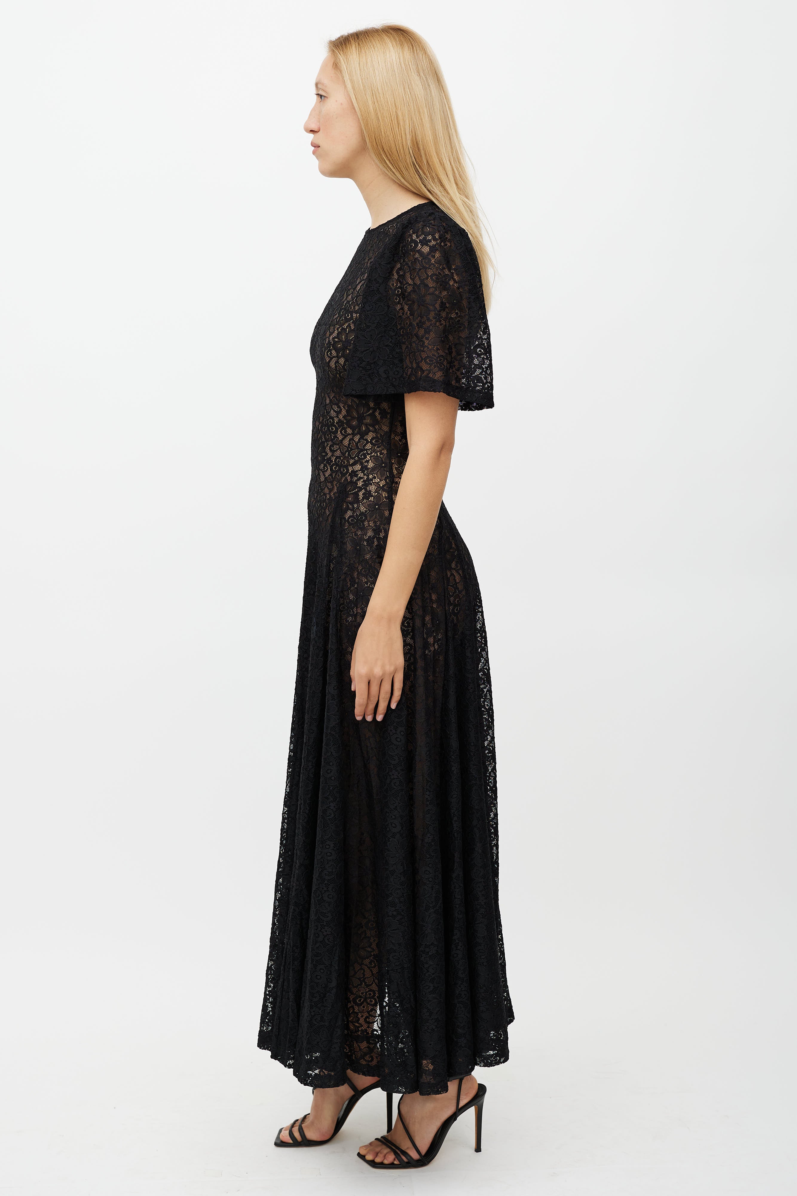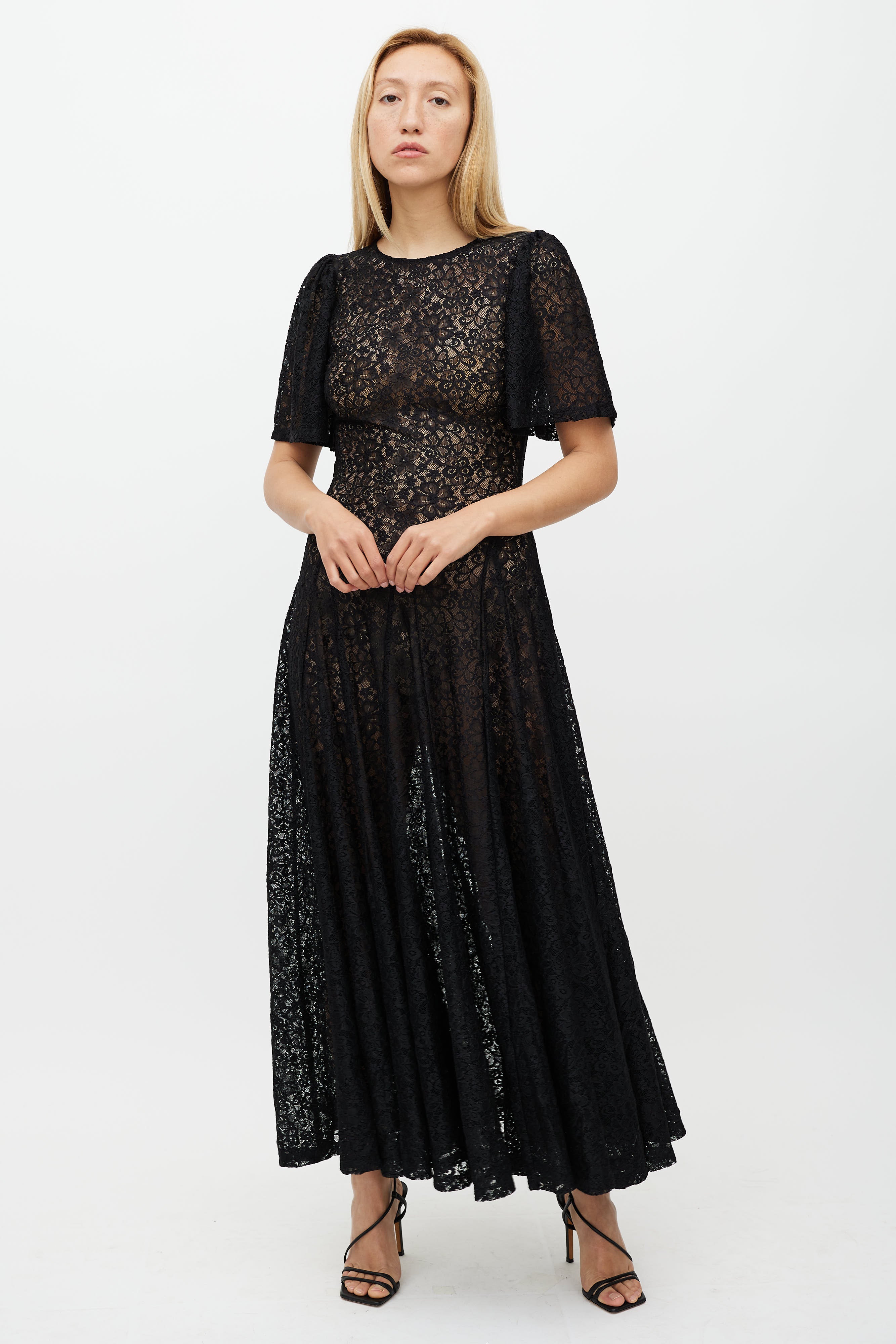 Reformation black Waller lace dress featuring a round neckline, short sleeves, and button closure at back.