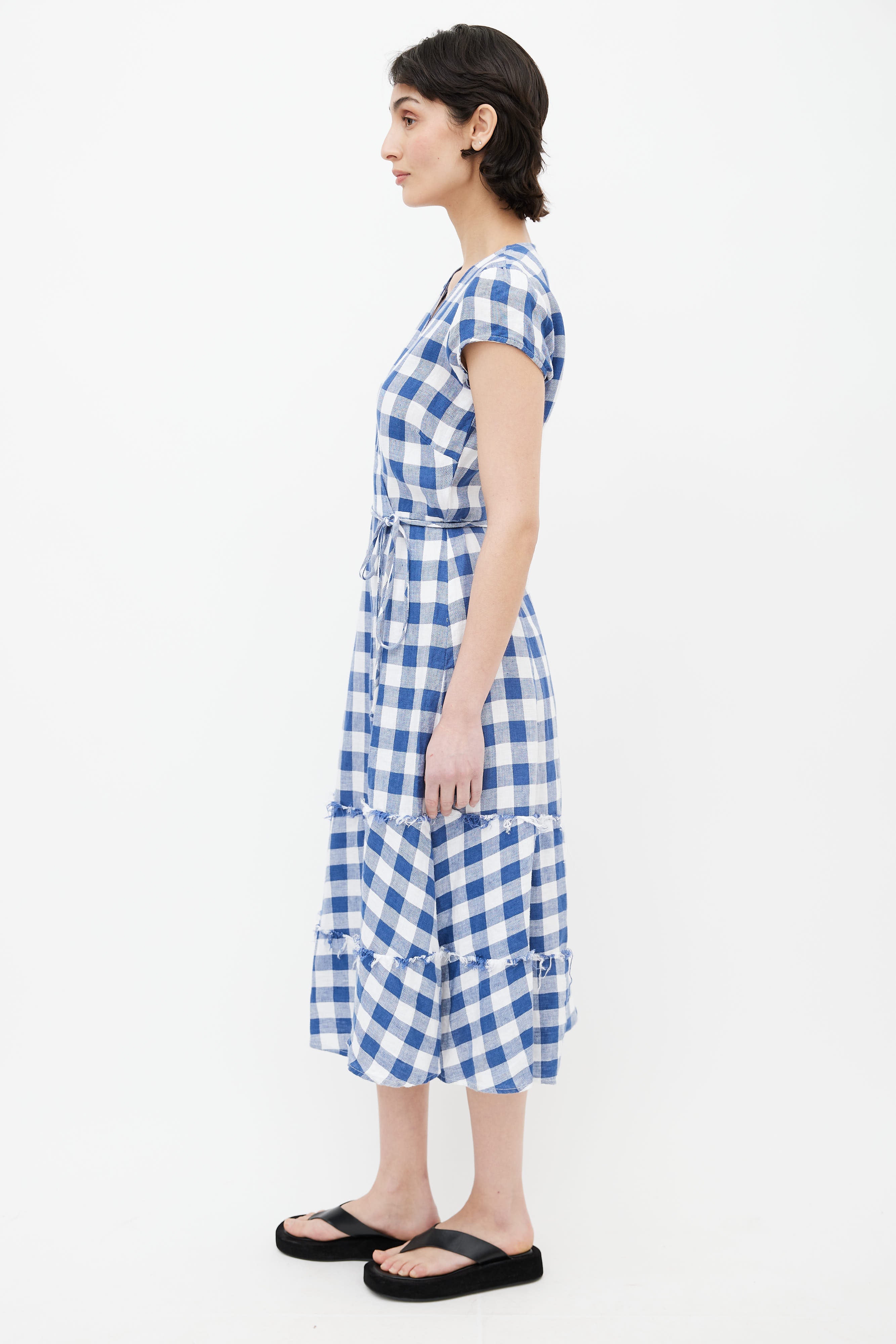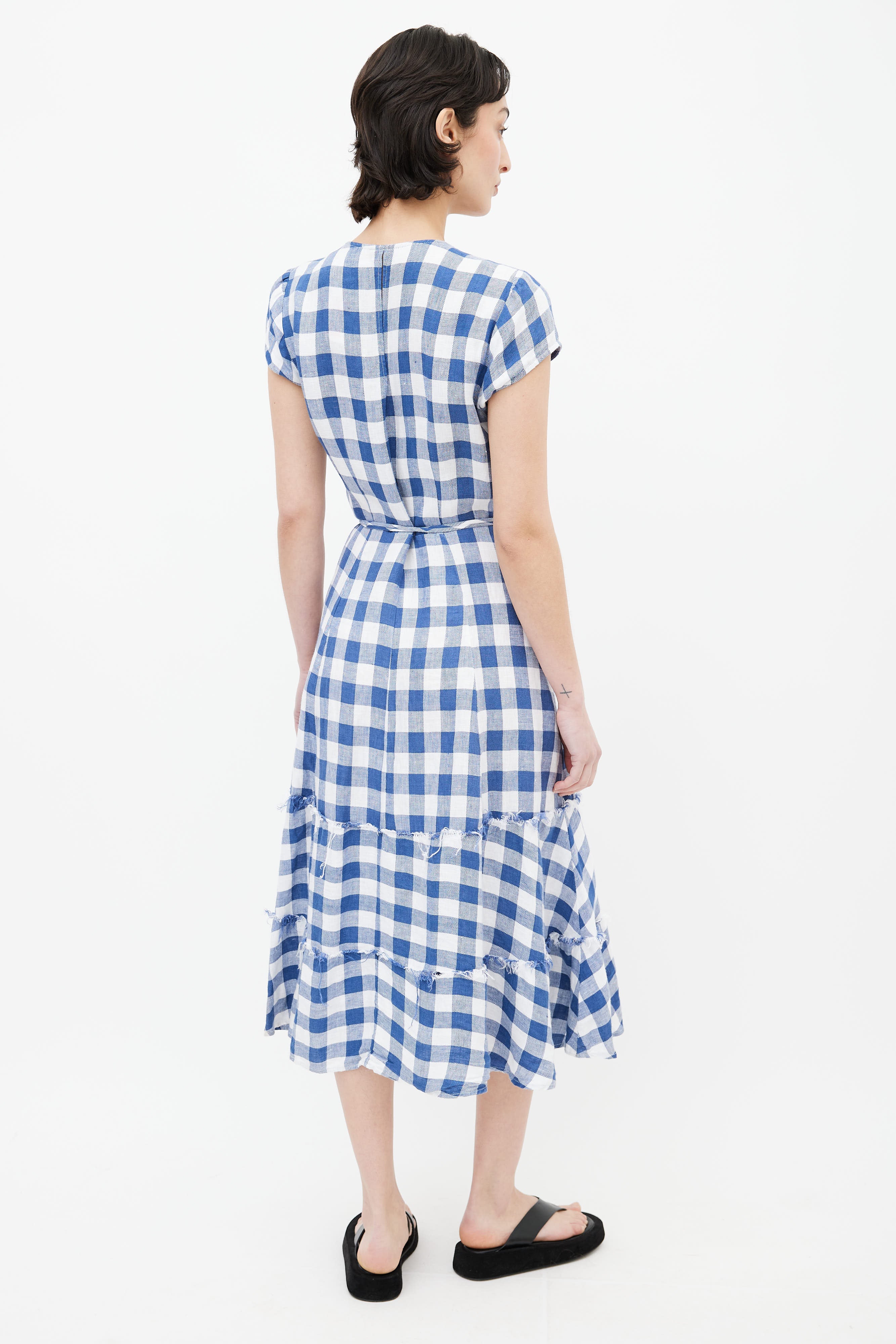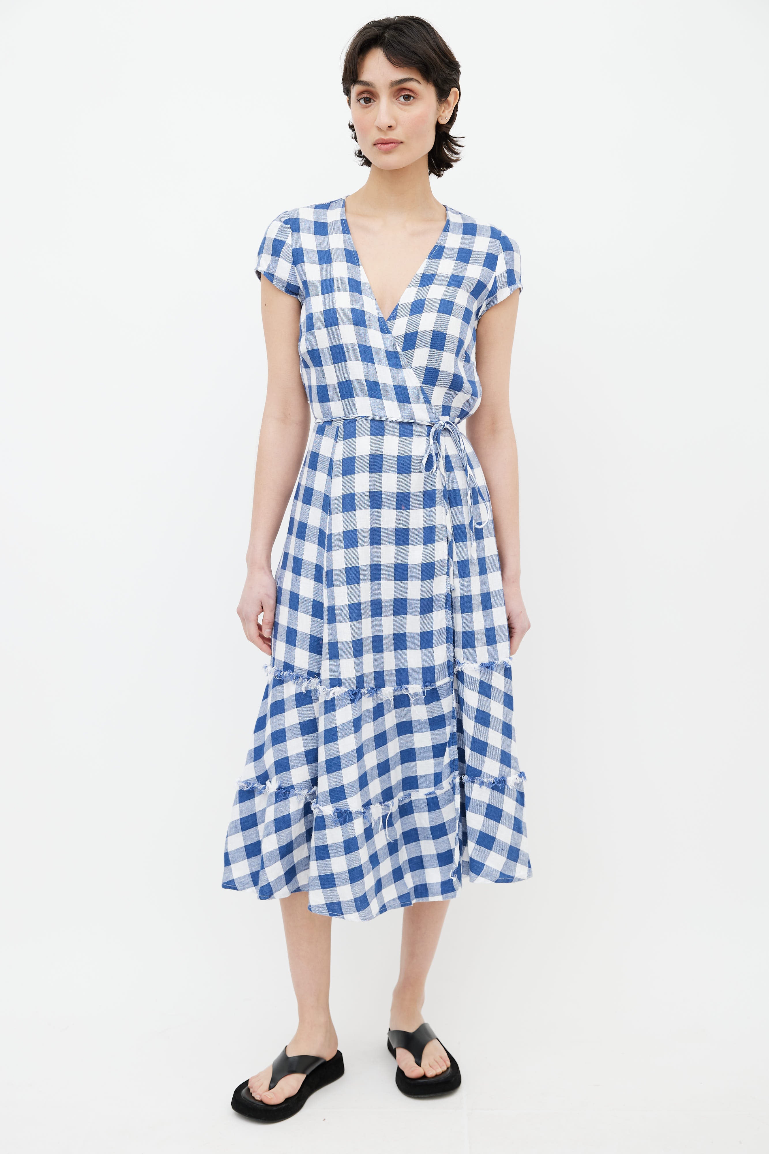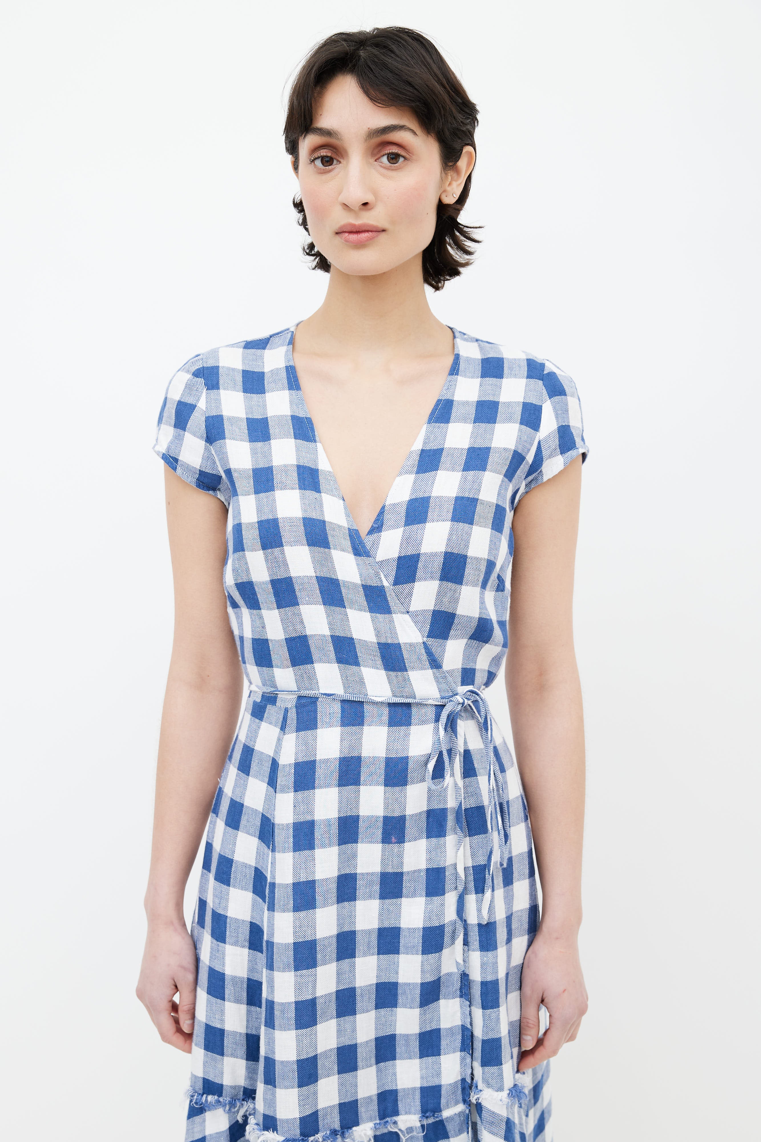 Pre-owned Reformation blue and white linen gingham wrap dress featuring a v-neck, cap sleeves, wraparound belt at waist, keyhole at back and tiered ruffles at hem with raw edges.
