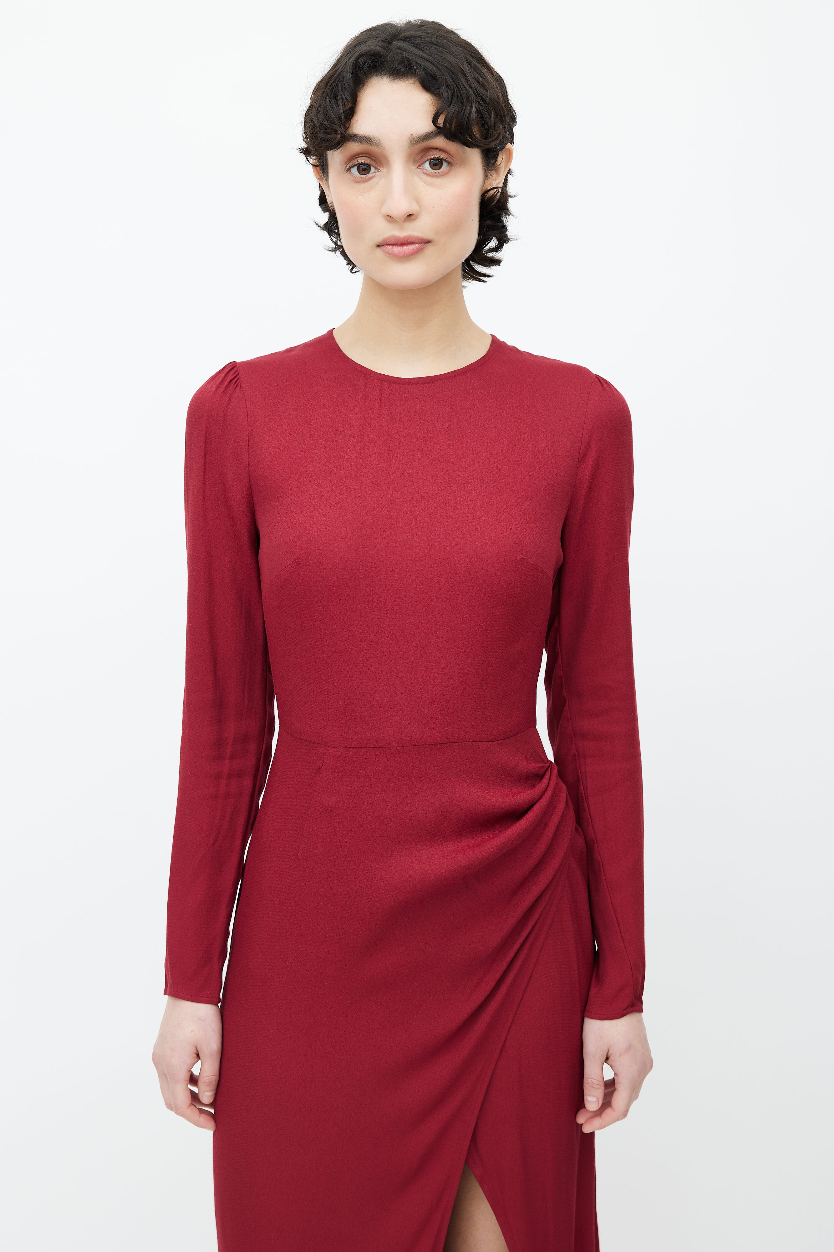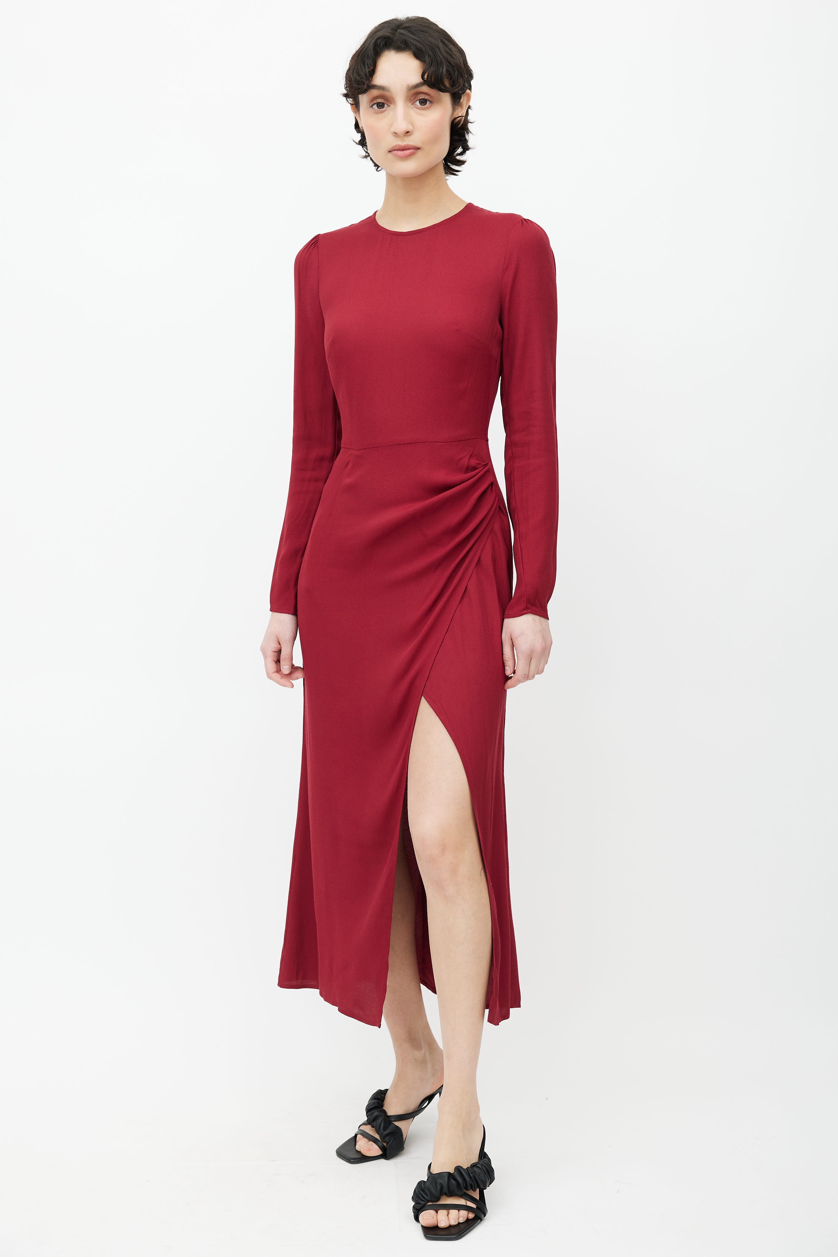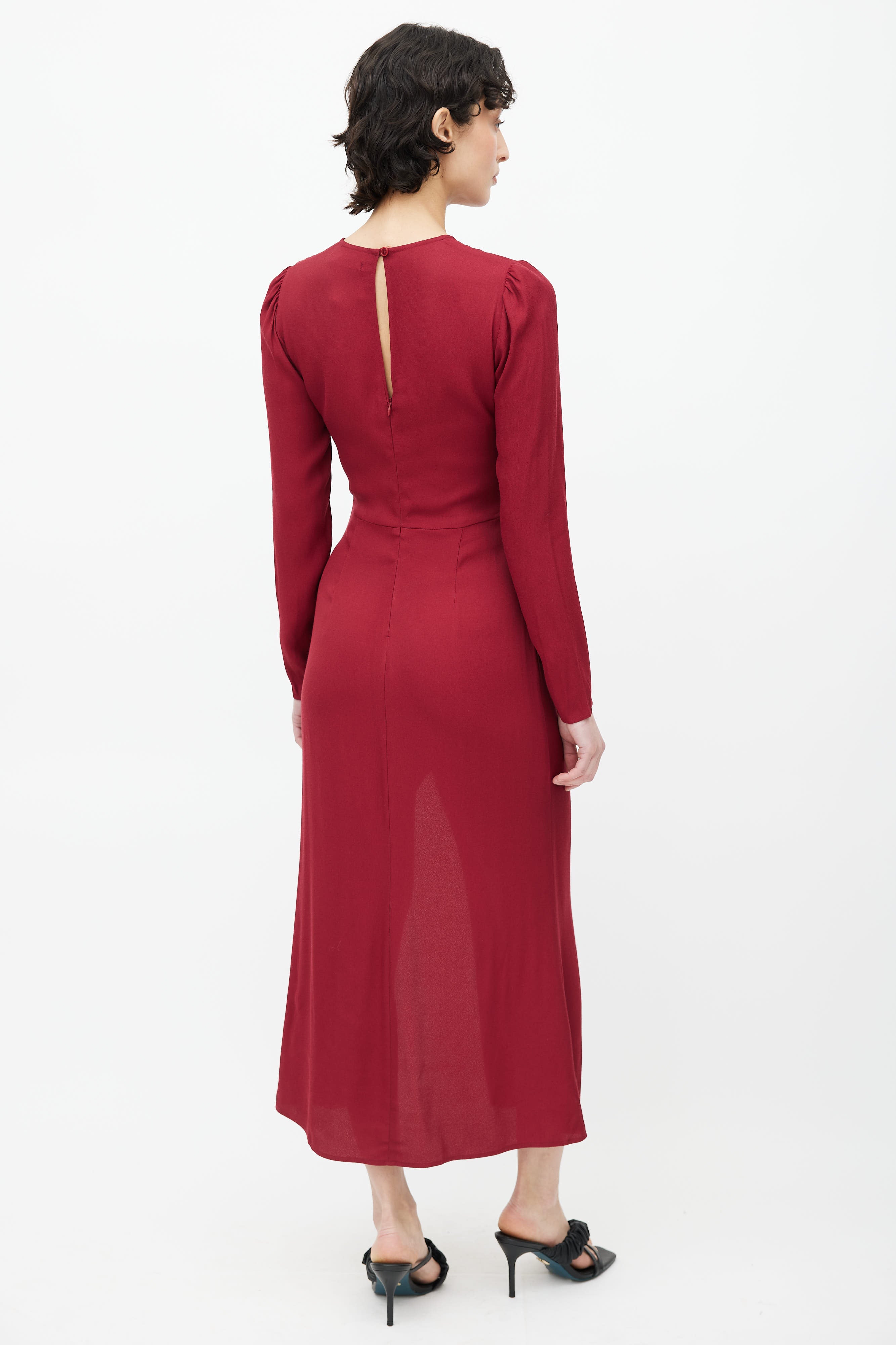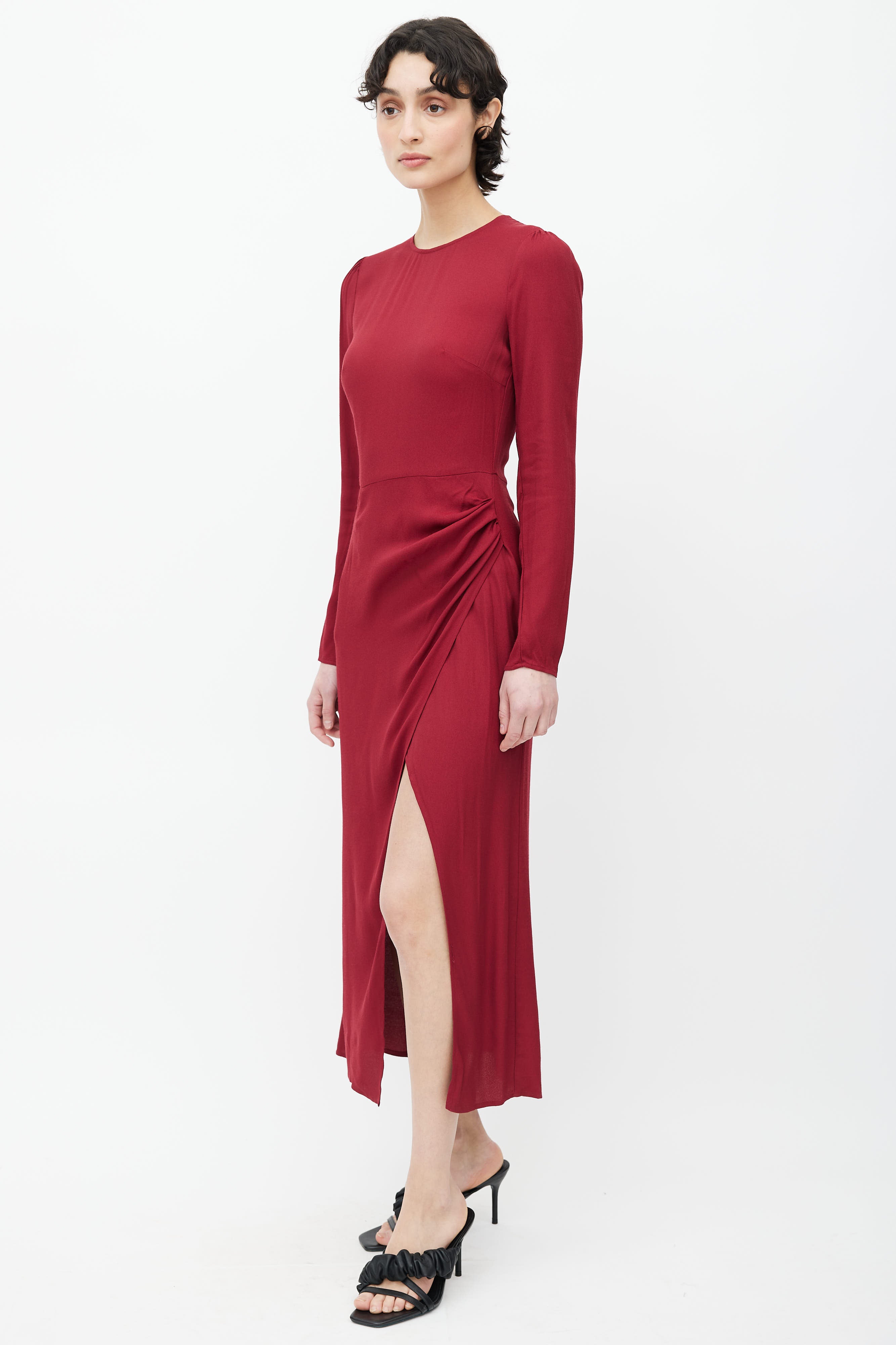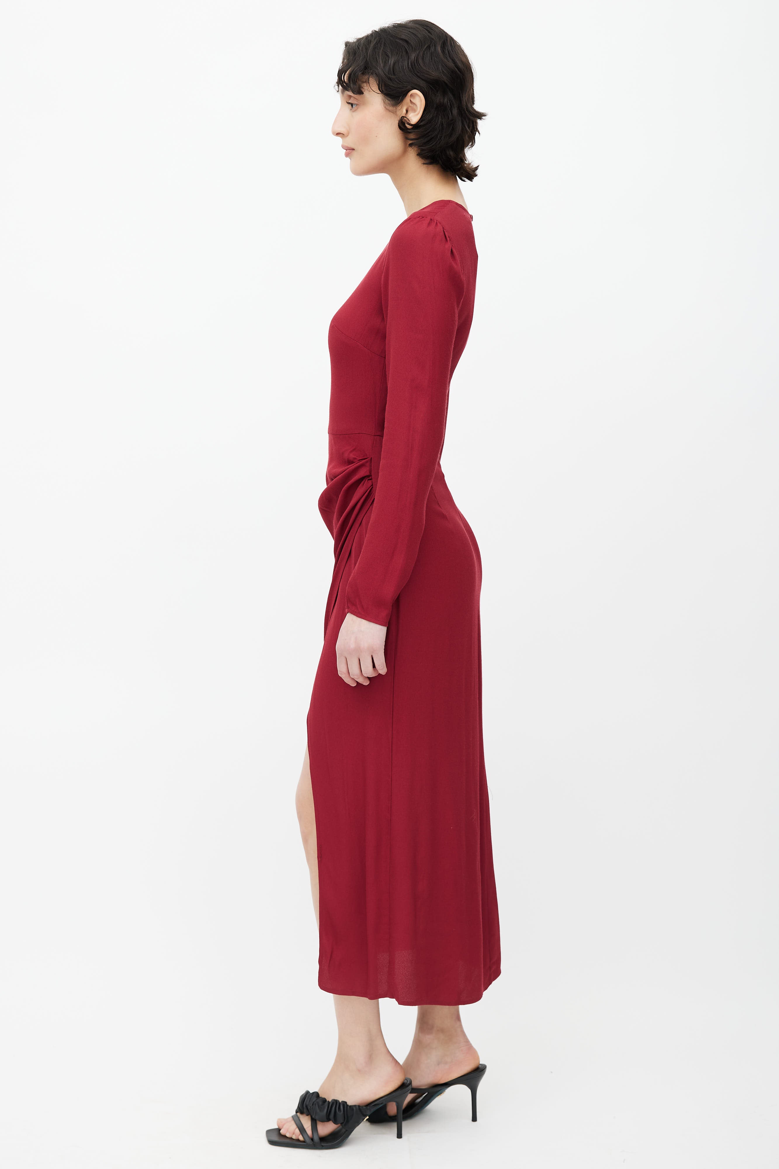 Pre-owned Reformation dress in burgundy featuring round neckline, keyhole back with button closure, concealed zip closure at back, long sleeves, side slit, and ruching at hip.