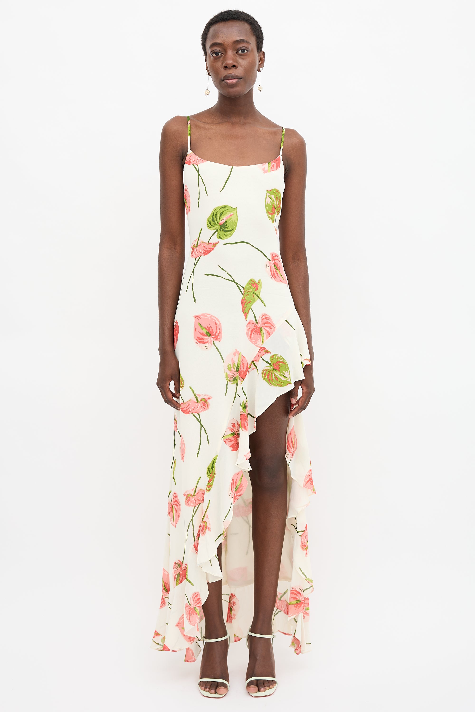 Pre-owned Reformation cream crepe Winola dress featuring pink and green floral print, round neckline, adjustable shoulder straps, asymmetrical hi-low hem, ruffle trim, and concealed back zip. Lined. Clipped to fit model.
