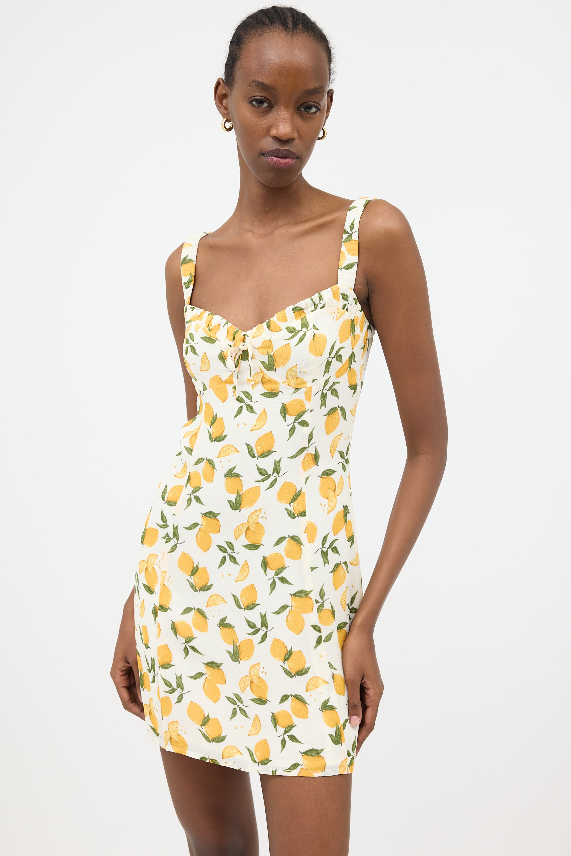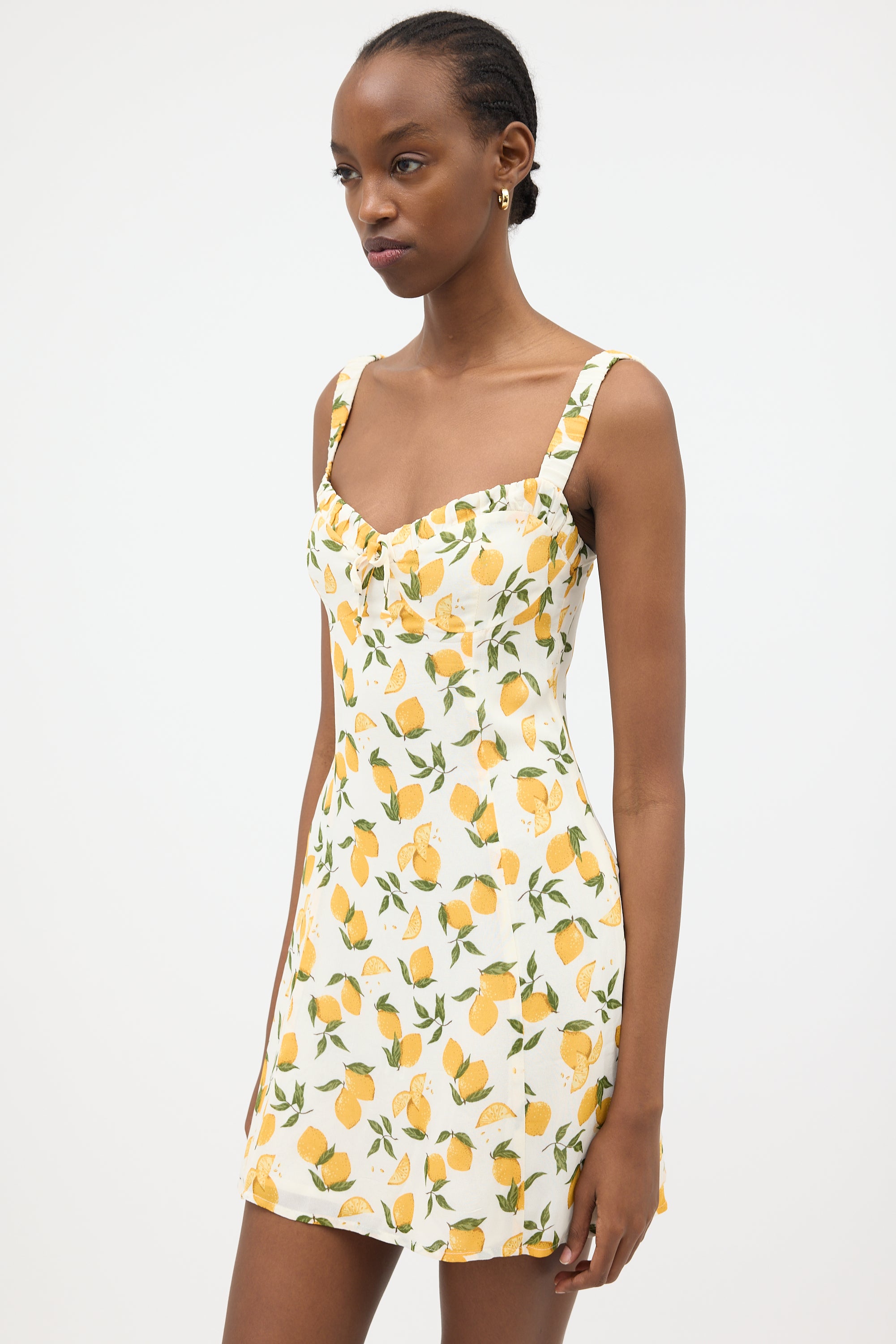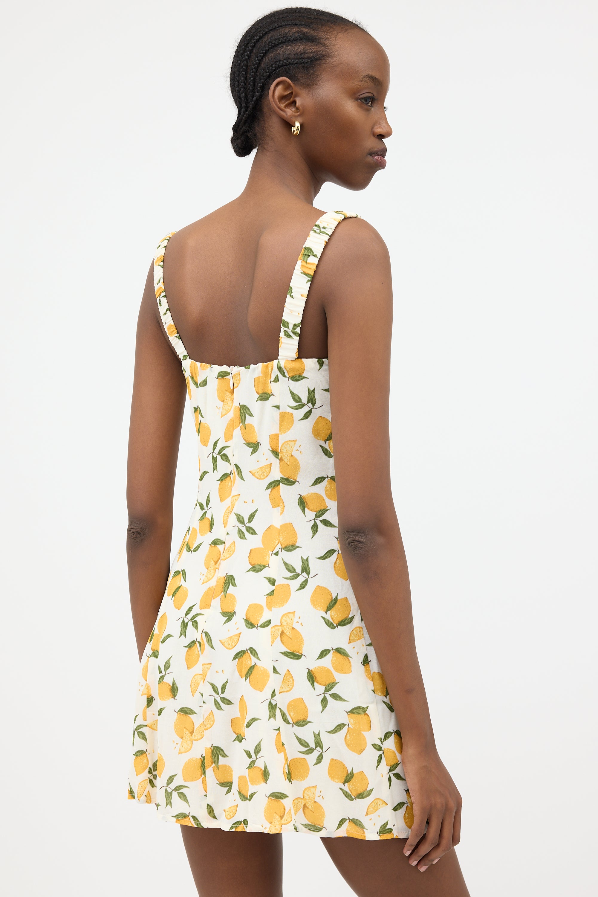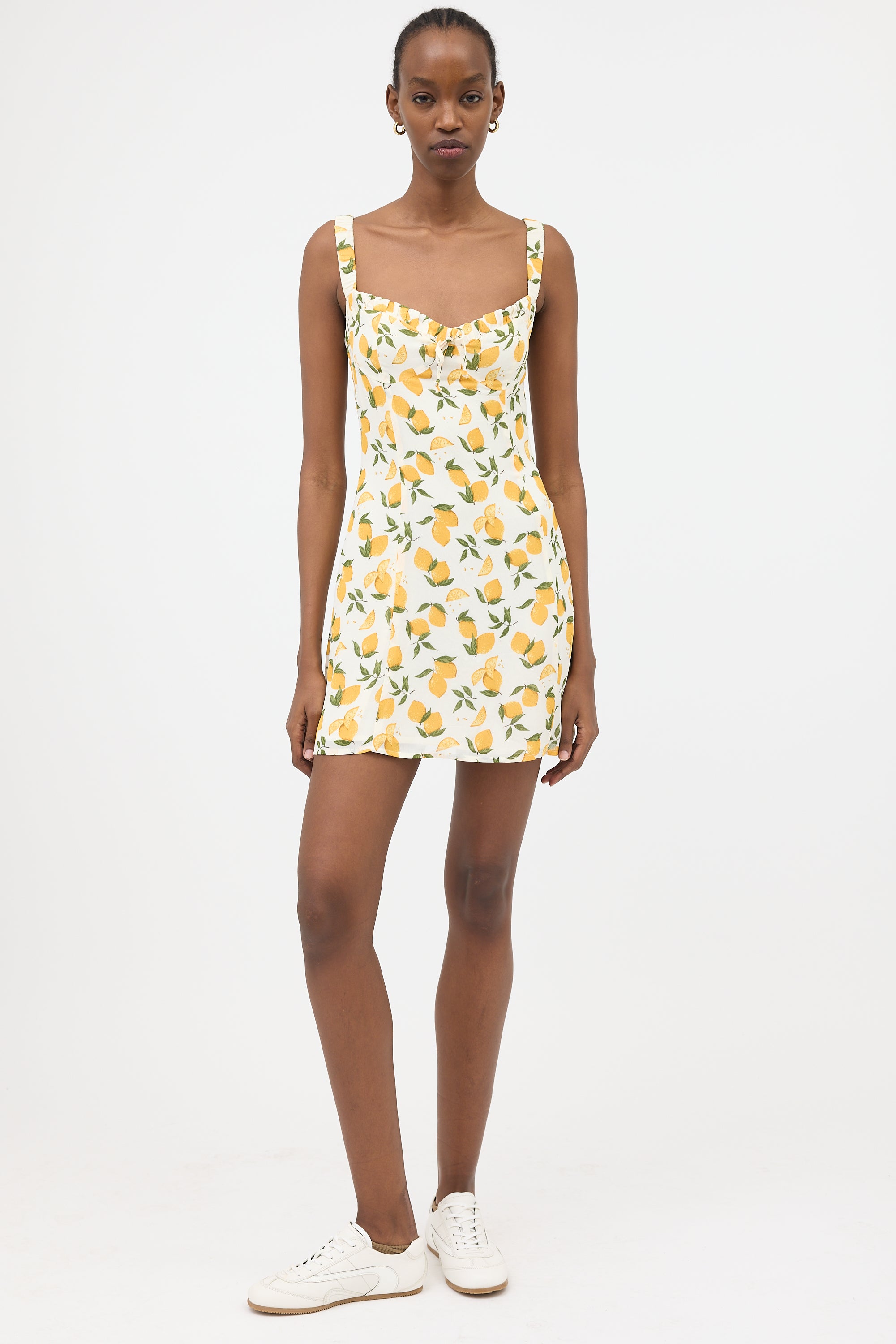 Pre-owned Reformation white crepe Jordy dress featuring multicolour Lemon motif print, sweetheart neckline, elasticized shoulder straps, pleated collar, and concealed back zip. Lined.