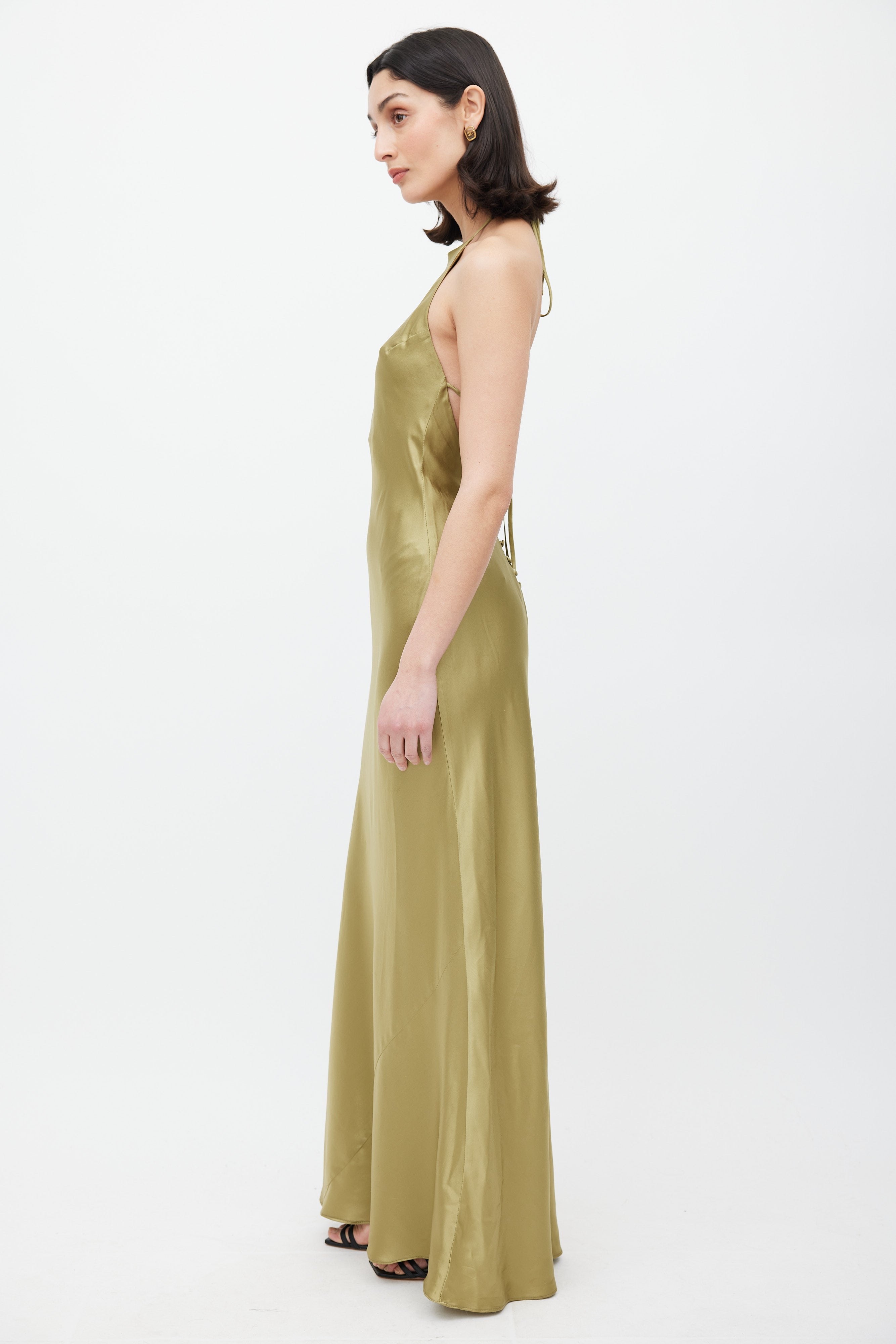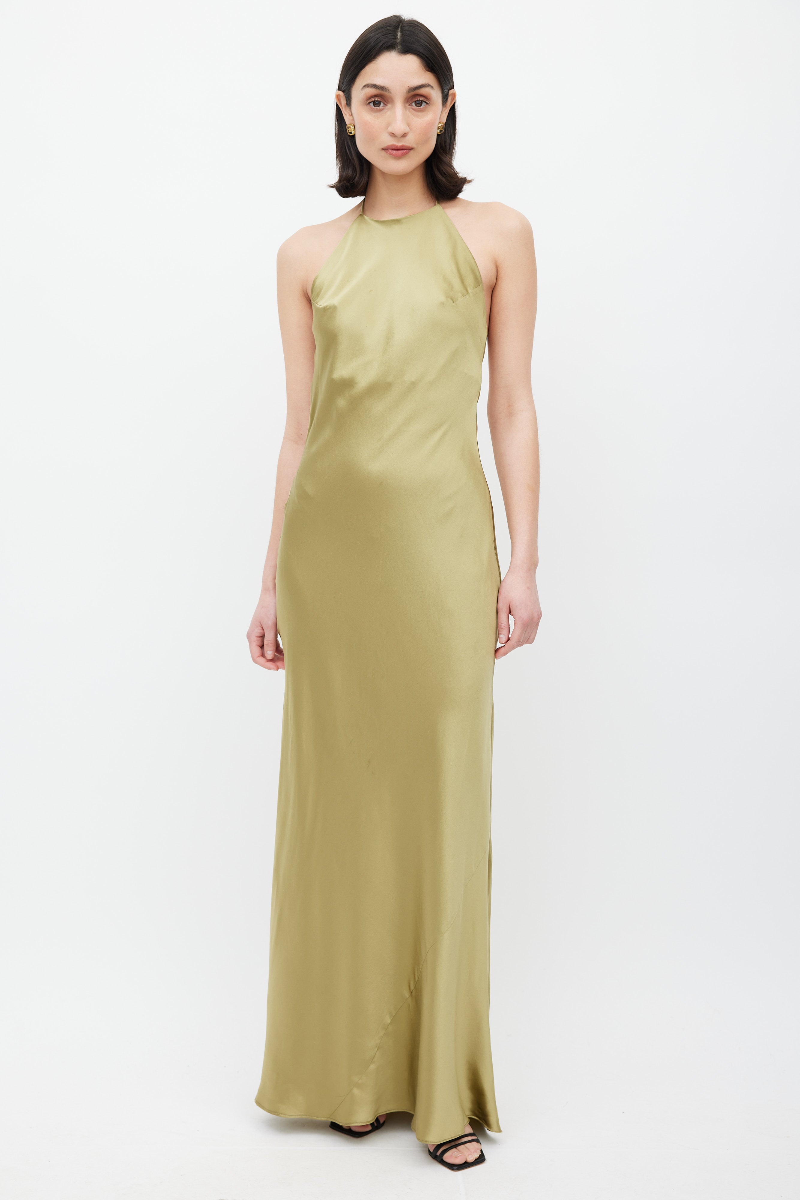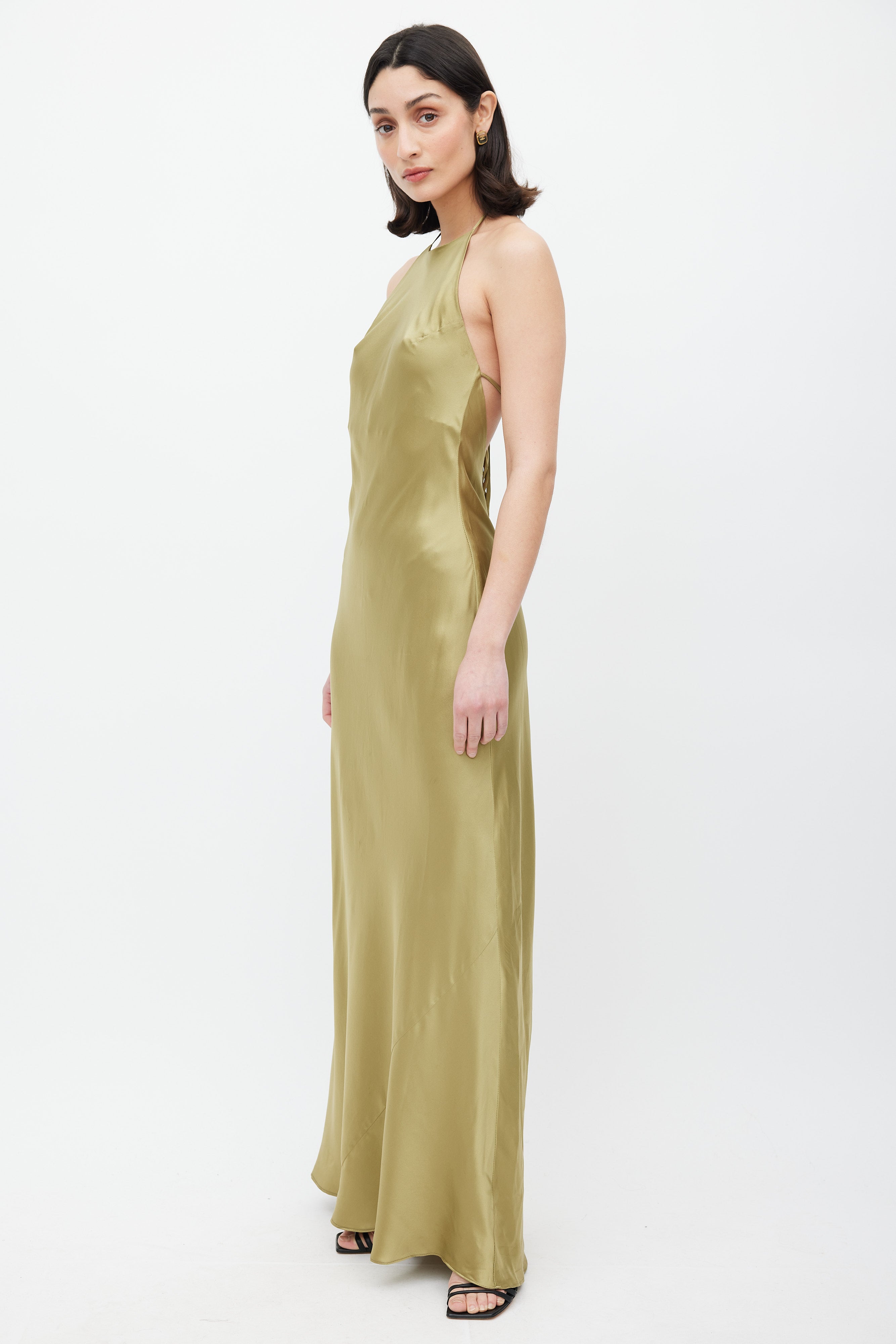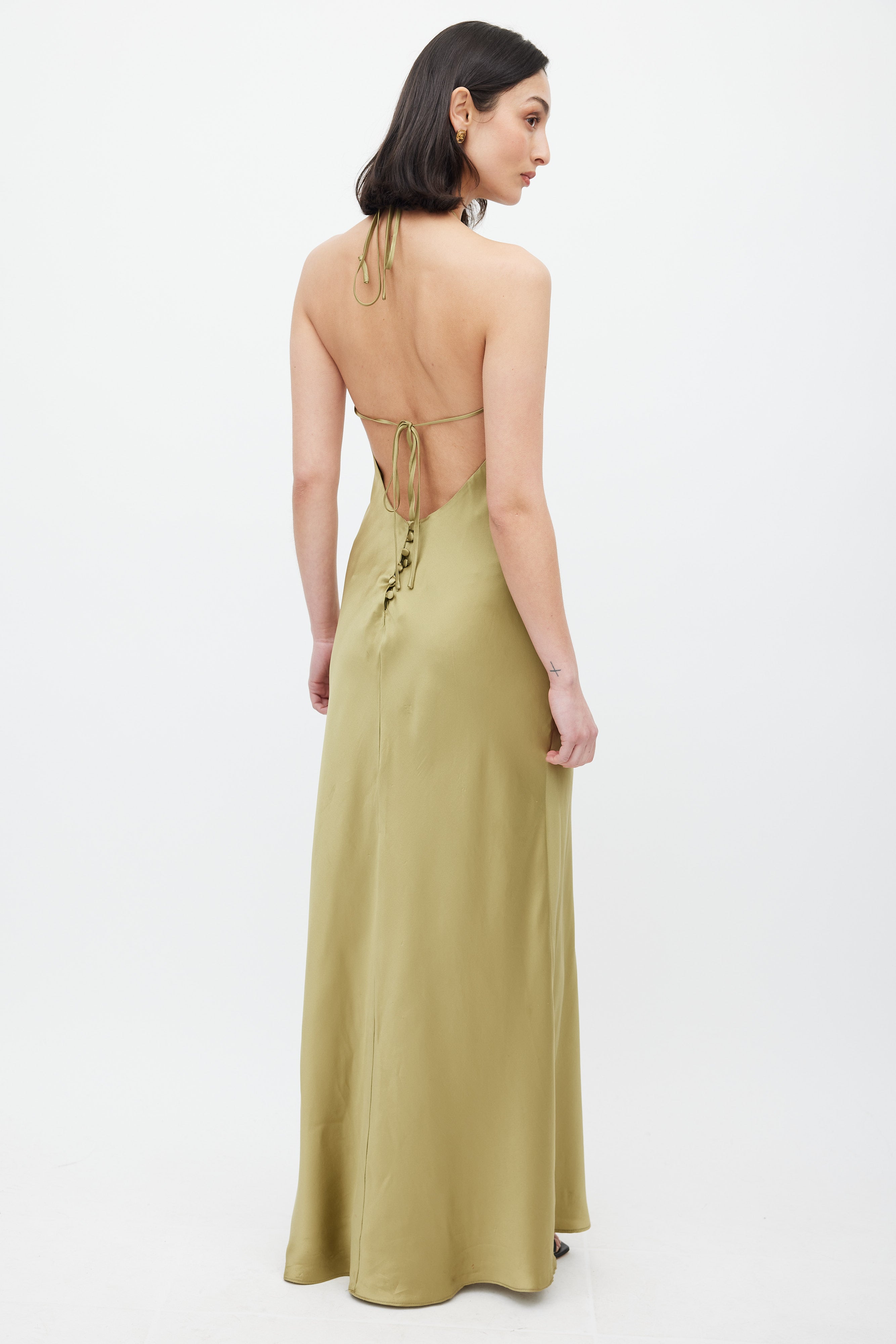 Pre-owned Reformation green Jeany silk dress featuring halter neckline with adjustable straps, low back with self tie strap and covered back buttons.