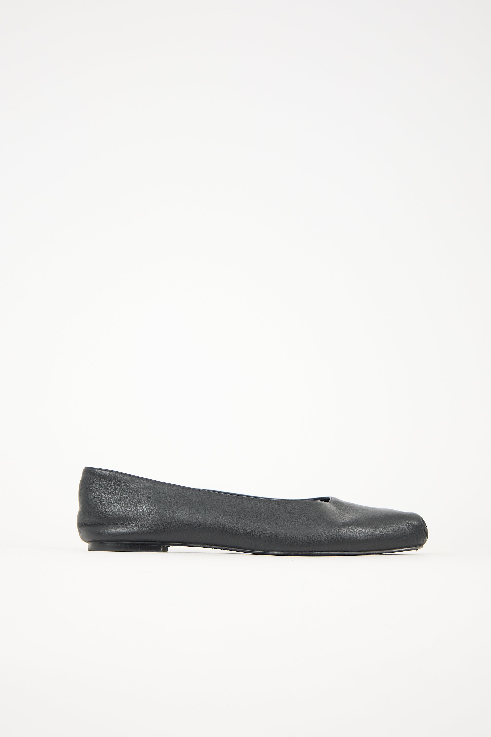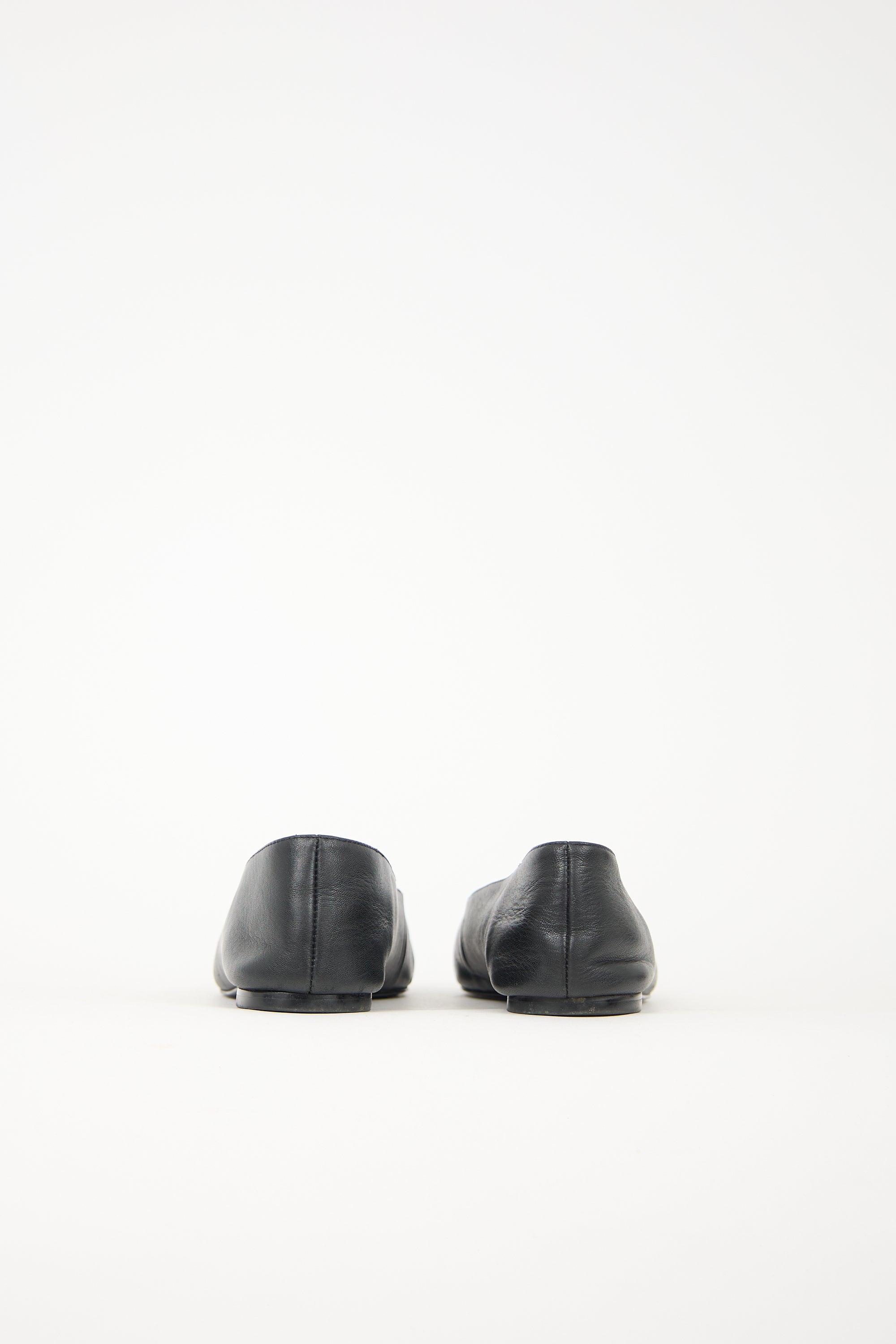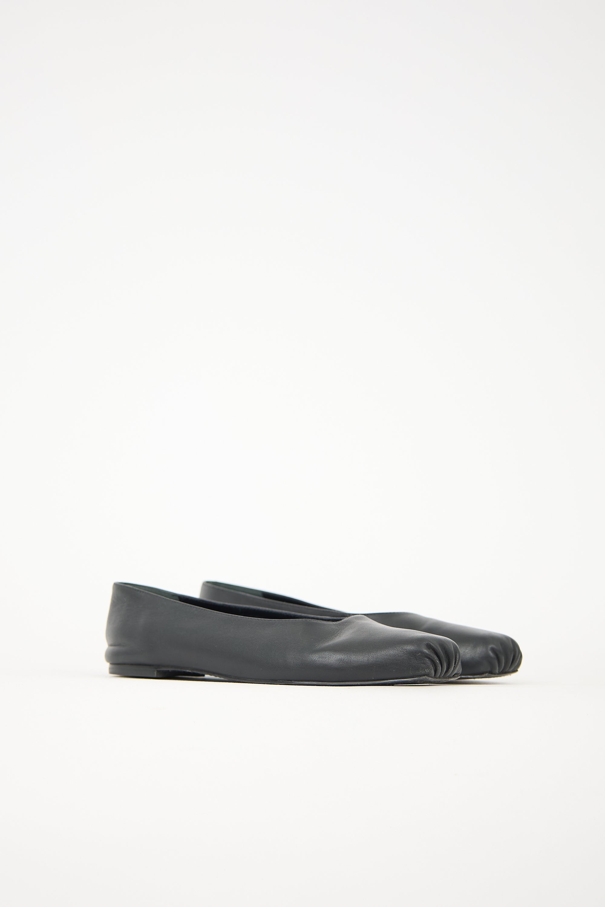 Pre-owned Reformation black leather ballet flats featuring gathered square toe and slip on entry.