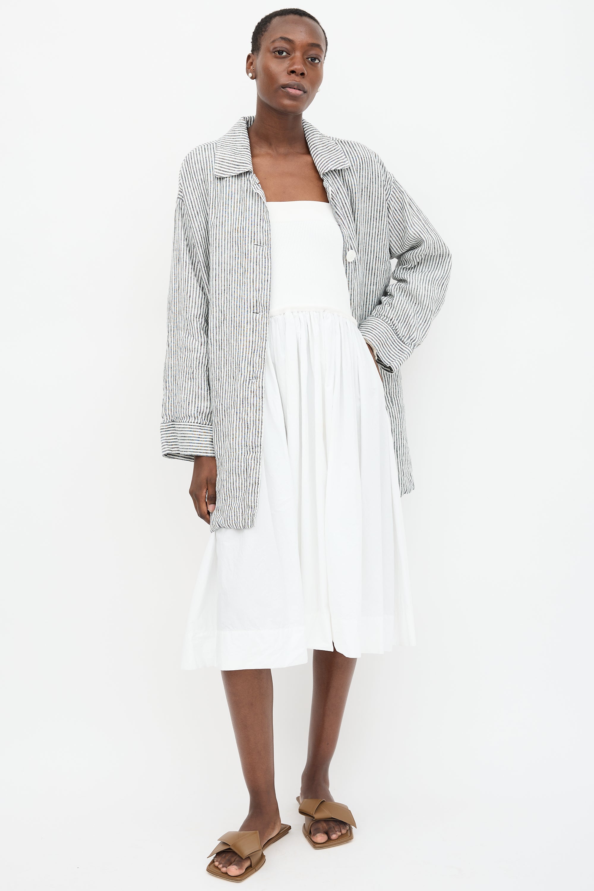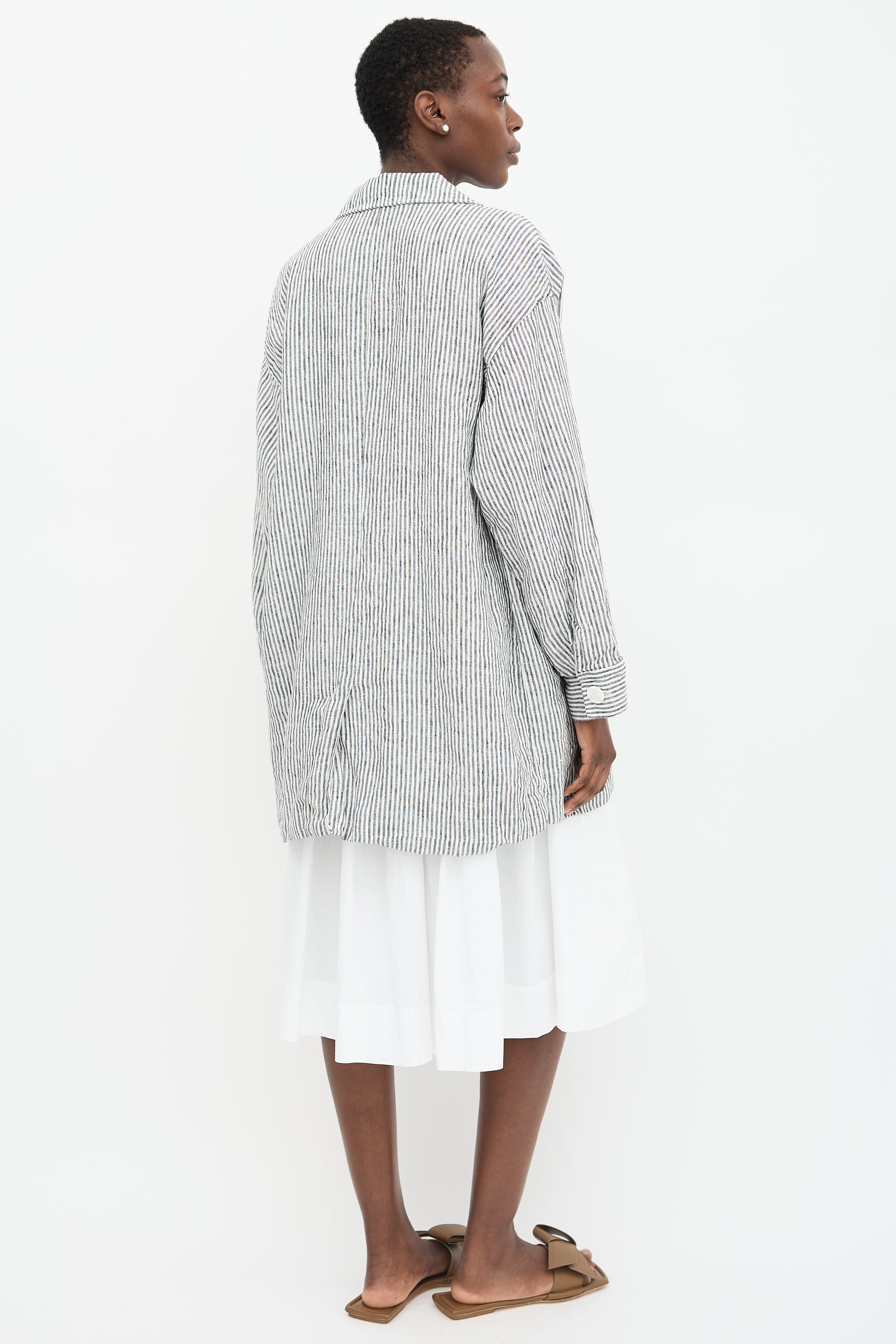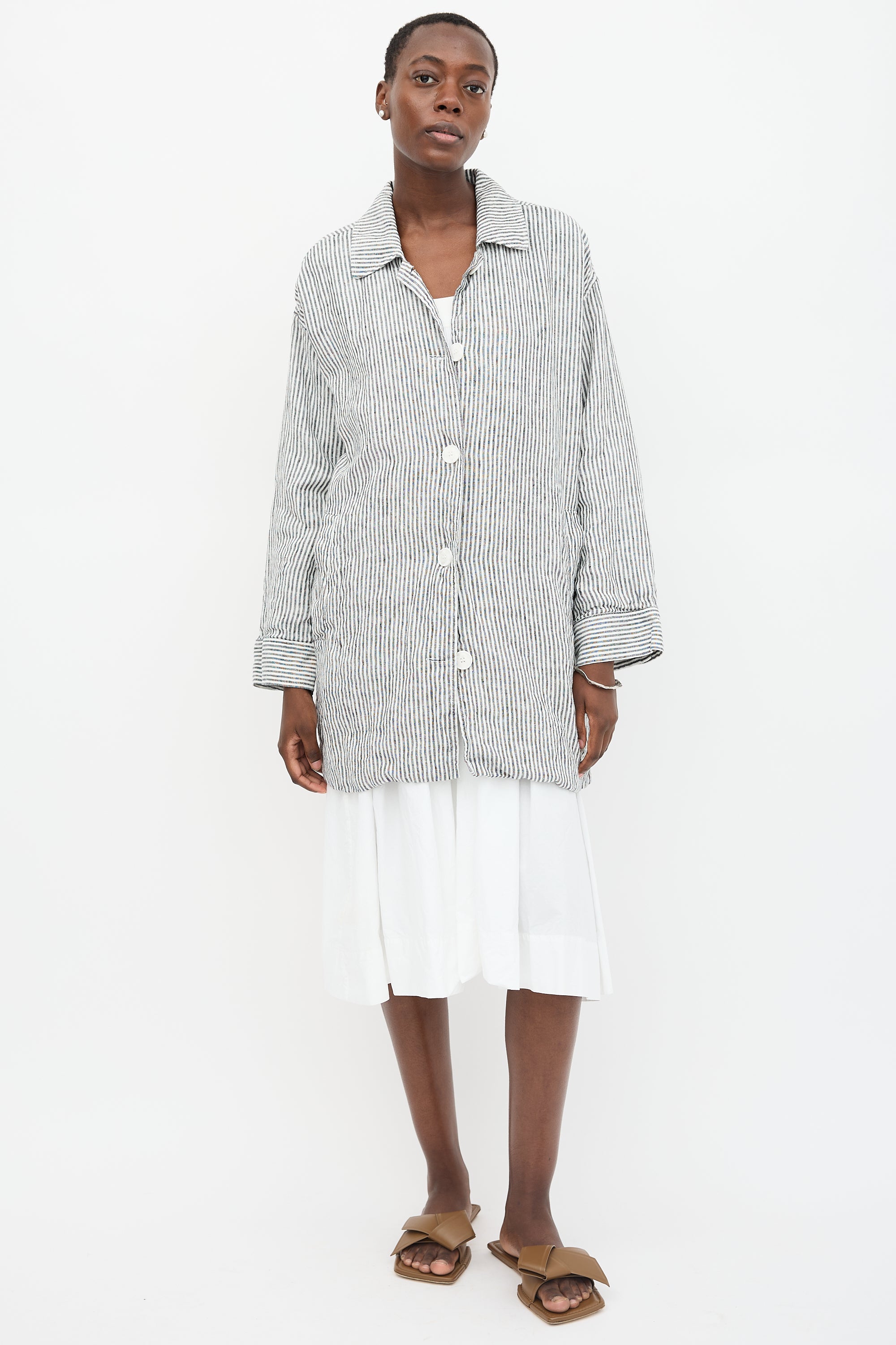 Pre-owned Reformation grey and white linen Irene jacket featuring vertical stripe pattern, spread collar, button front, two front pockets, onr interior pocket, and back vent. Lined.