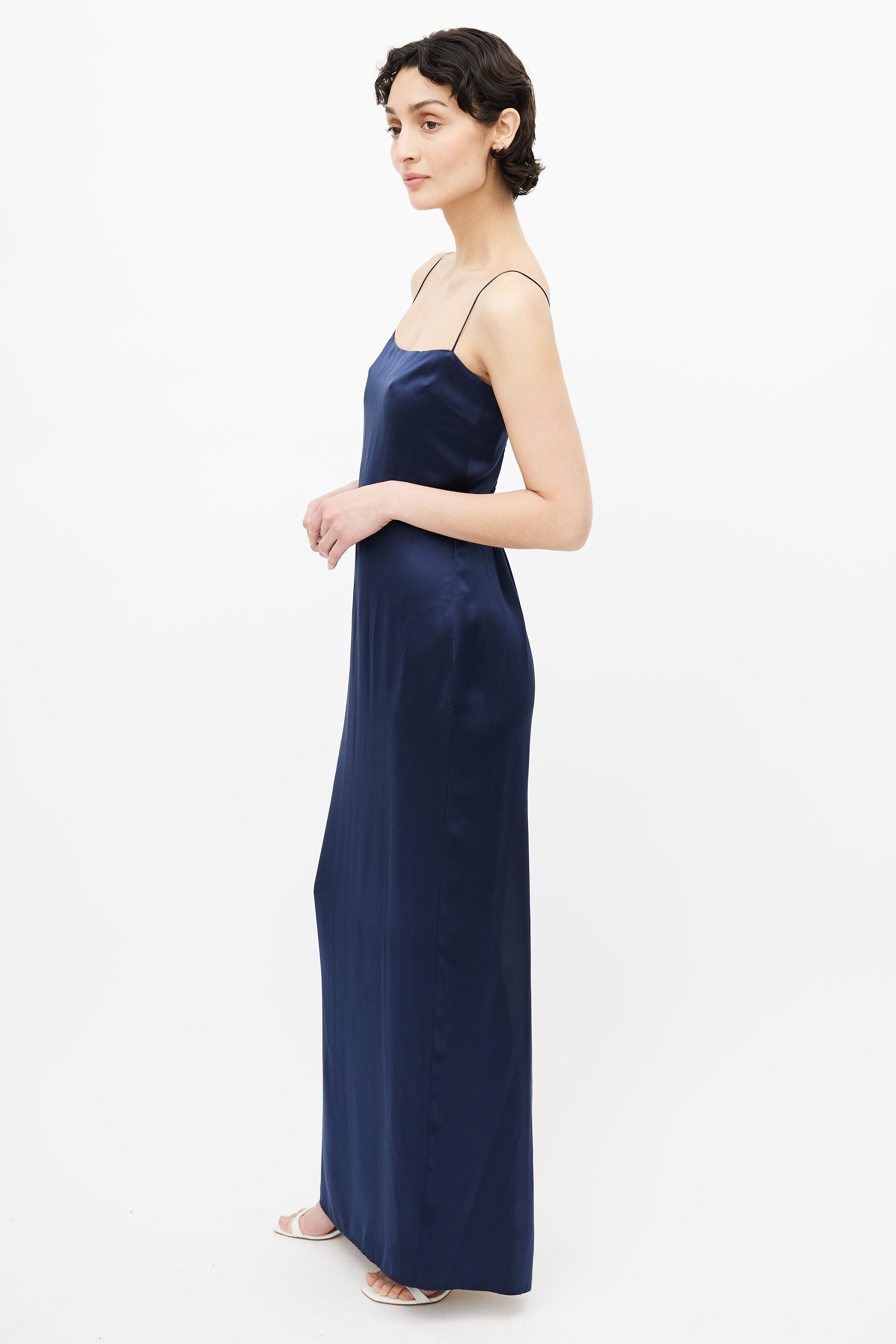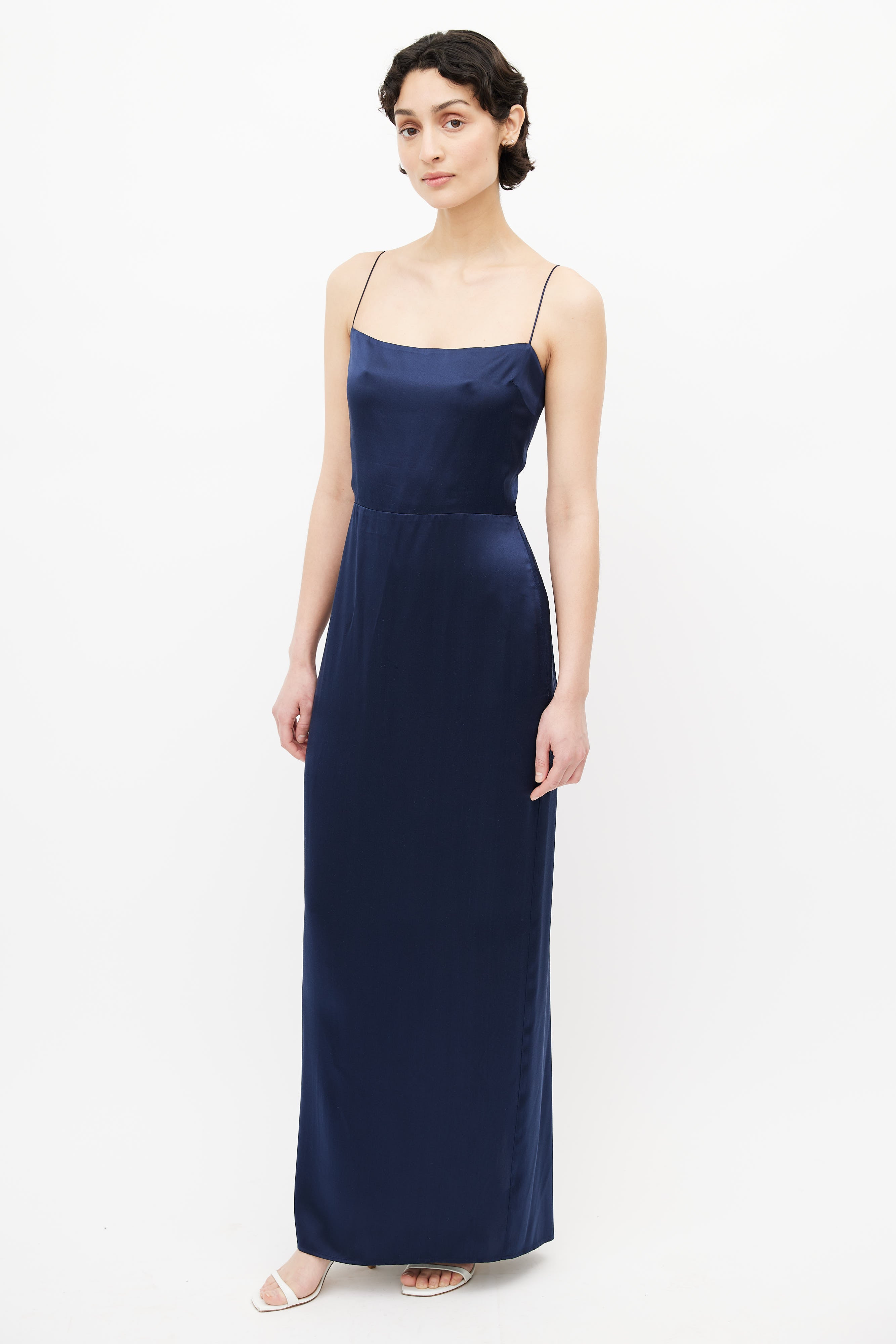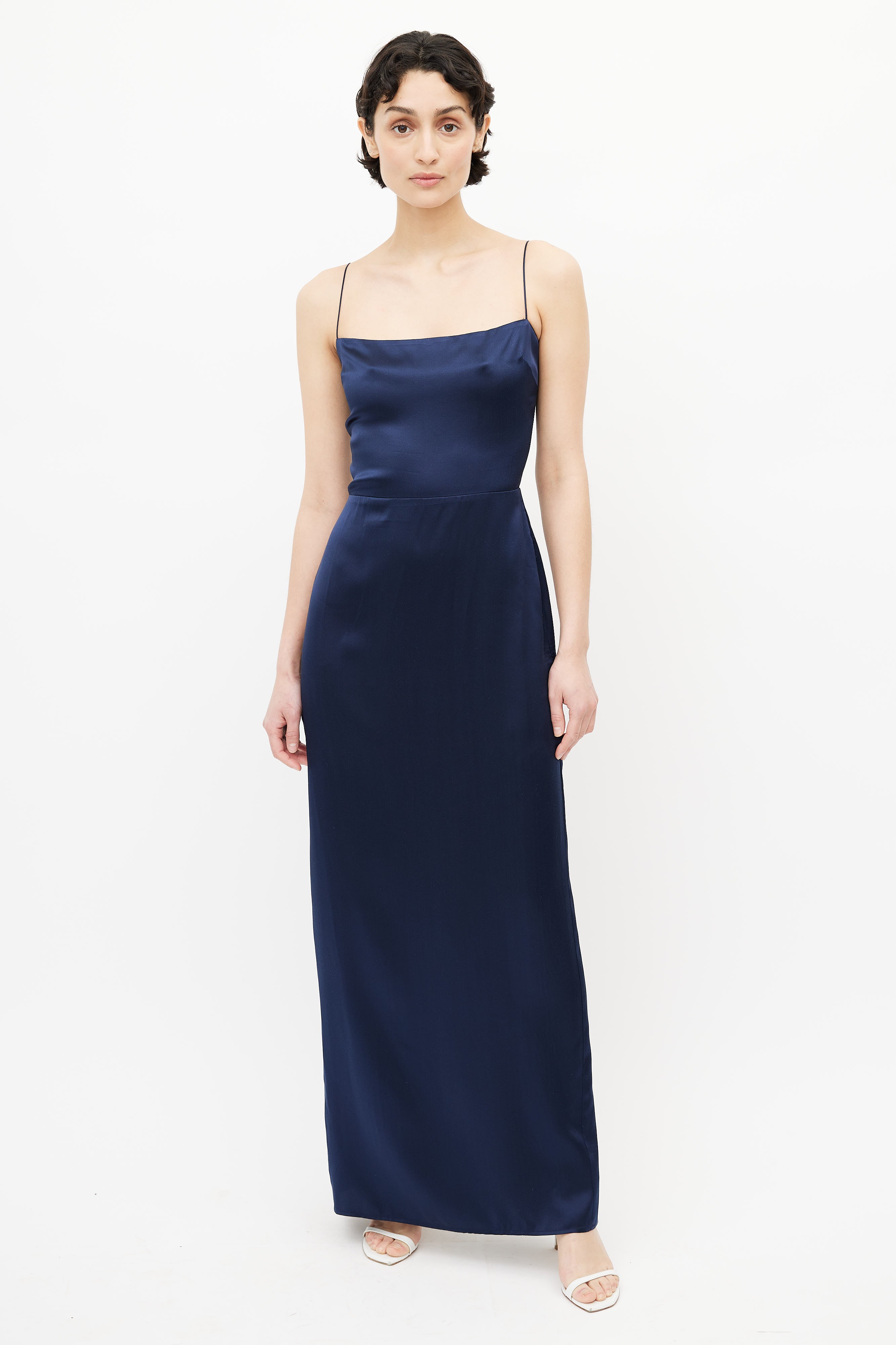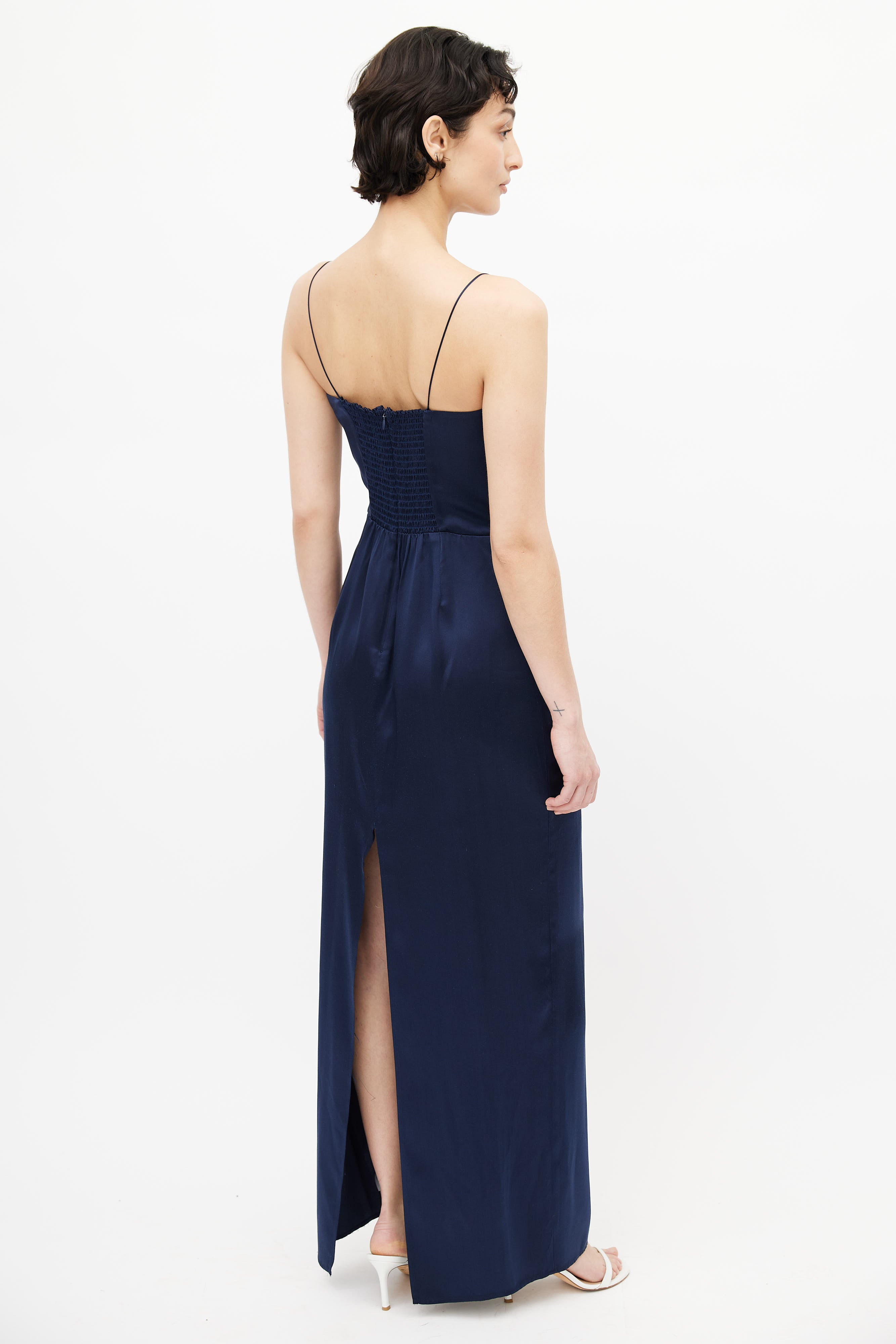 Pre-owned Reformation navy silk dress featuring a straight across neckline, centre seam, cut slit at back, and a smocked insert at back with a concealed zip closure.