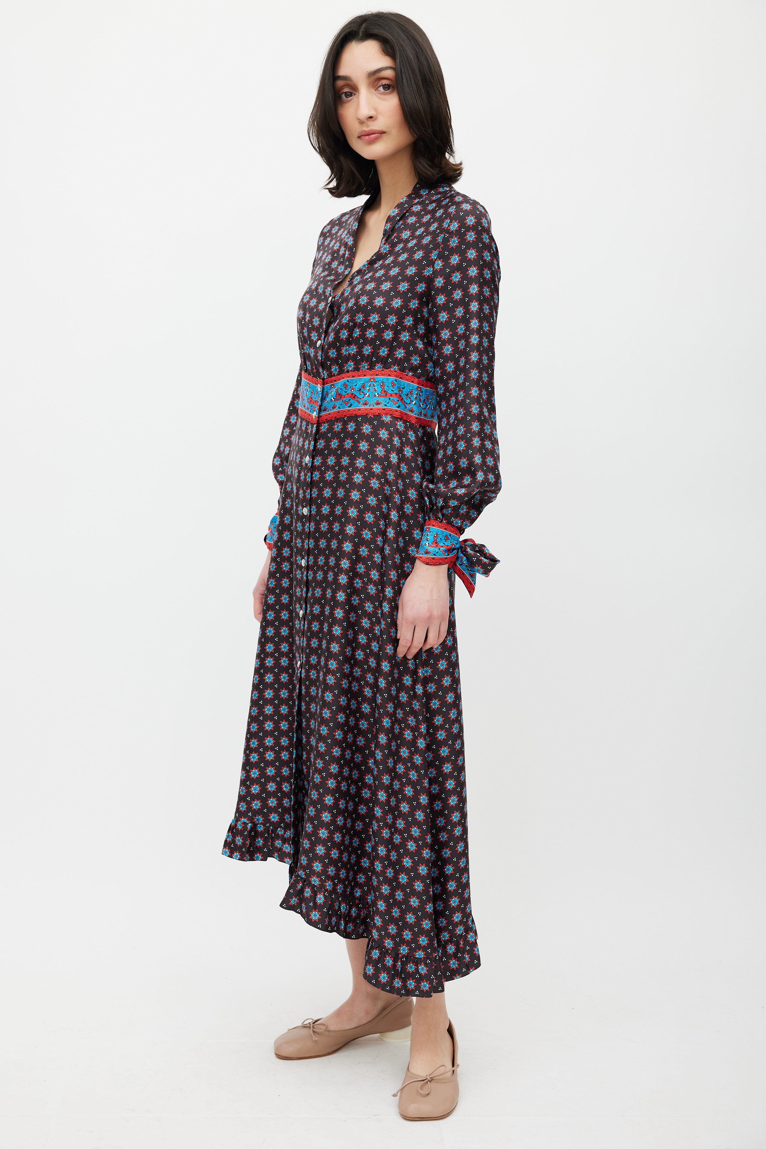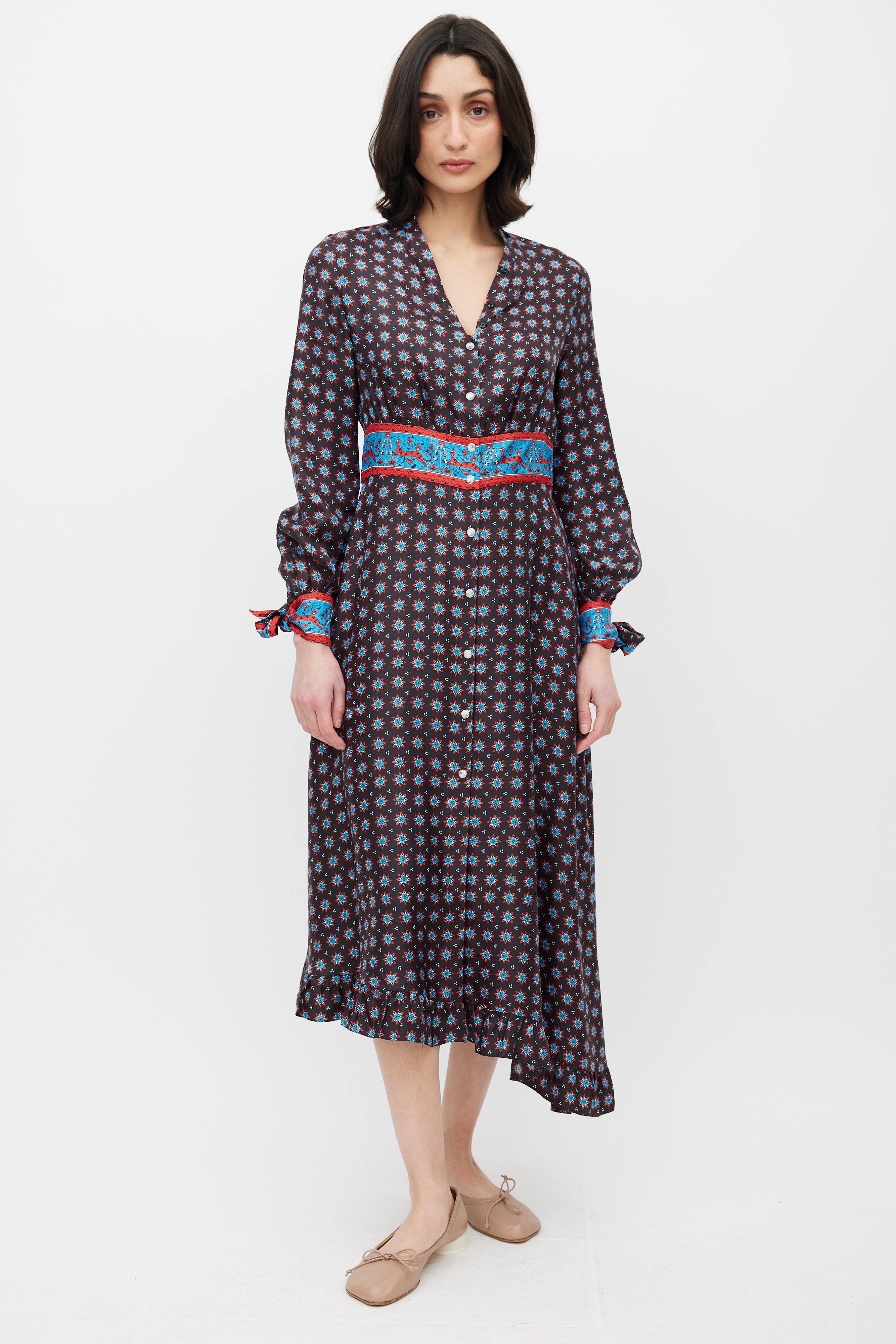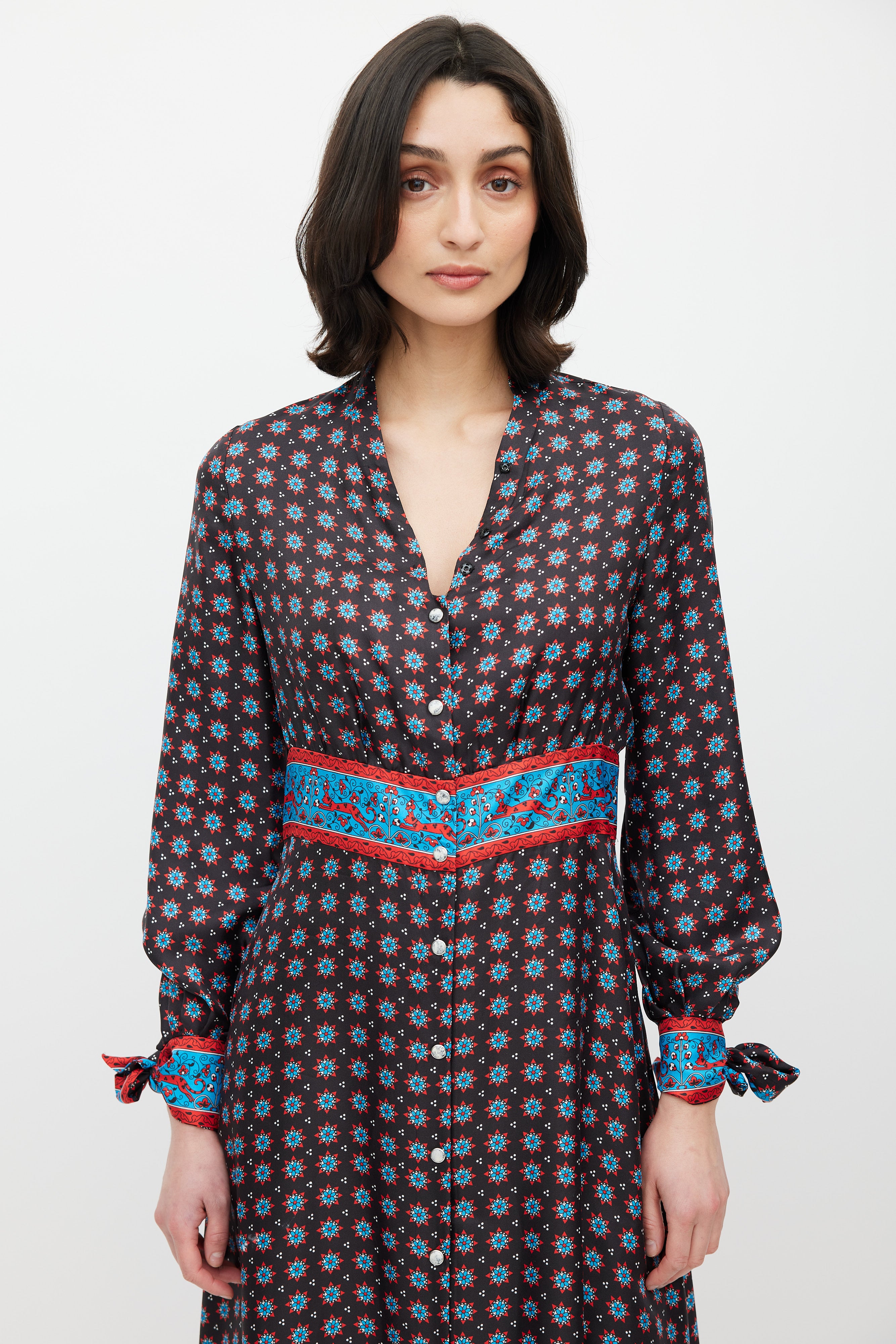 Pre-owned Sandro brown multicolour floral dress featuring blue and red flowers and geometric print design, long sleeves, full button up front, V-neckline, and wrap tie at cuffs.