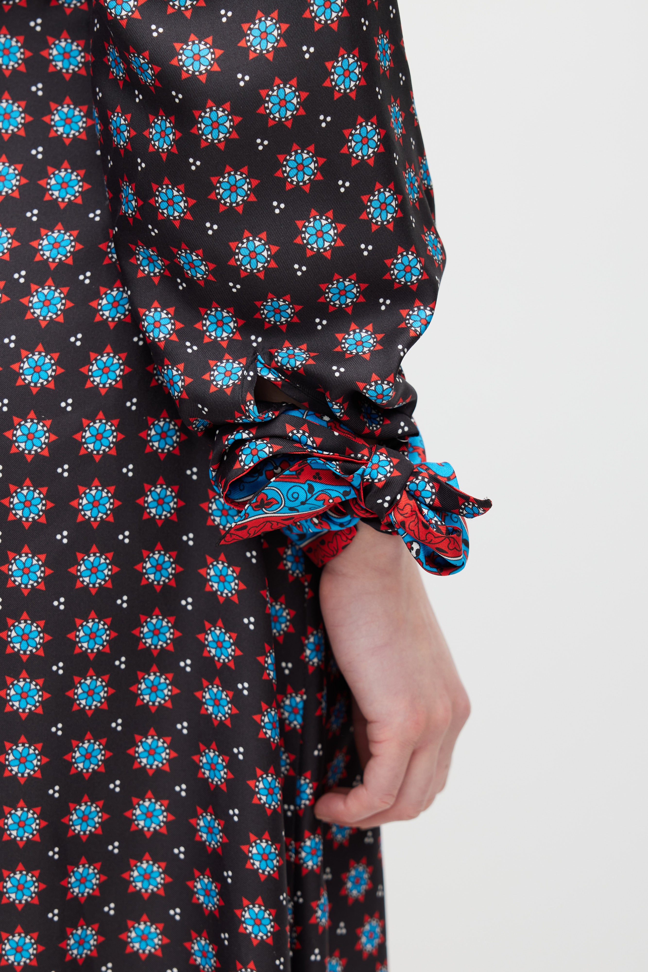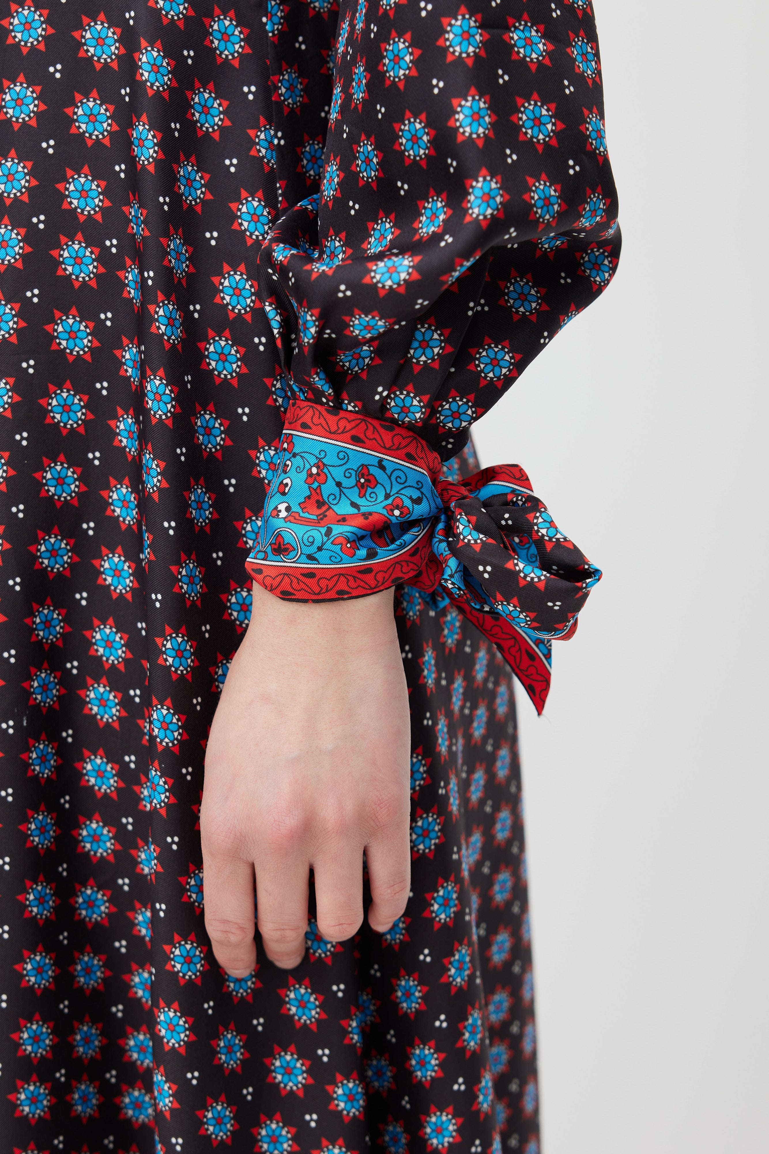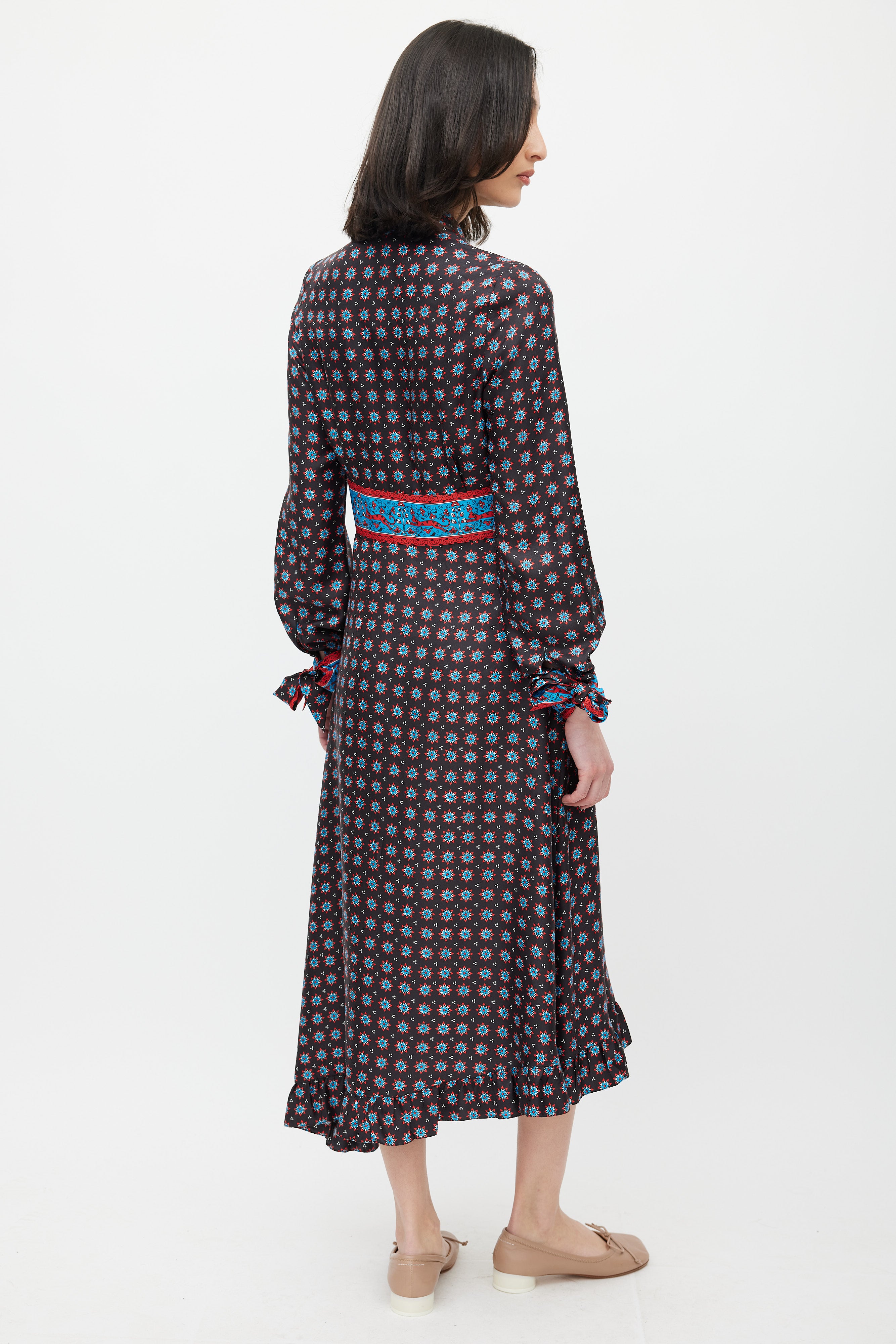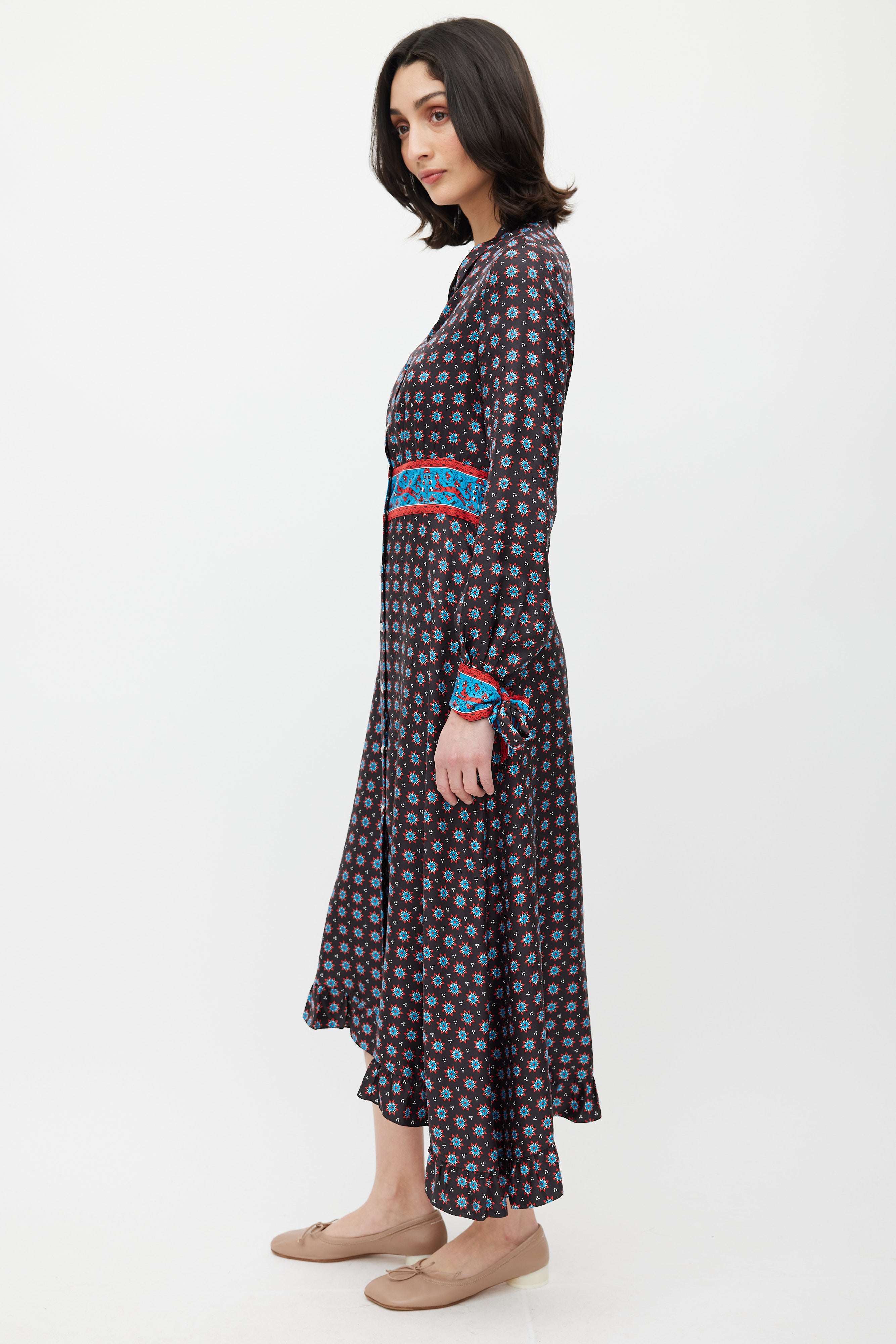 Pre-owned Sandro brown multicolour floral dress featuring blue and red flowers and geometric print design, long sleeves, full button up front, V-neckline, and wrap tie at cuffs.