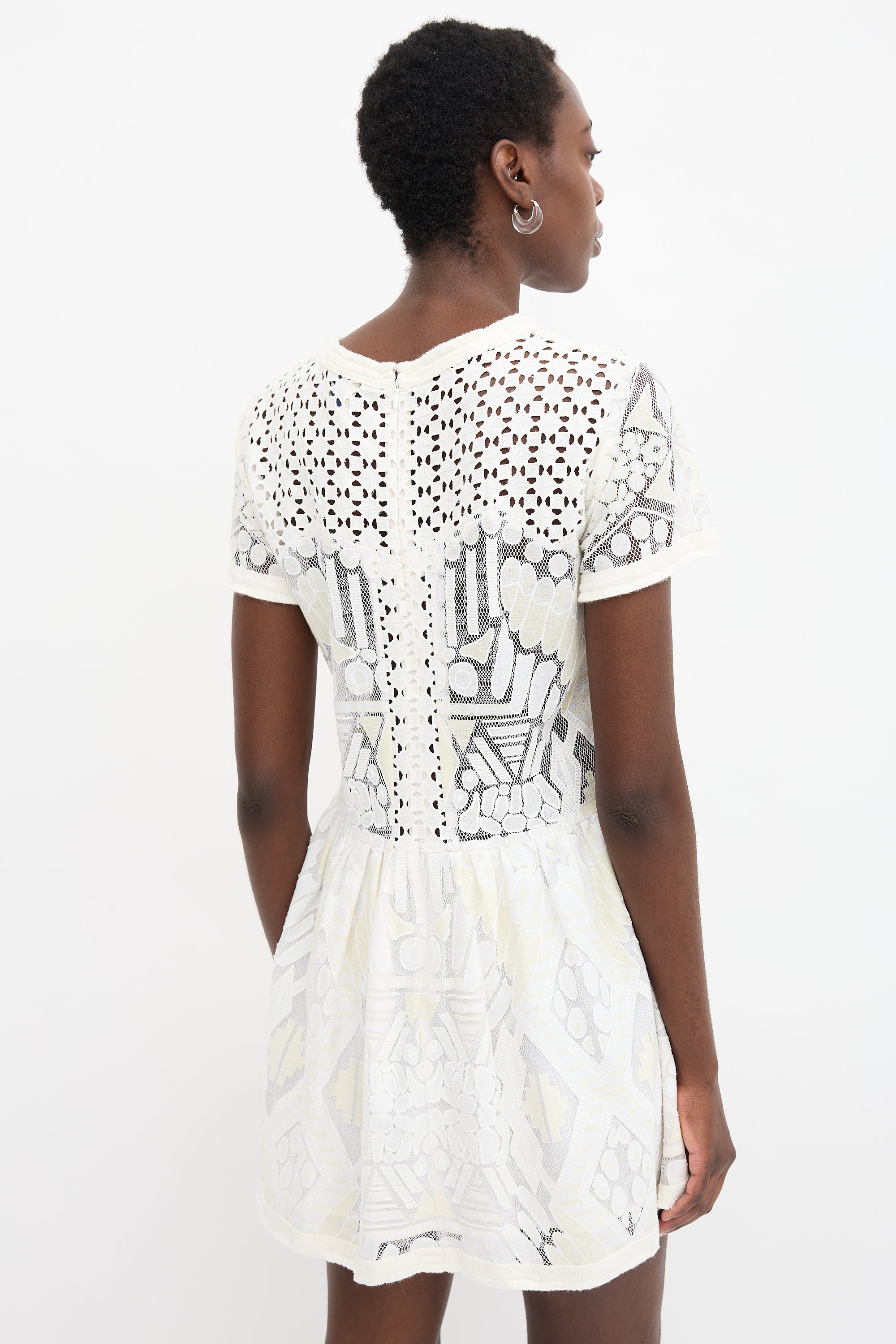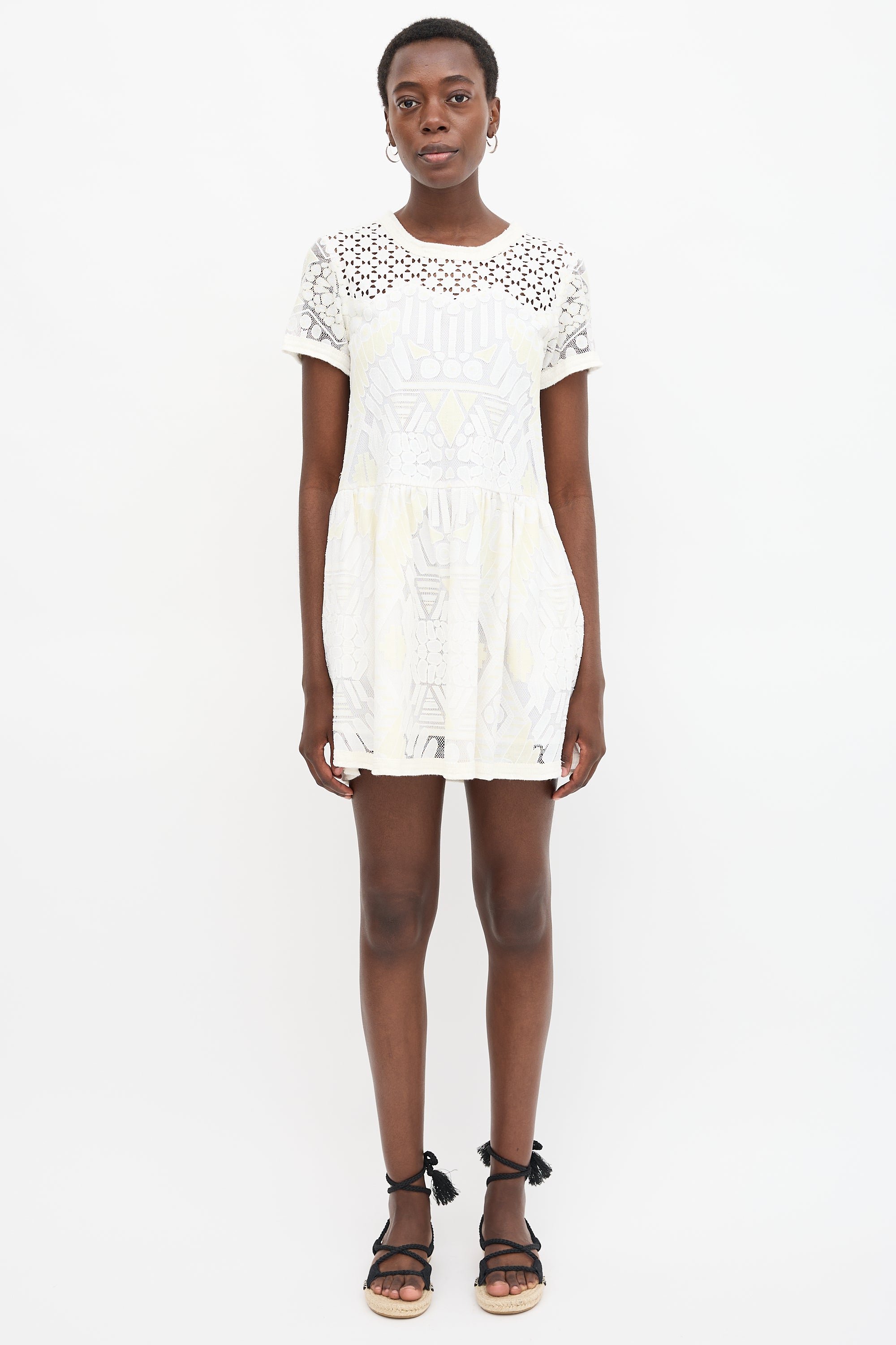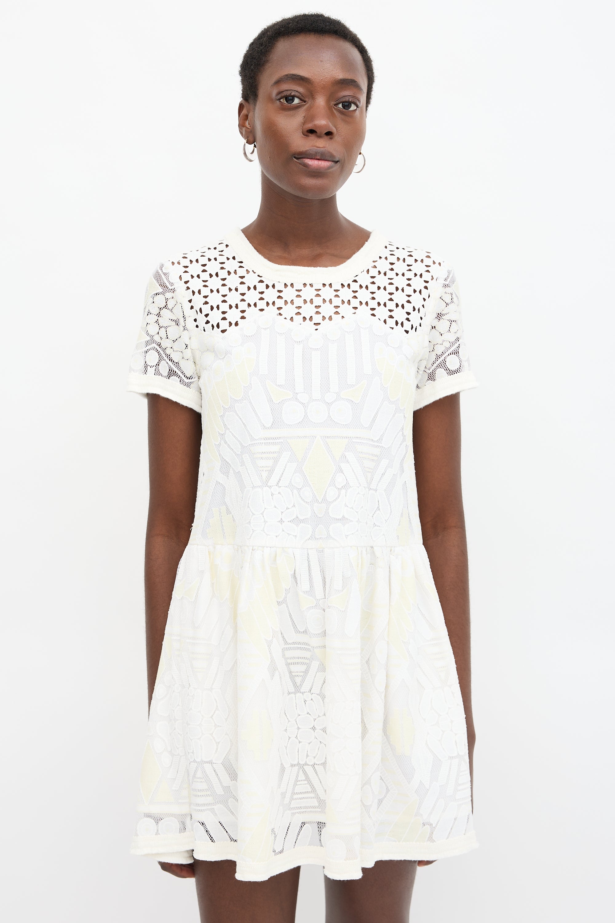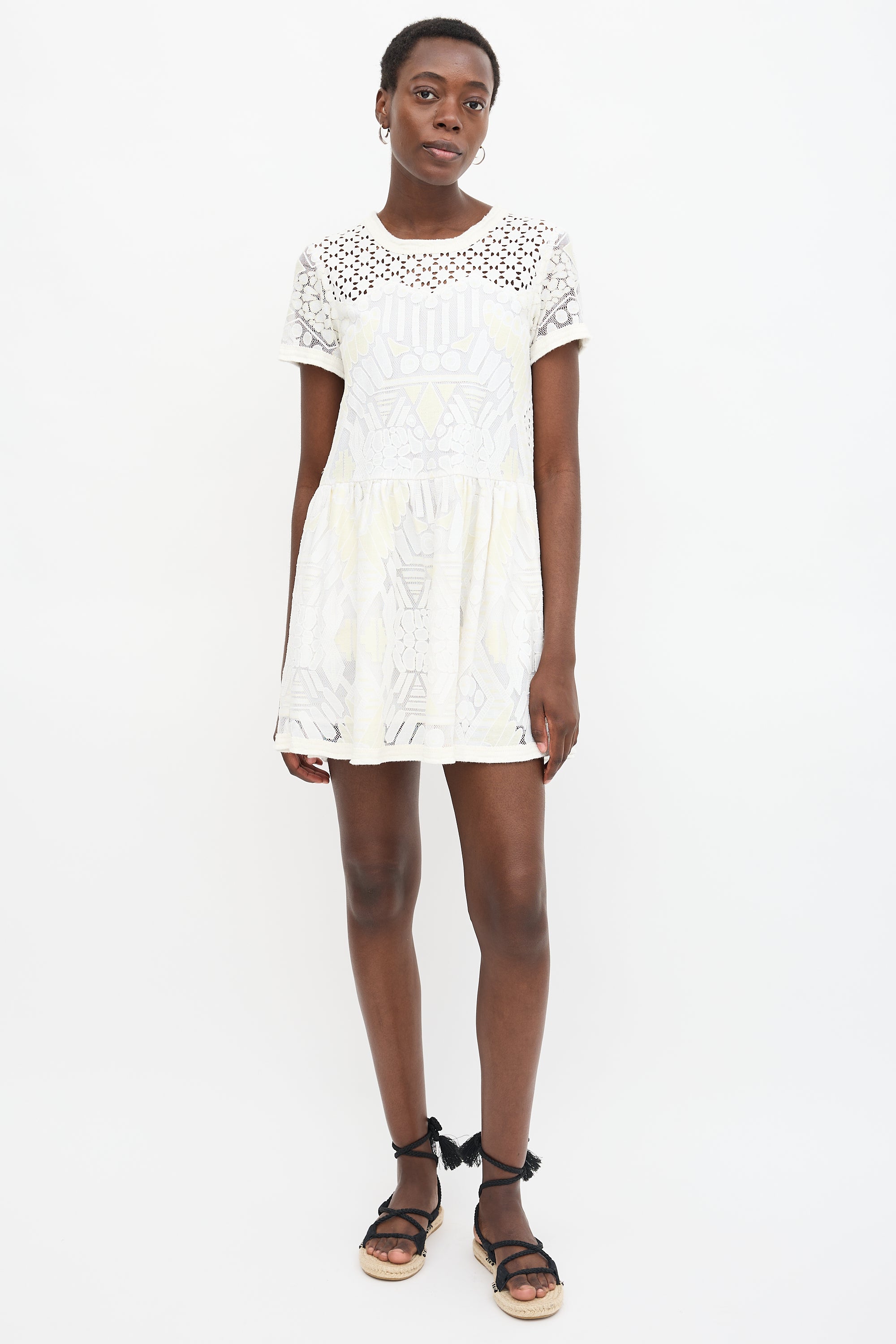 Pre-owned Sea white dress featuring embroidered eyelets at collar and hips, tonal embroidered mesh, fringe trim, in seam pockets, and concealed back zip. Partially lined.