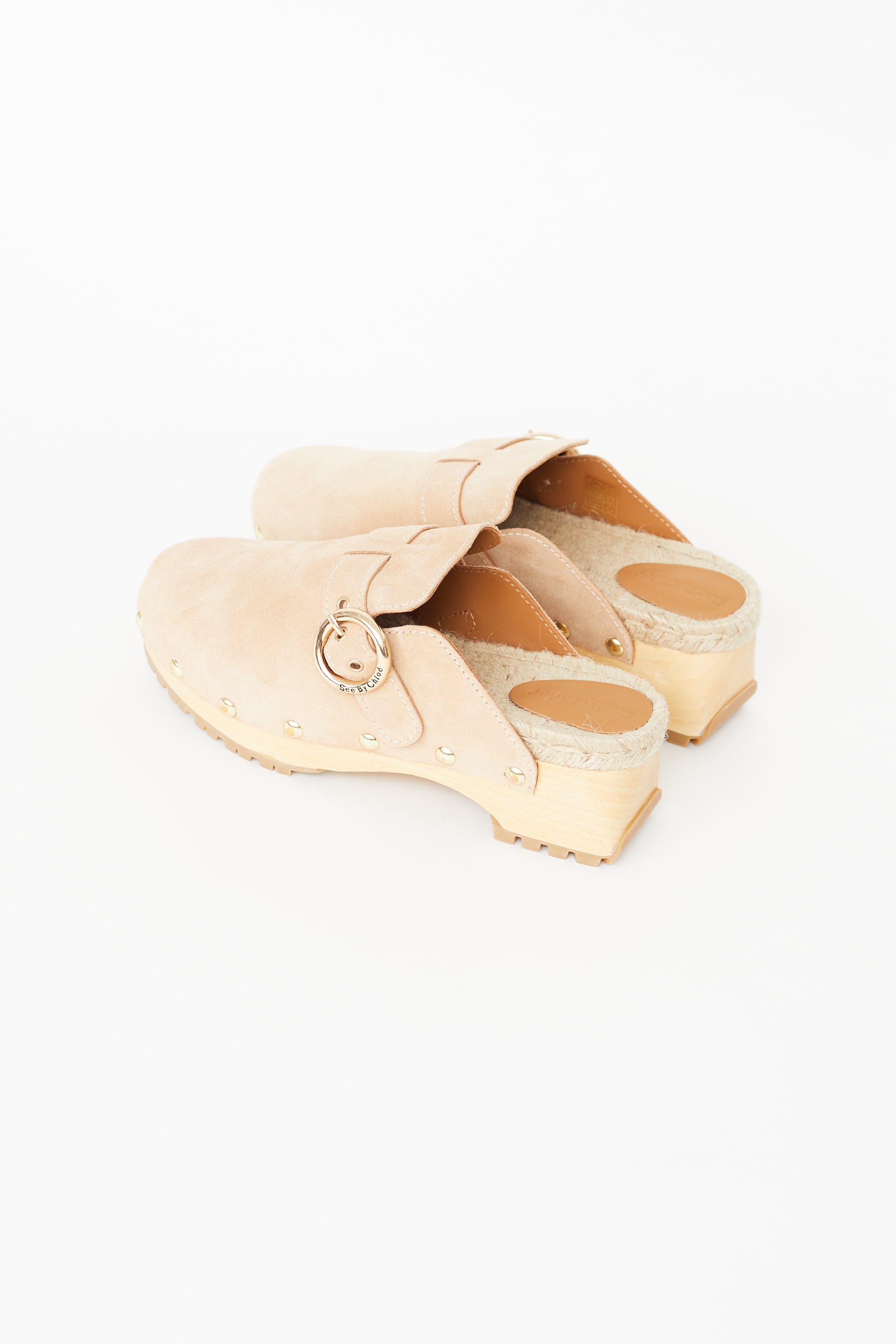 Pre-owned See By Chloé beige Viviane clogs featuring rounded toe, gold tone hardware, buckle fastening at vamp, stud embellishment at midsole, braided jute insole, and wooden platform heel. Comes with original dust bag and box.