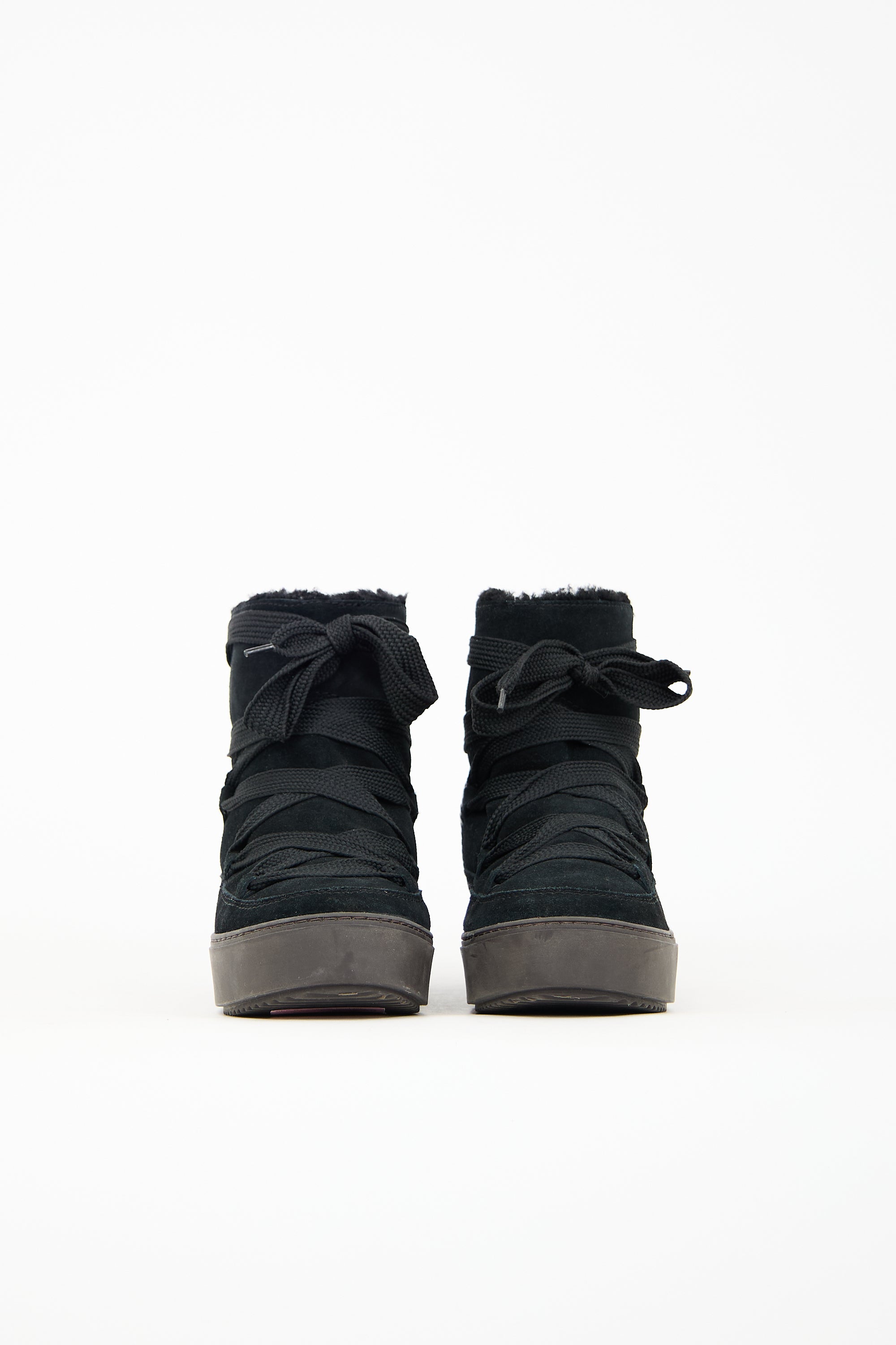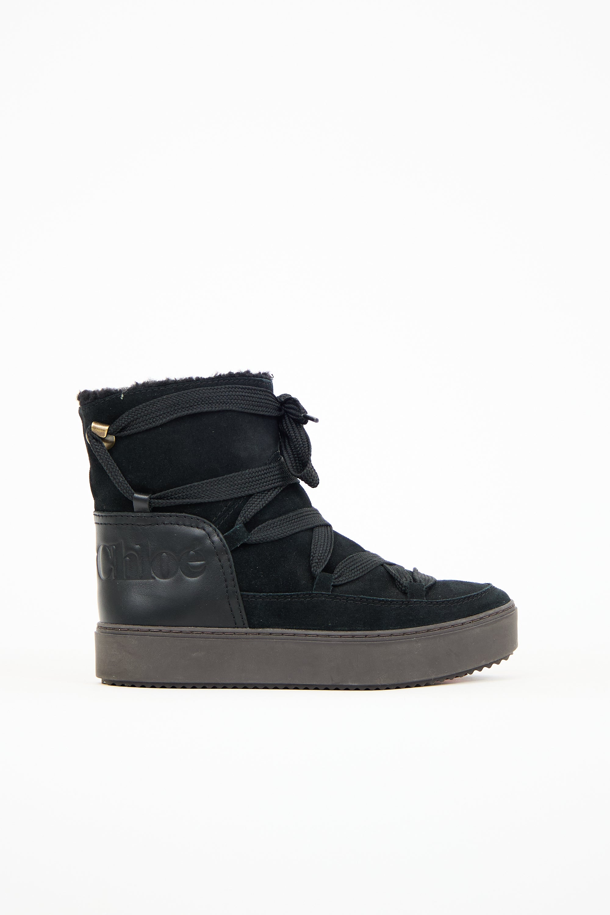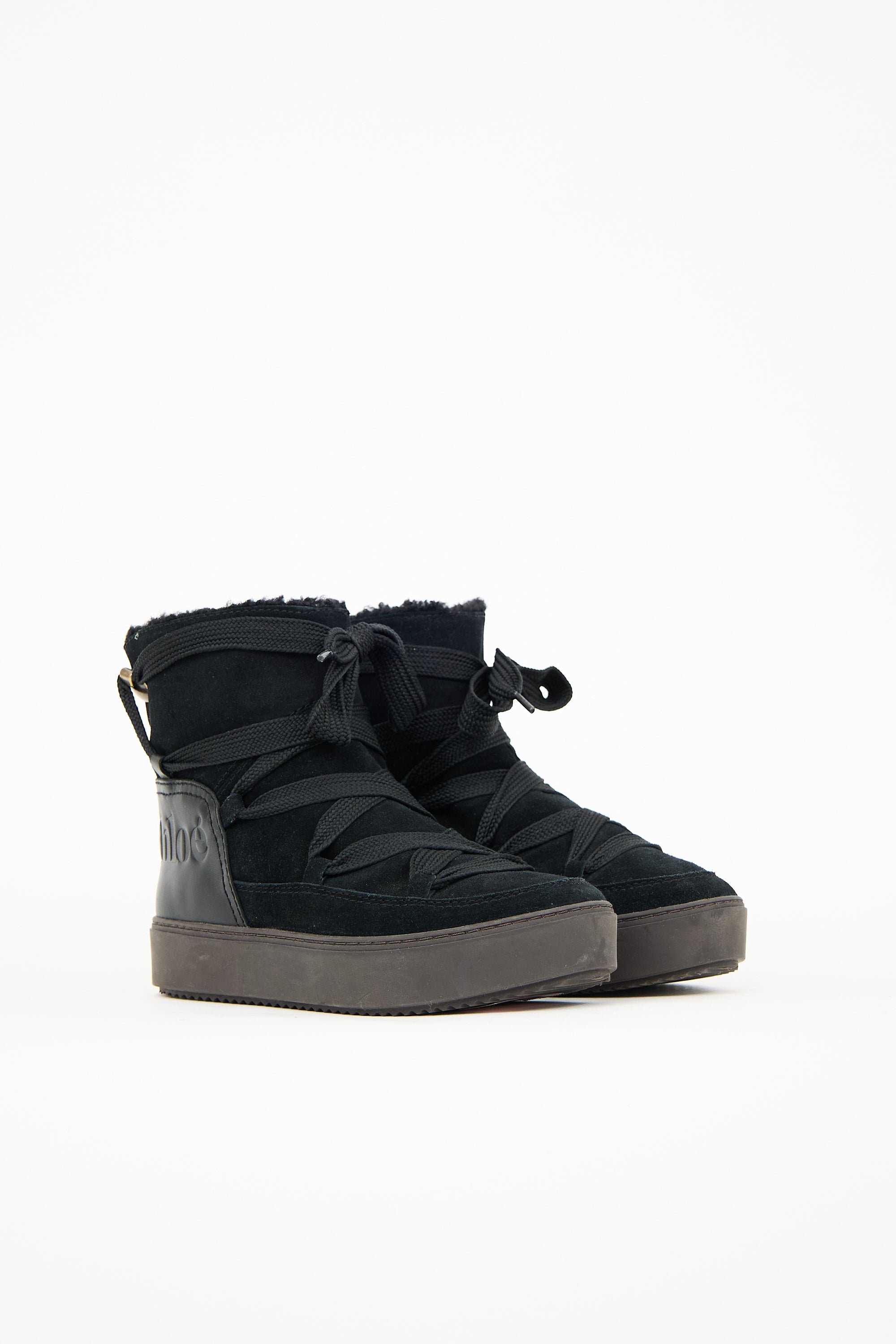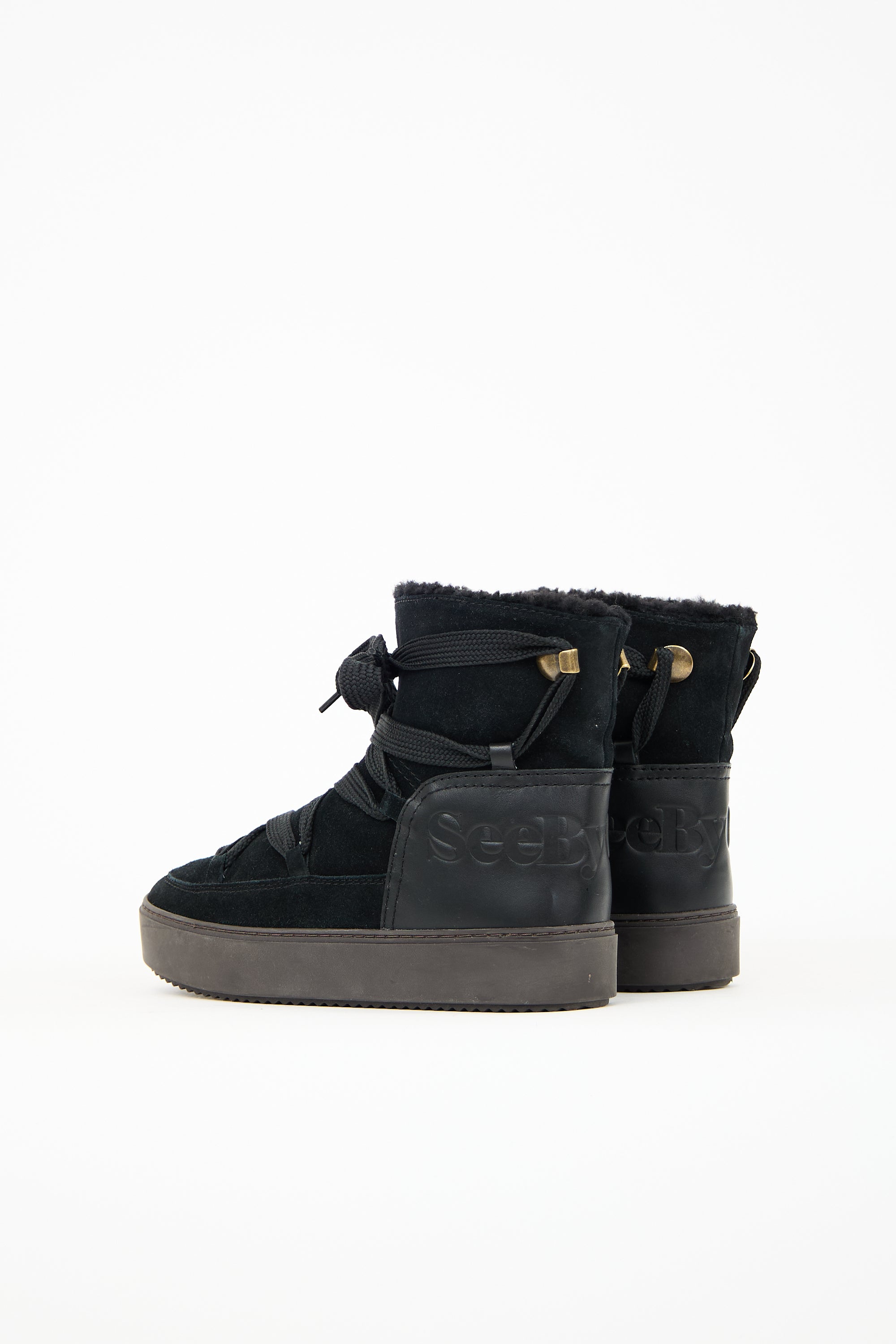 Pre-owned See By Chloé black suede boots featuring rounded toe, gold tone hardware, lace up front, ankle high shaft, debossed leather counter, brown rubber platform, and shearling lined.
