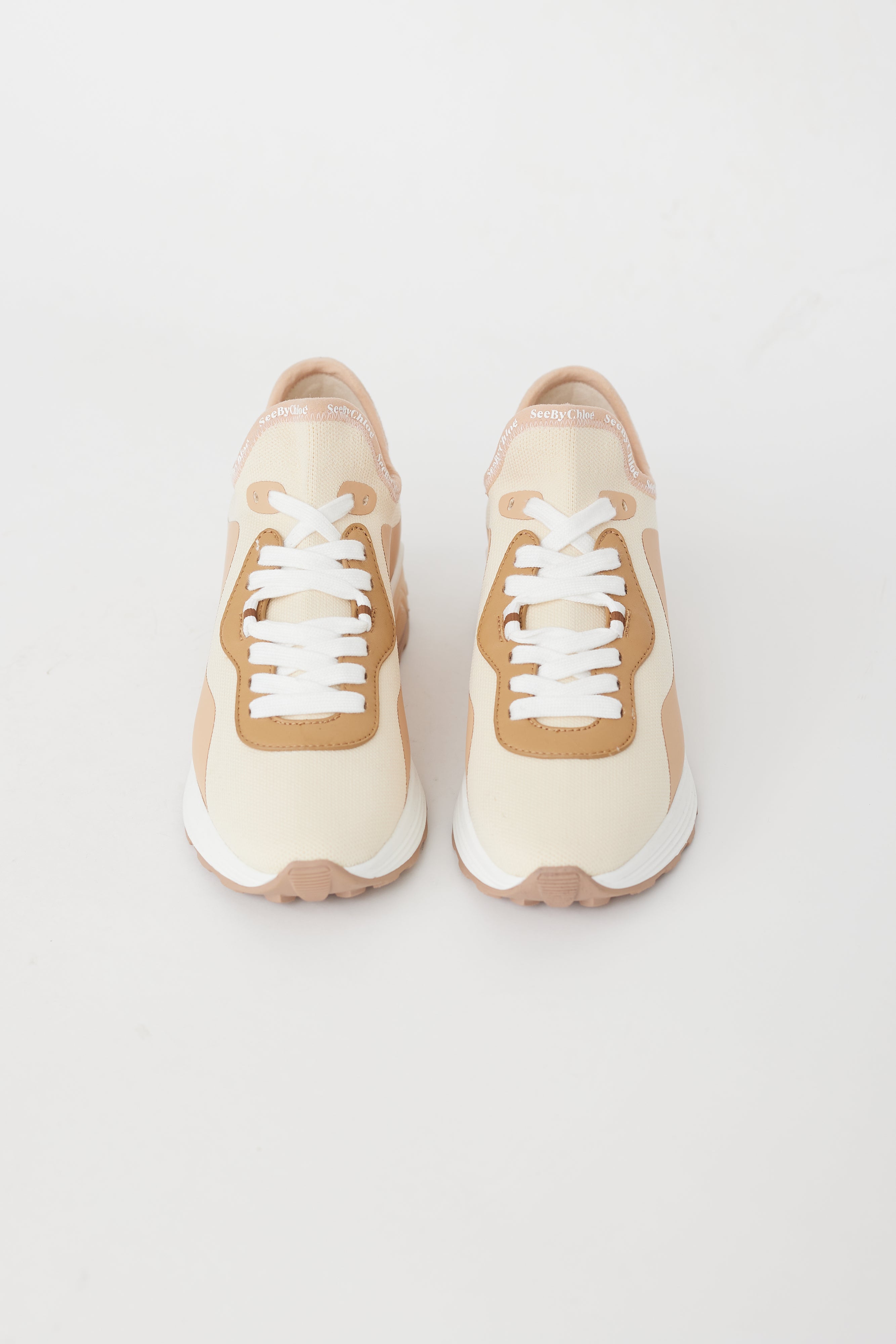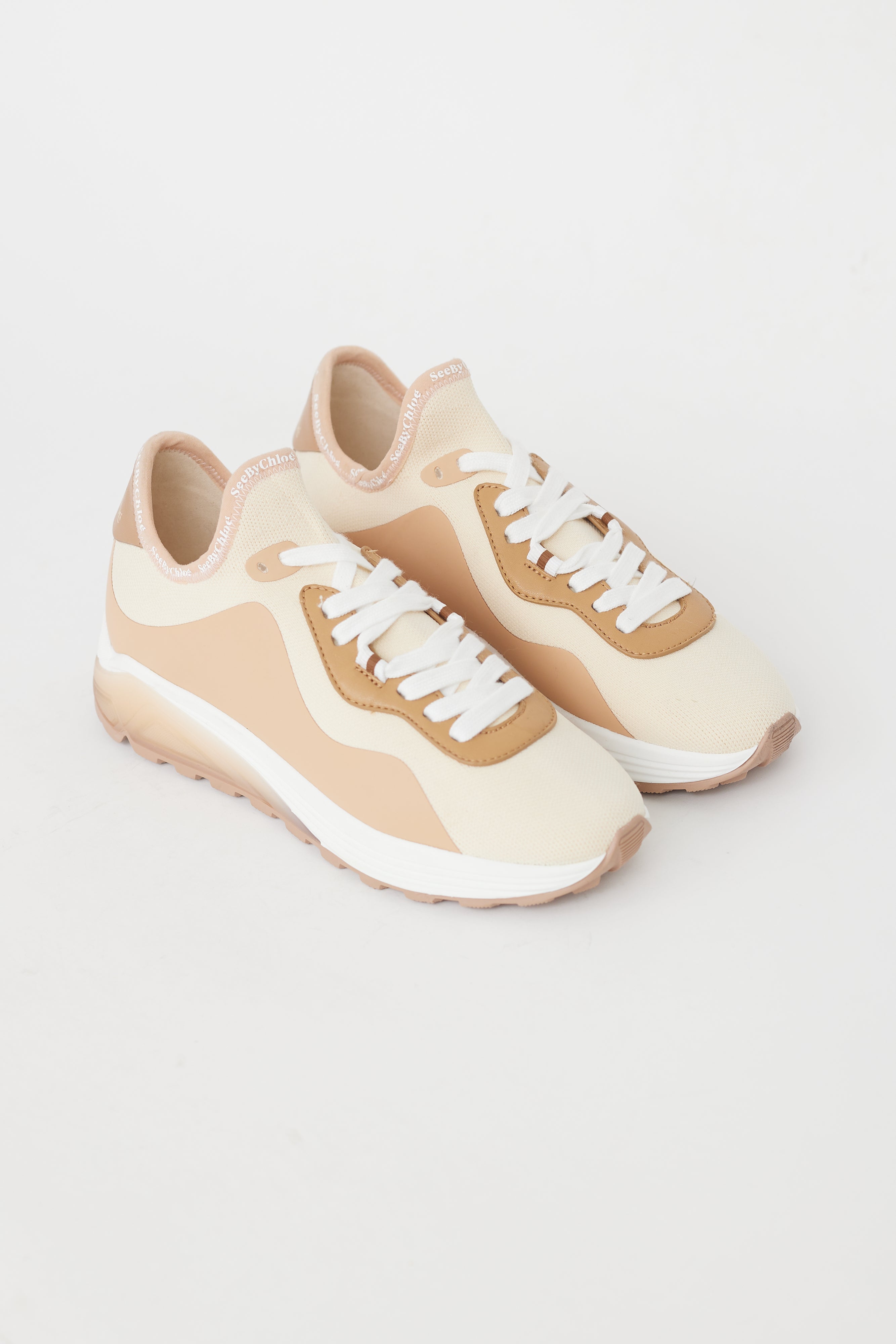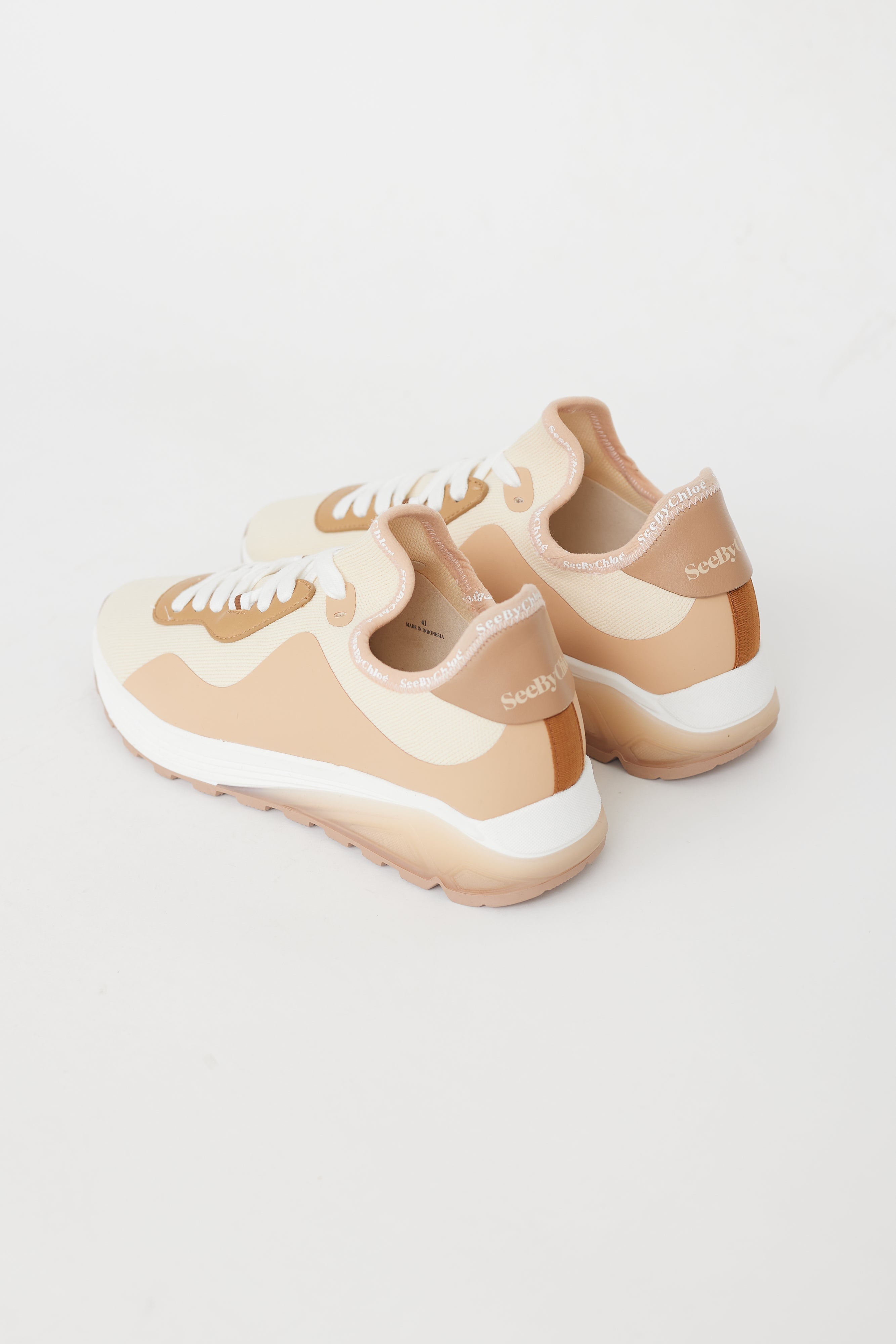Pre-owned See By Chloé brown and cream Brett sneakers featuring rounded toe, lace up front with brown leather panel, cream mesh knit upper, logo trim at opening, brown rubberized panel at sides, logo at heel counter, and white rubber midsole.