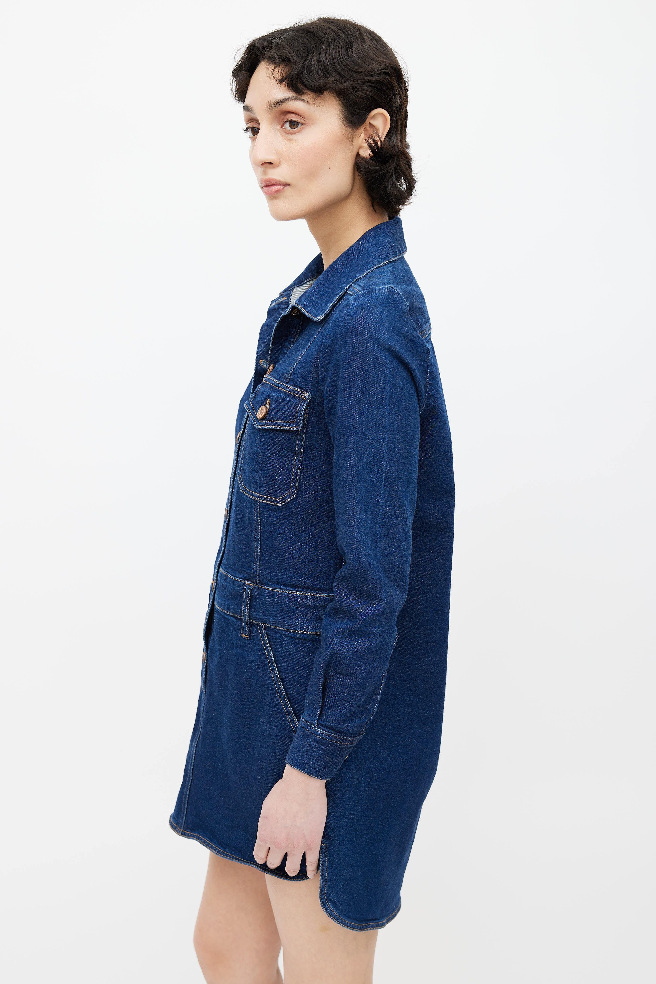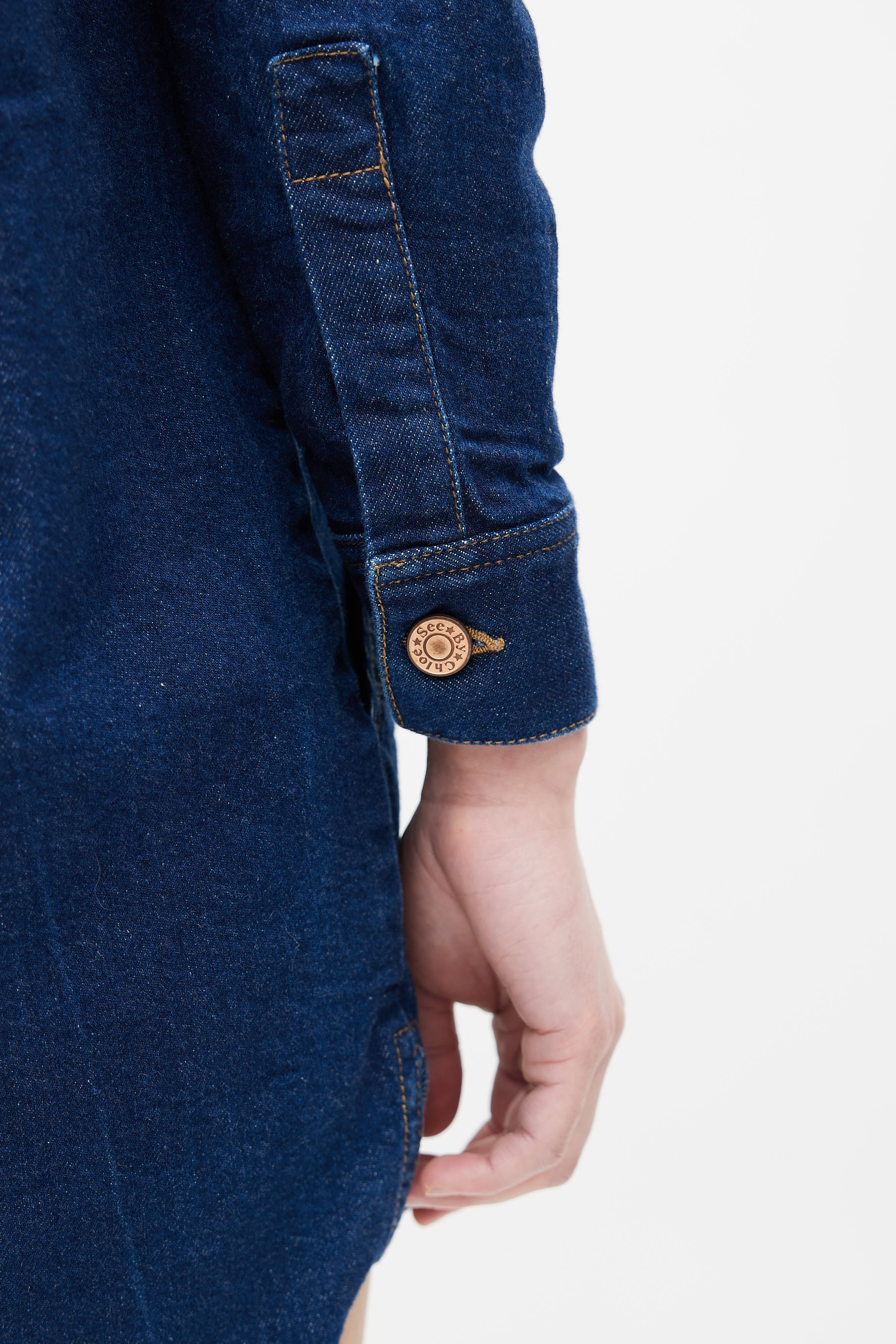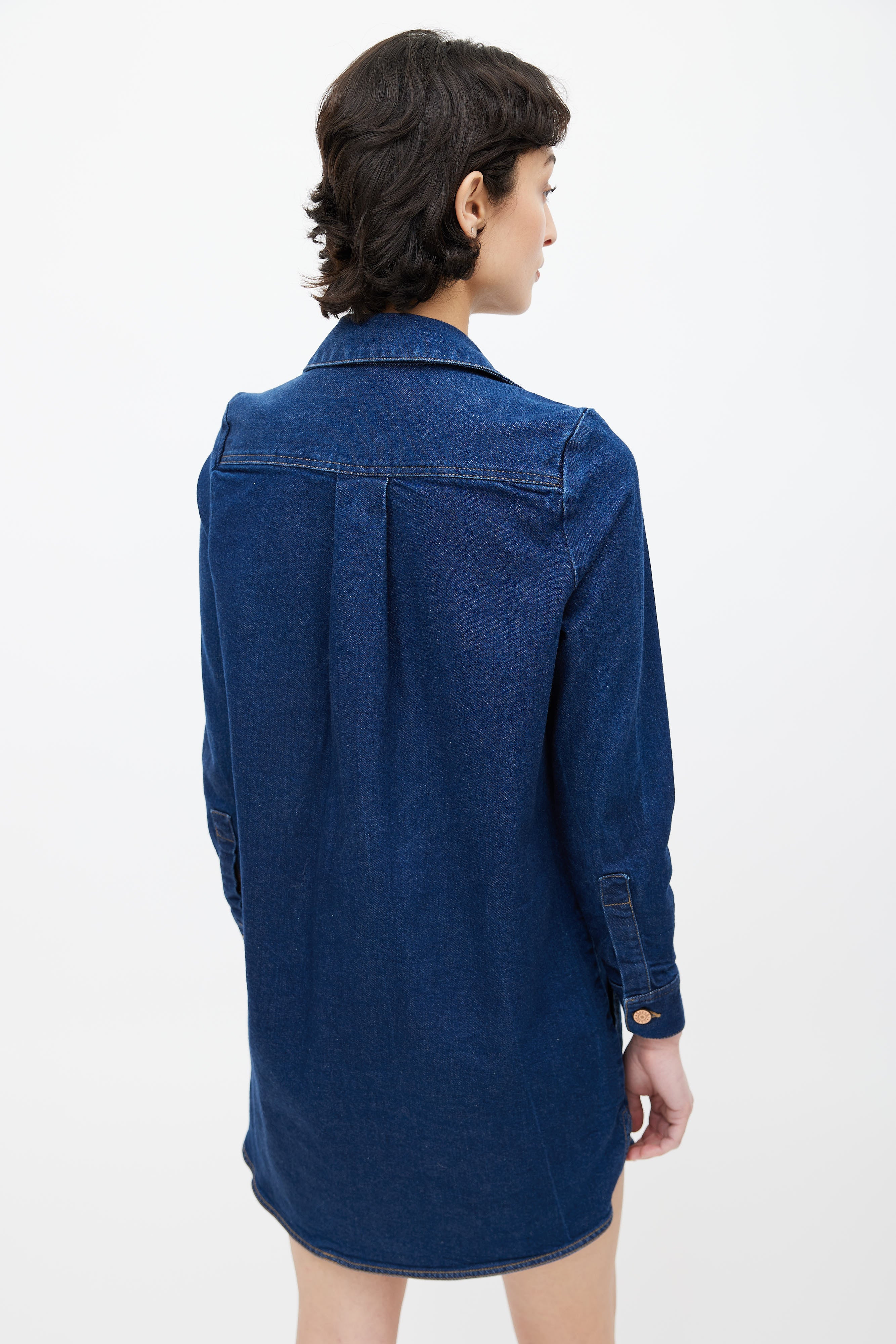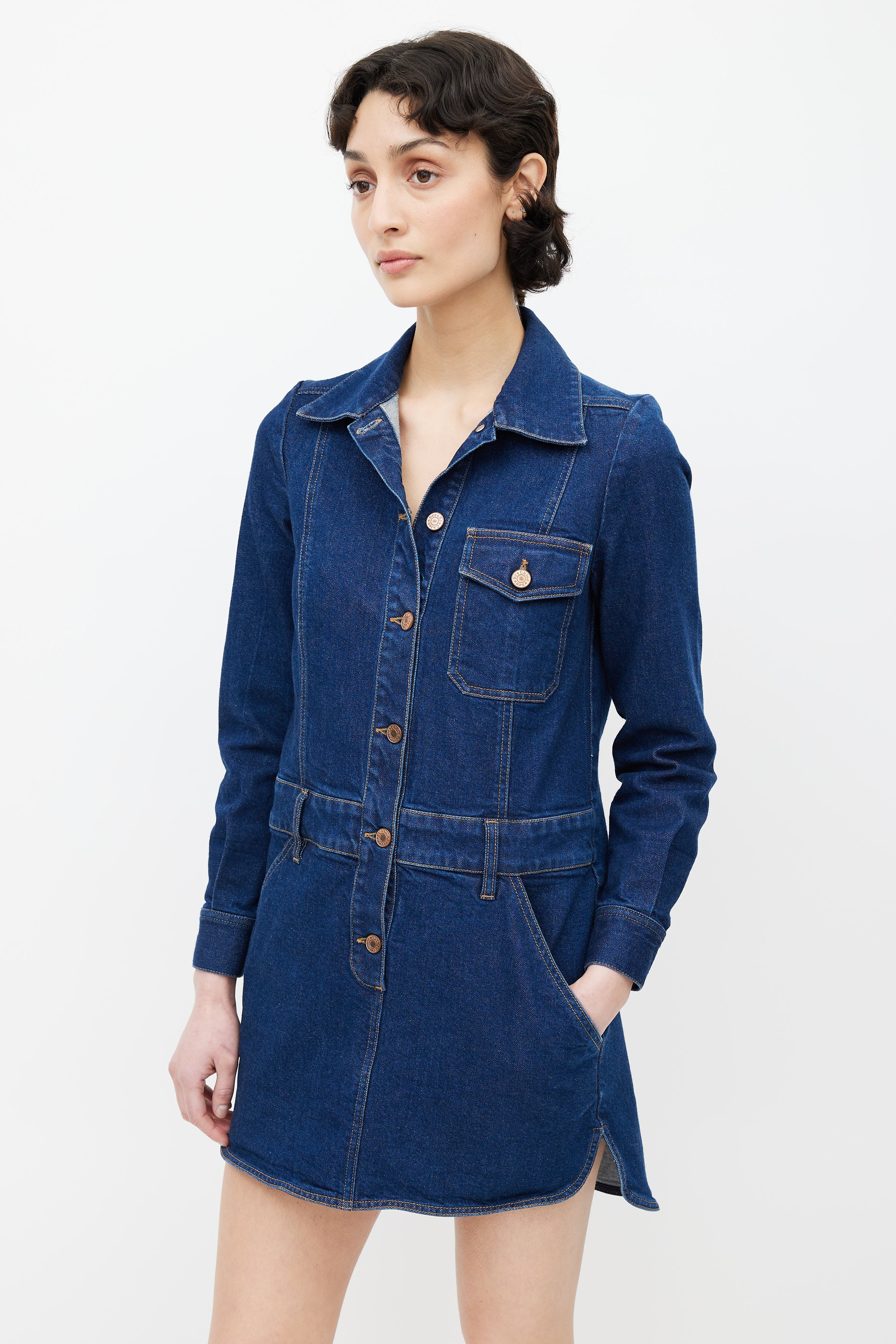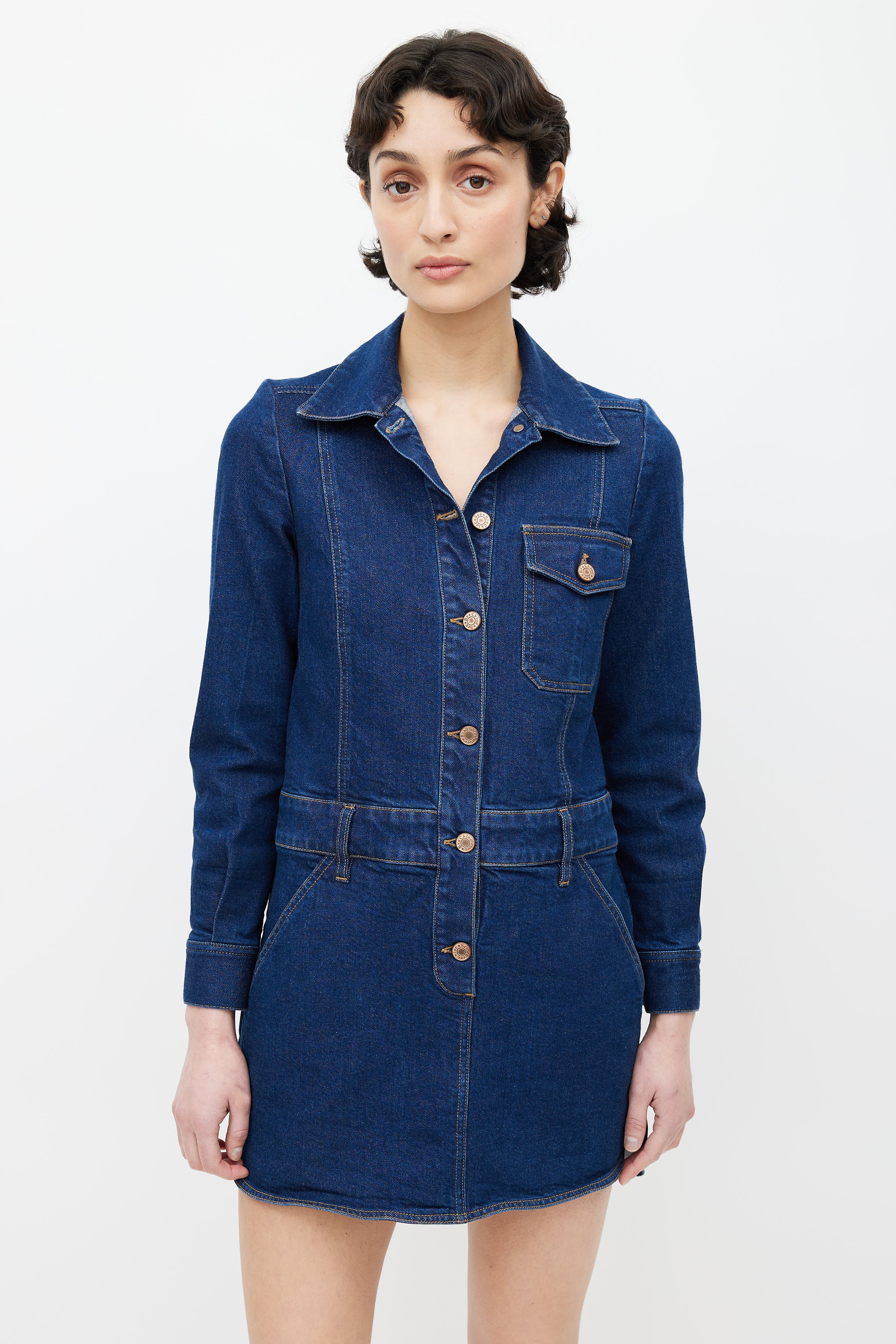 Pre-owned See by Chloé dark blue denim wash shirt dress featuring classic collar, button up front, contrast stitch, buttoned chest pocket, two slash pockets at hips, buttoned cuffs, and belt loops.