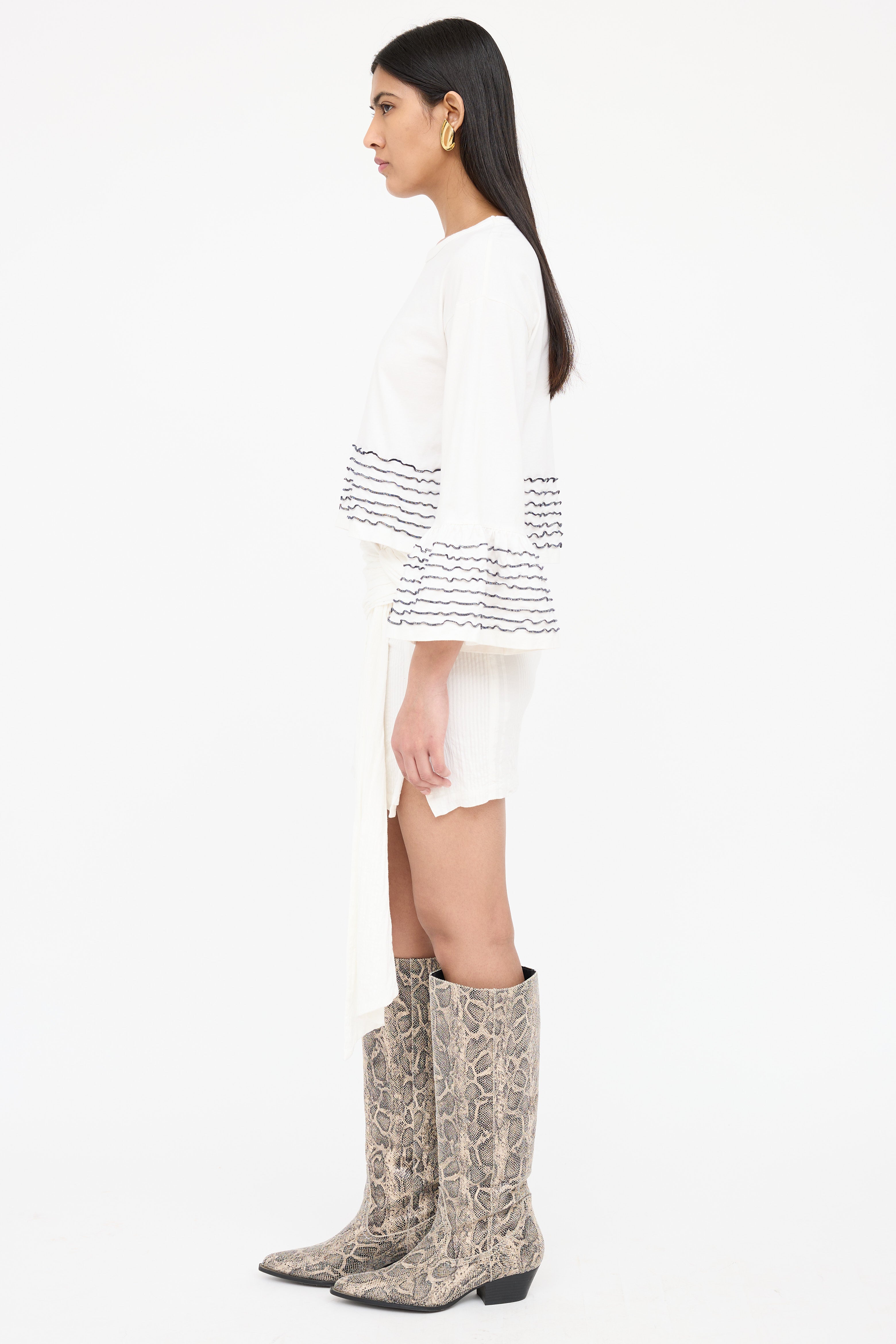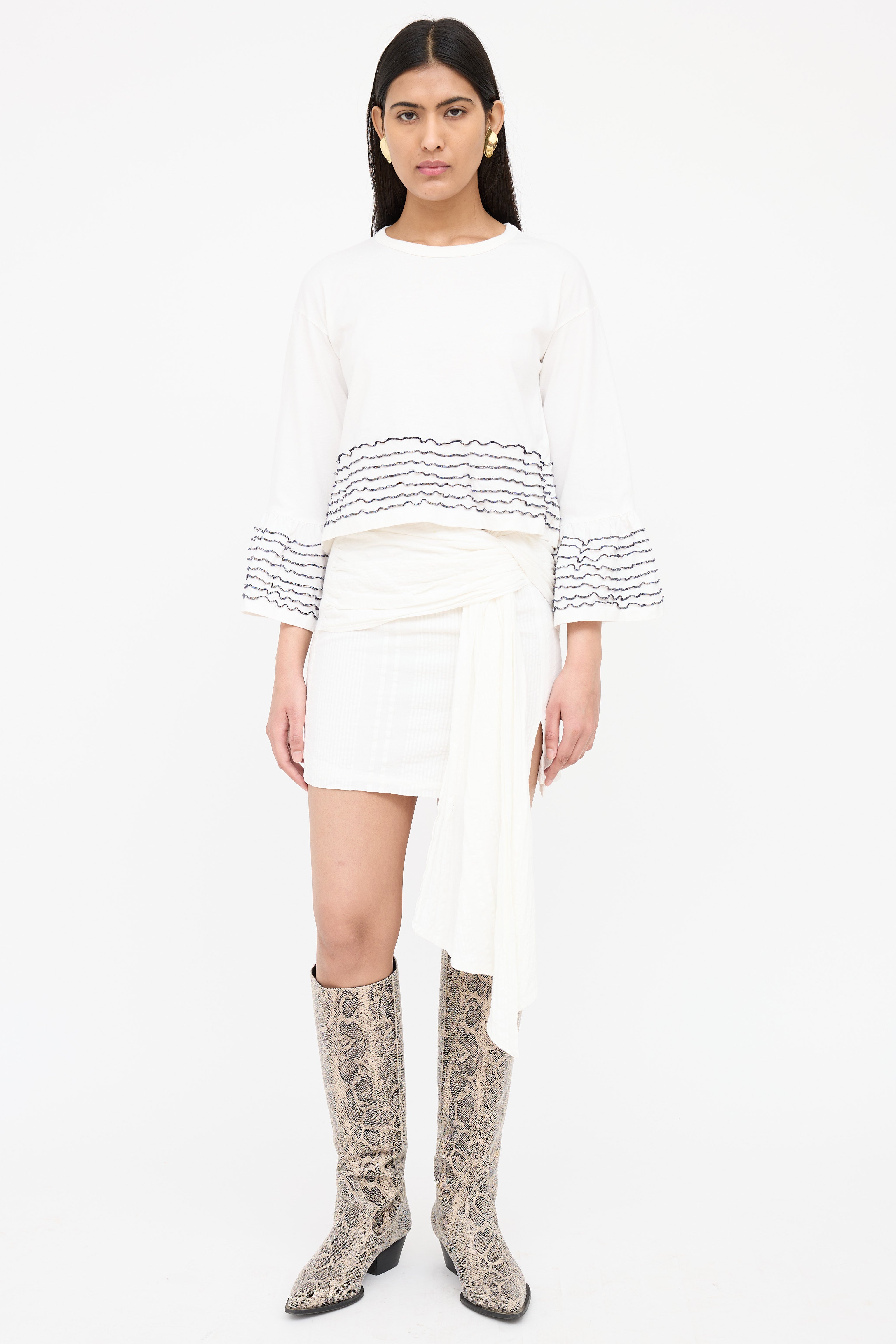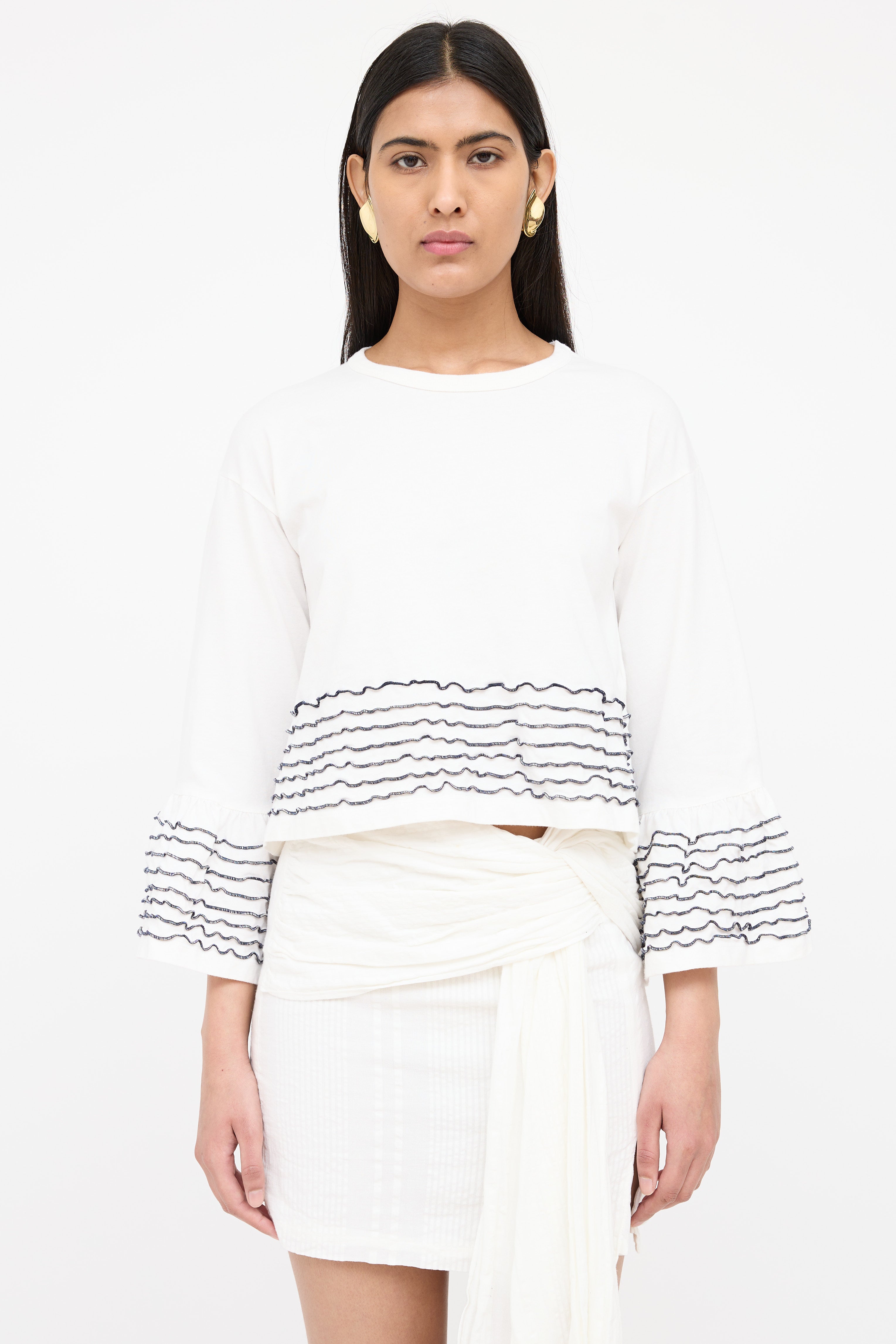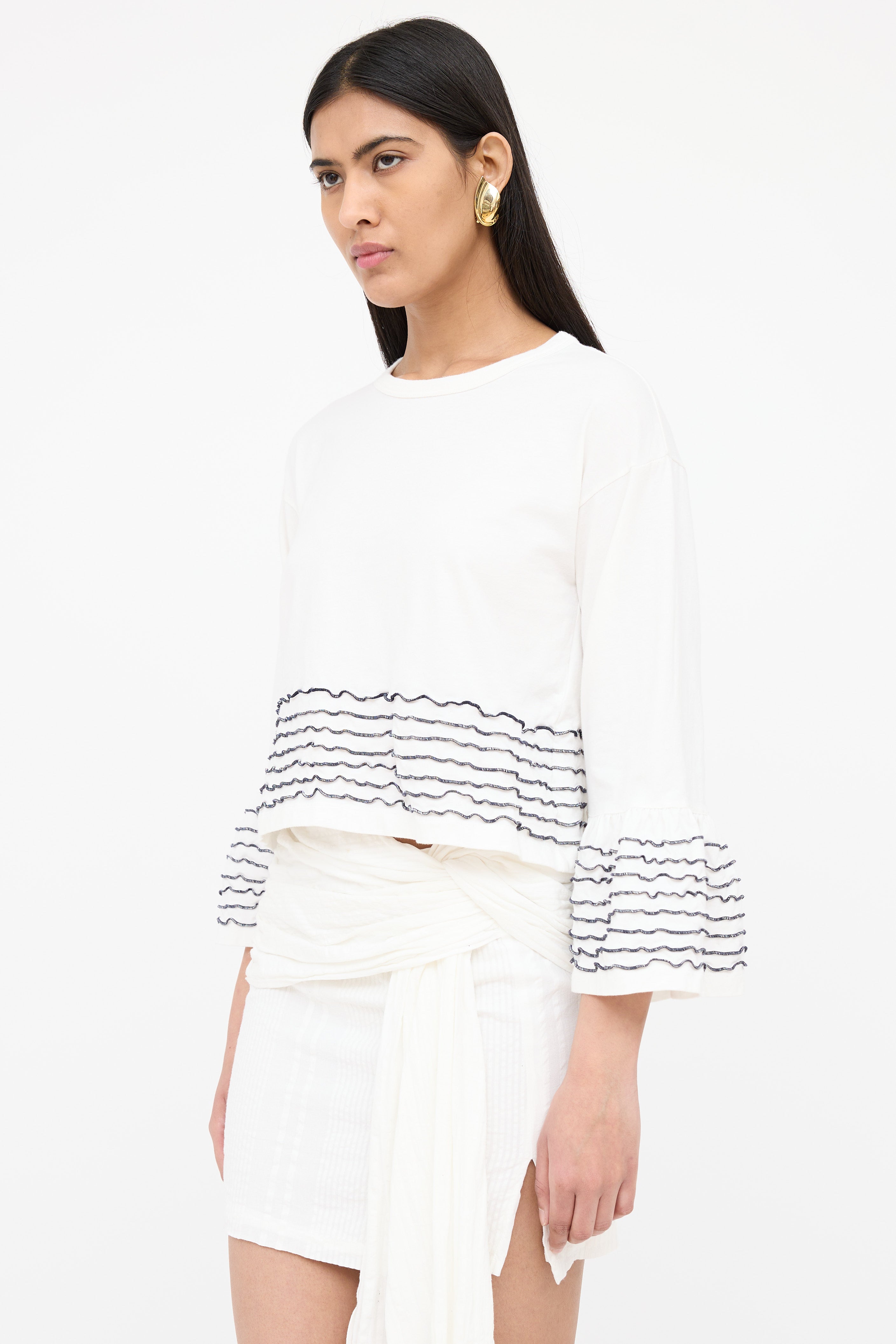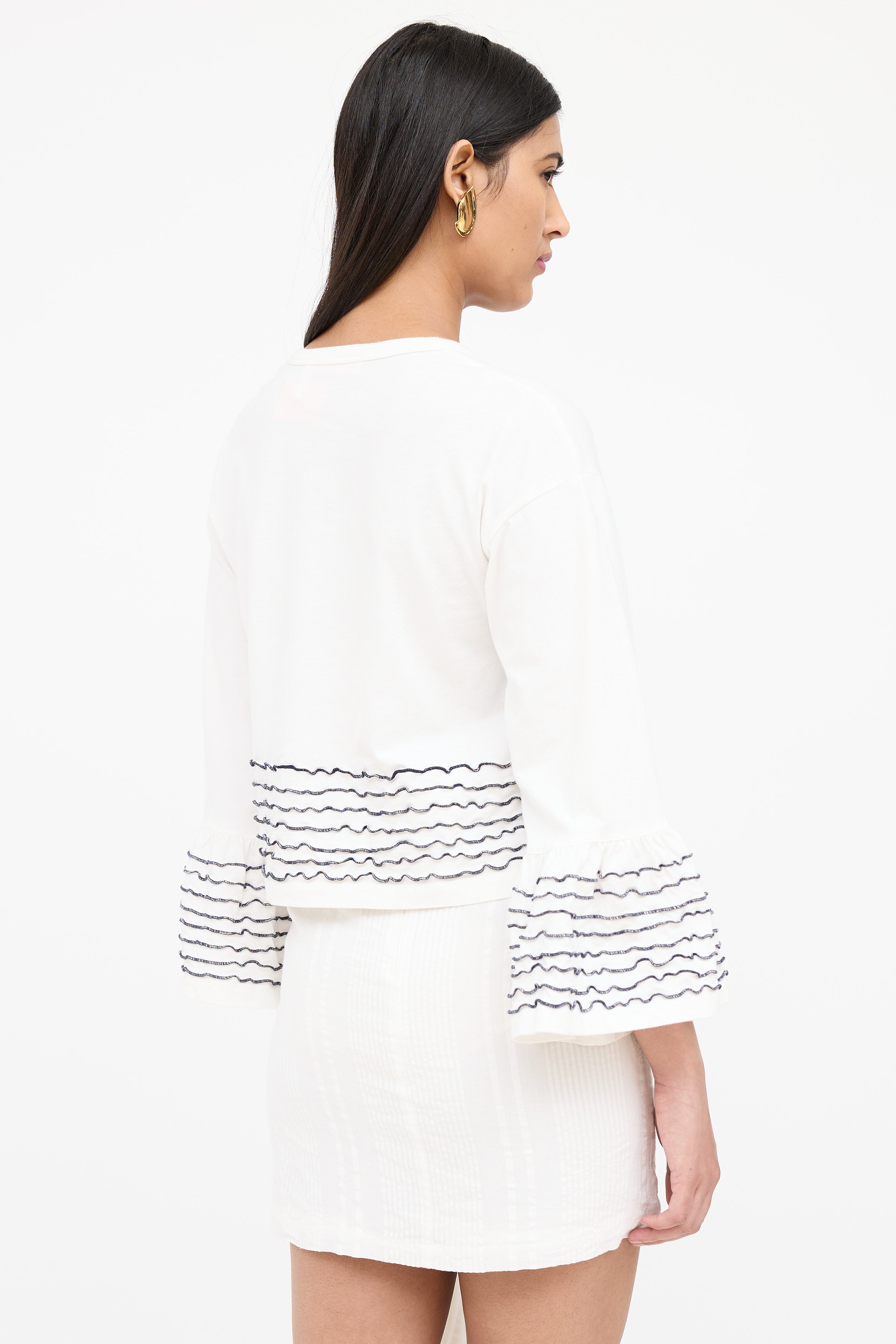 Pre-owned See By Chloé white top featuring a round neckline, 3/4 length bell sleeves, cropped fit and black ruffled trims at cuffs and hem.