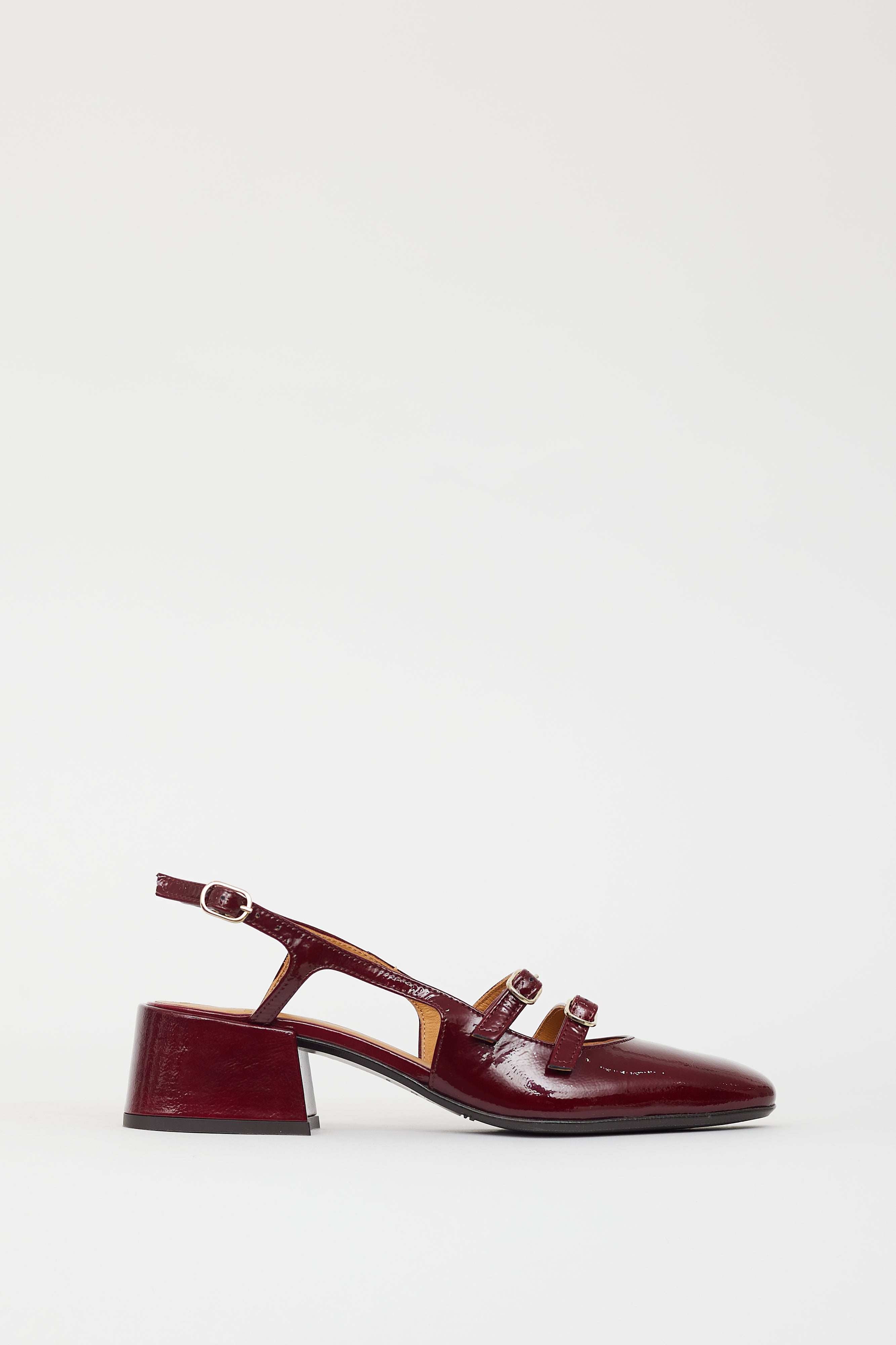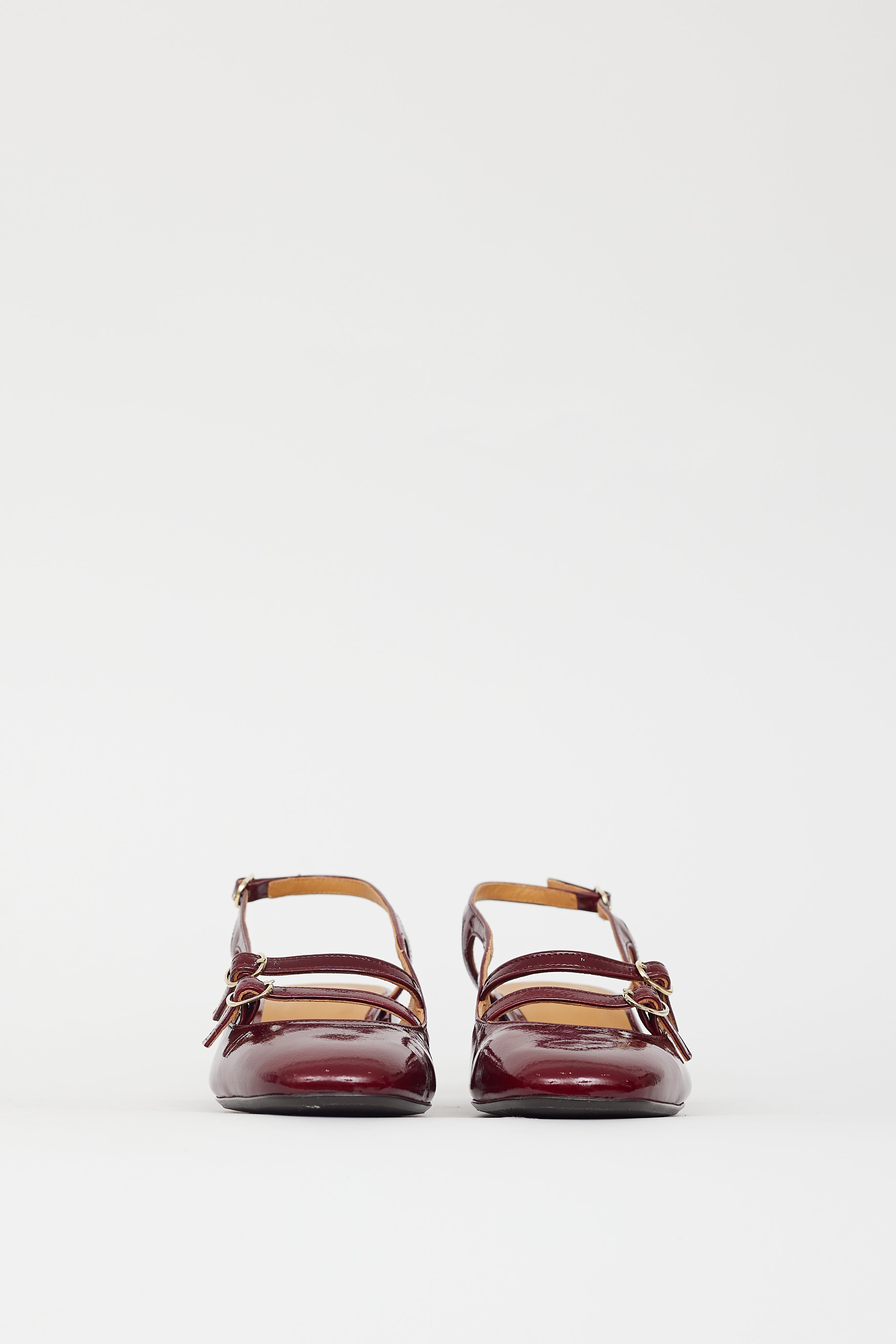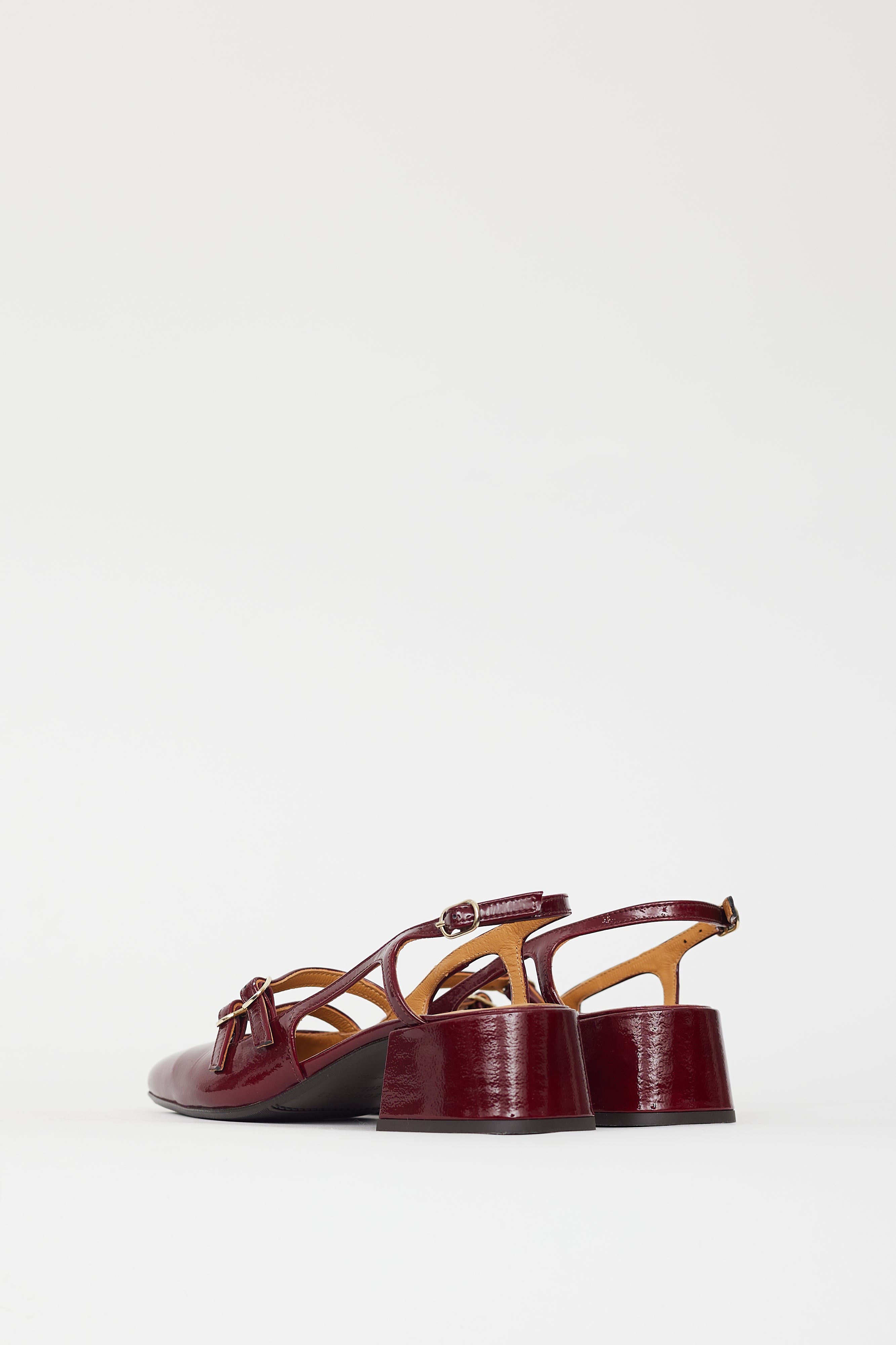 Pre-owned Sézane burgundy patent leather Paula Babies pumps featuring rounded square toe, dual straps at toe, ankle strap with buckle fastening, leather insole, and covered block heel.