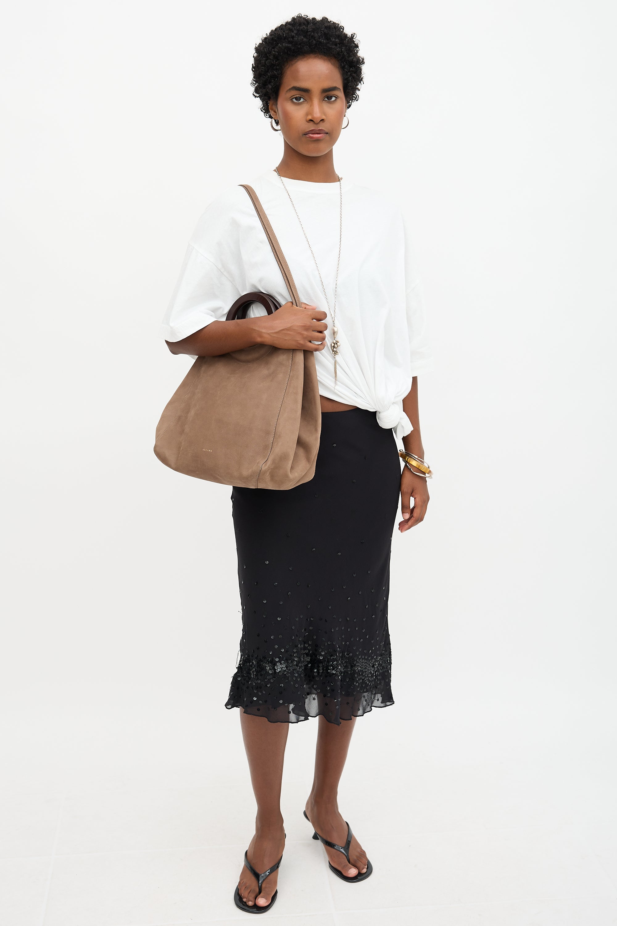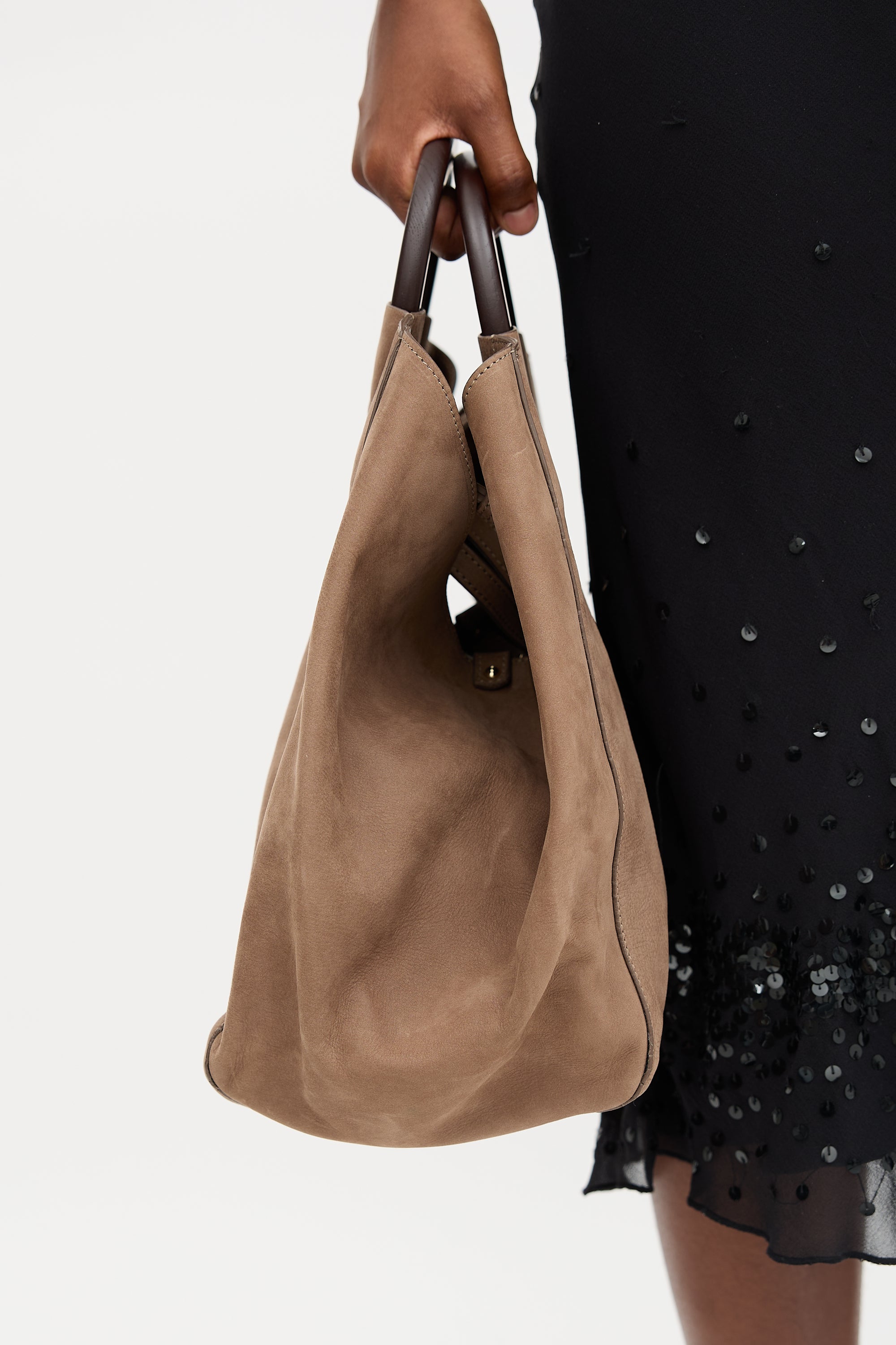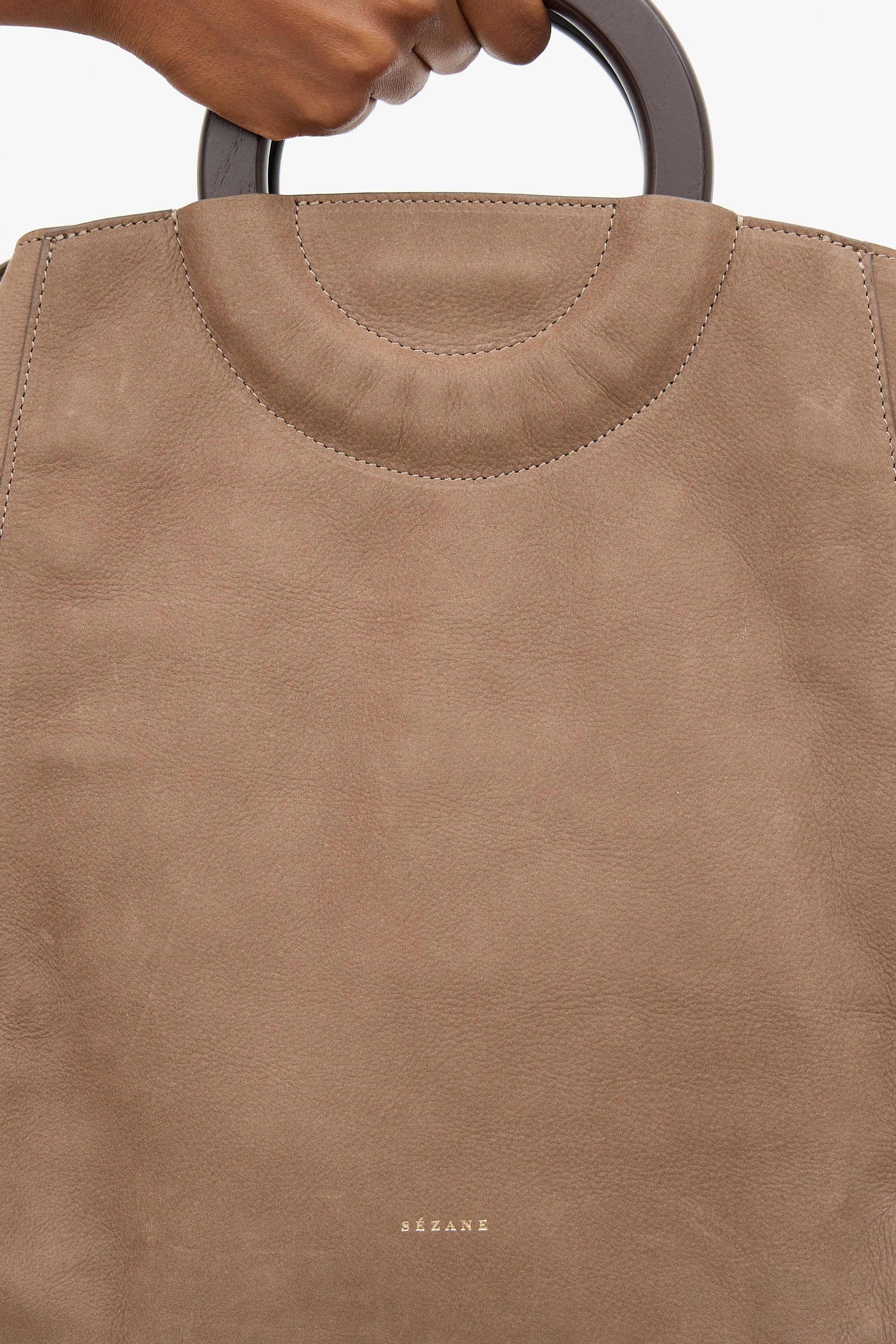 Pre-owned Sézane taupe leather Paolo tote bag featuring gold tone stamped logo at bottom front, dual ring top handles, dual removable shoulder straps, magnetic top closure, collapsible sides with snap button closure, and one lined main compartment with one zip pocket and two slip pockets.