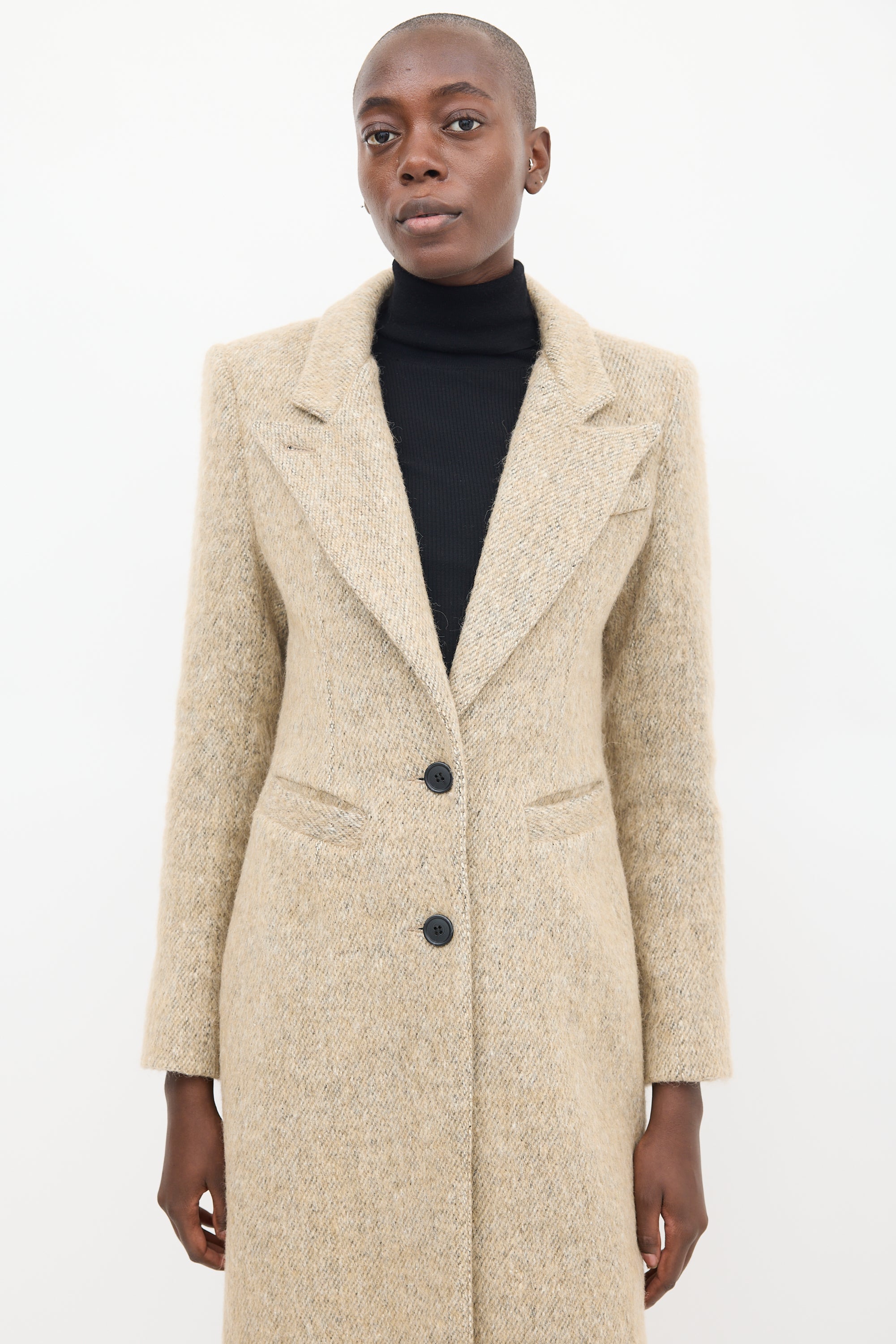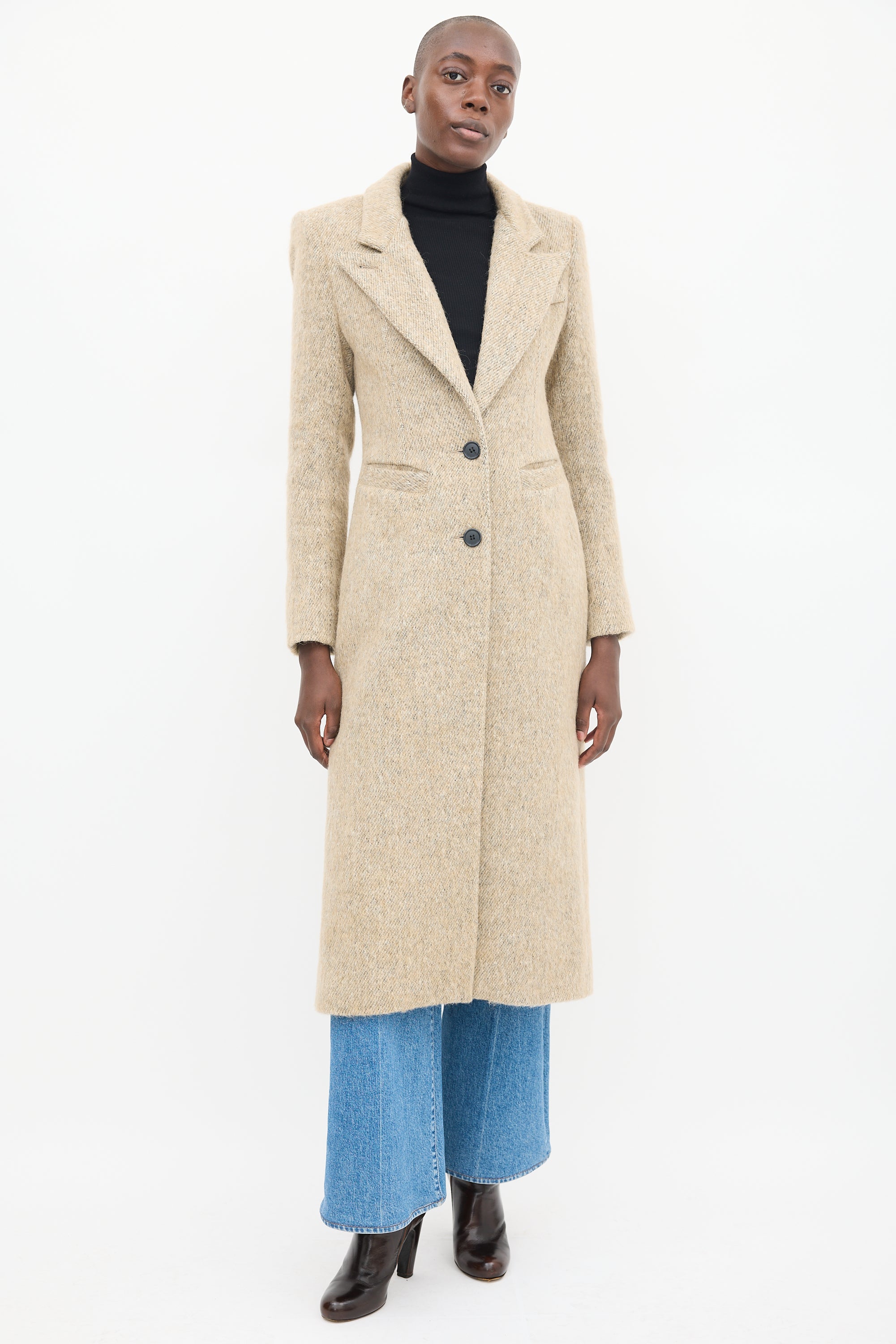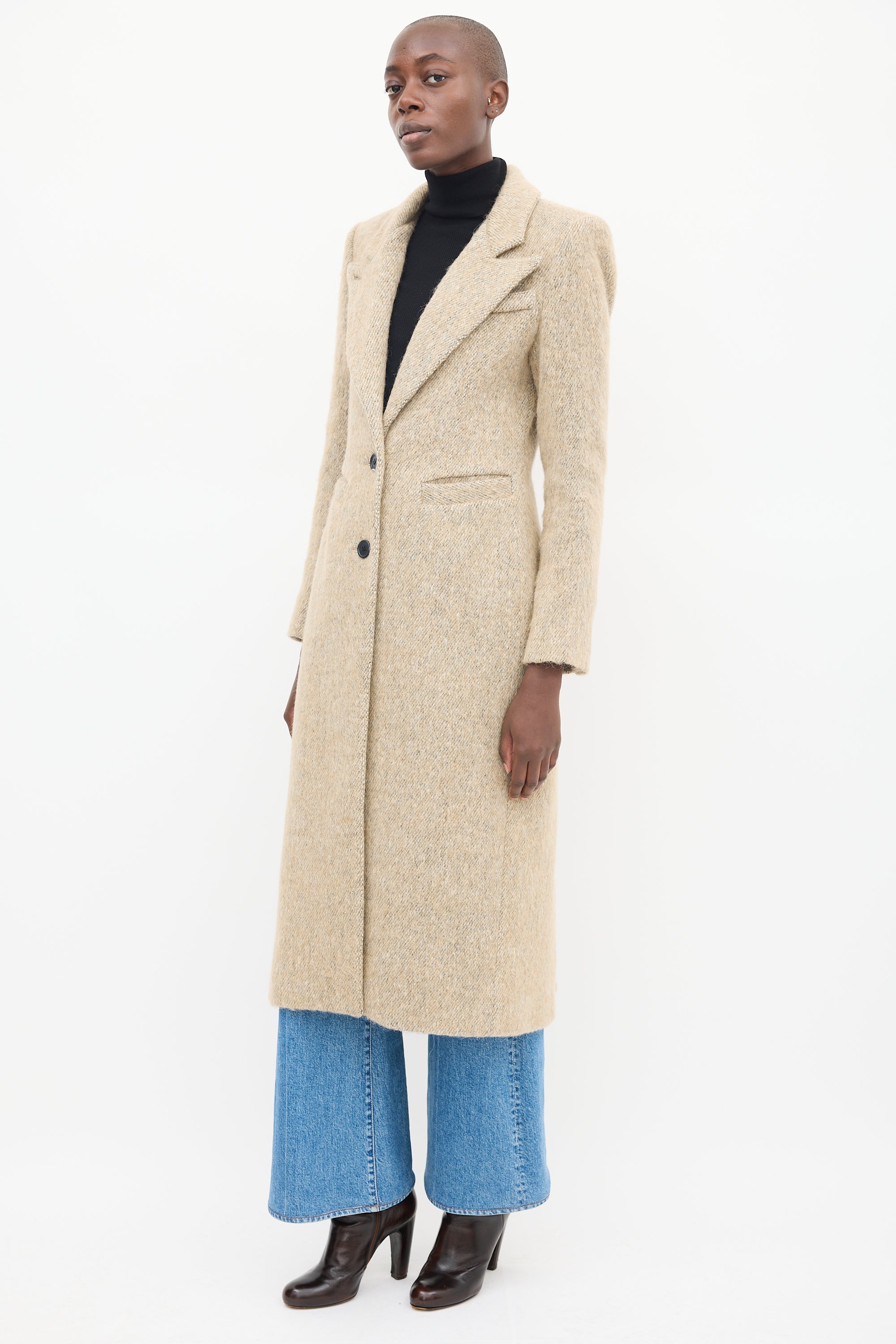 Pre-owned Smythe beige wool coat featuring a peak lapel, long sleeves with buttoned cuffs, one welt pocket at chest, two slip pockets at hip, and button up closure. Lined.
