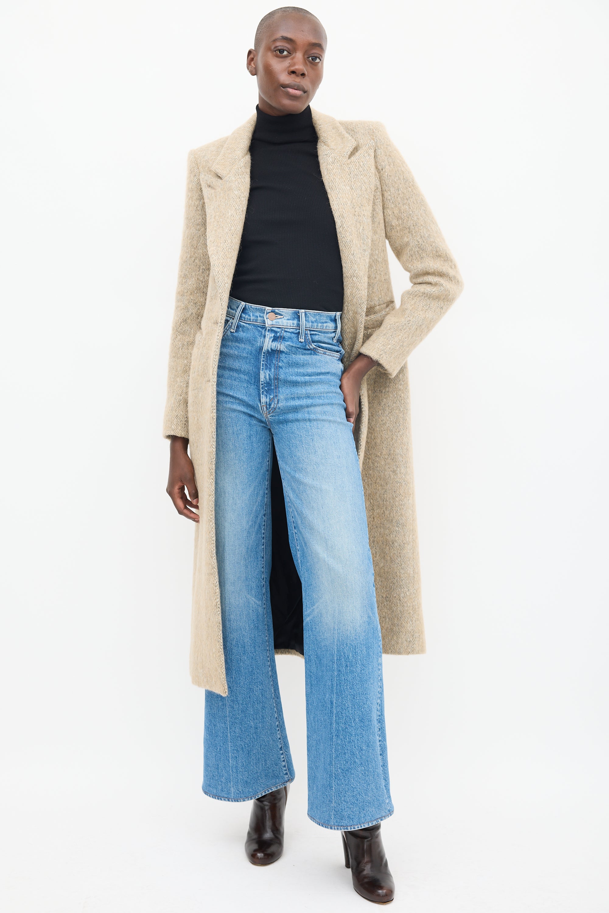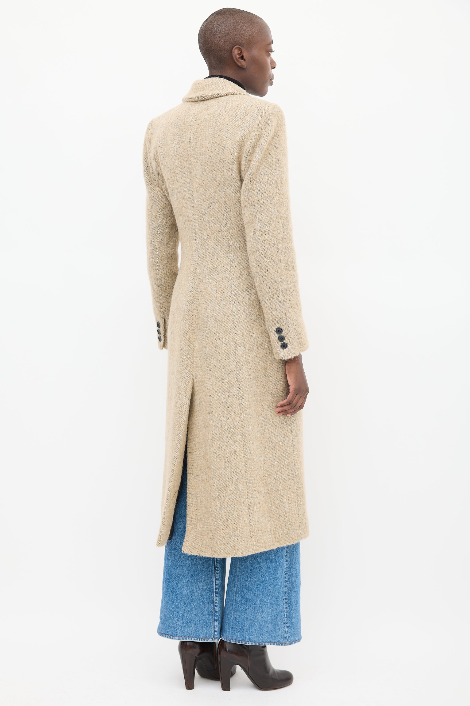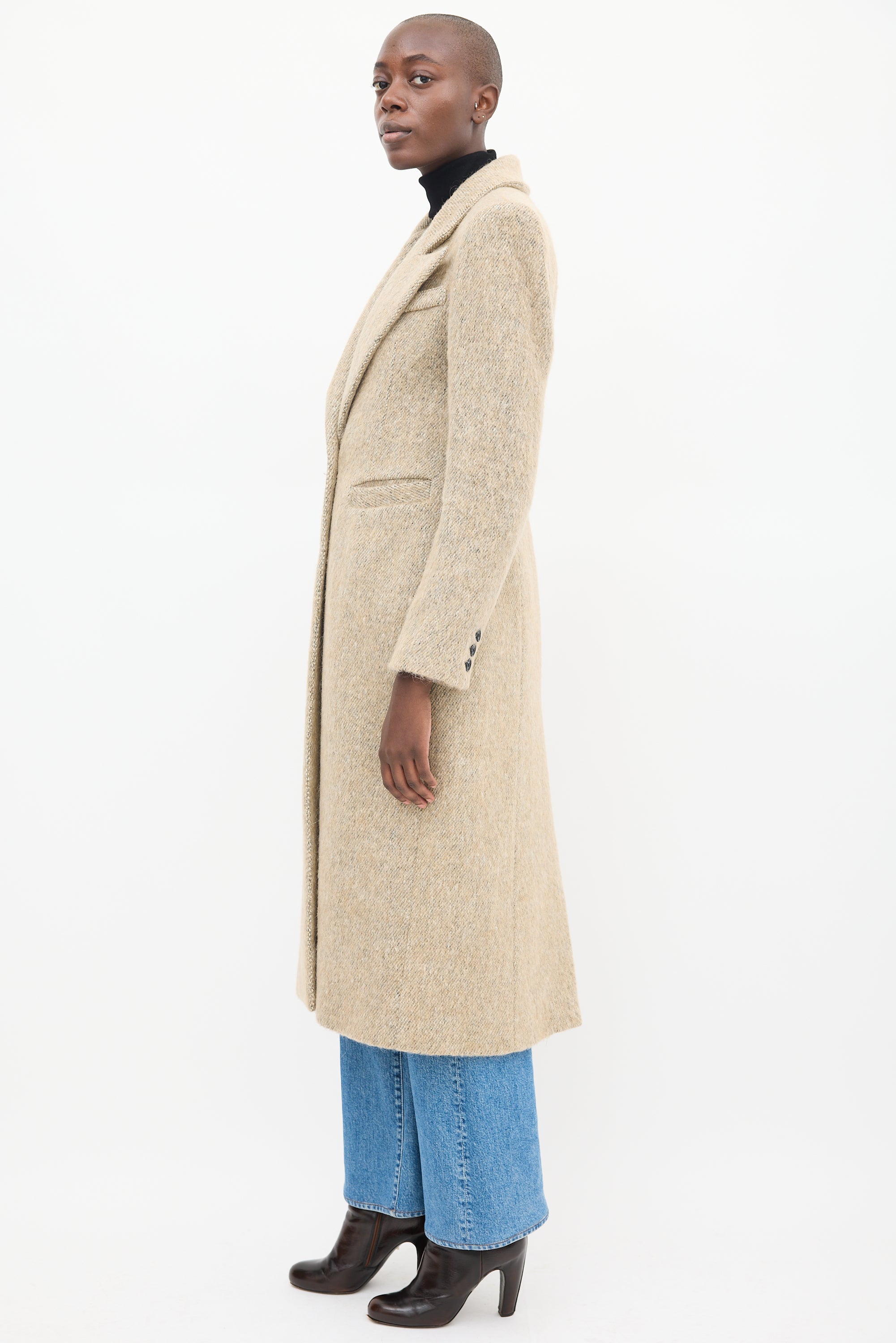 Pre-owned Smythe beige wool coat featuring a peak lapel, long sleeves with buttoned cuffs, one welt pocket at chest, two slip pockets at hip, and button up closure. Lined.