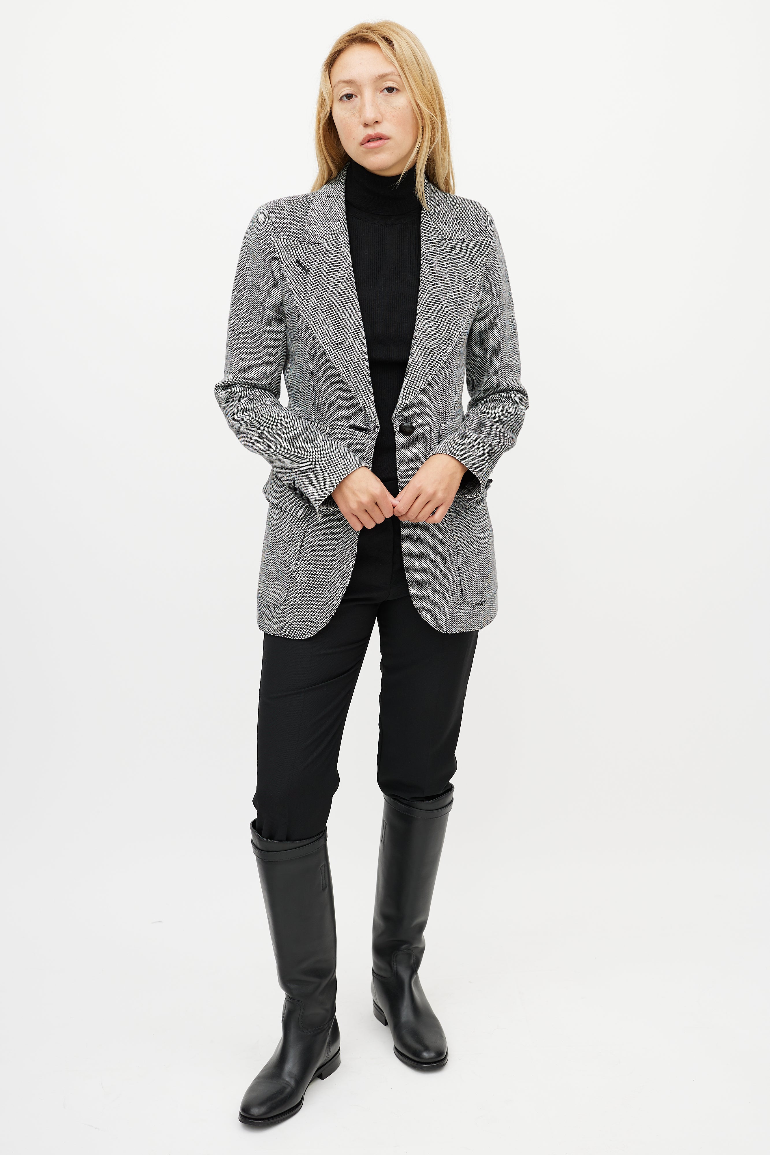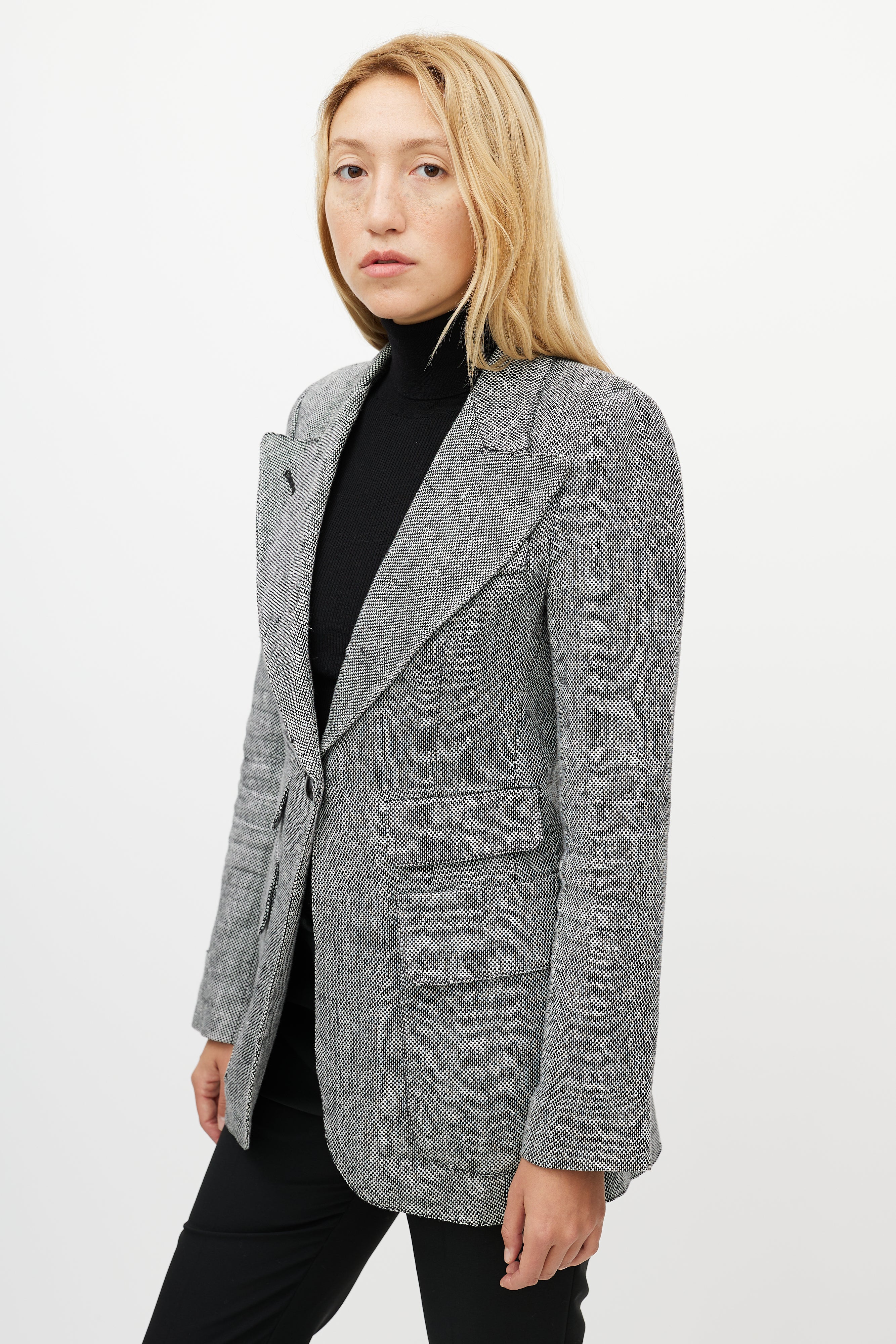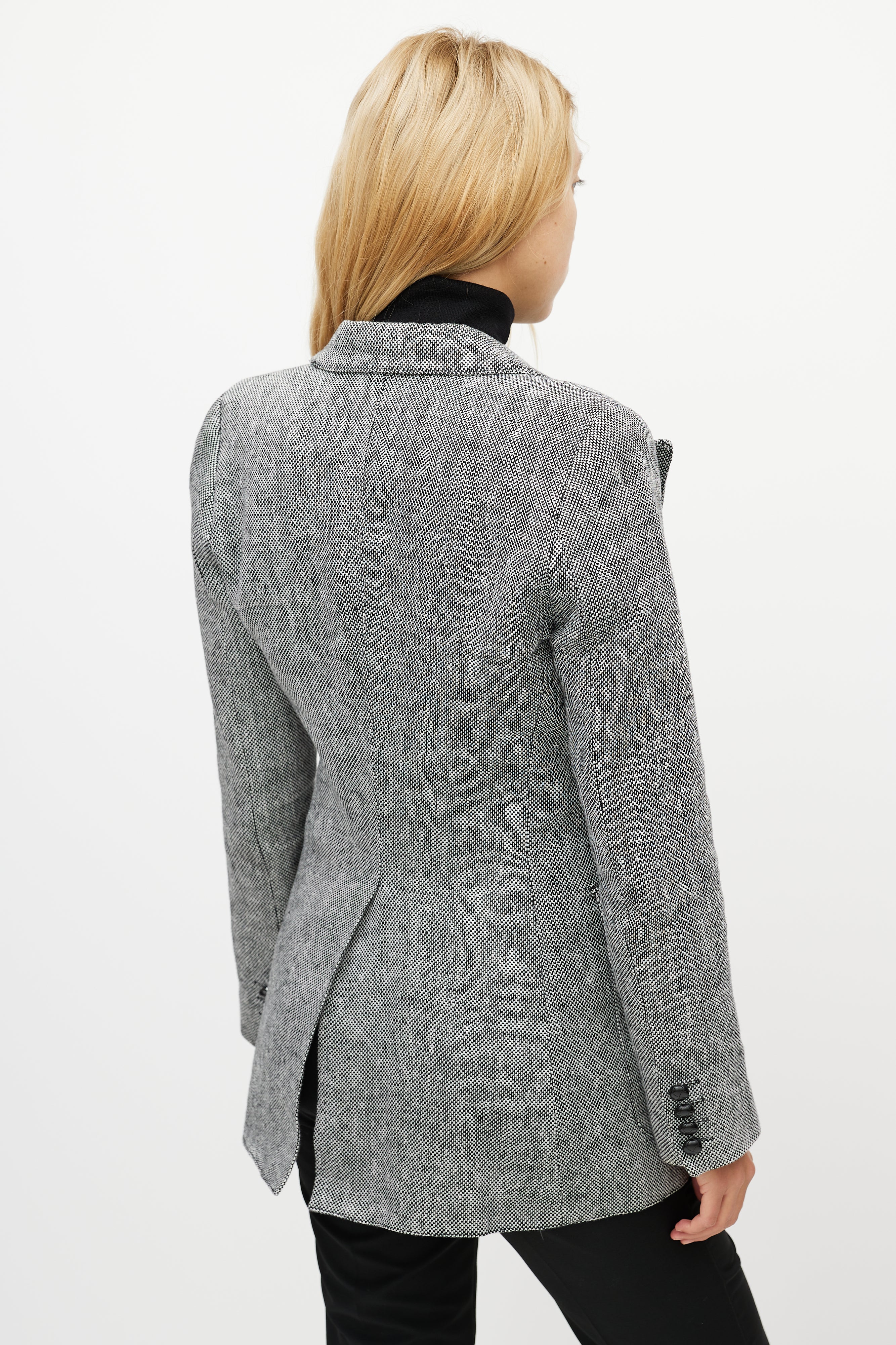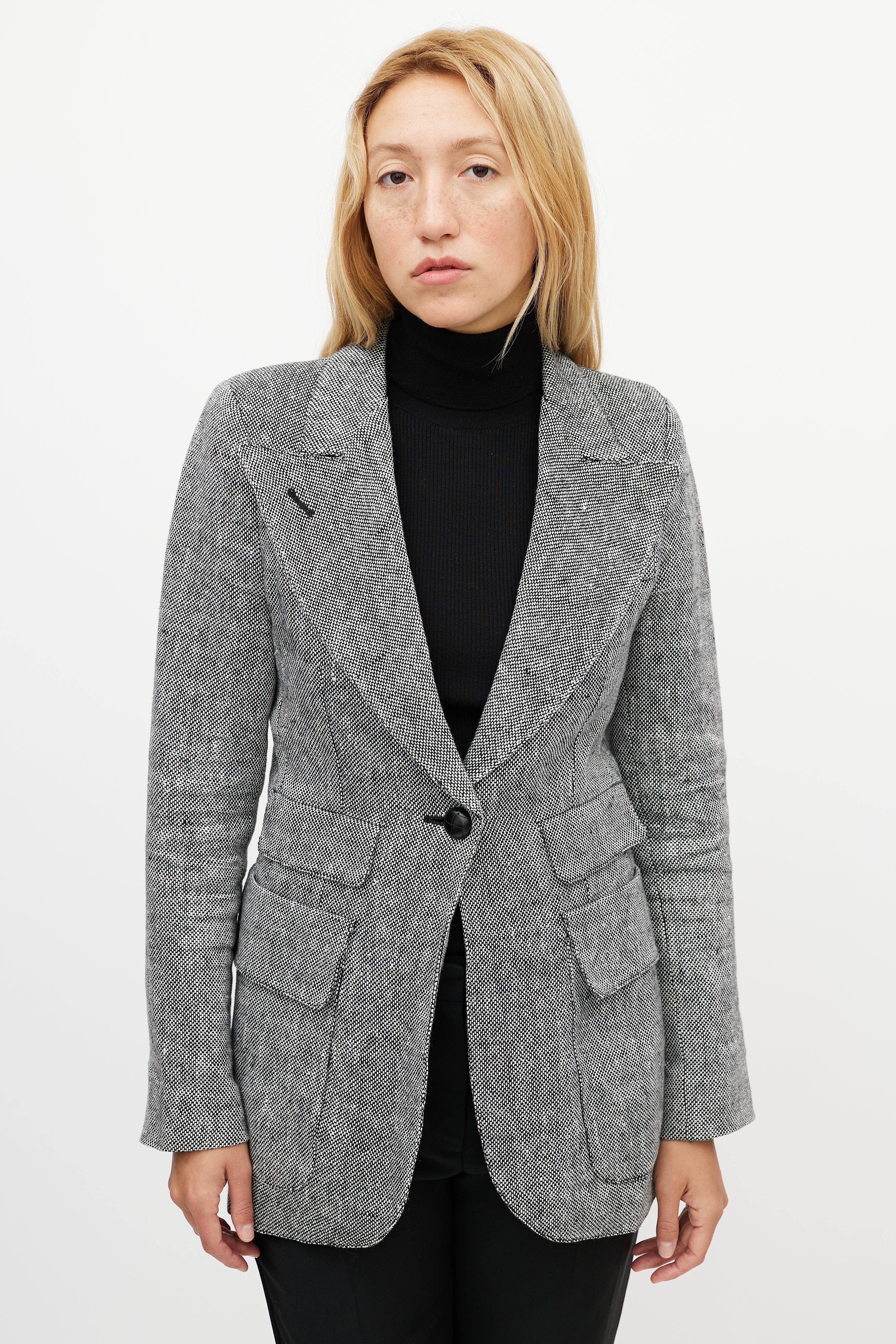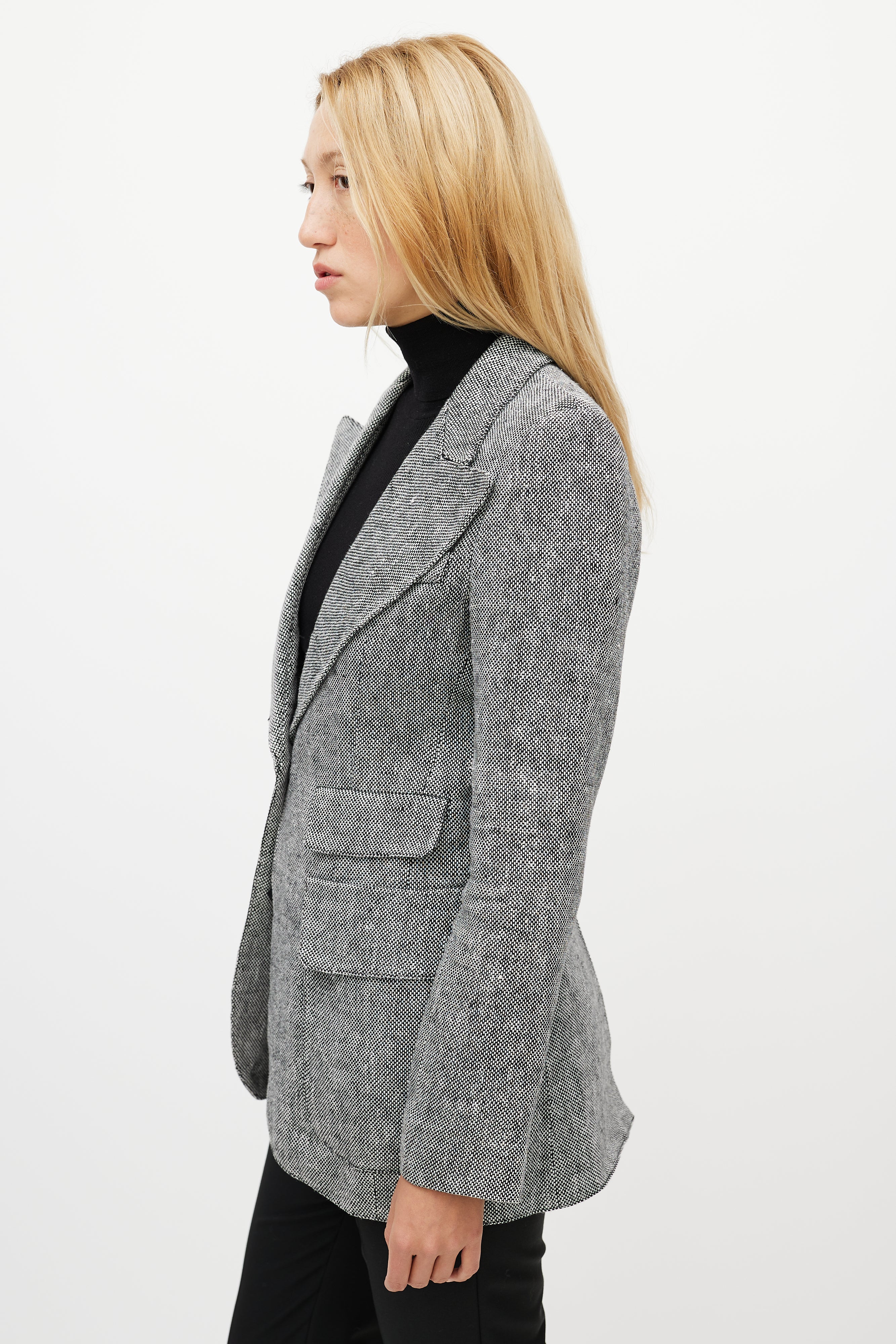 Pre-owned Smythe grey linen Birkin blazer featuring exaggerated peak lapel, single button front, decorative welt at left chest, two front double flap pockets, back vent, and buttoned cuffs. Lined.