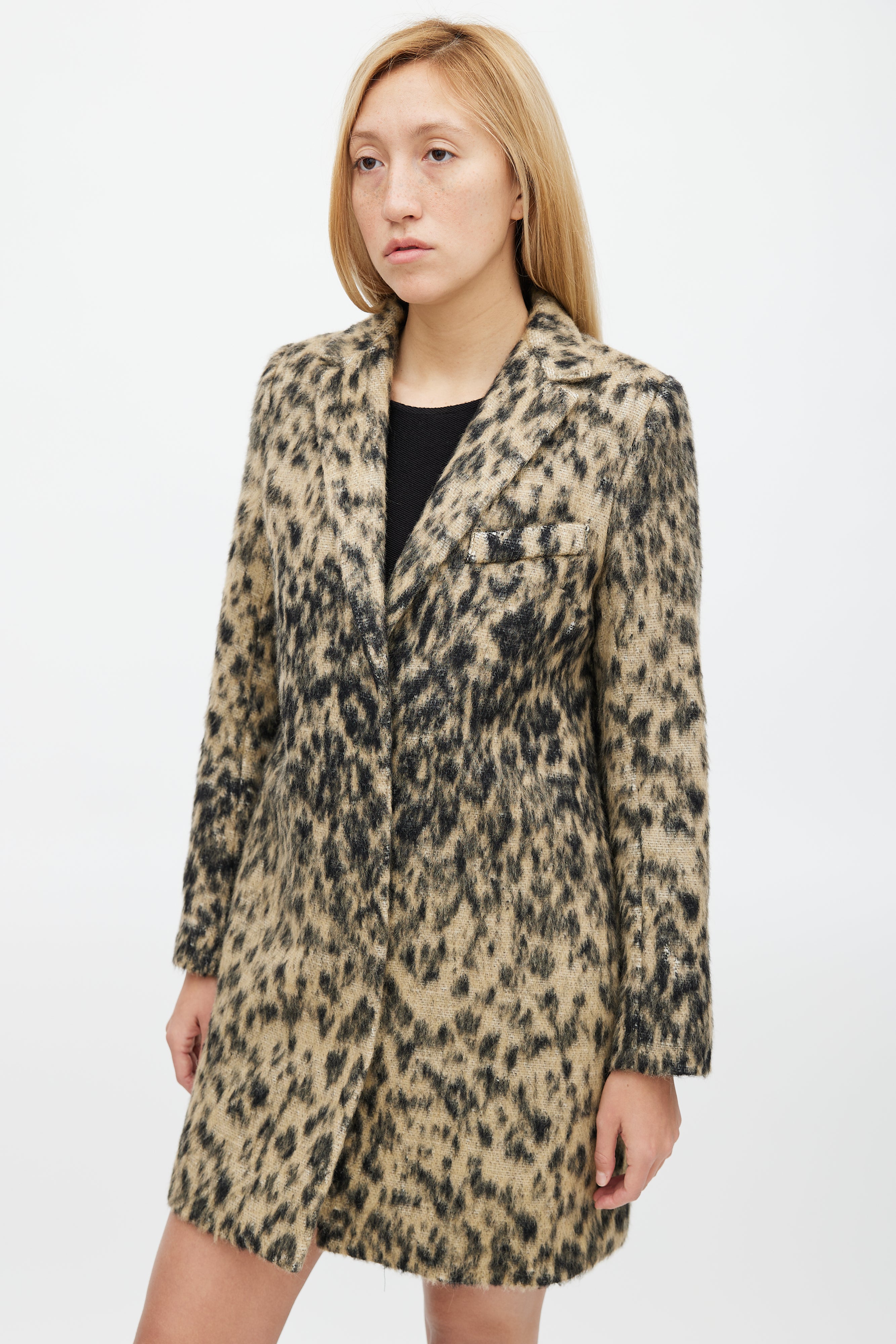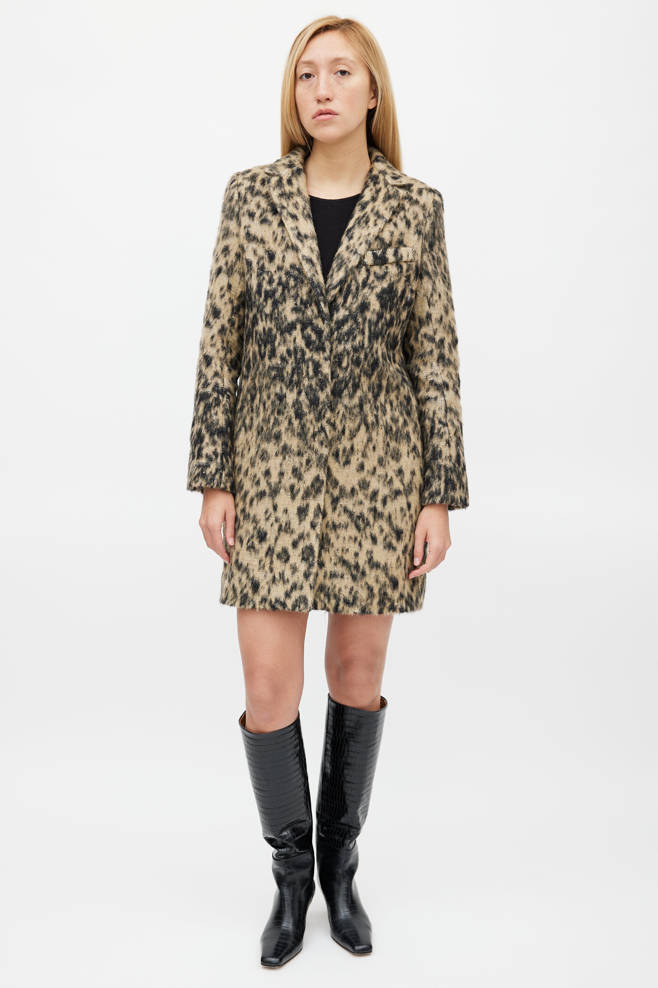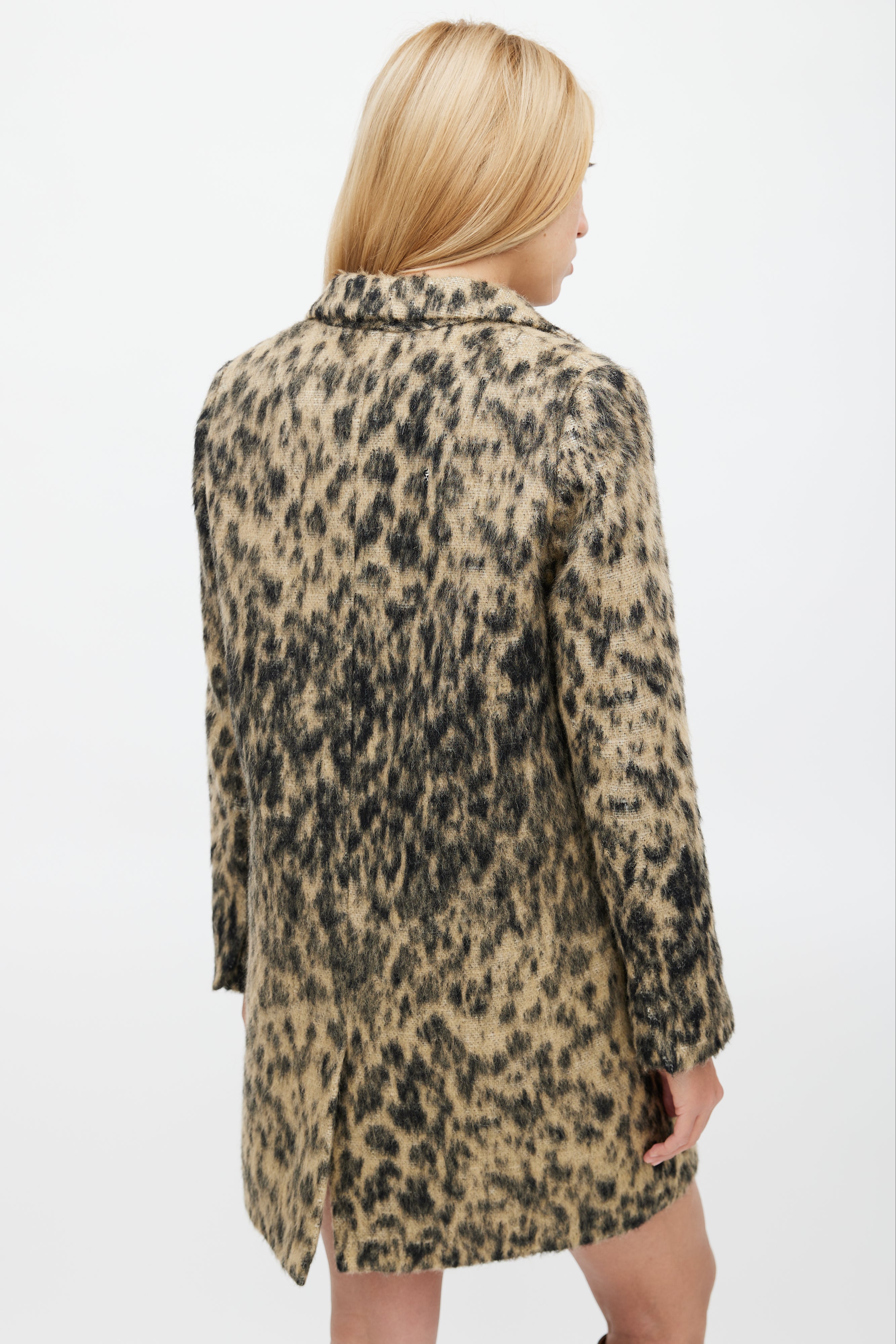 Pre-owned Smythe black and beige Lab coat featuring leopard print, concealed button up front, spread collar, one welt pocket at chest, two concealed hip pockets, and back vent. Lined.