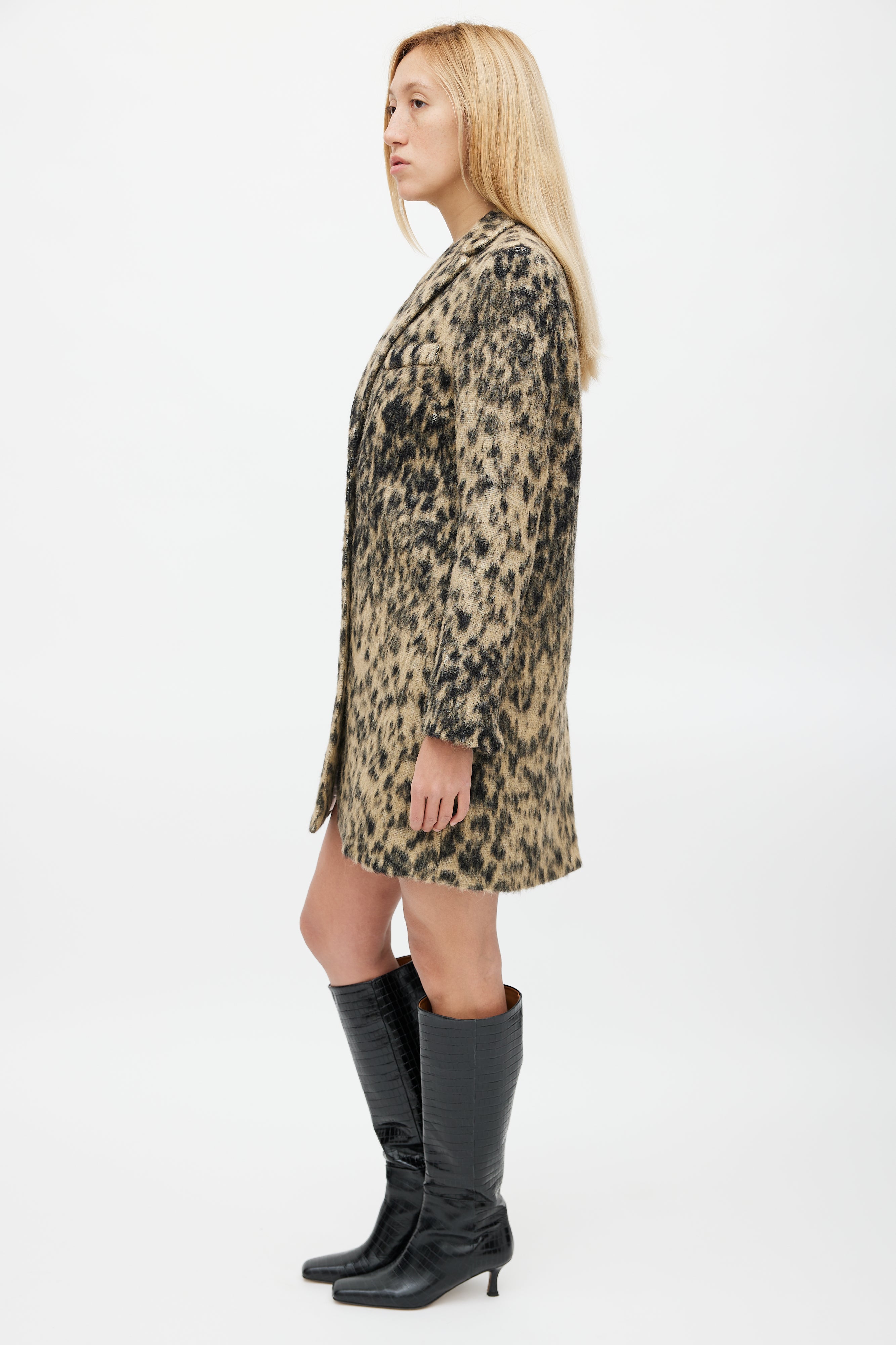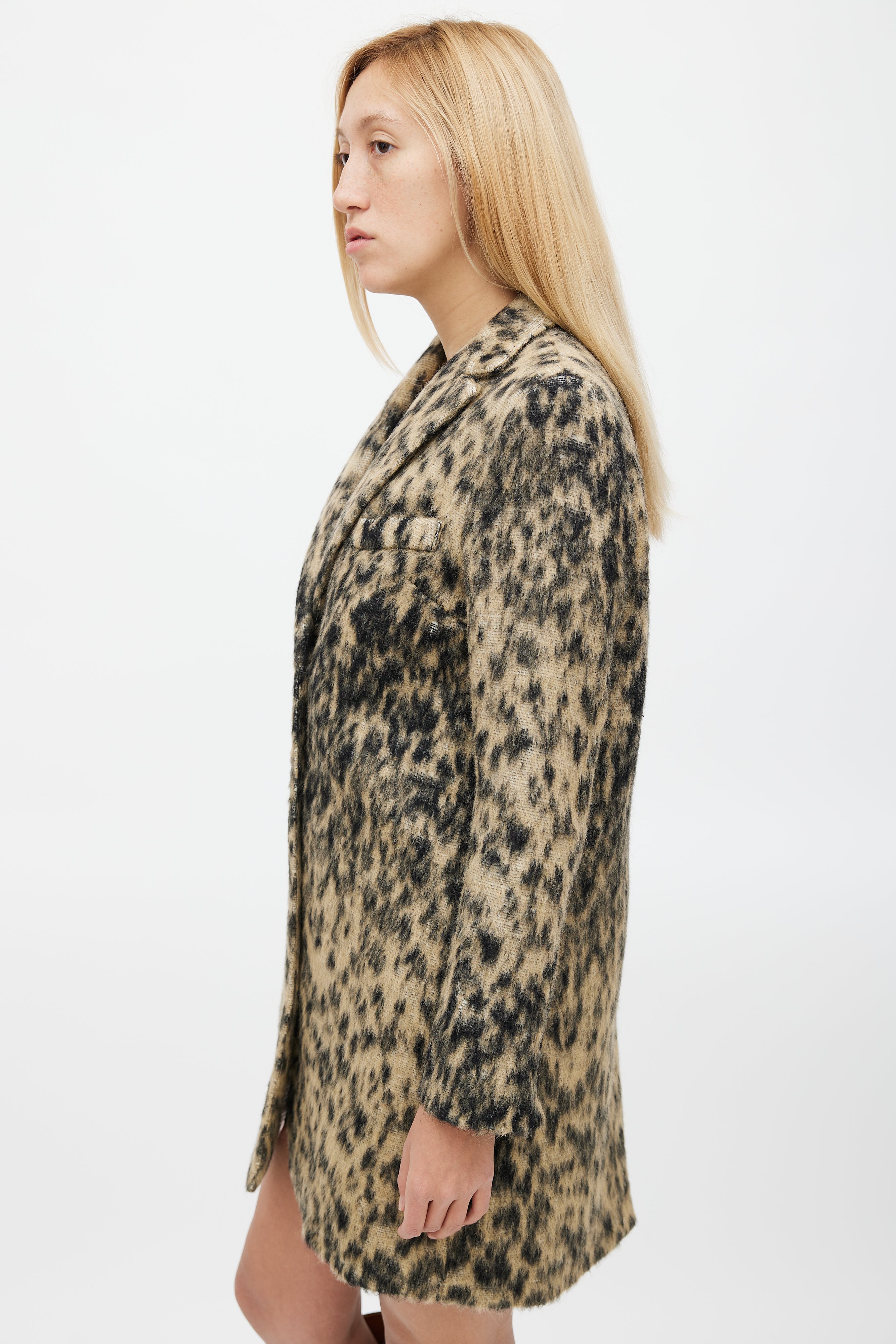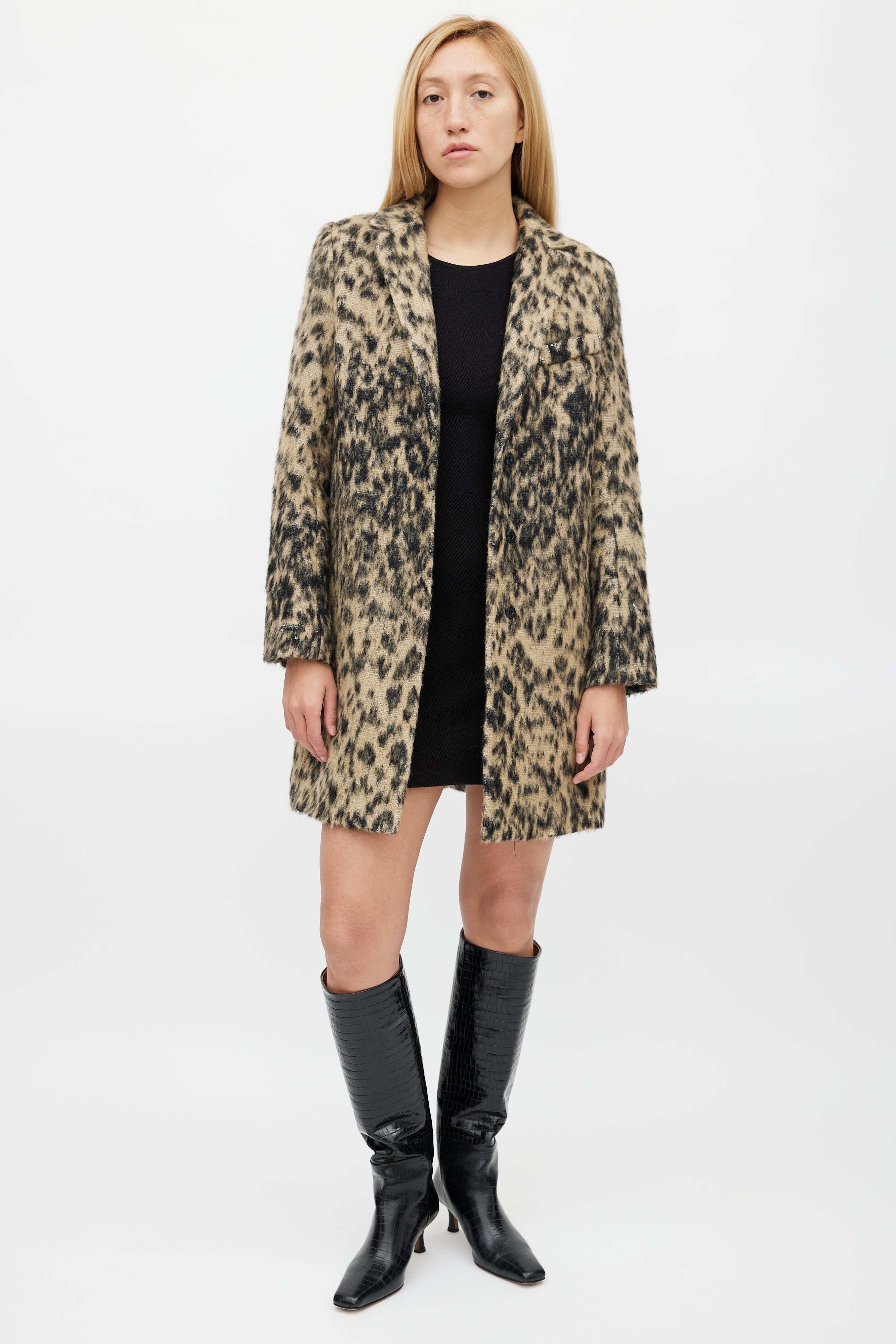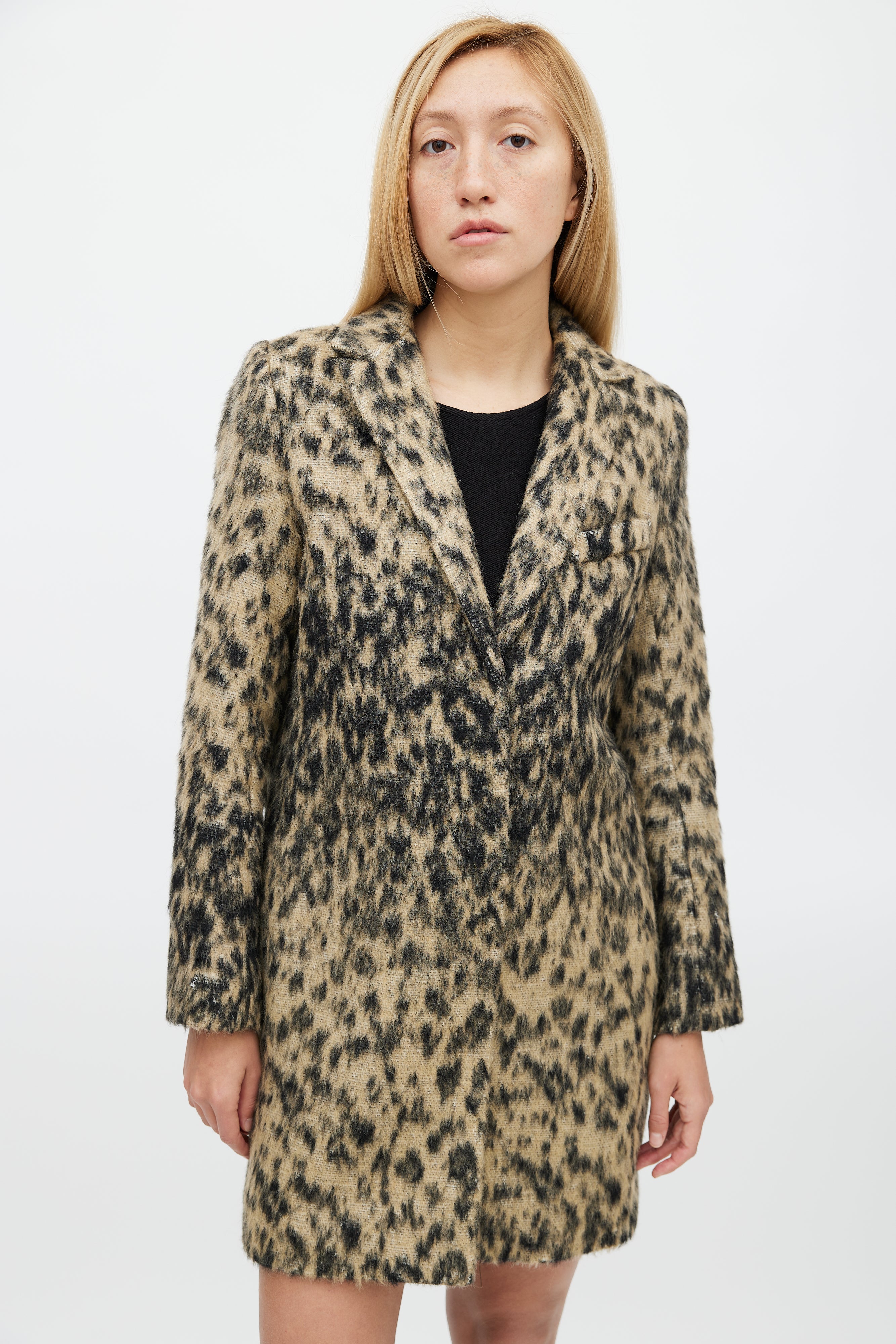 Pre-owned Smythe black and beige Lab coat featuring leopard print, concealed button up front, spread collar, one welt pocket at chest, two concealed hip pockets, and back vent. Lined.