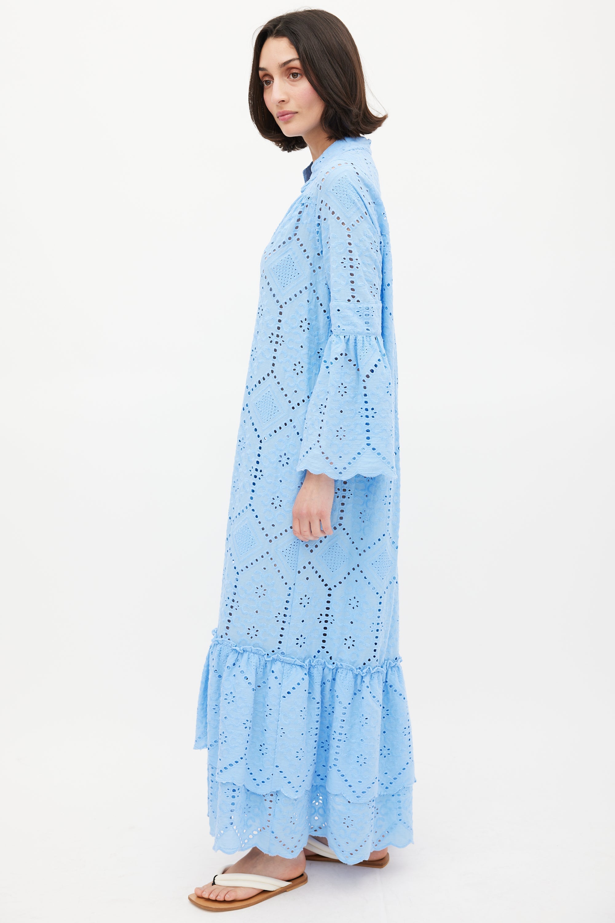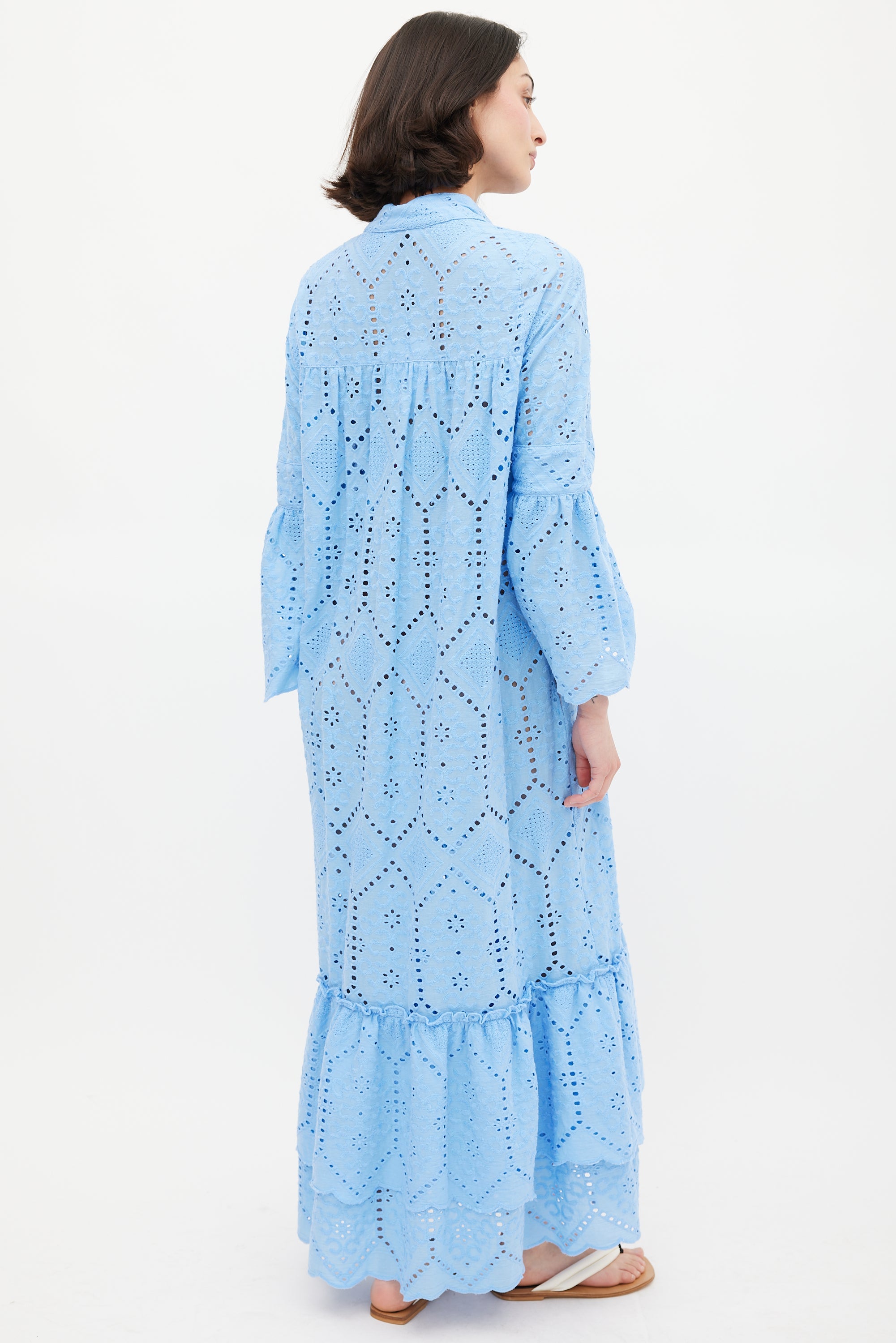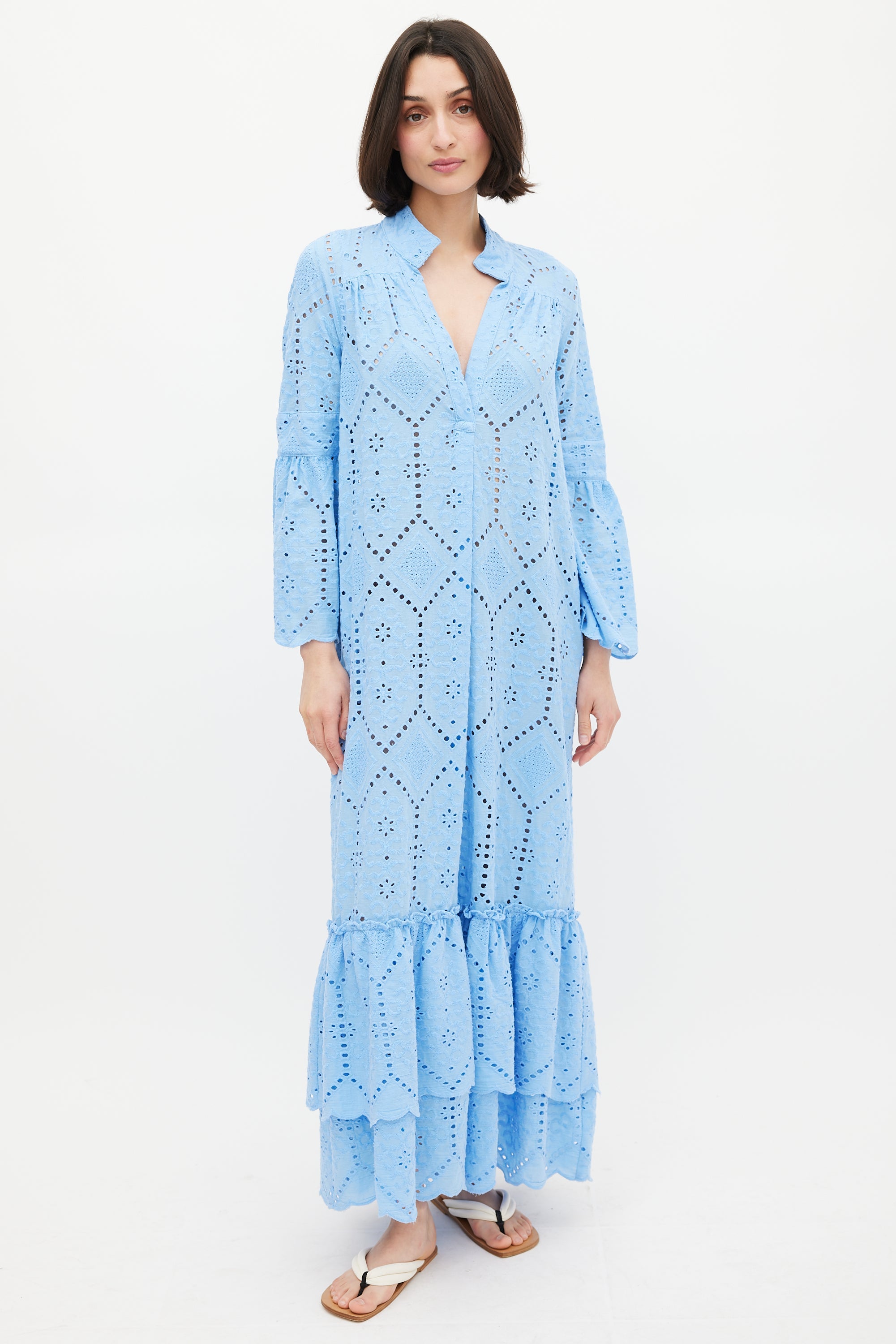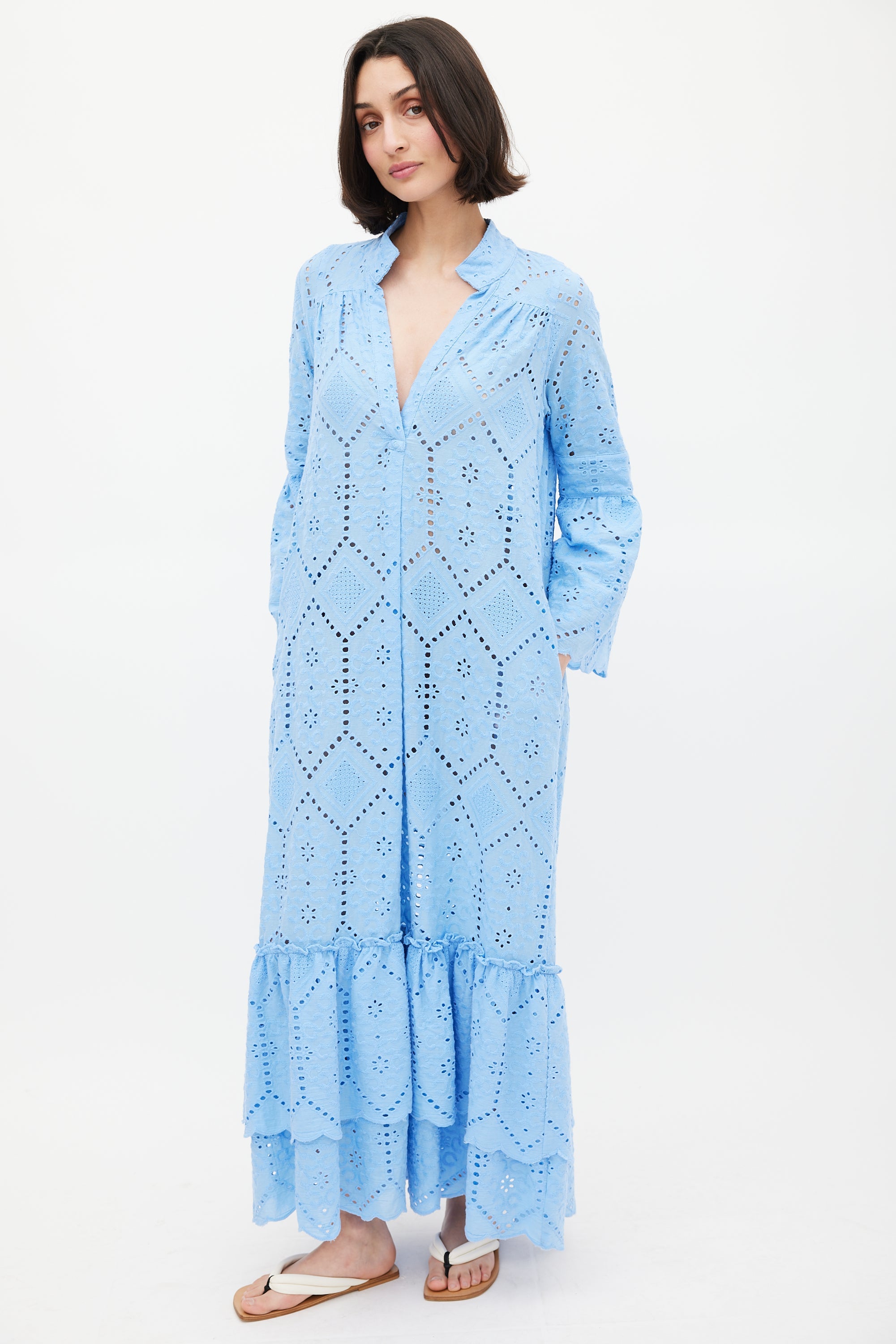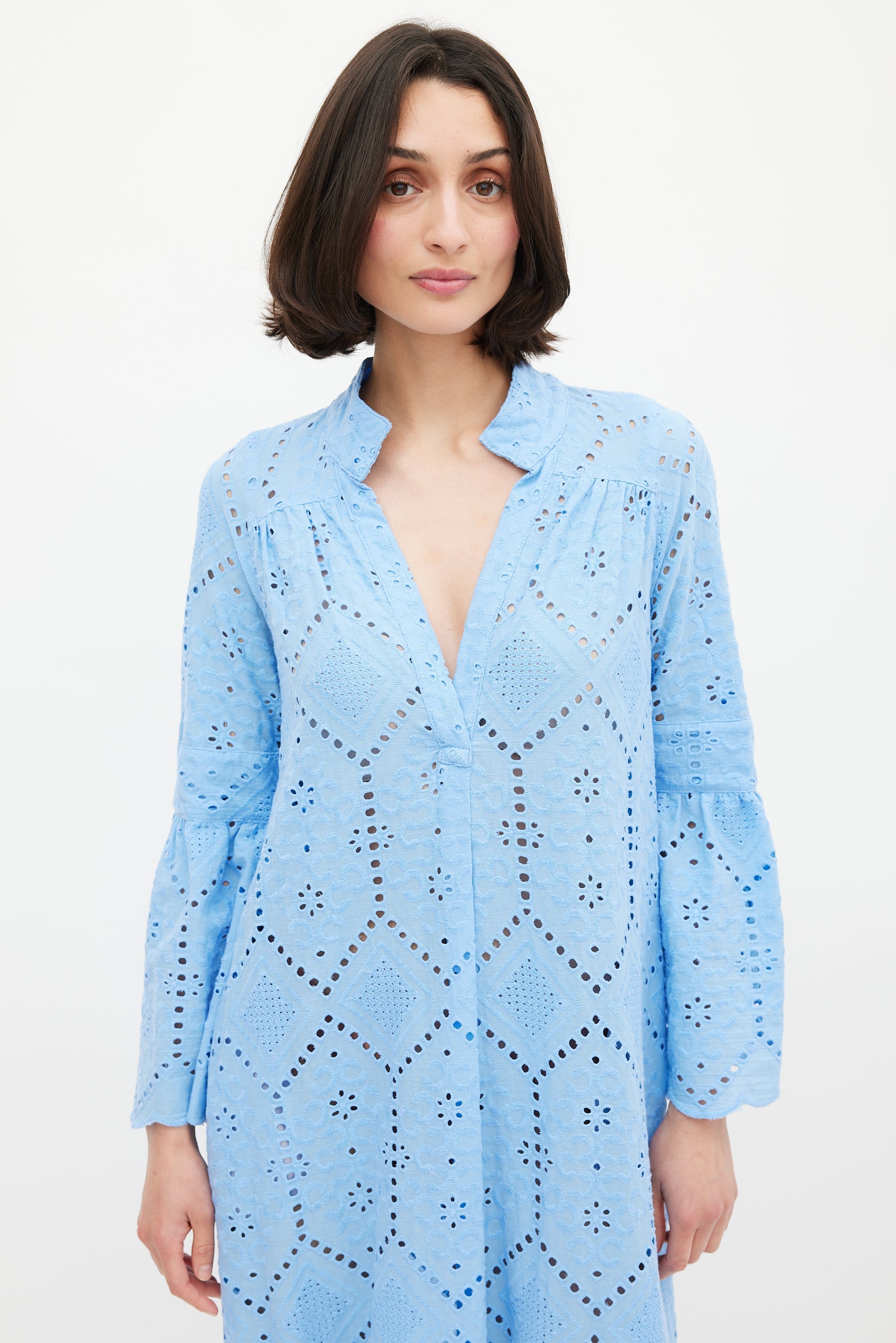Smythe blue Eyelet Trumpet dress featuring V-neckline, pointed collar, eyelet lace, ruffled hem, two hip pockets, and trumpet sleeves.