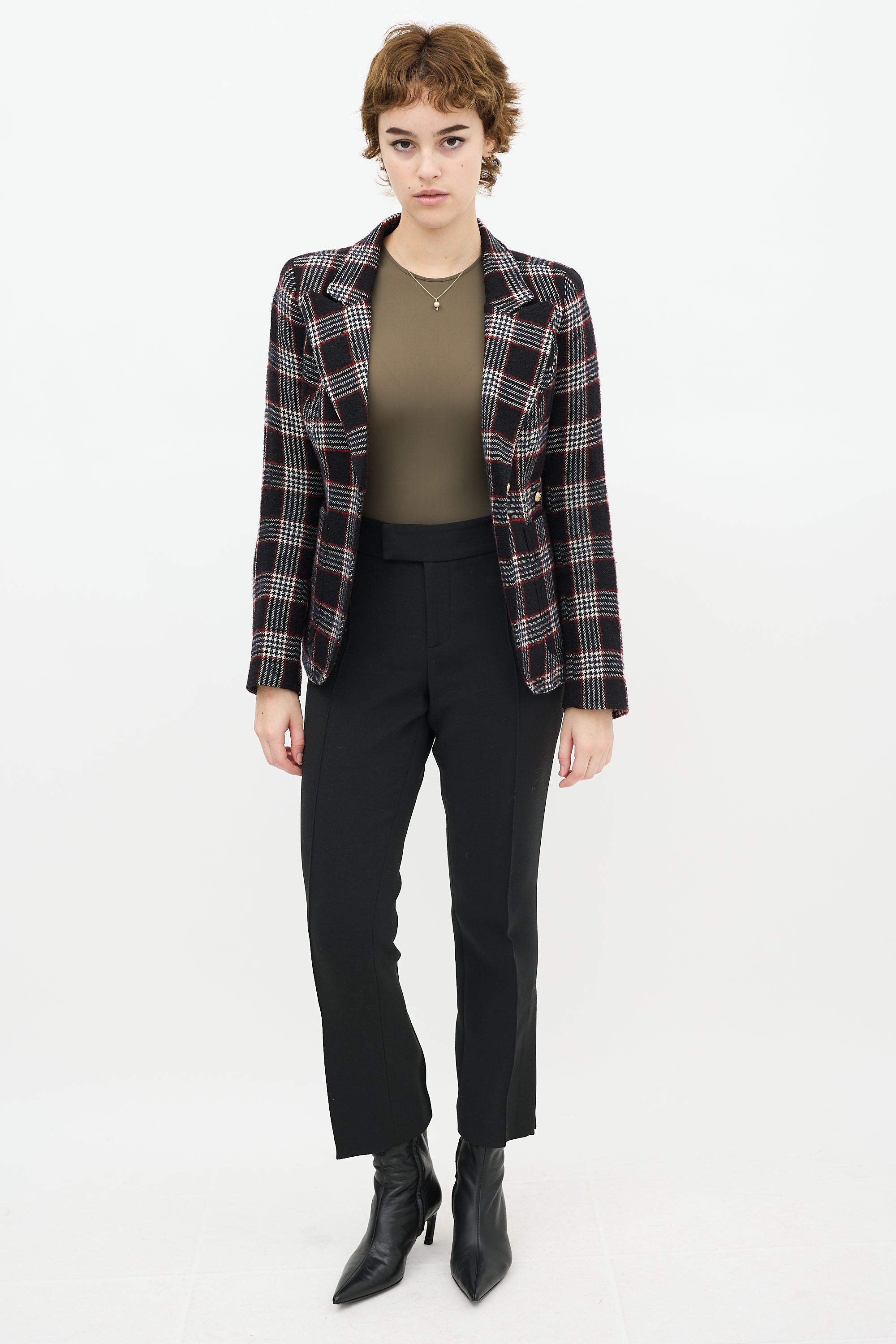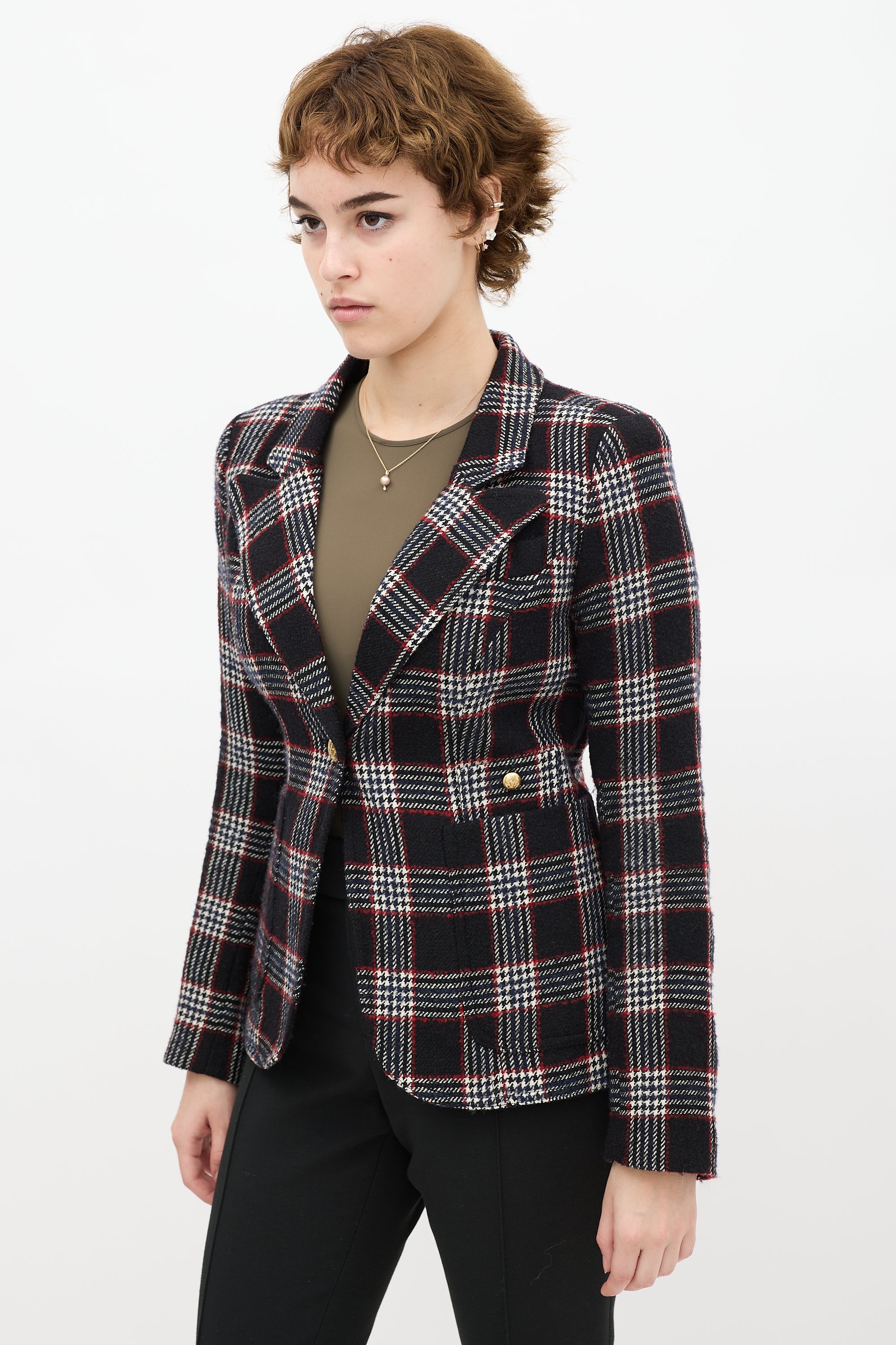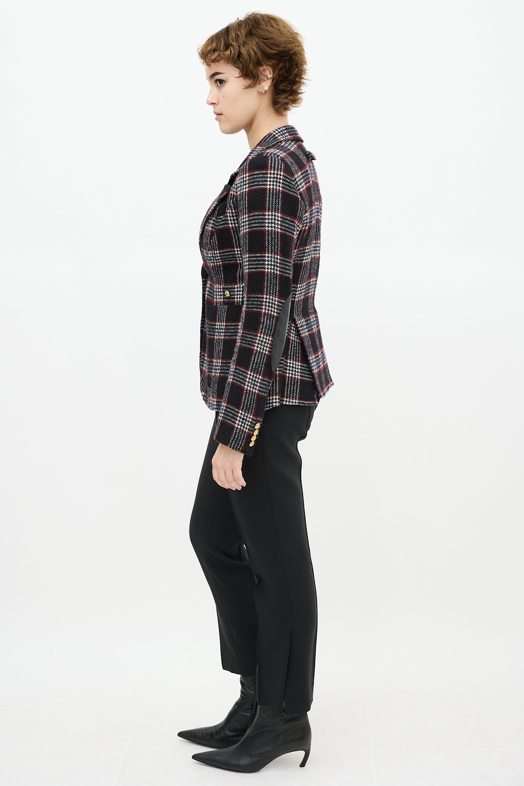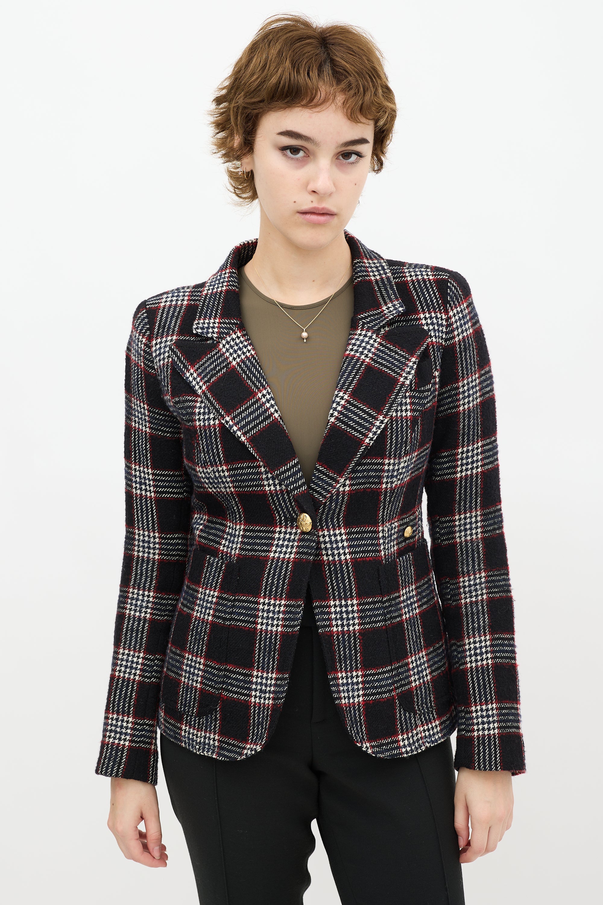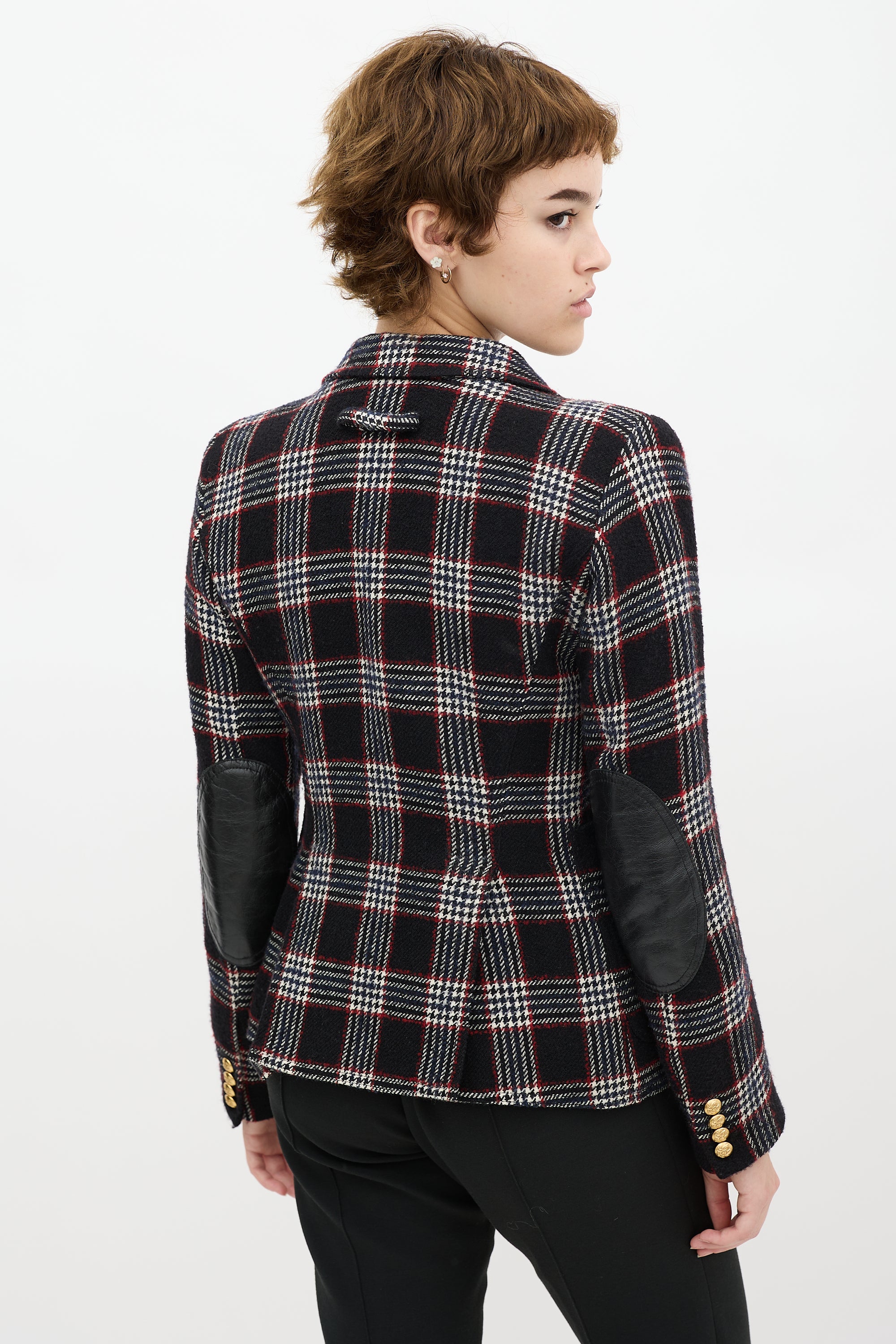 Pre-owned Smythe black and red wool blend Patch Pocket Duchess blazer featuring plaid pattern, peak lapel, single button front, decorative welt at left chest, three front pockets, back double vent, leather elbow patches, and buttoned cuffs. Lined.