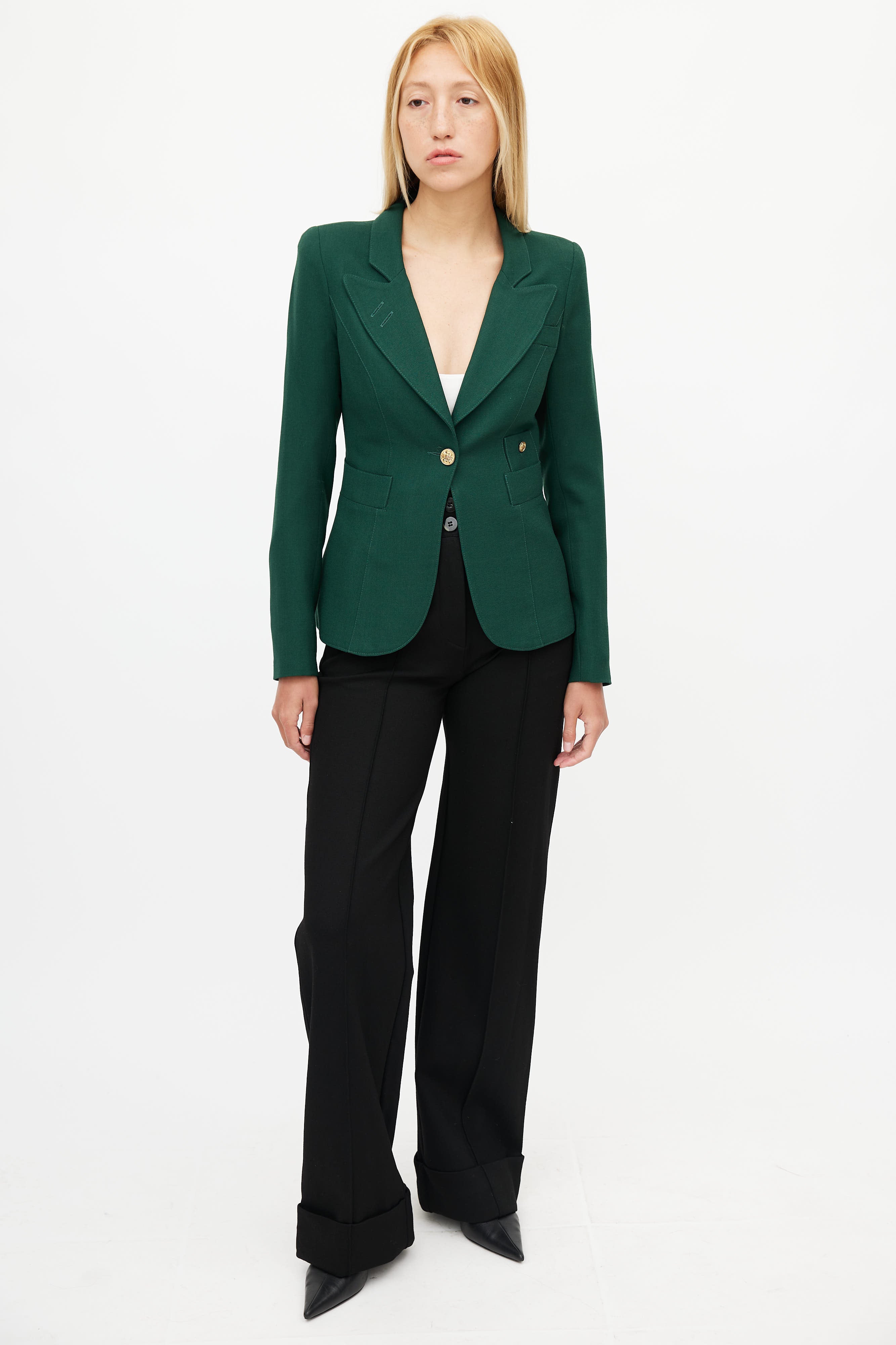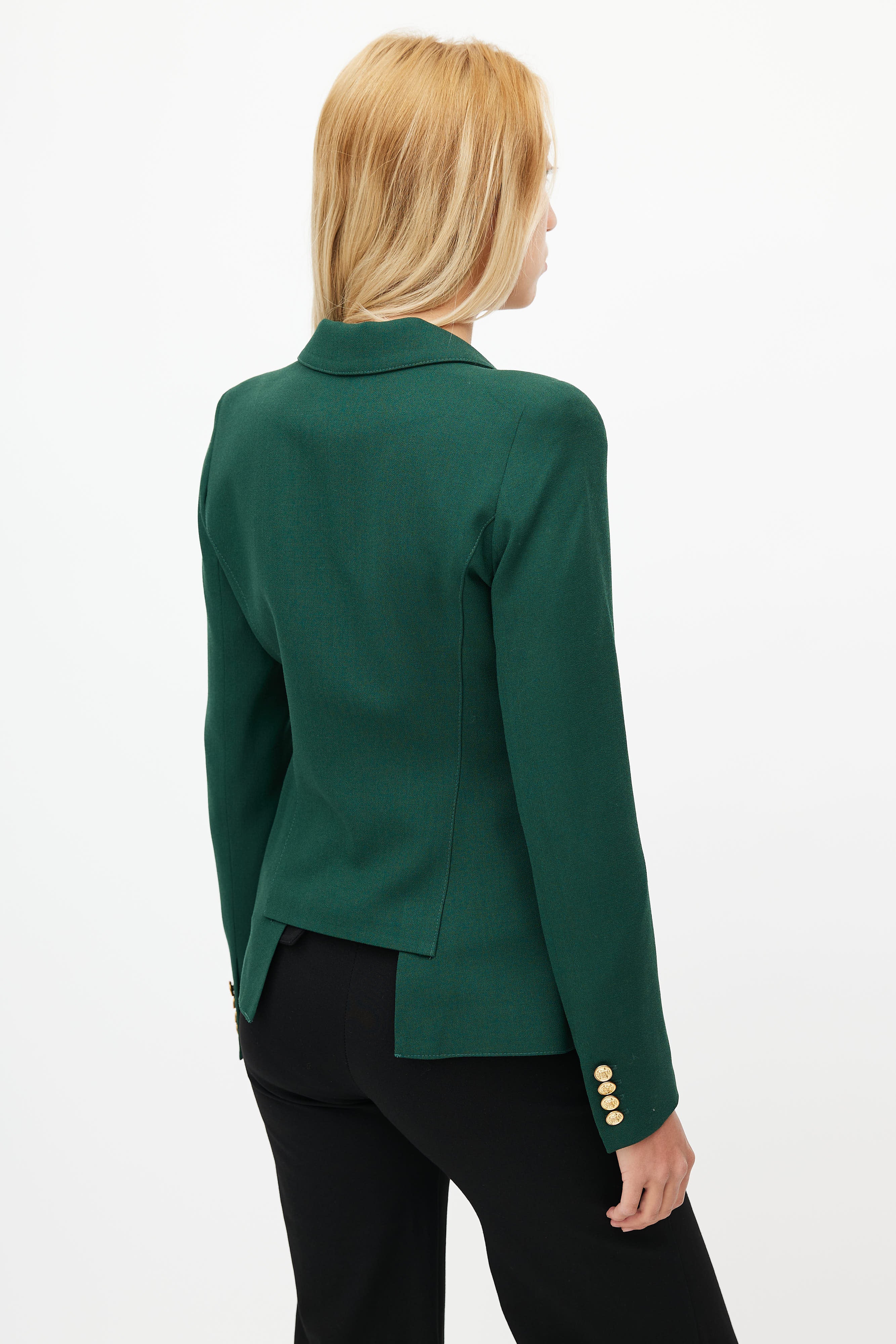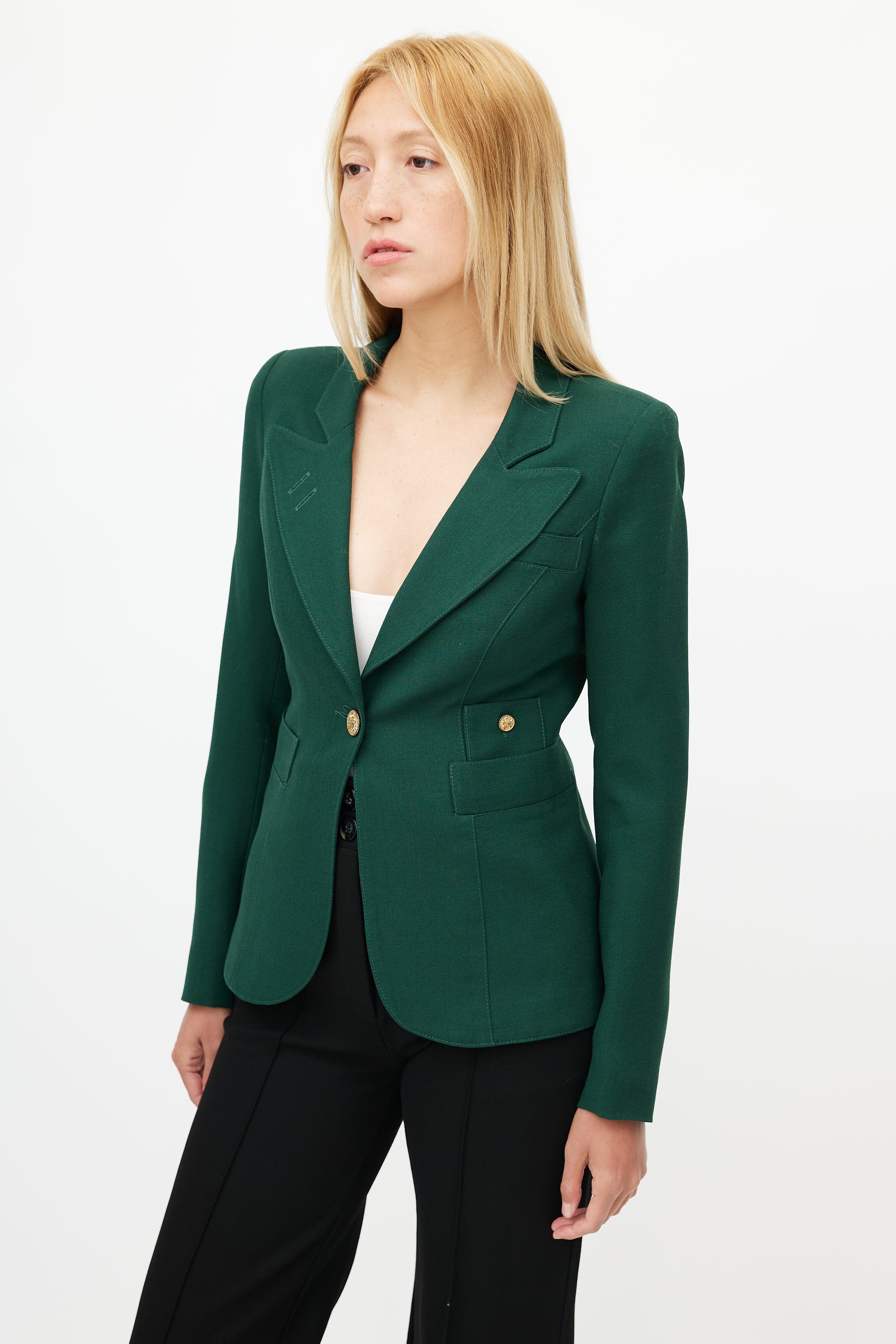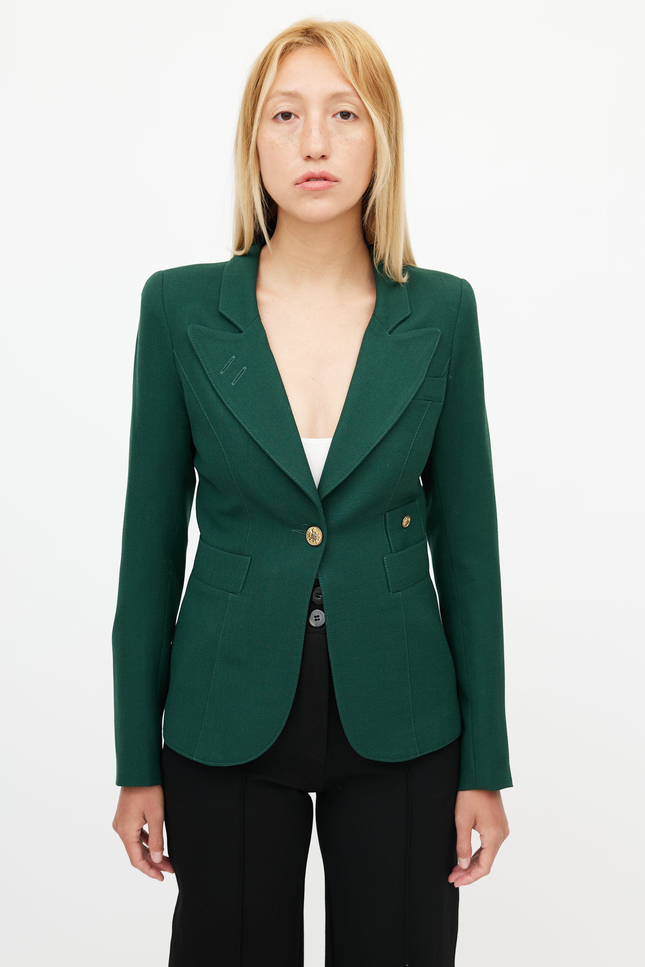 Pre-owned Smythe green wool Classic Duchess blazer featuring peak lapel, single button front, decorative welt at left chest, three front pockets, cut out back vent, and buttoned cuffs. Lined.