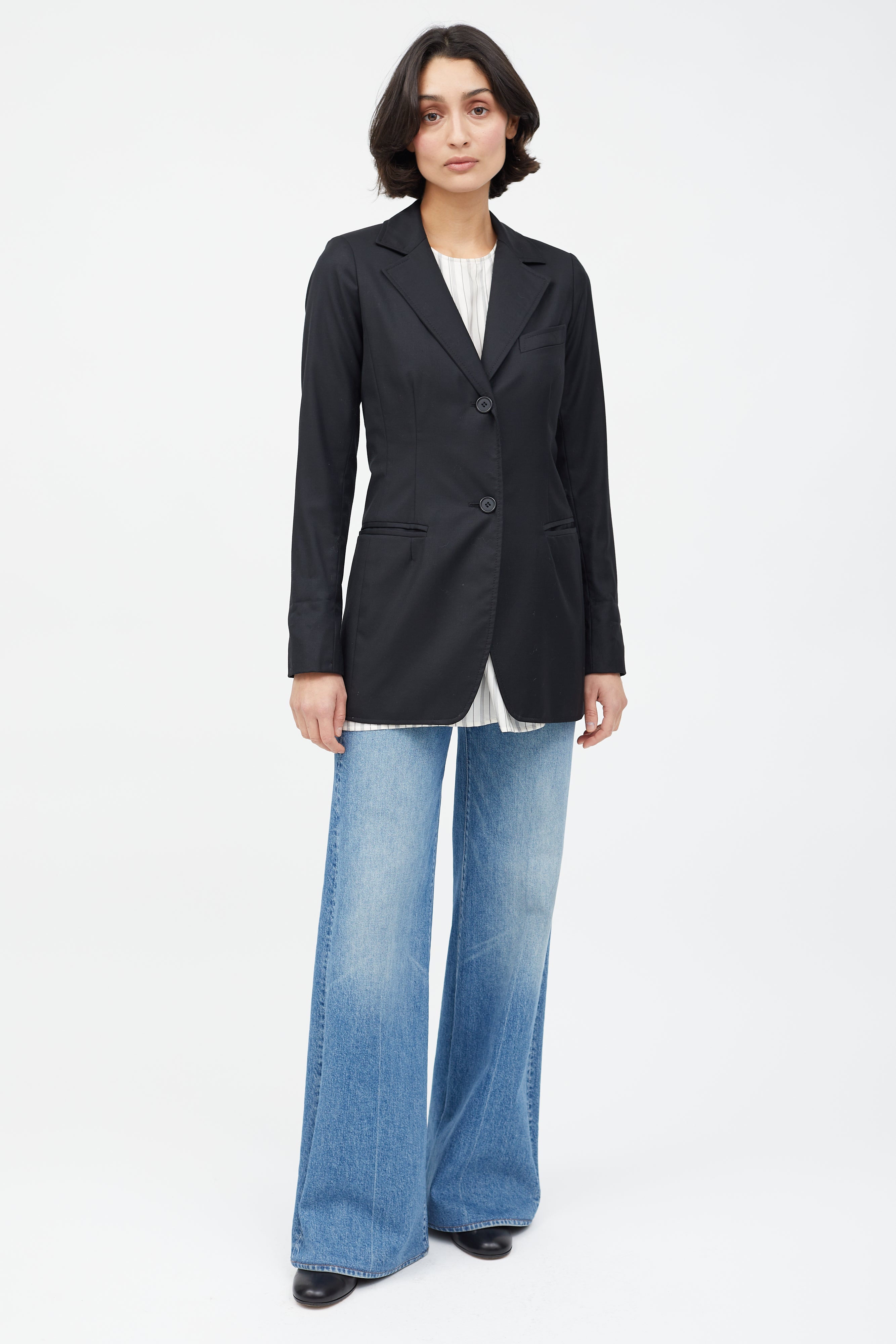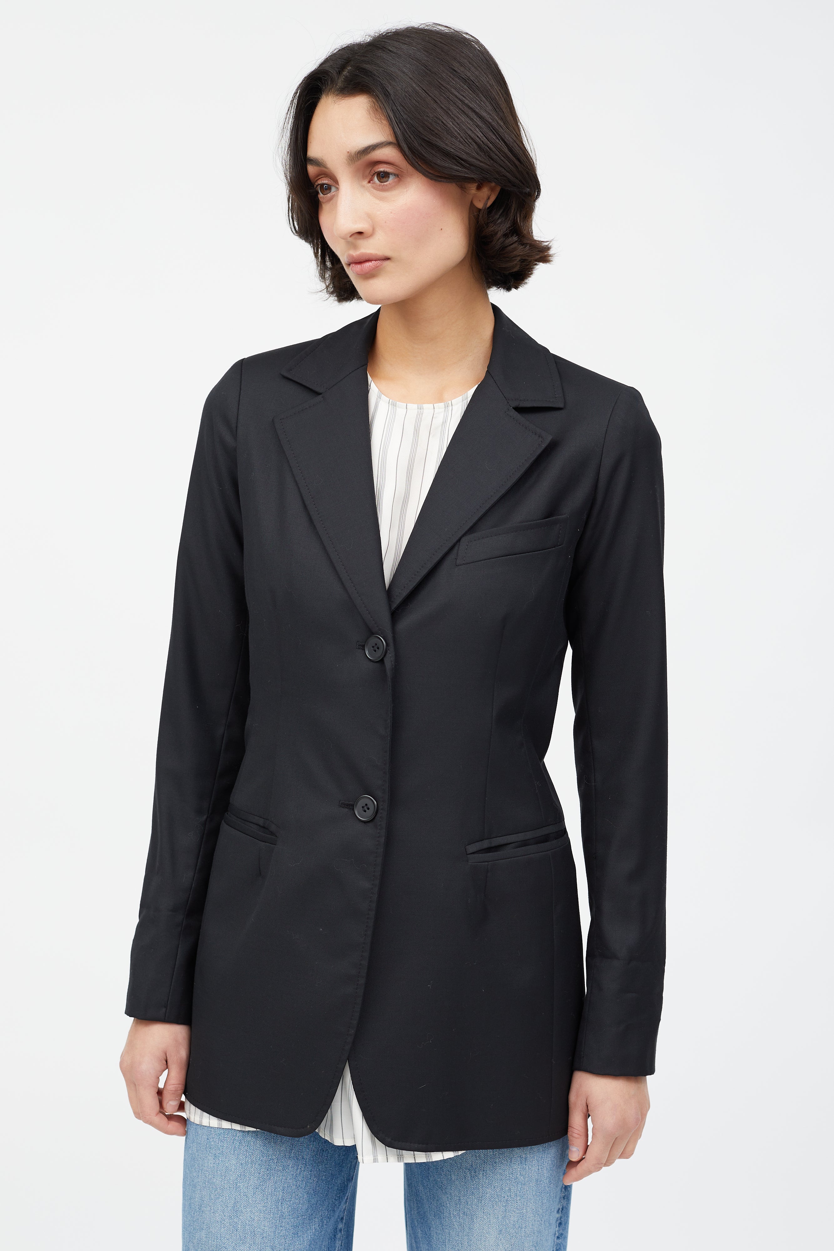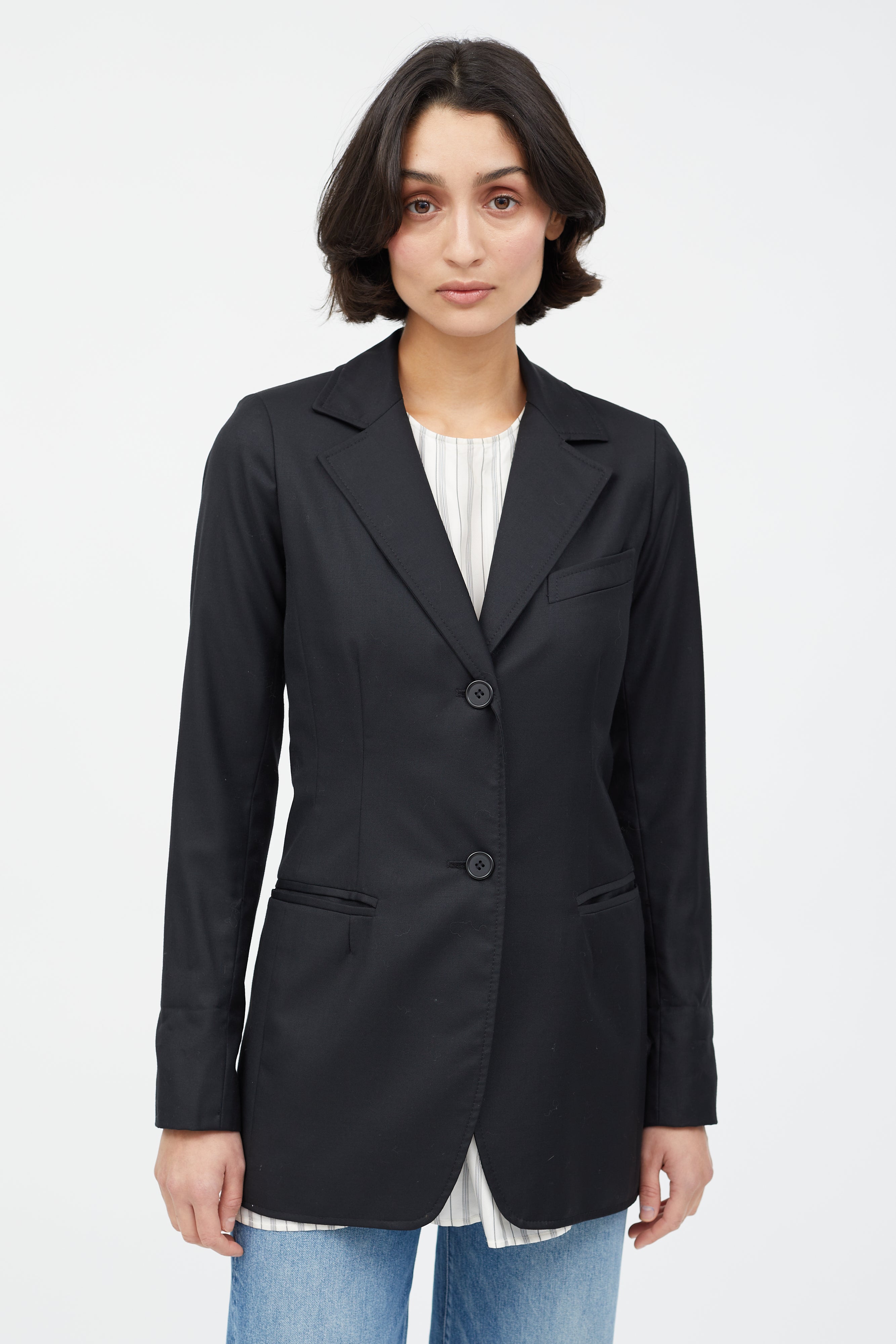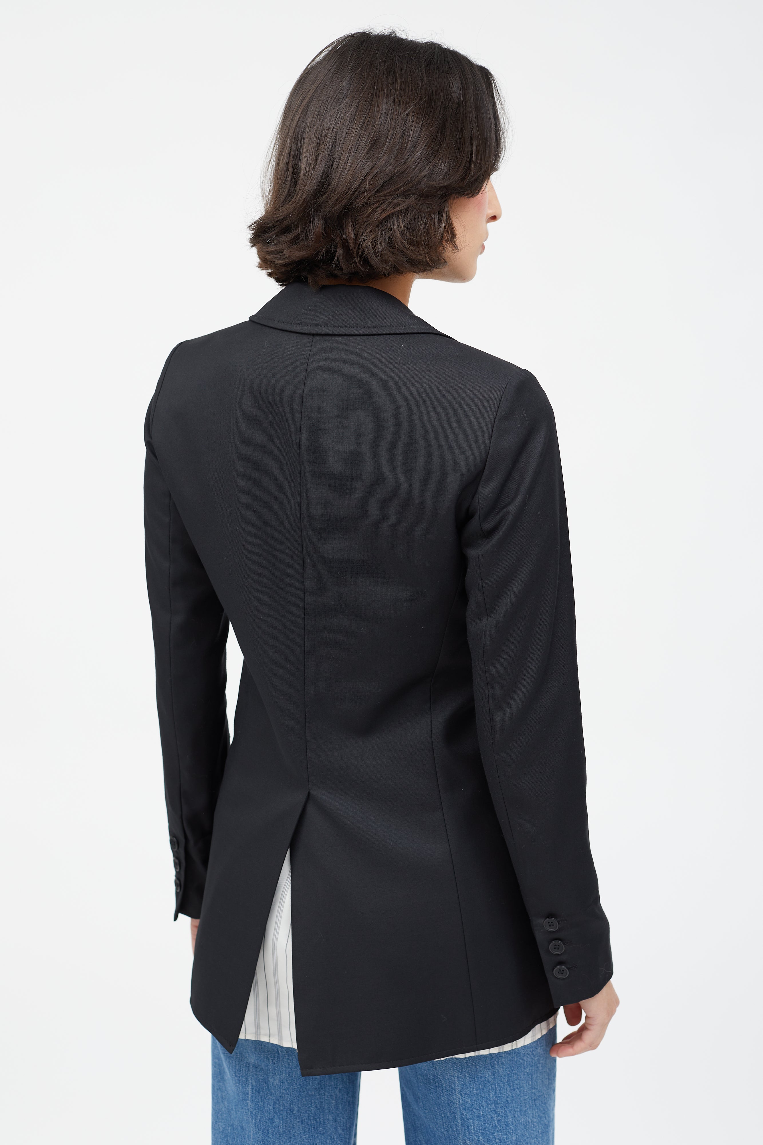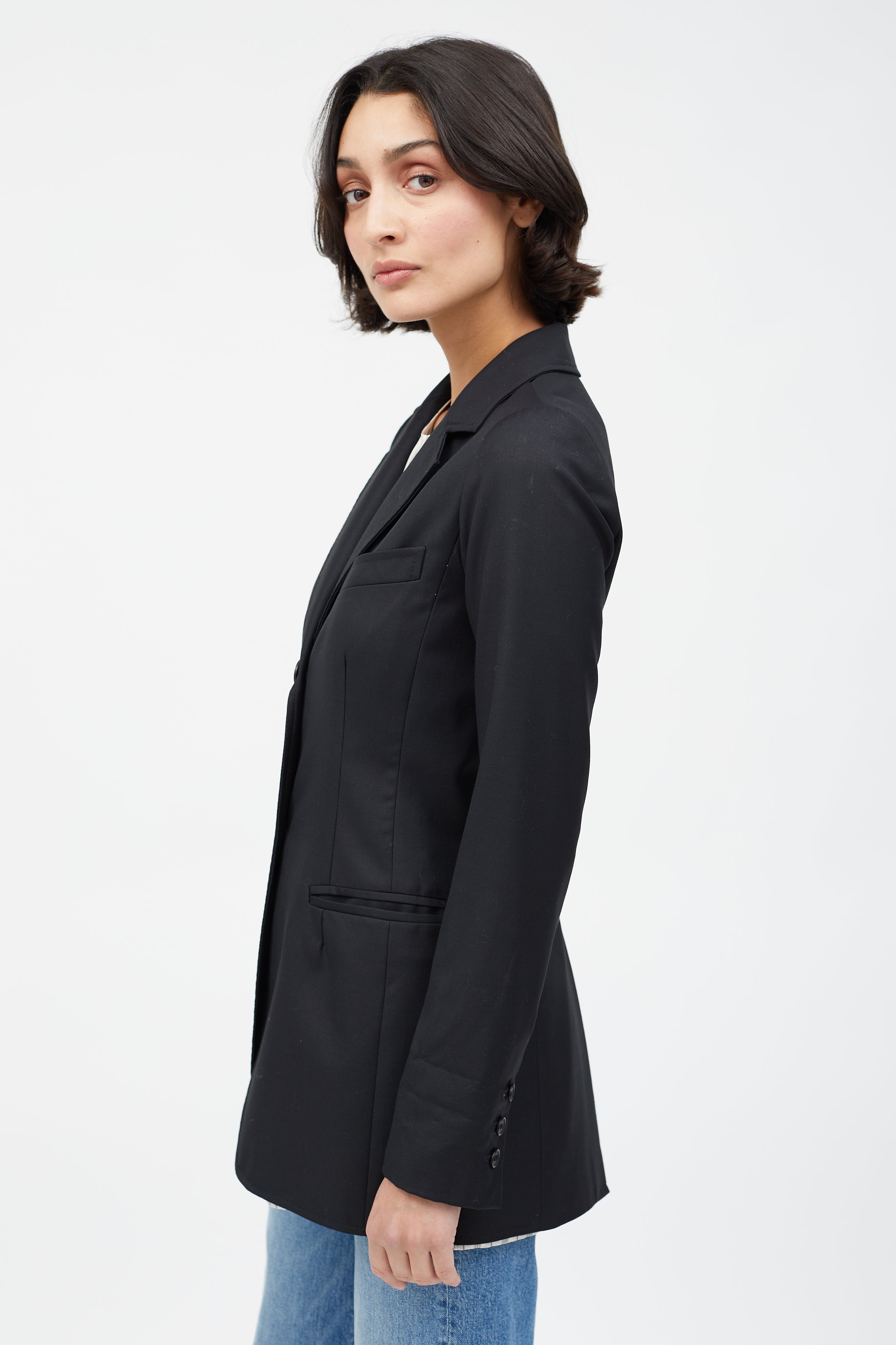 Pre-owned Smythe black wool and cashmere blend blazer featuring notched lapel, button front, decorative welt at left chest, two front pockets, back vent, and buttoned cuffs. Lined.