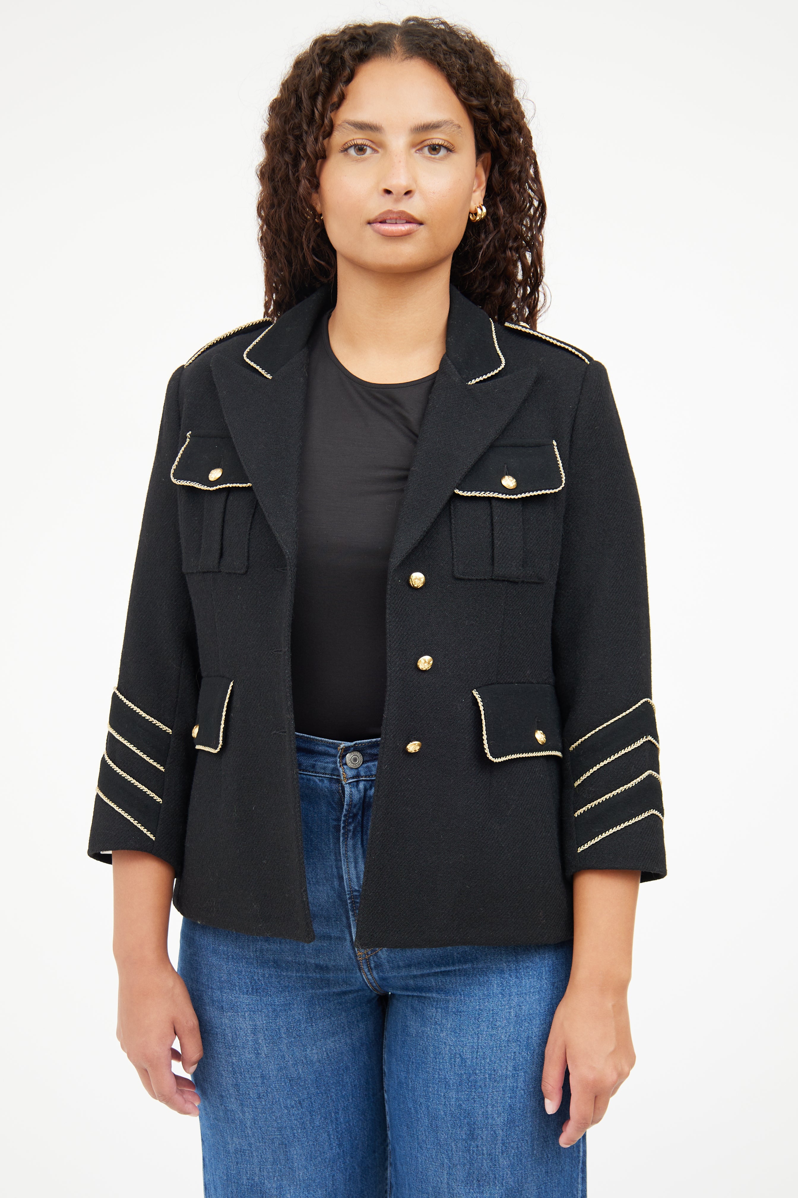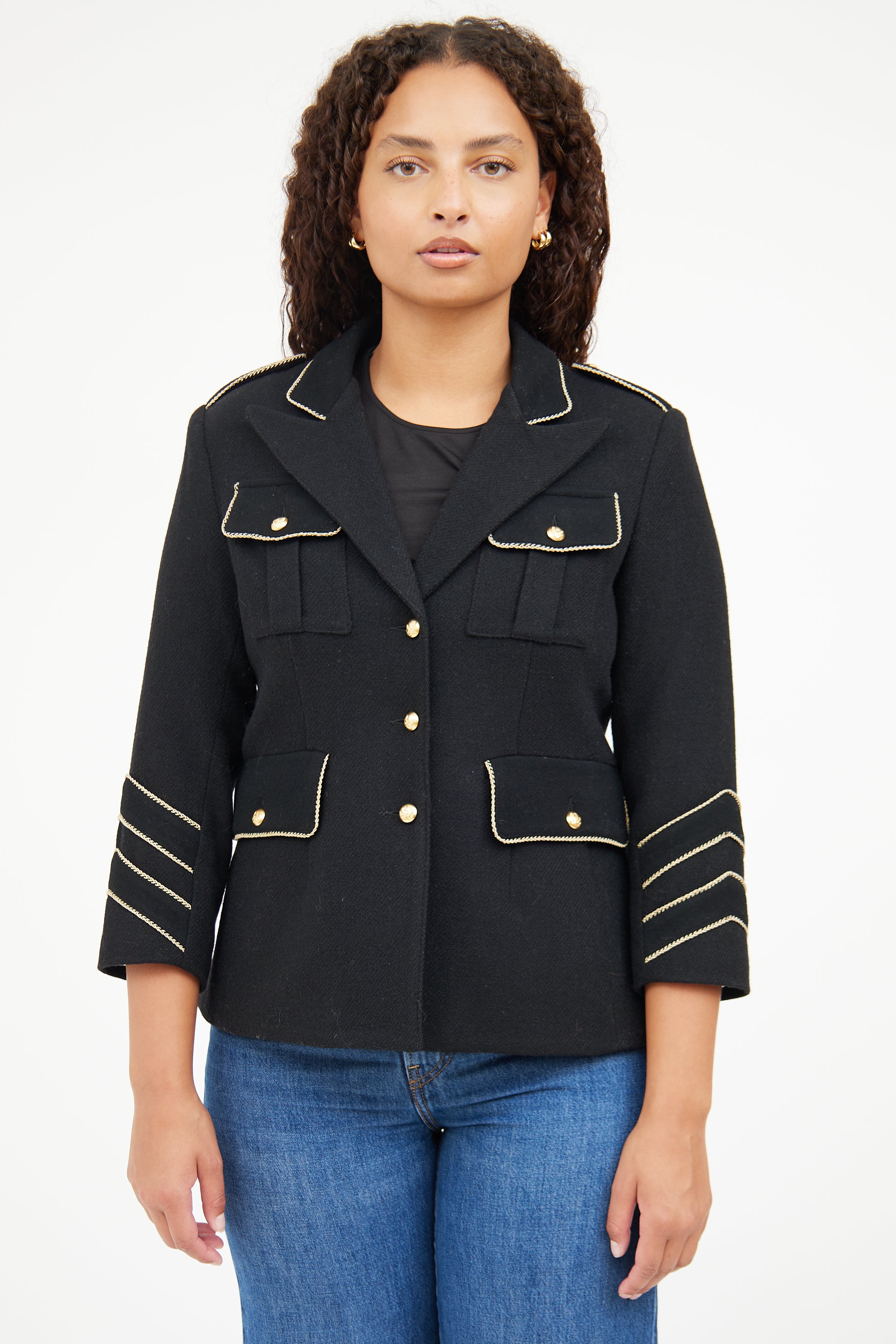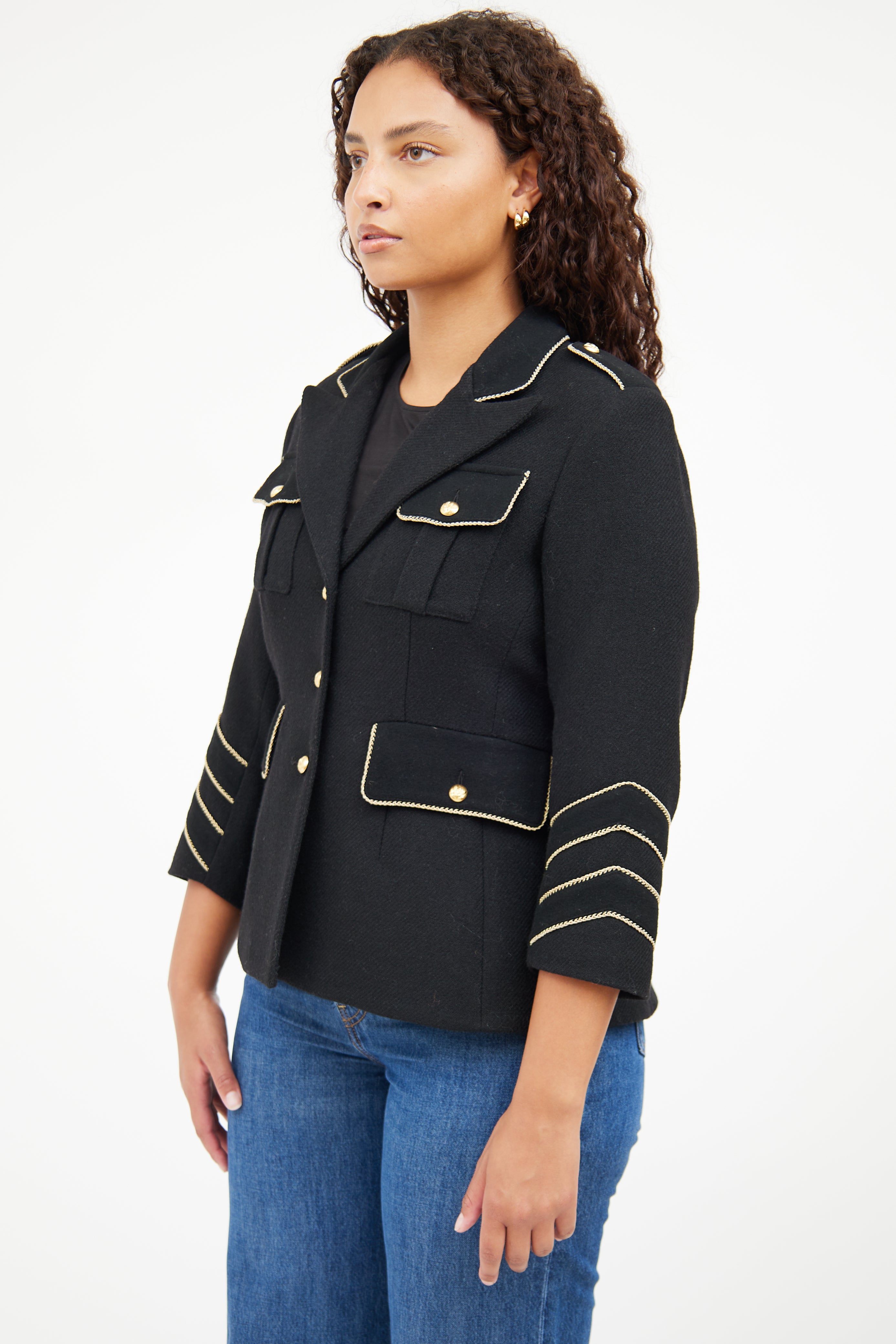 Pre-owned Smythe black Military jacket featuring peak lapel, gold tone buttons with bird motif, buttoned front, four front patch pockets, back vent, epaulettes, buttoned cuffs, and metallic thread trim. Lined.