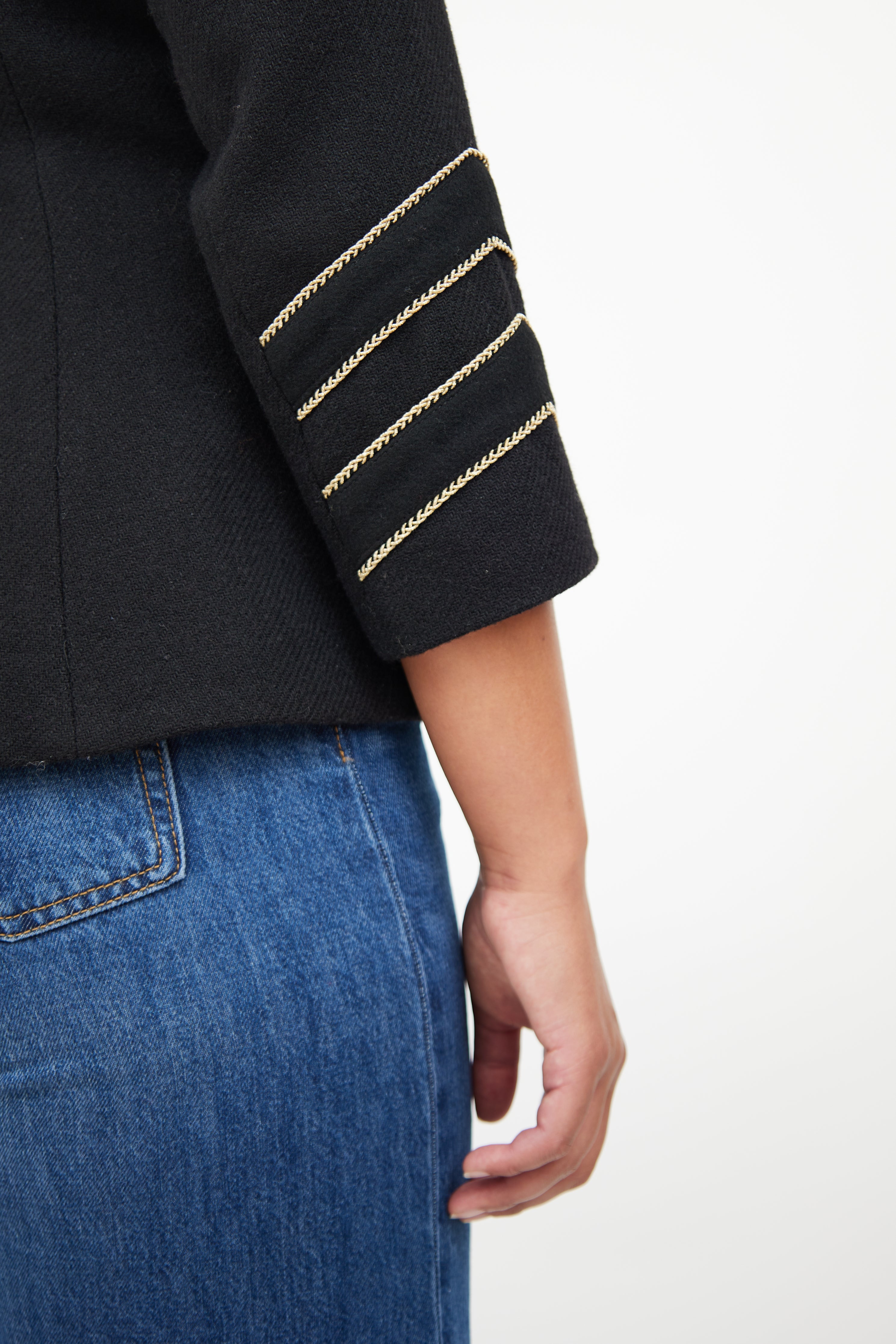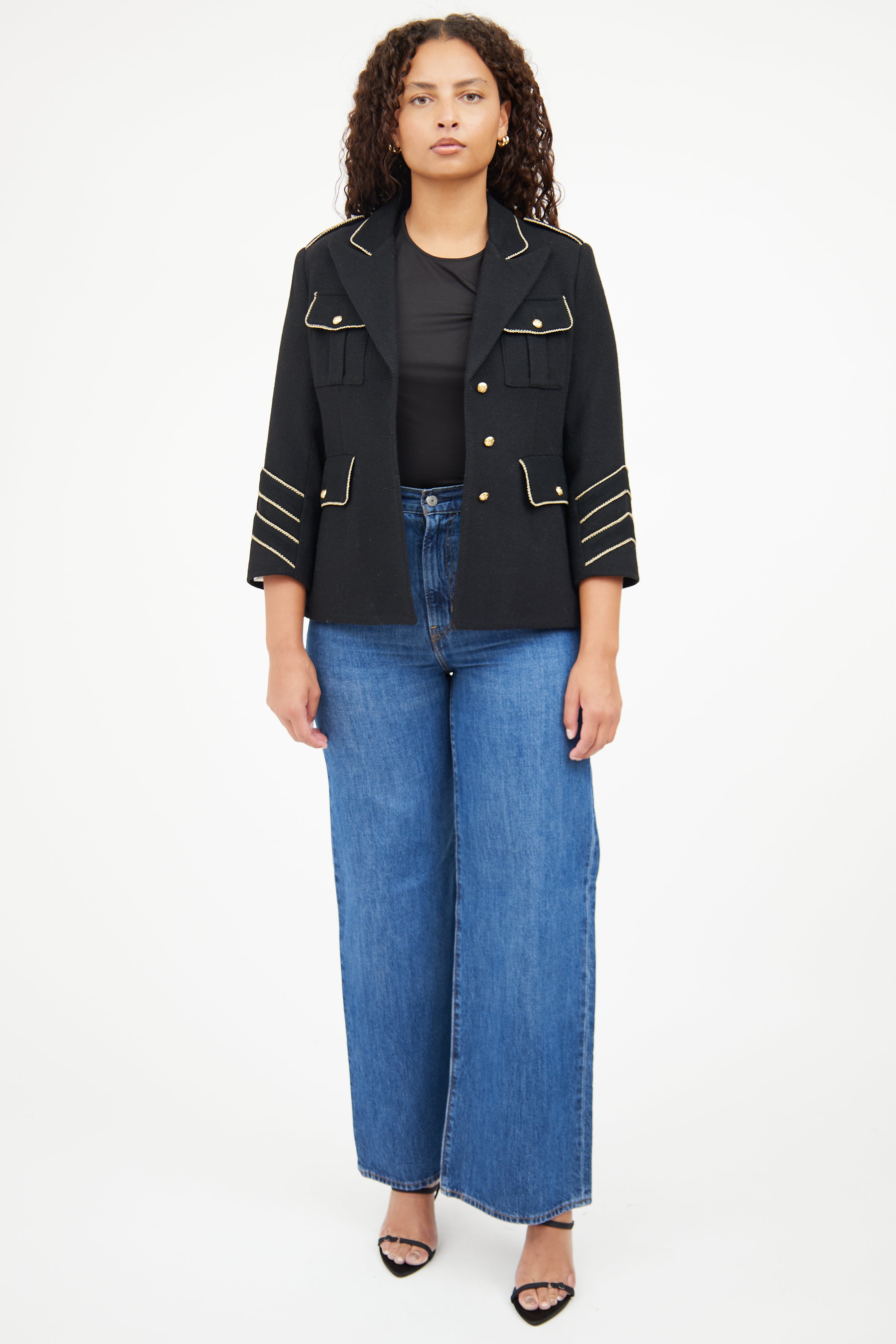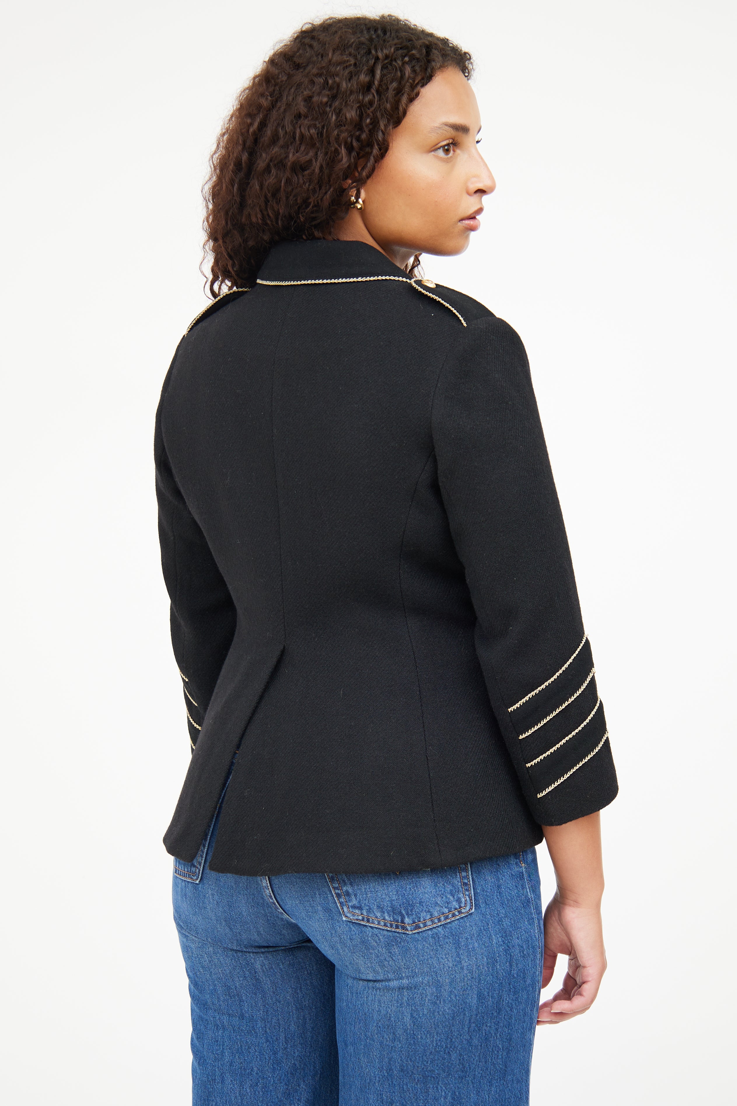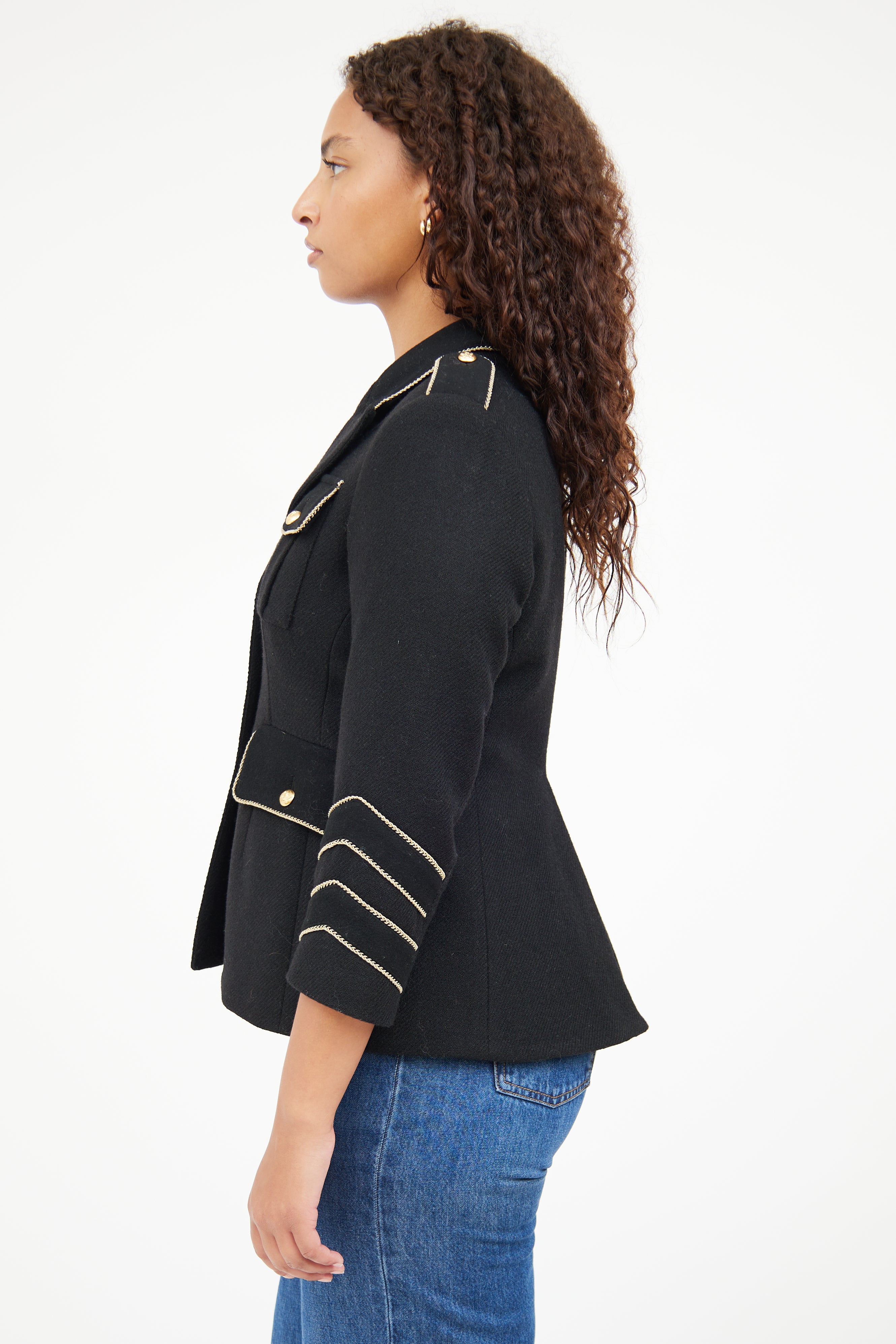 Pre-owned Smythe black Military jacket featuring peak lapel, gold tone buttons with bird motif, buttoned front, four front patch pockets, back vent, epaulettes, buttoned cuffs, and metallic thread trim. Lined.