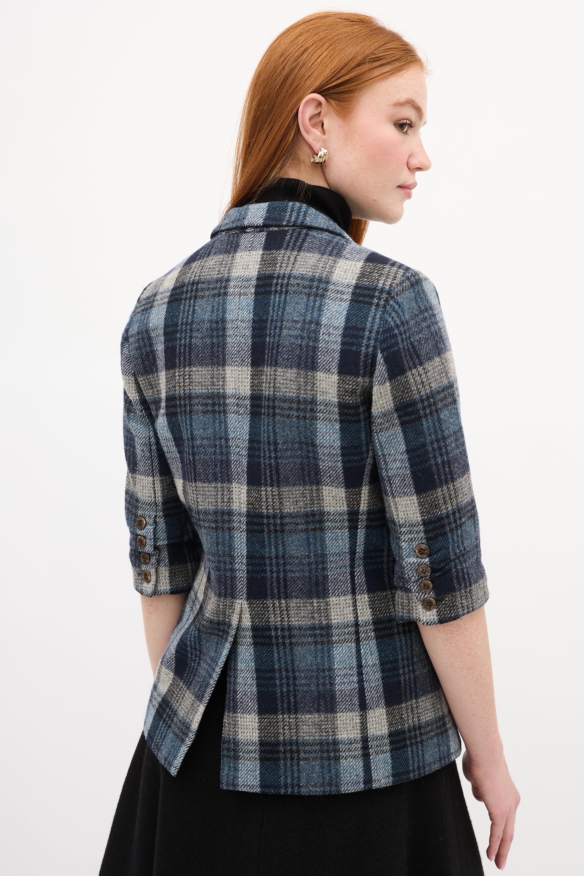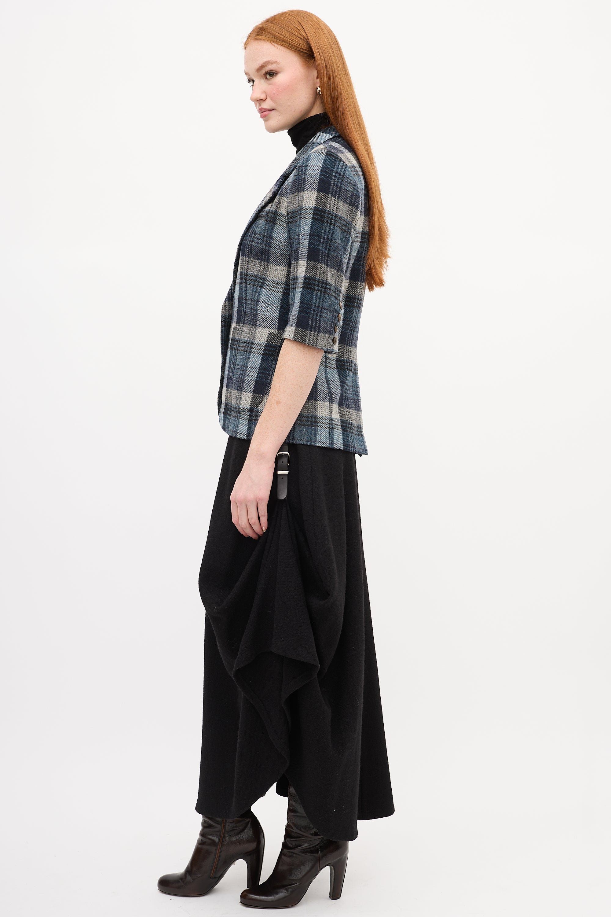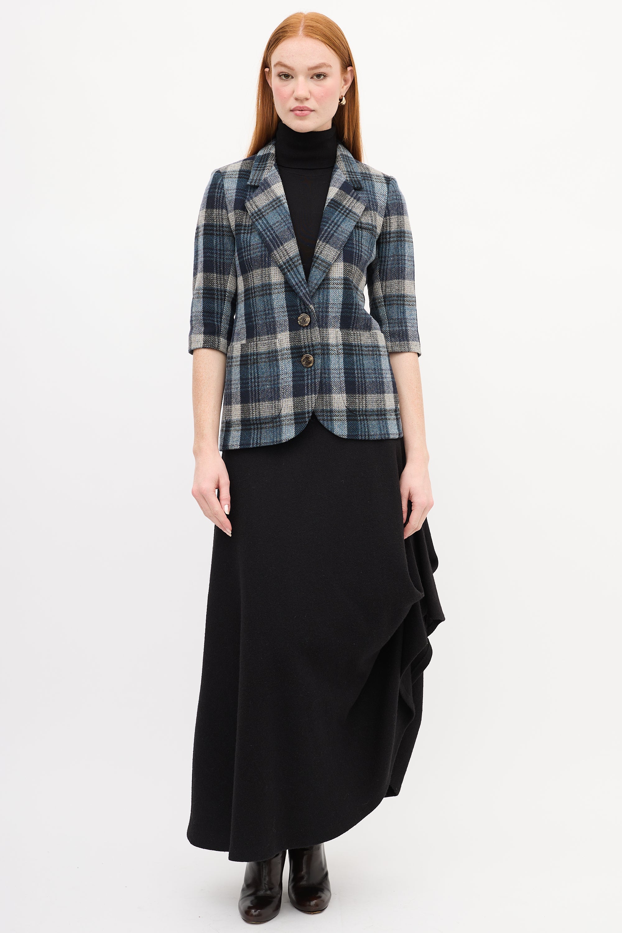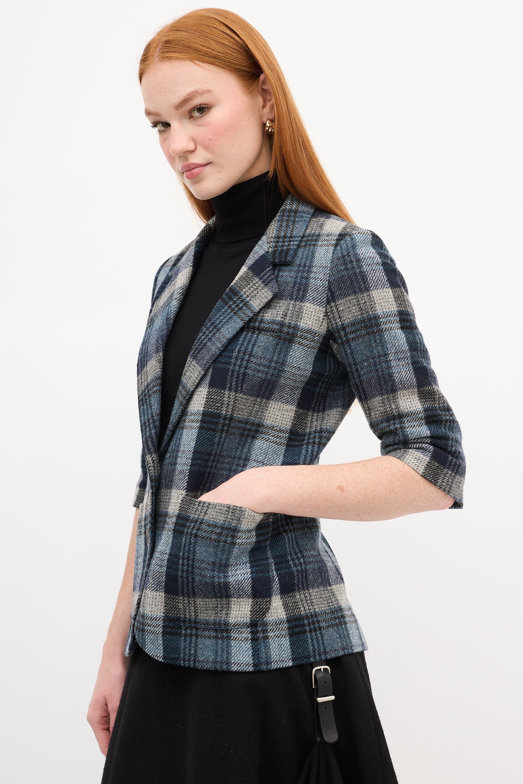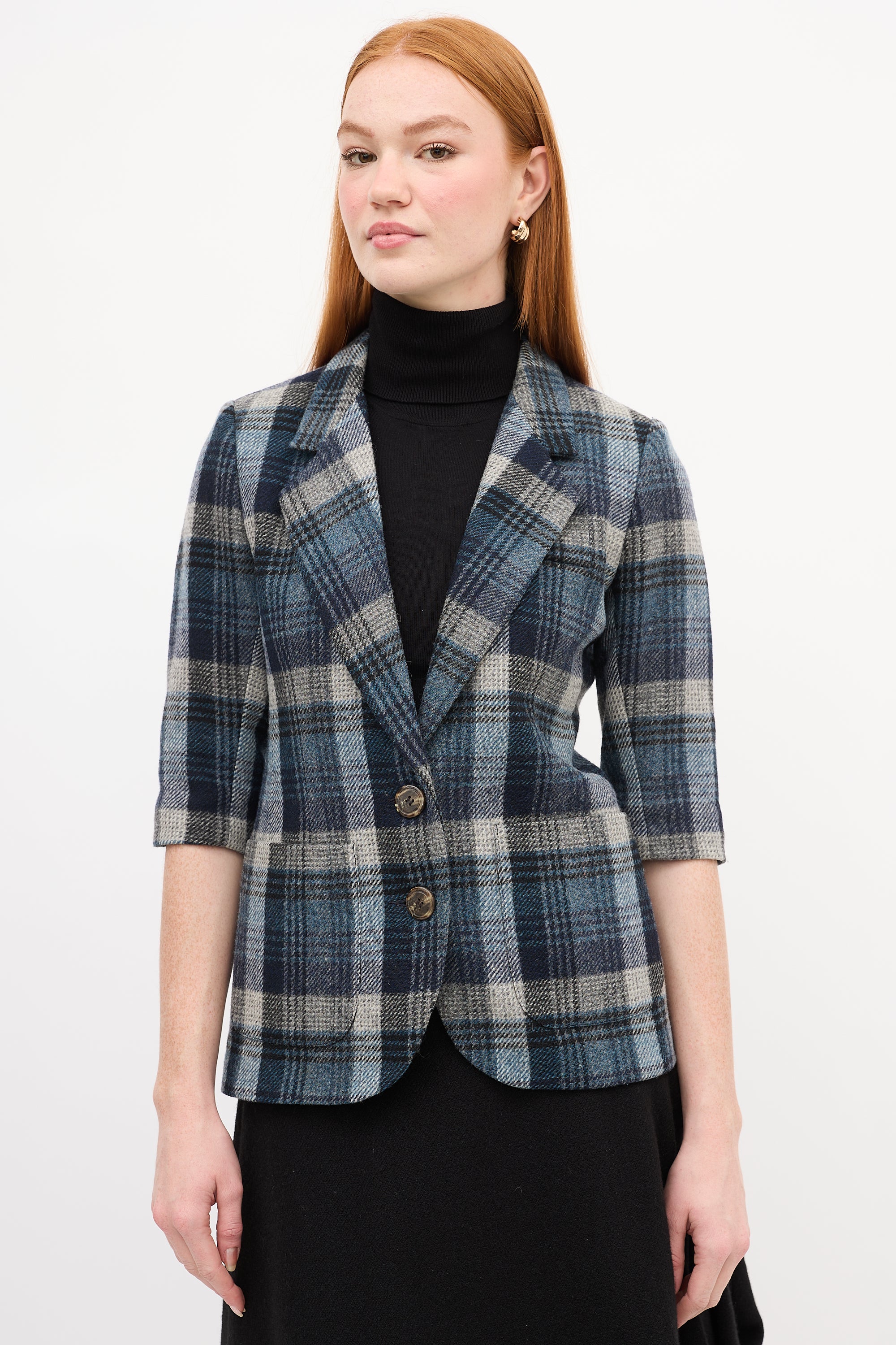 Pre-owned Smythe blue and grey blazer featuring plaid pattern, notched lapel, button front, decorative welt at left chest, two front patch pockets, back vent, quarter sleeves, and ruched button cuffs. Lined.